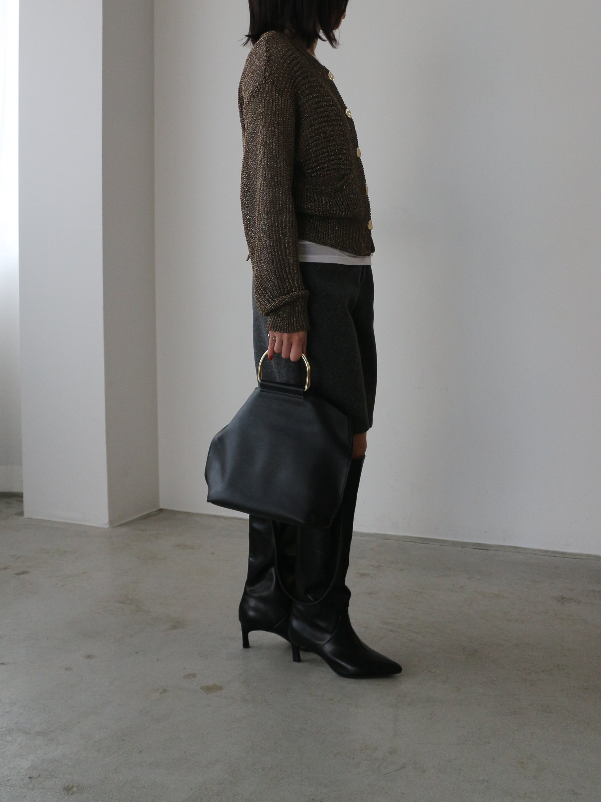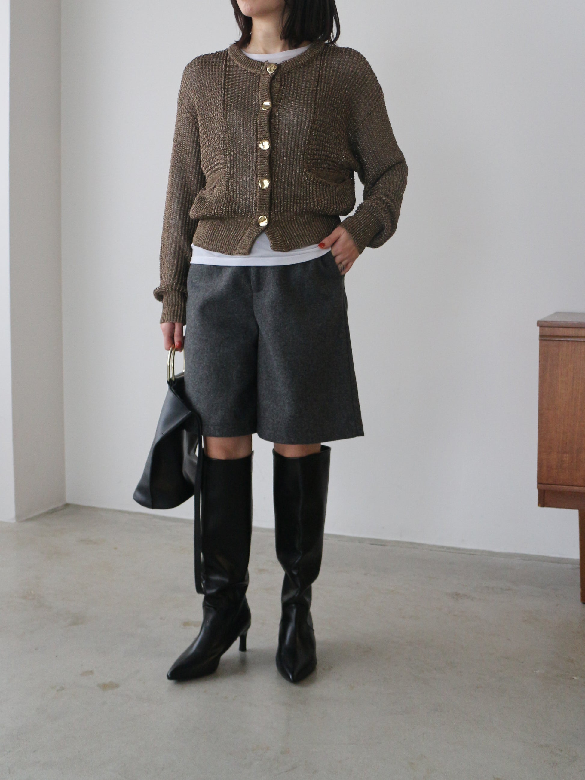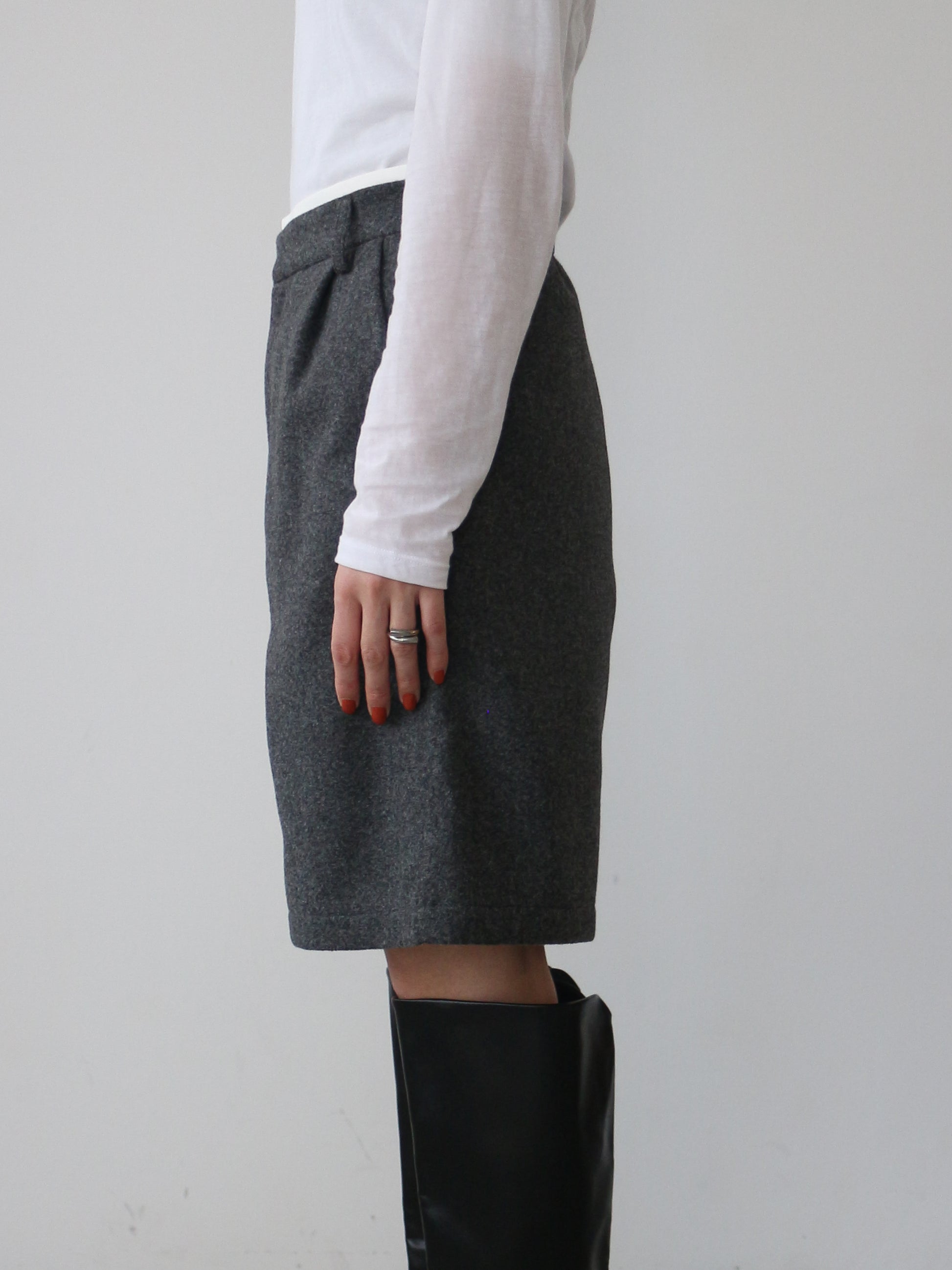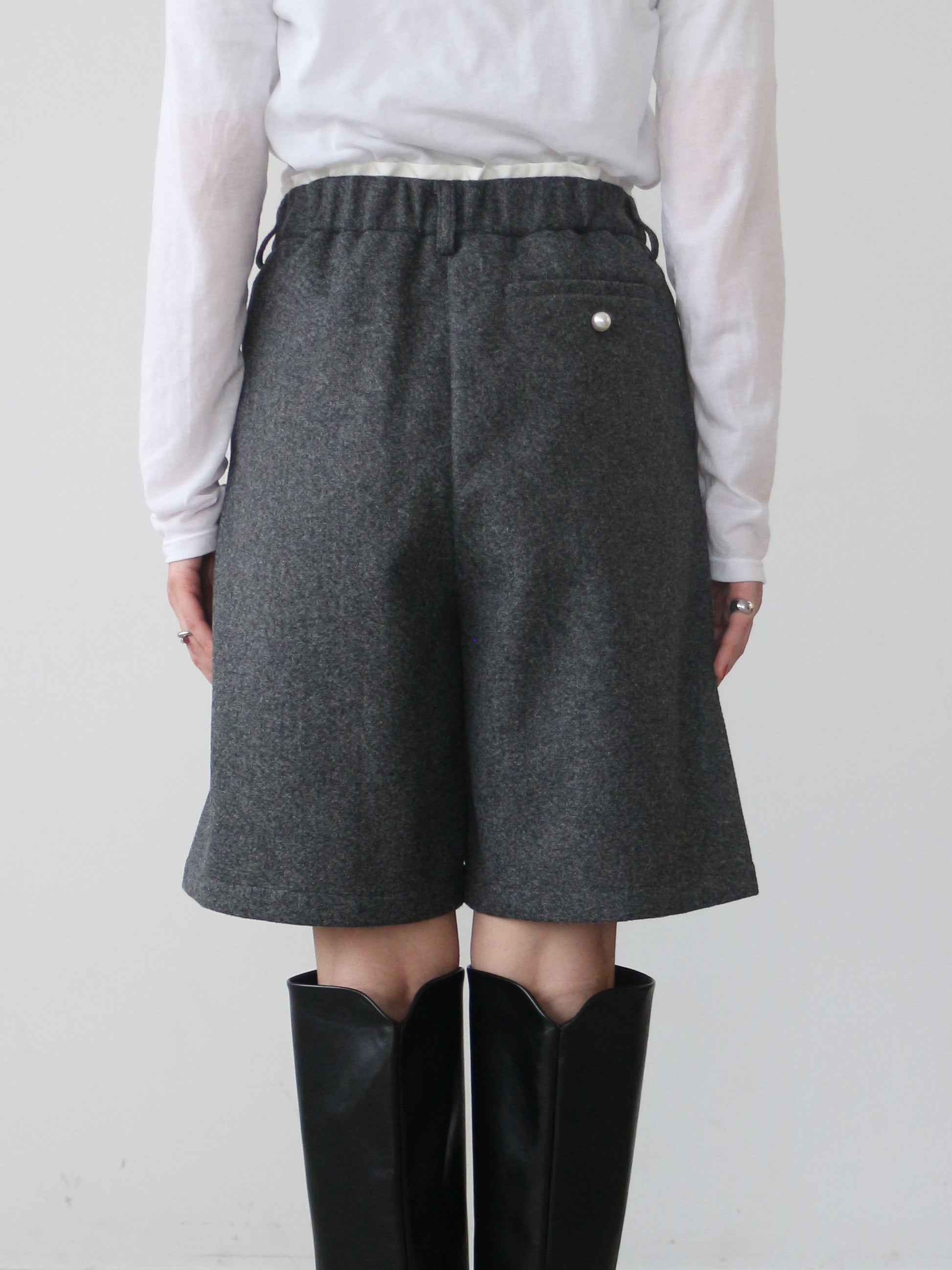 程よくゆとりを持たせたシルエットと絶妙な膝上丈で細見えを誘い、トレンドのロングブーツとの相性も抜群。後ポケットのパールボタンもアクセントに。