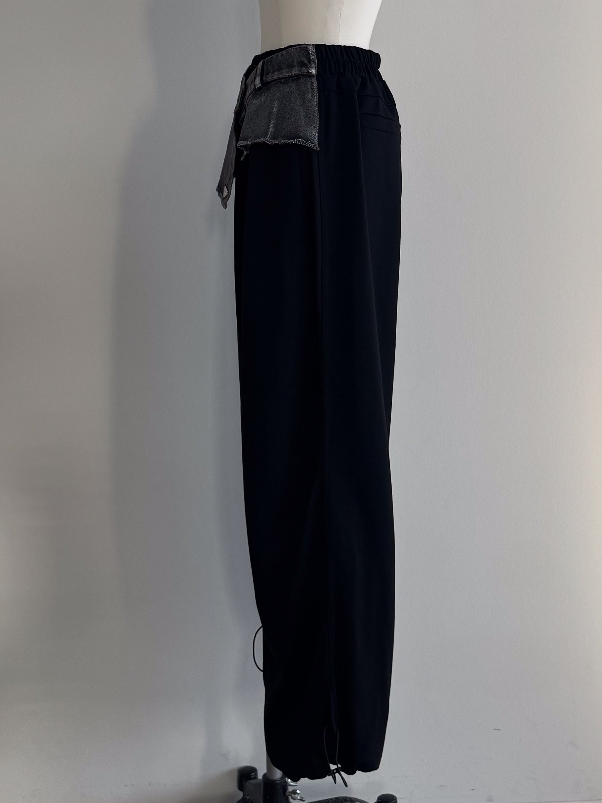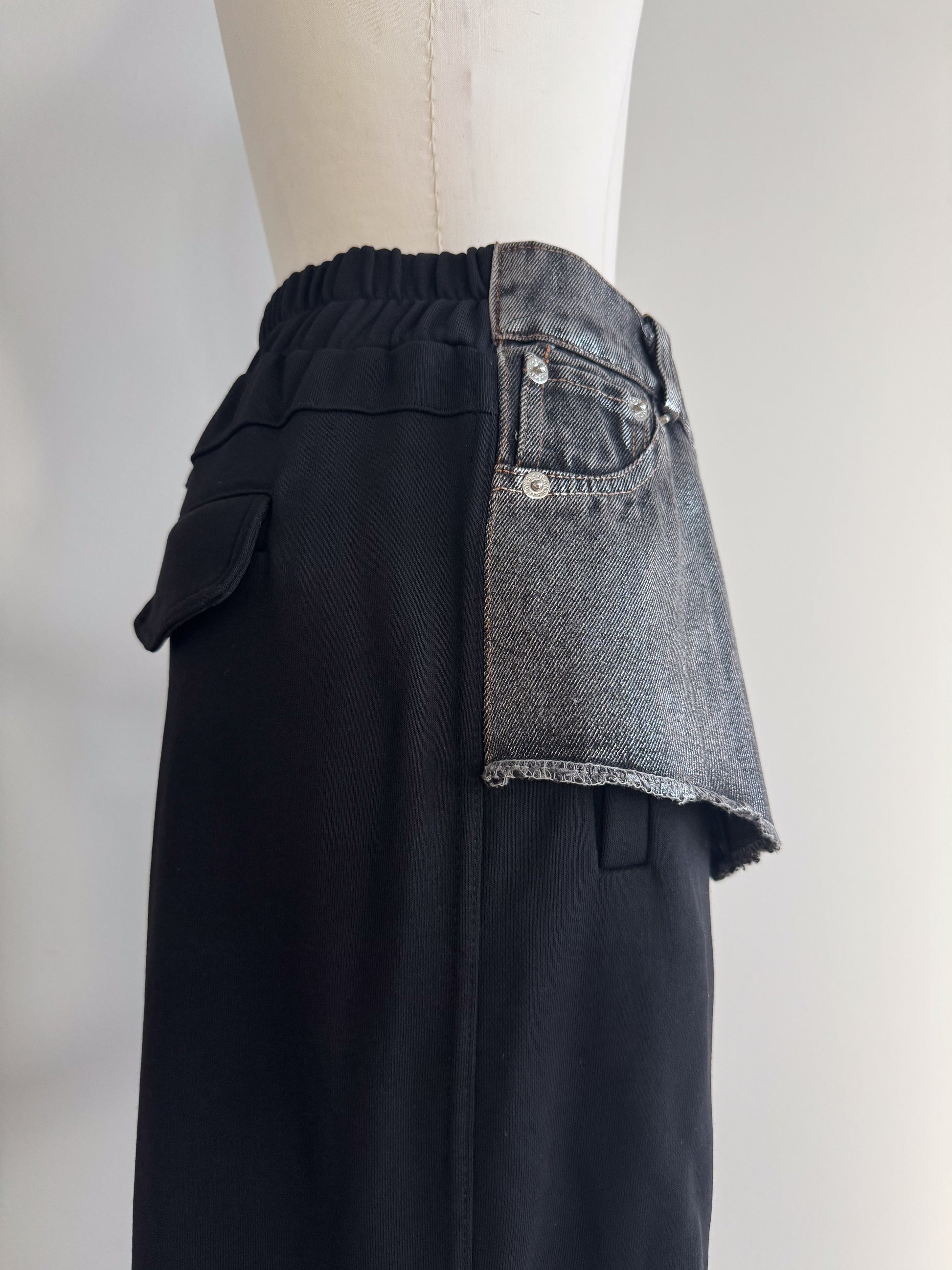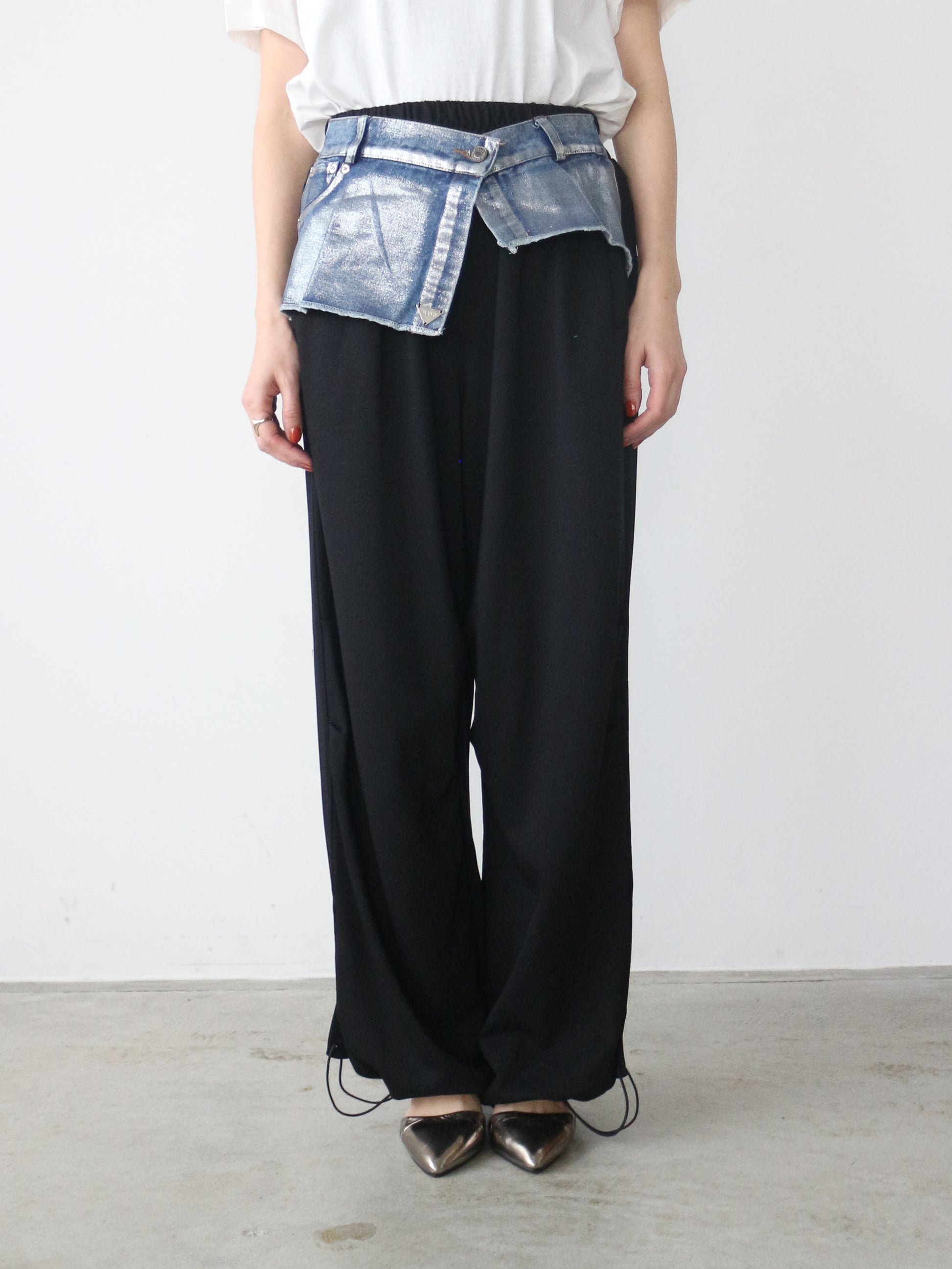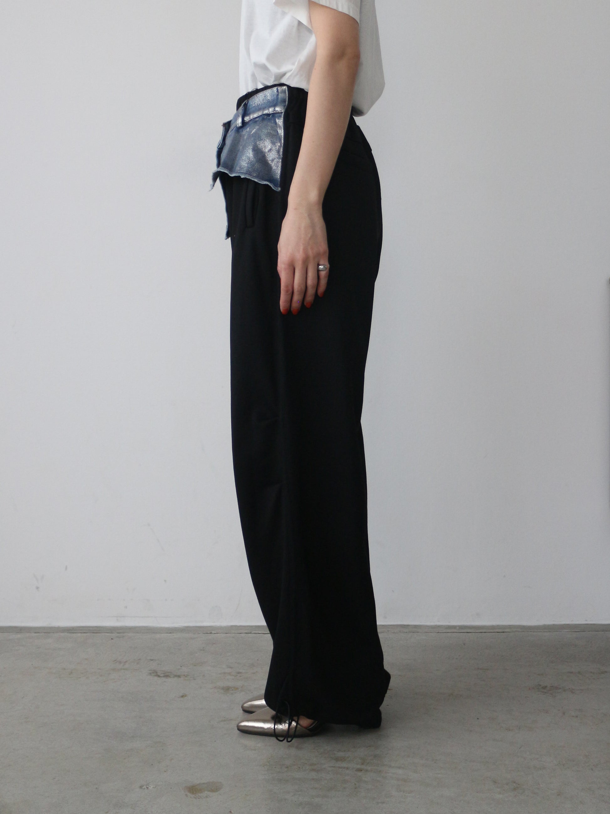 ベースの裏毛素材のパンツはブラック共通 ウェスト、デニムパーツはインディゴ×ラメとブラック×ラメの2色展開です。