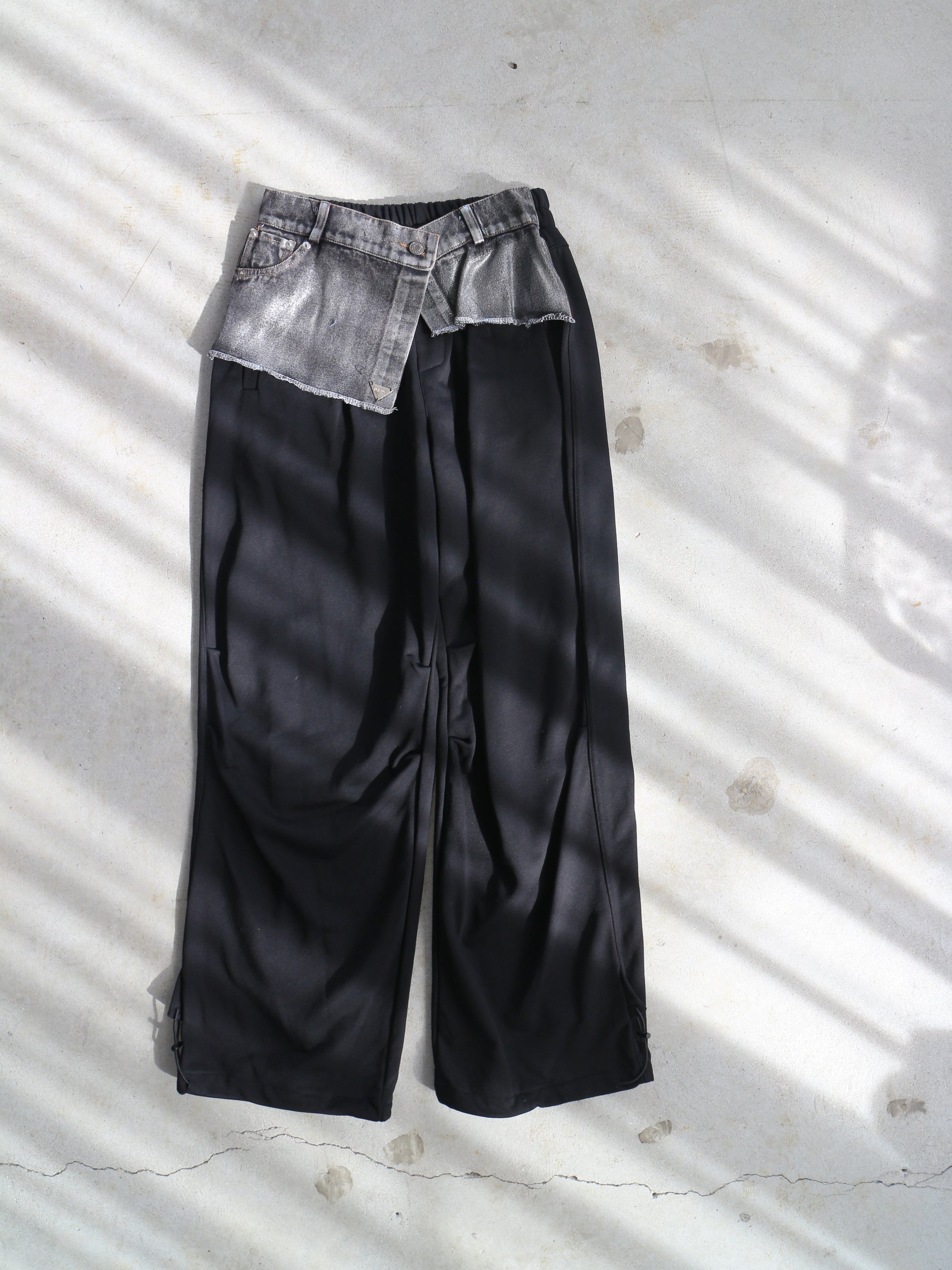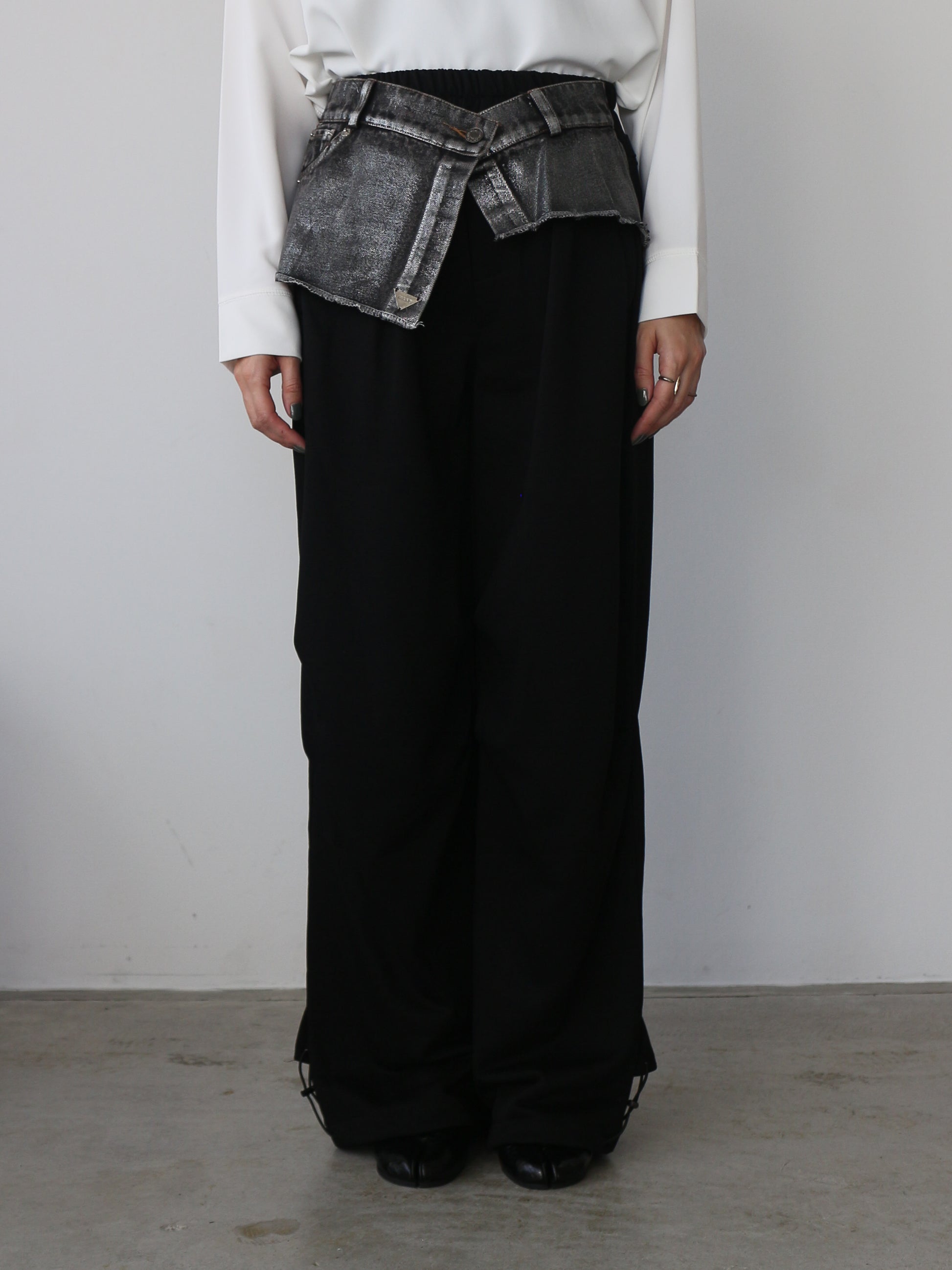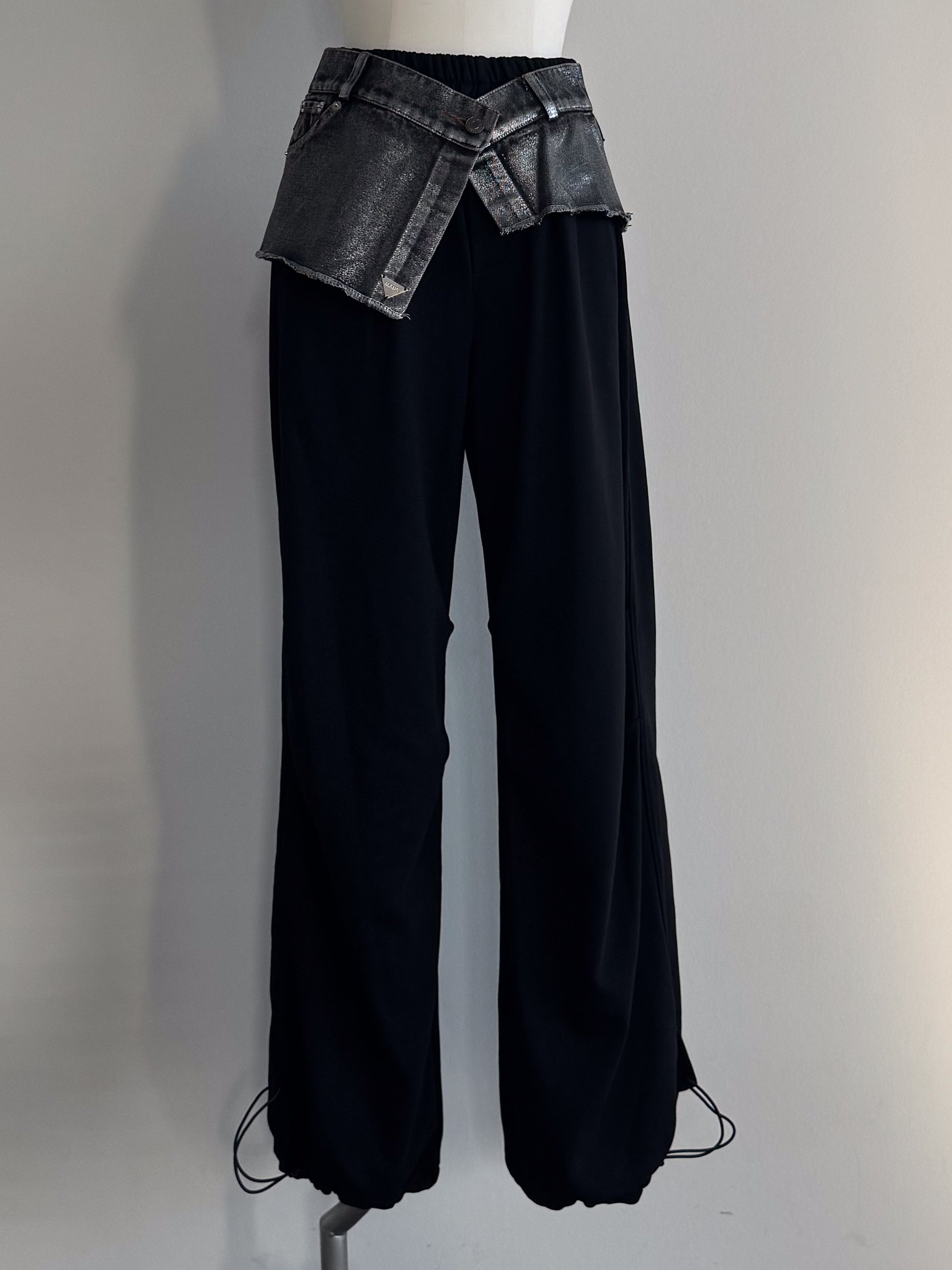 ベースの裏毛素材のパンツはブラック共通 ウェスト、デニムパーツはインディゴ×ラメとブラック×ラメの2色展開です。