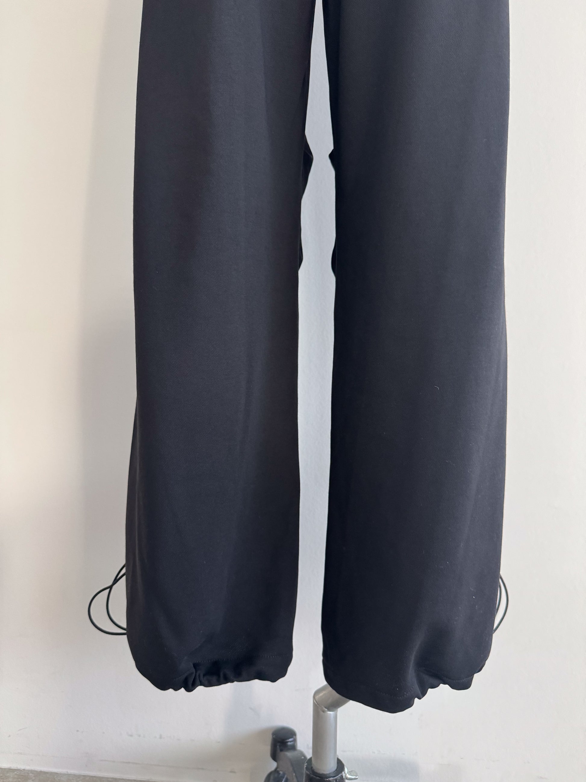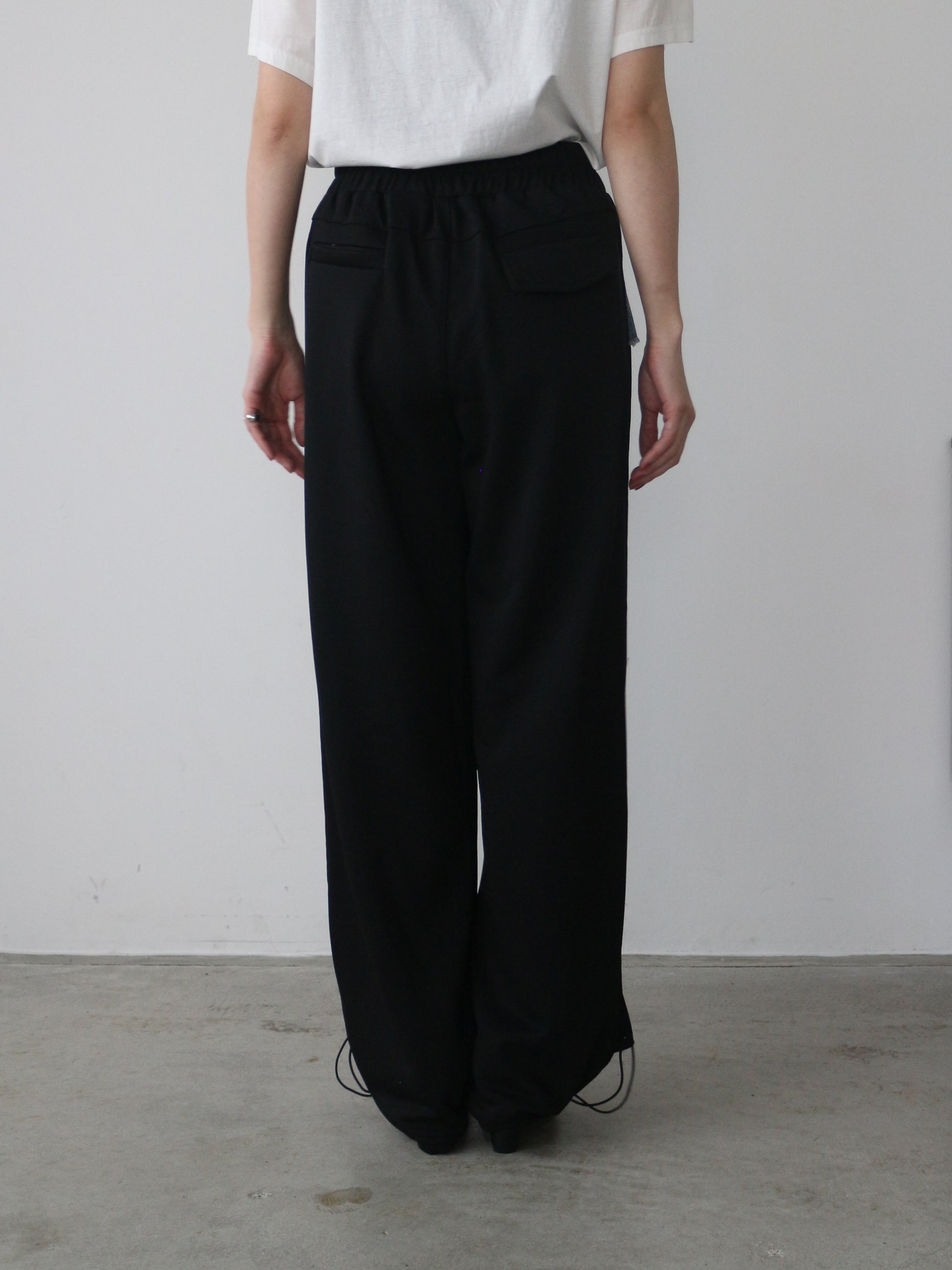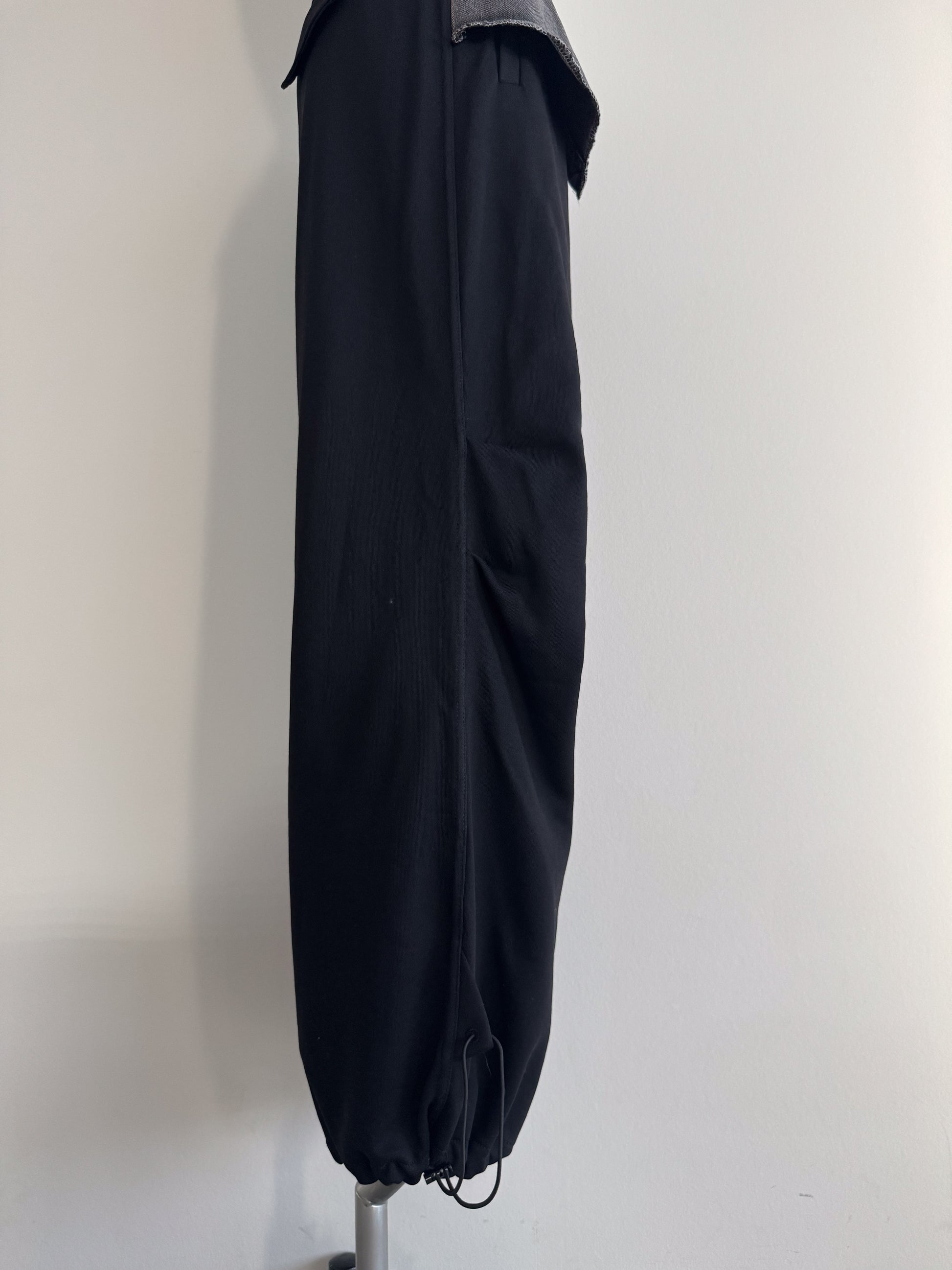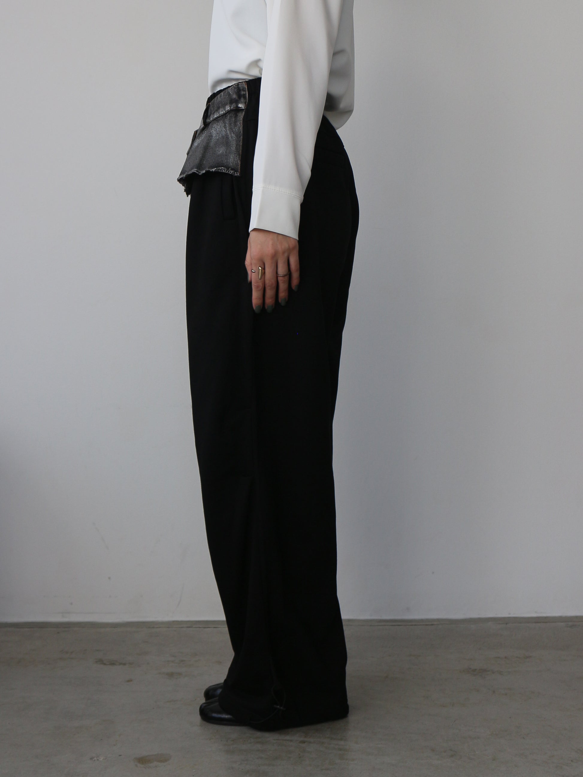 ベースの裏毛素材のパンツはブラック共通 ウェスト、デニムパーツはインディゴ×ラメとブラック×ラメの2色展開です。