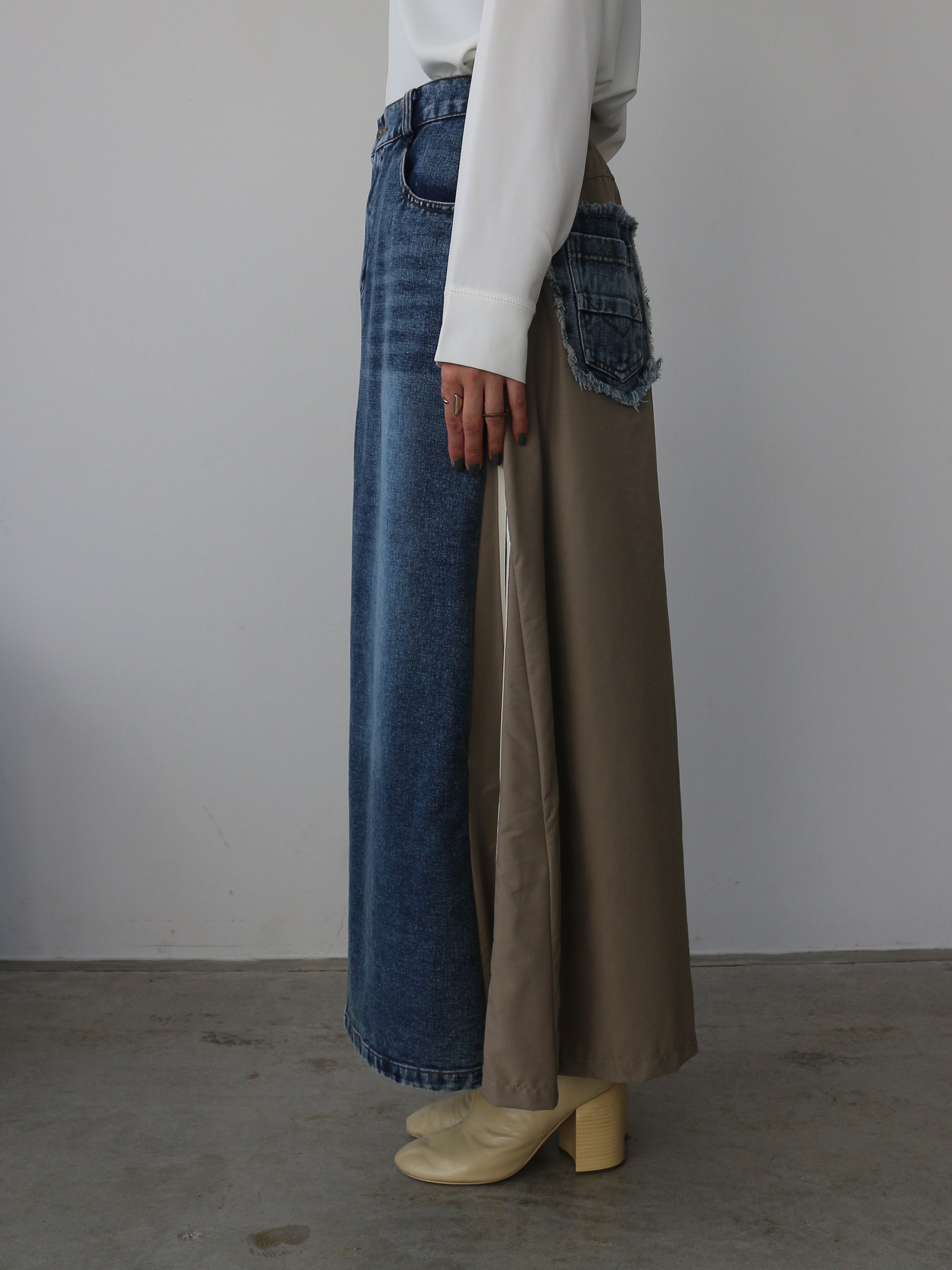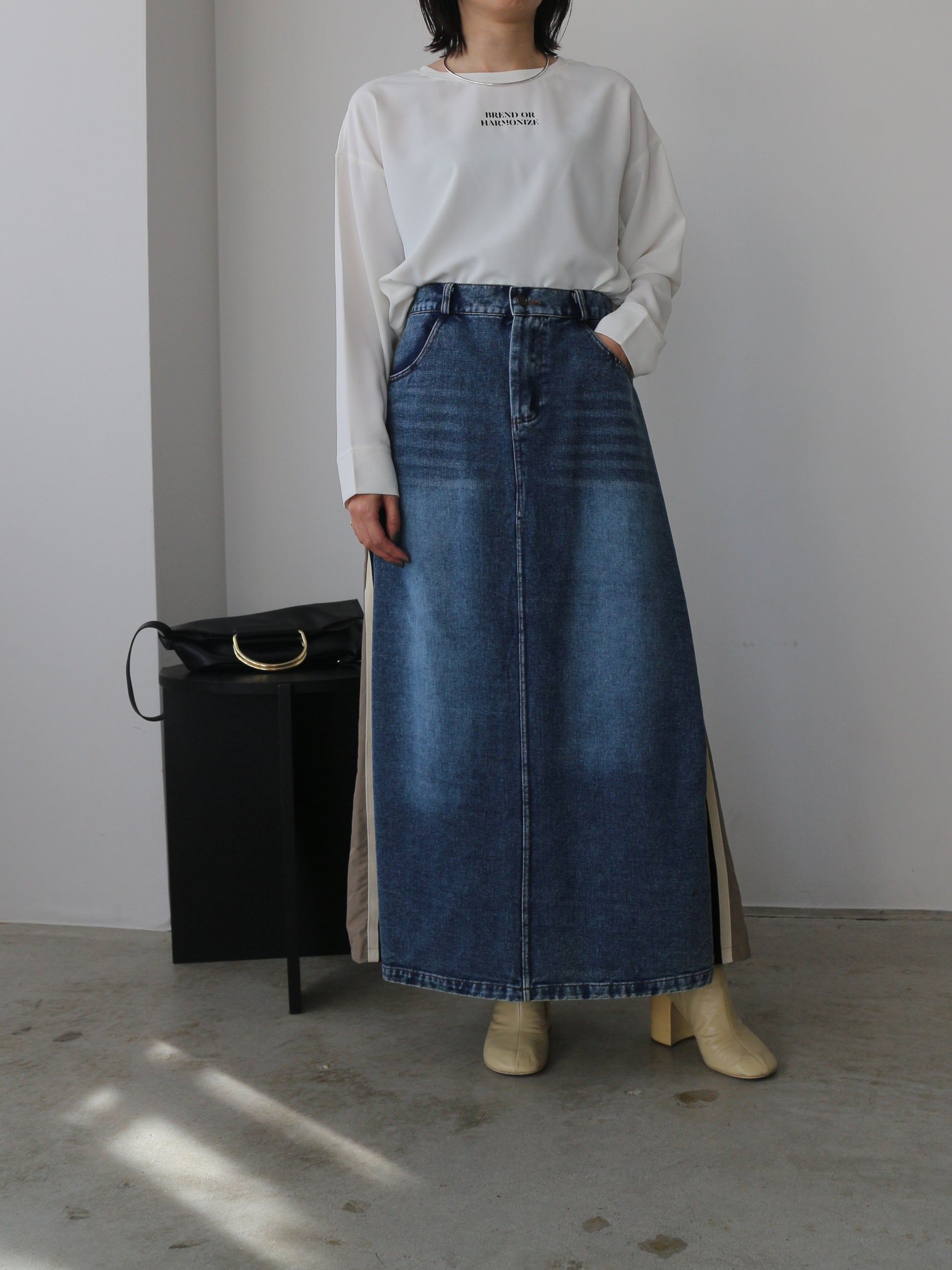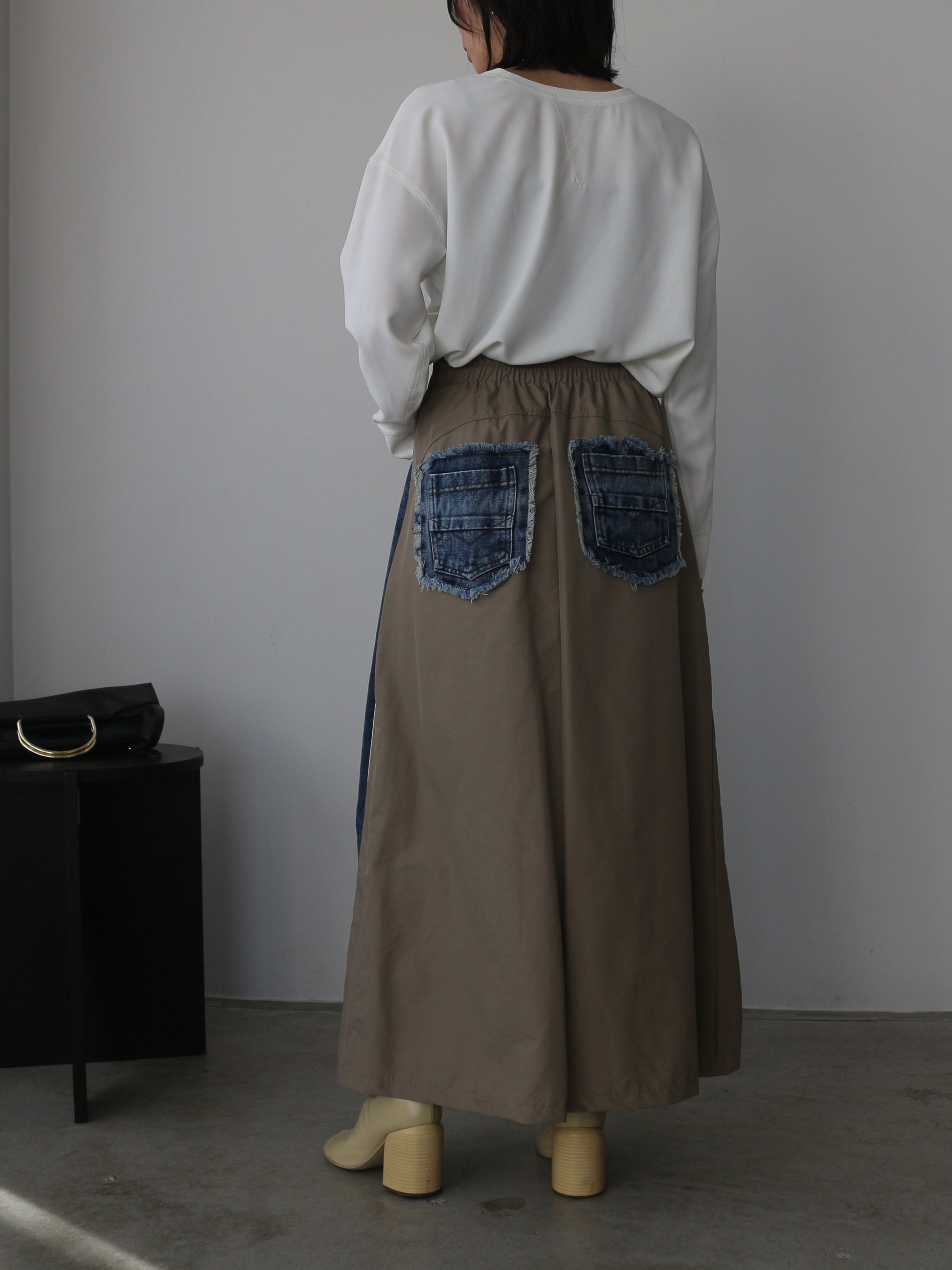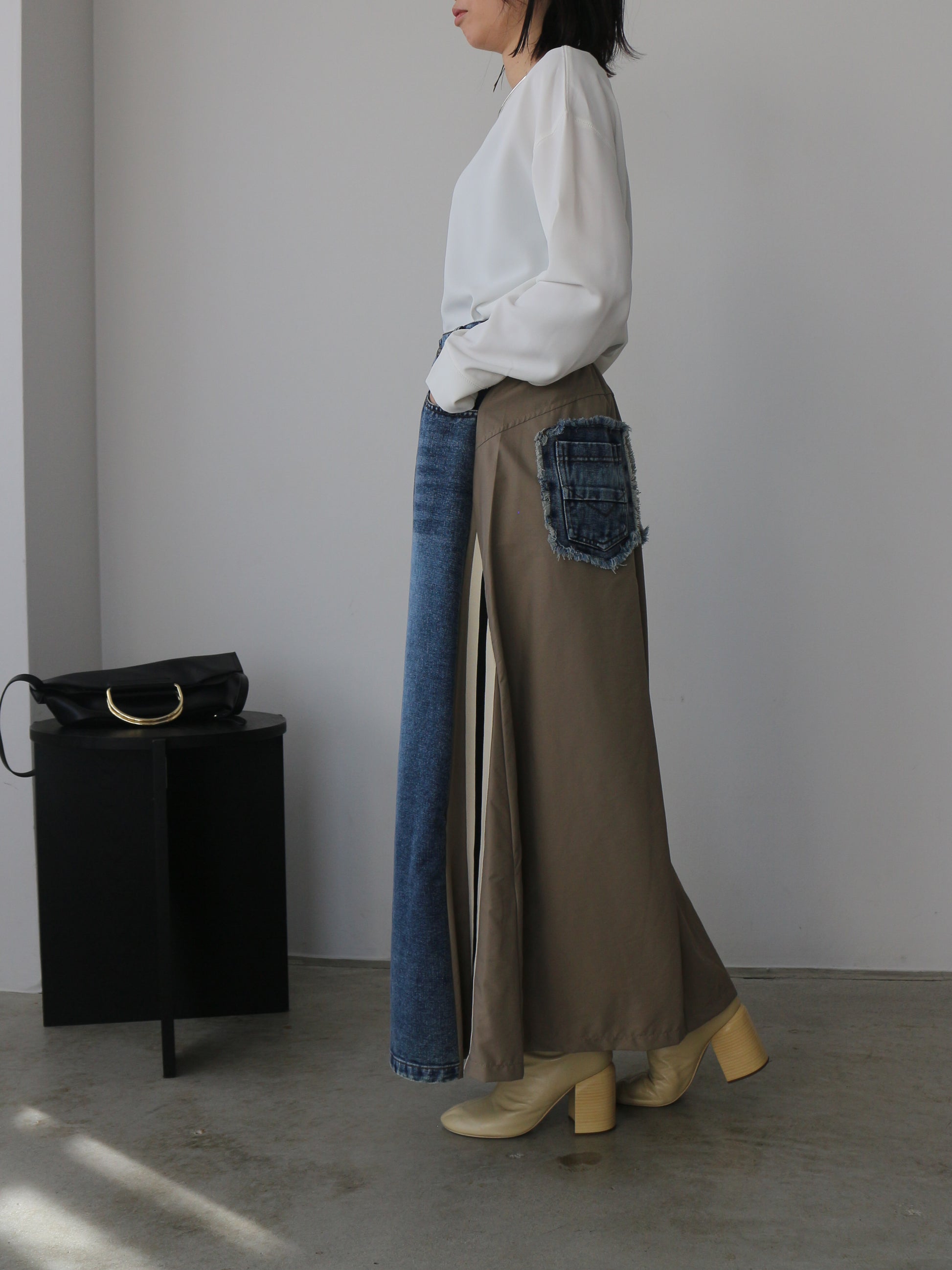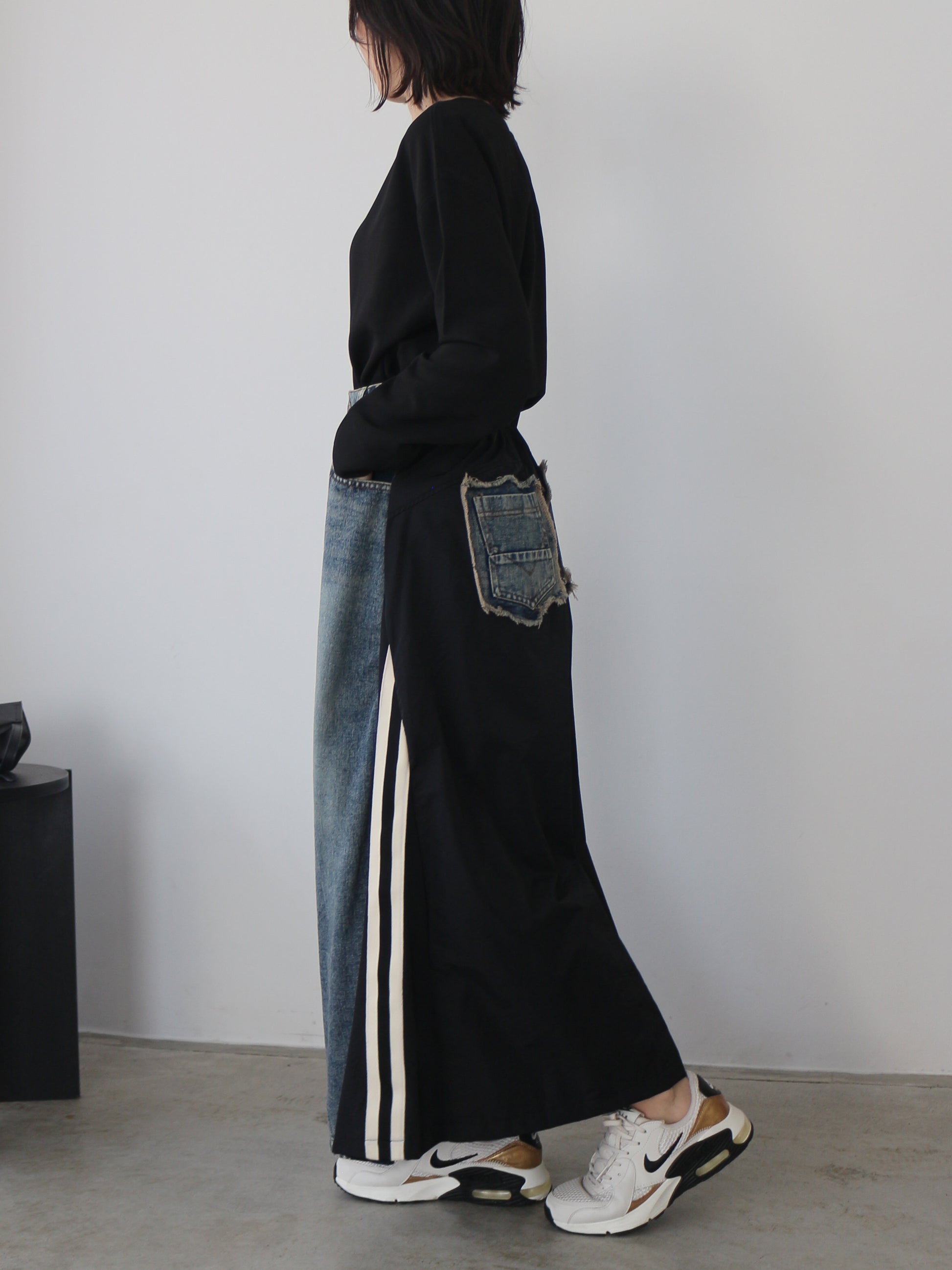 カット裏毛切り替えデニムパンツ ミニ裏毛でストレートに切り替える事で、スッキリとした足長ラインに見せてくれます。