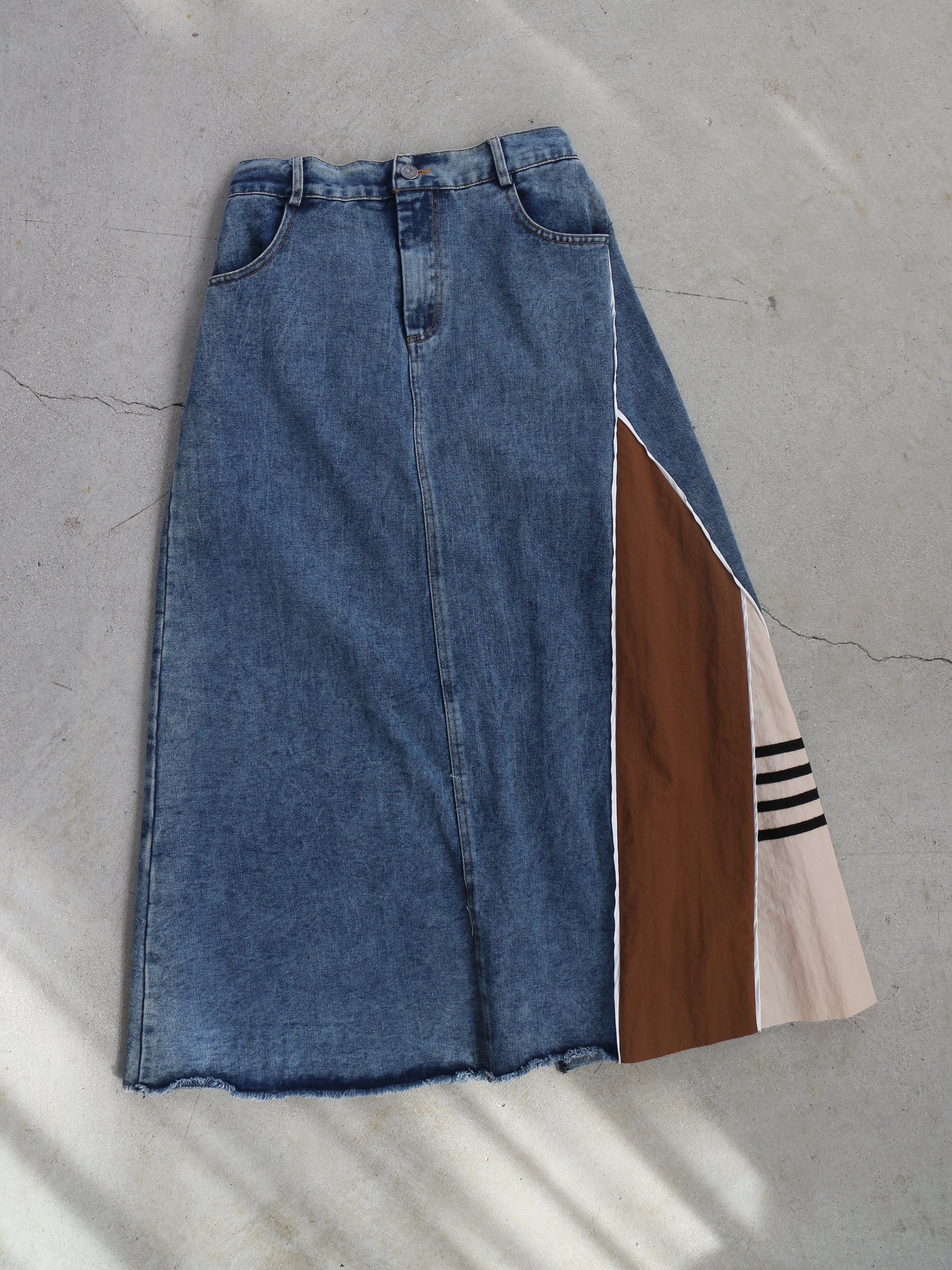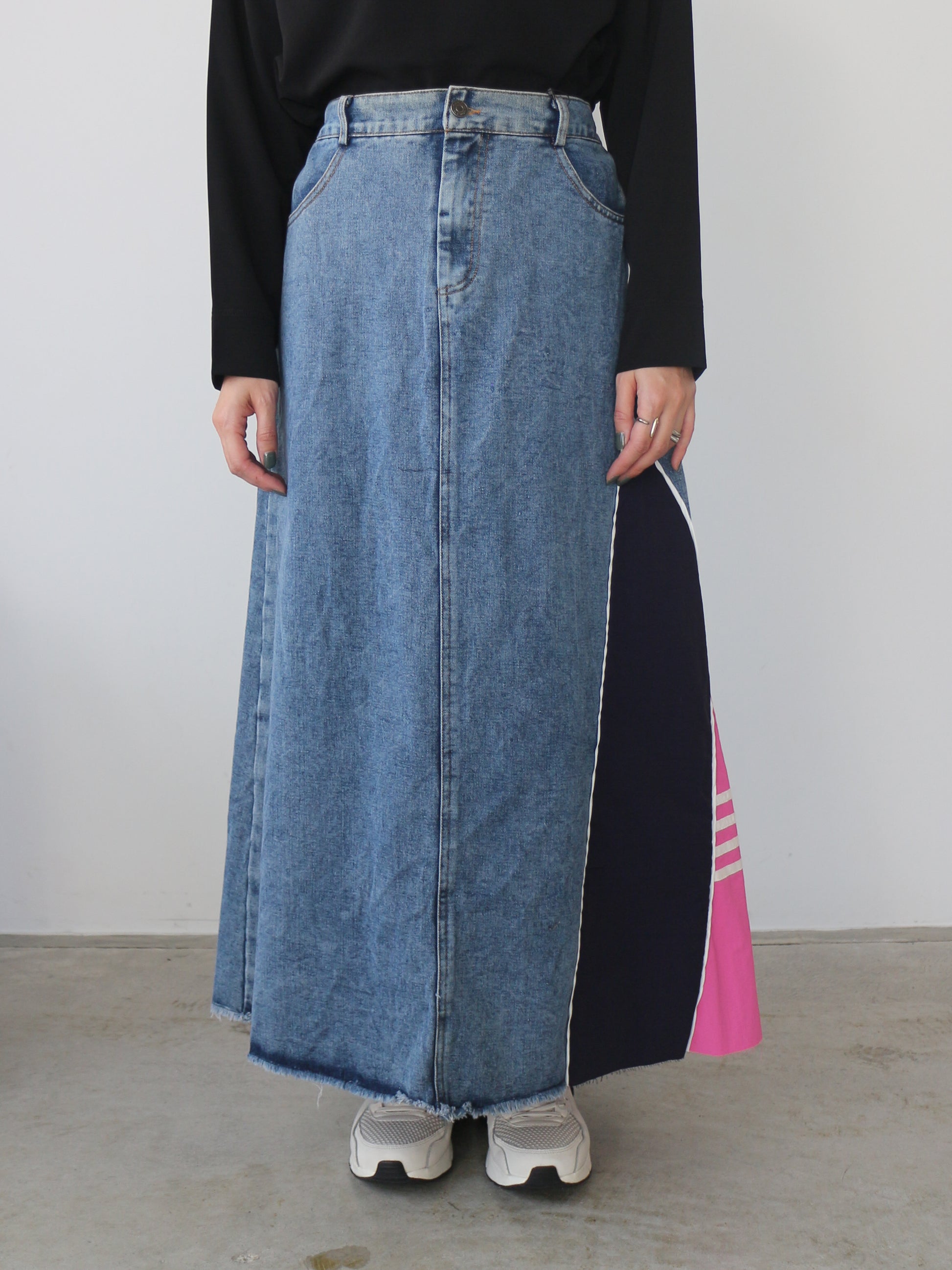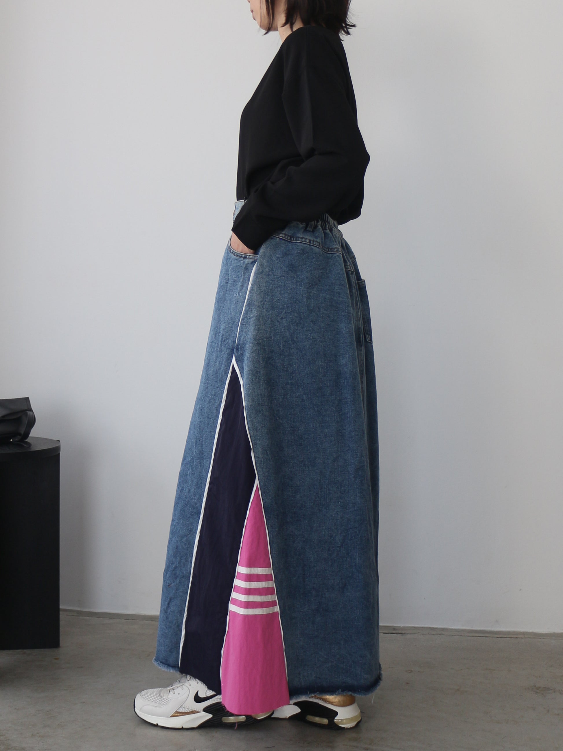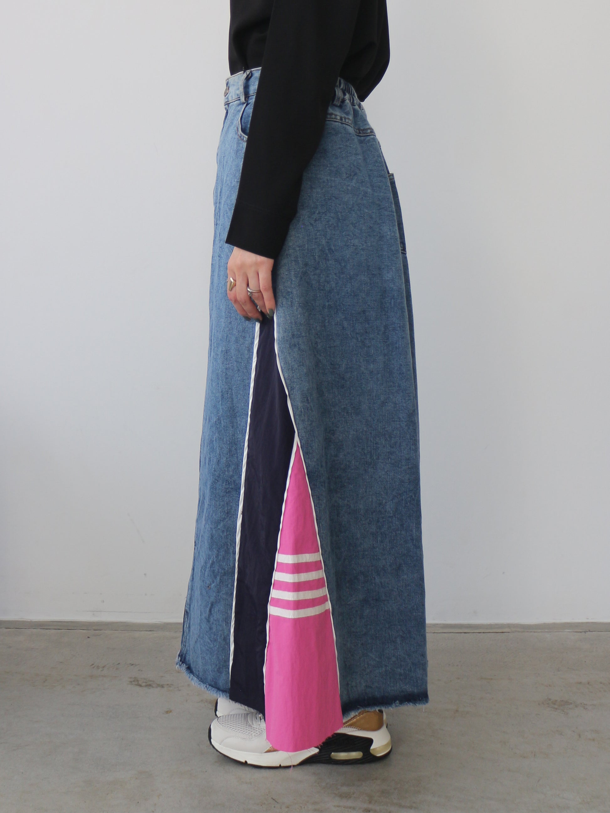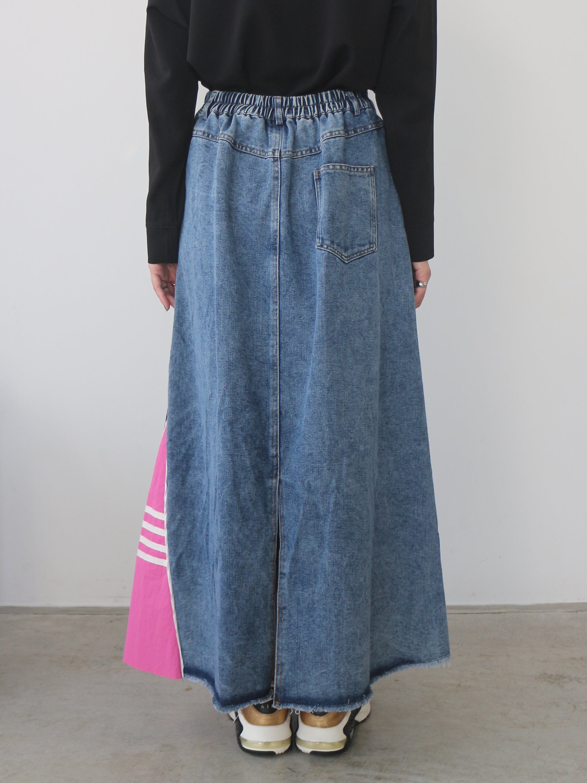 カジュアルの定番デニムとスポーツテイストを異素材で組み合わせた遊び心のあるドッキングデザイン。