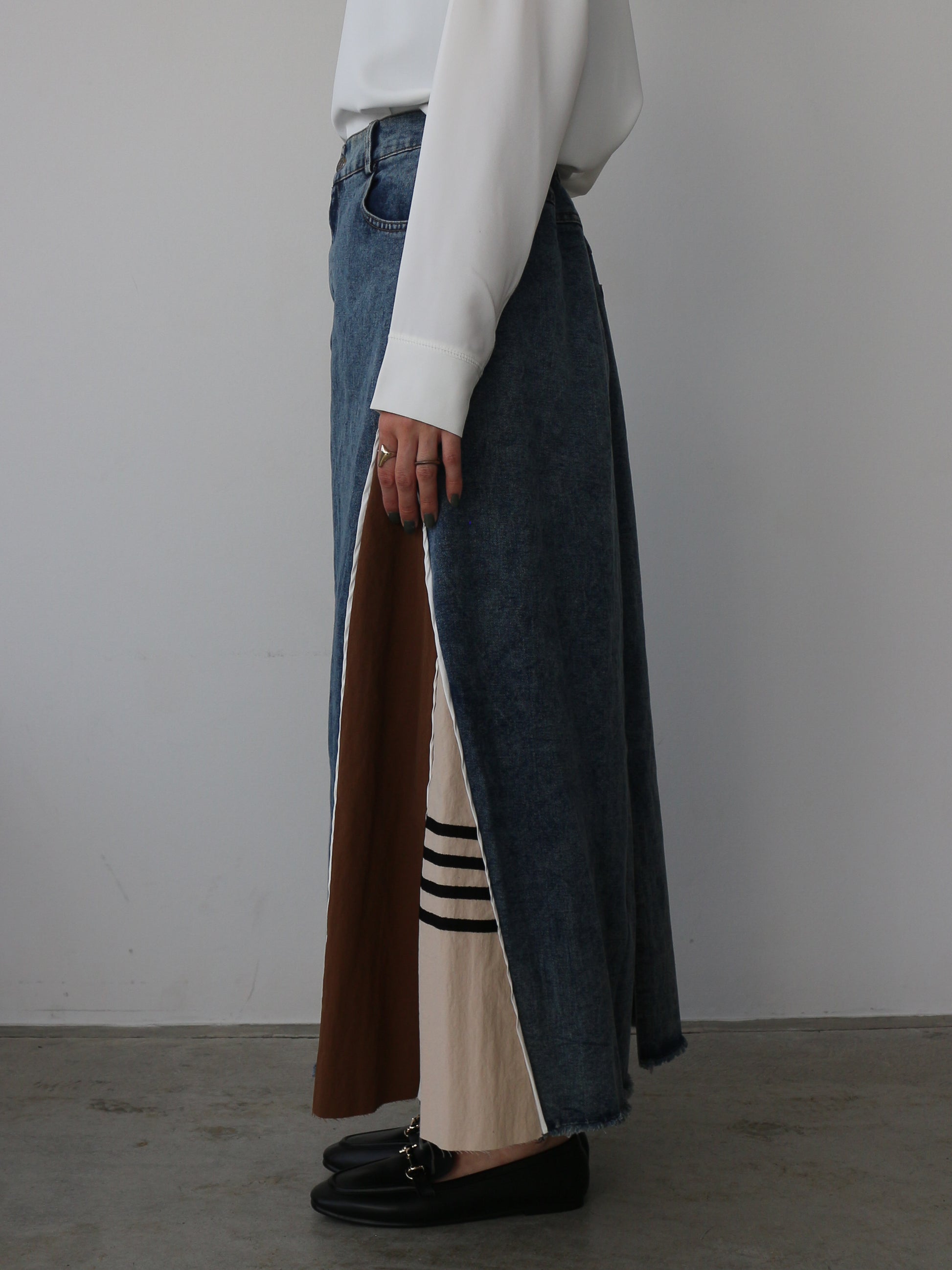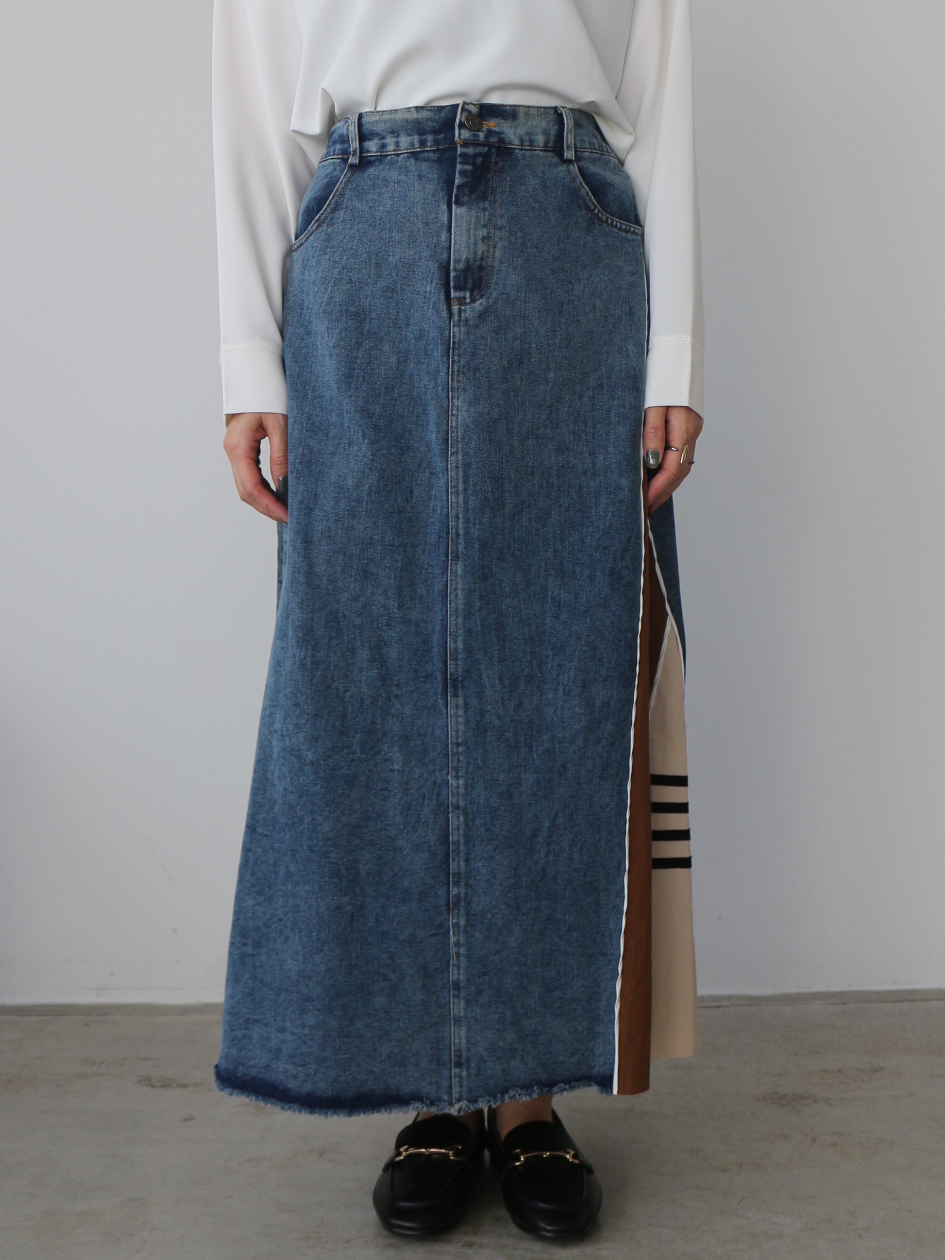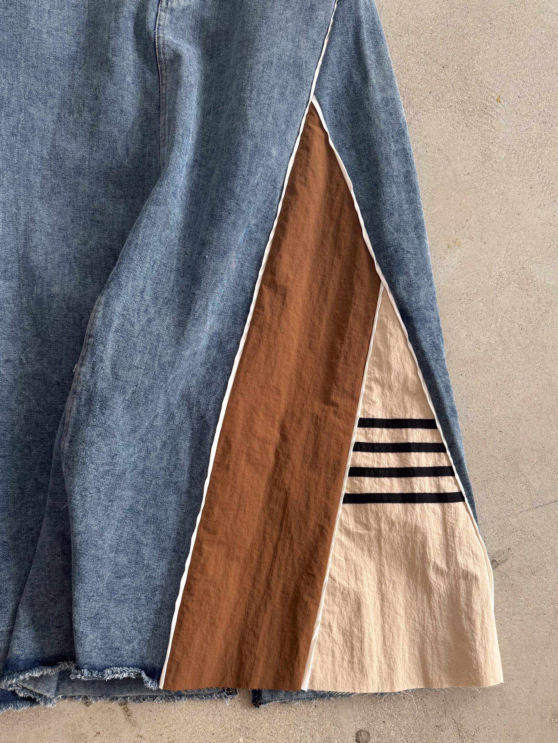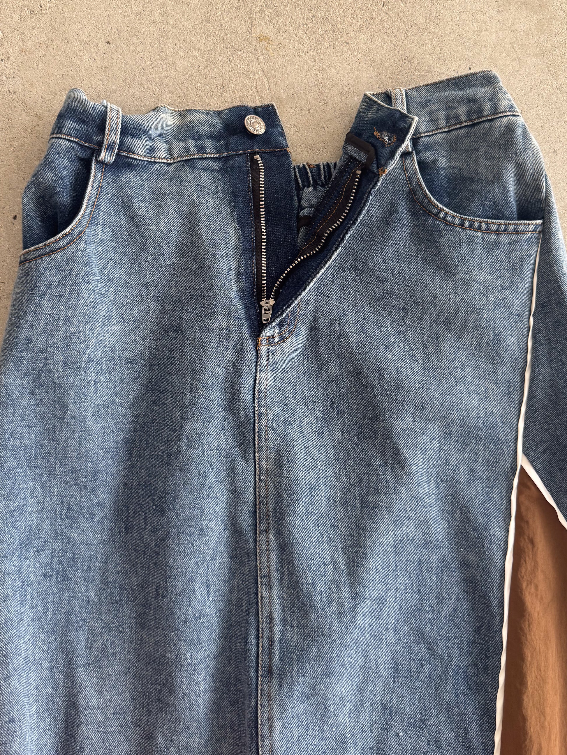 カジュアルの定番デニムとスポーツテイストを異素材で組み合わせた遊び心のあるドッキングデザイン。
