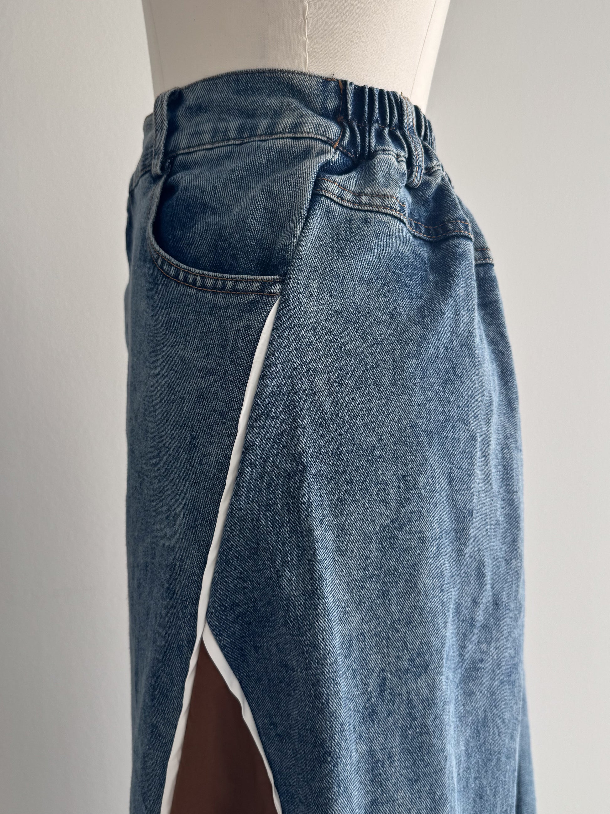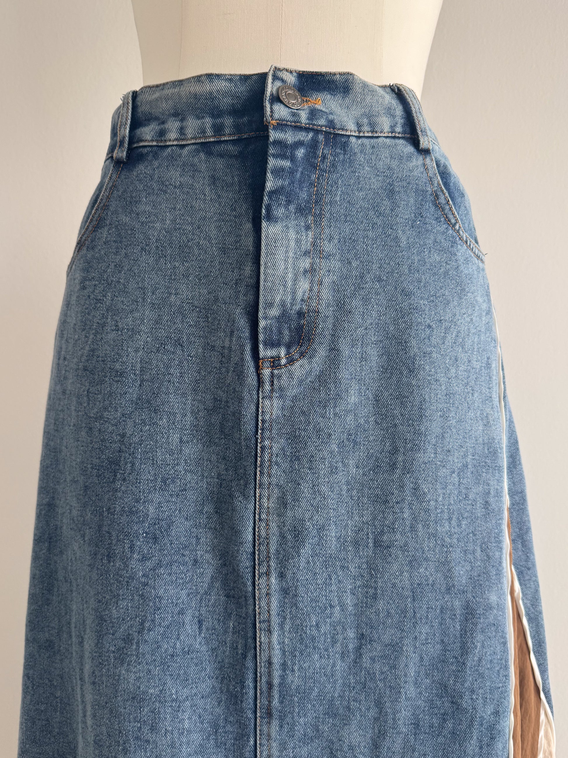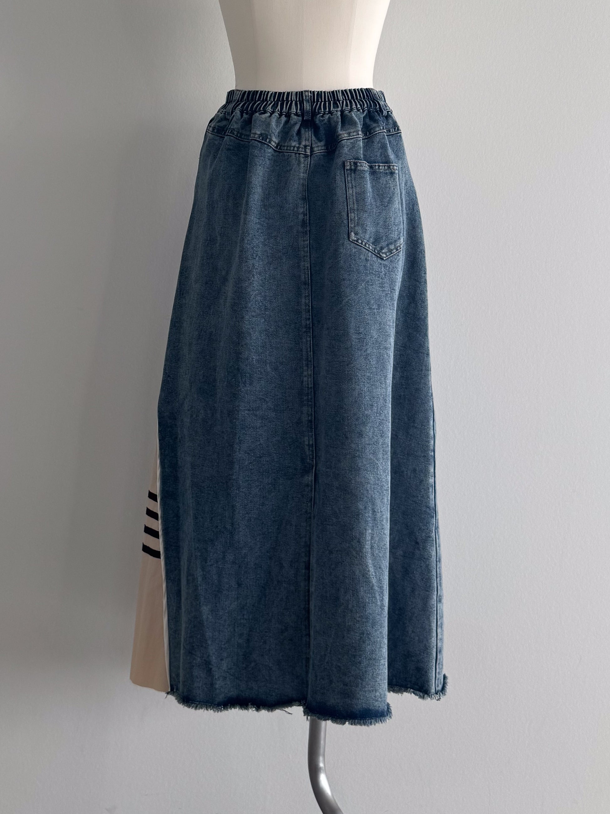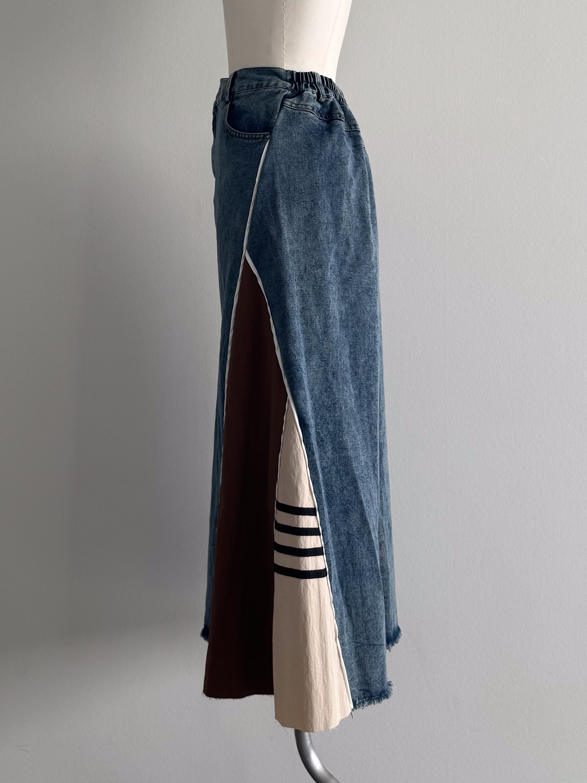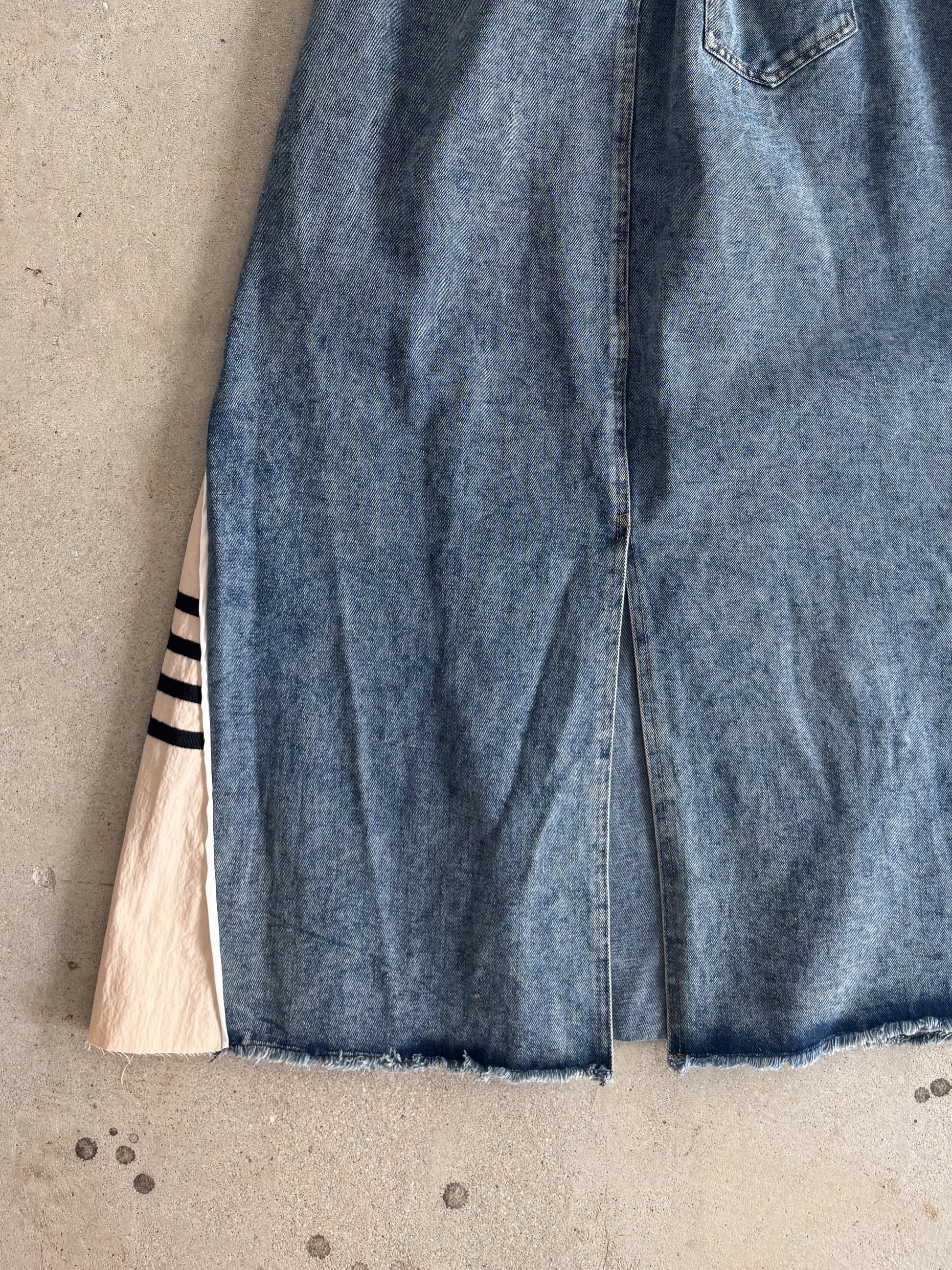 カジュアルの定番デニムとスポーツテイストを異素材で組み合わせた遊び心のあるドッキングデザイン。