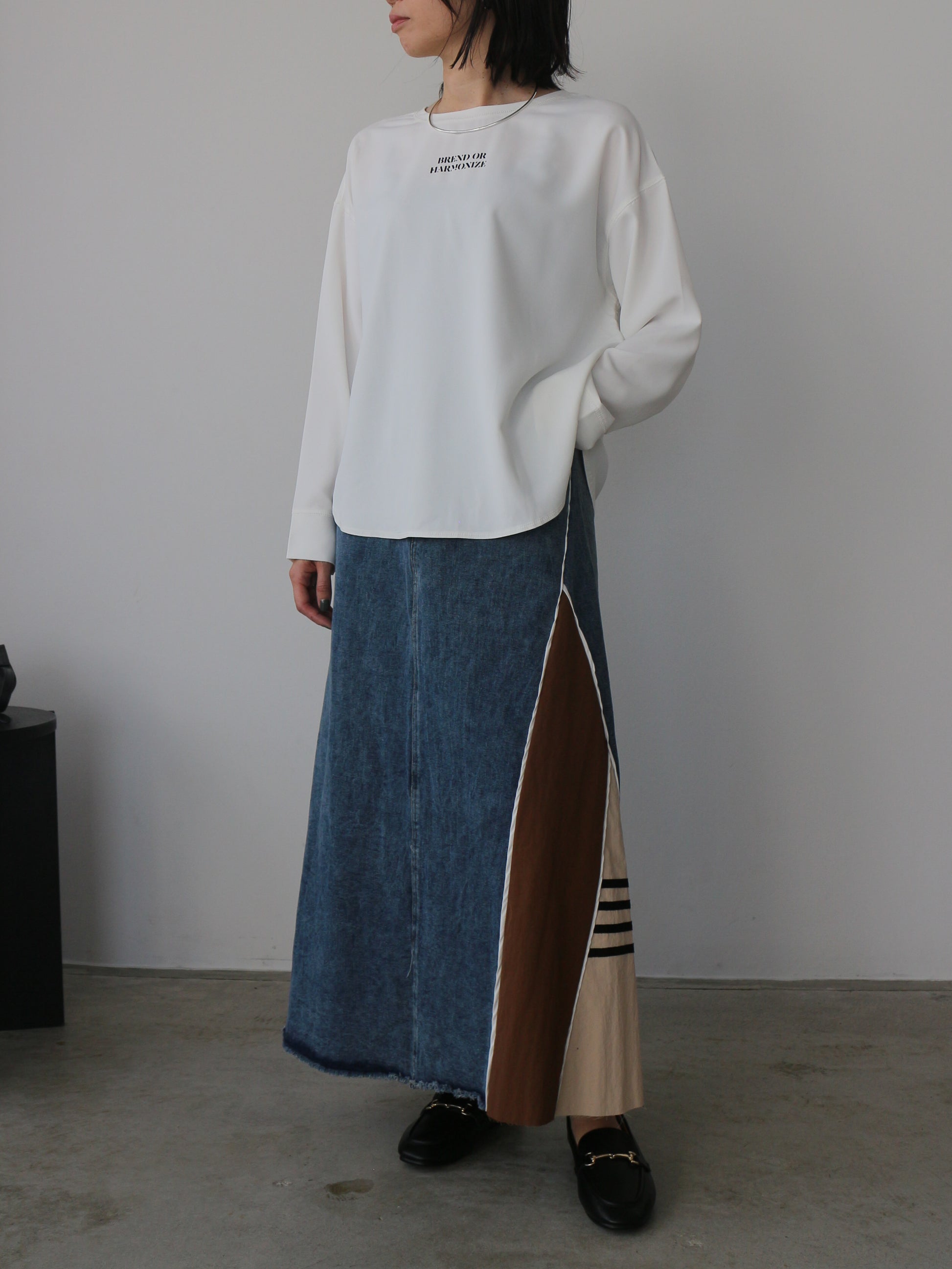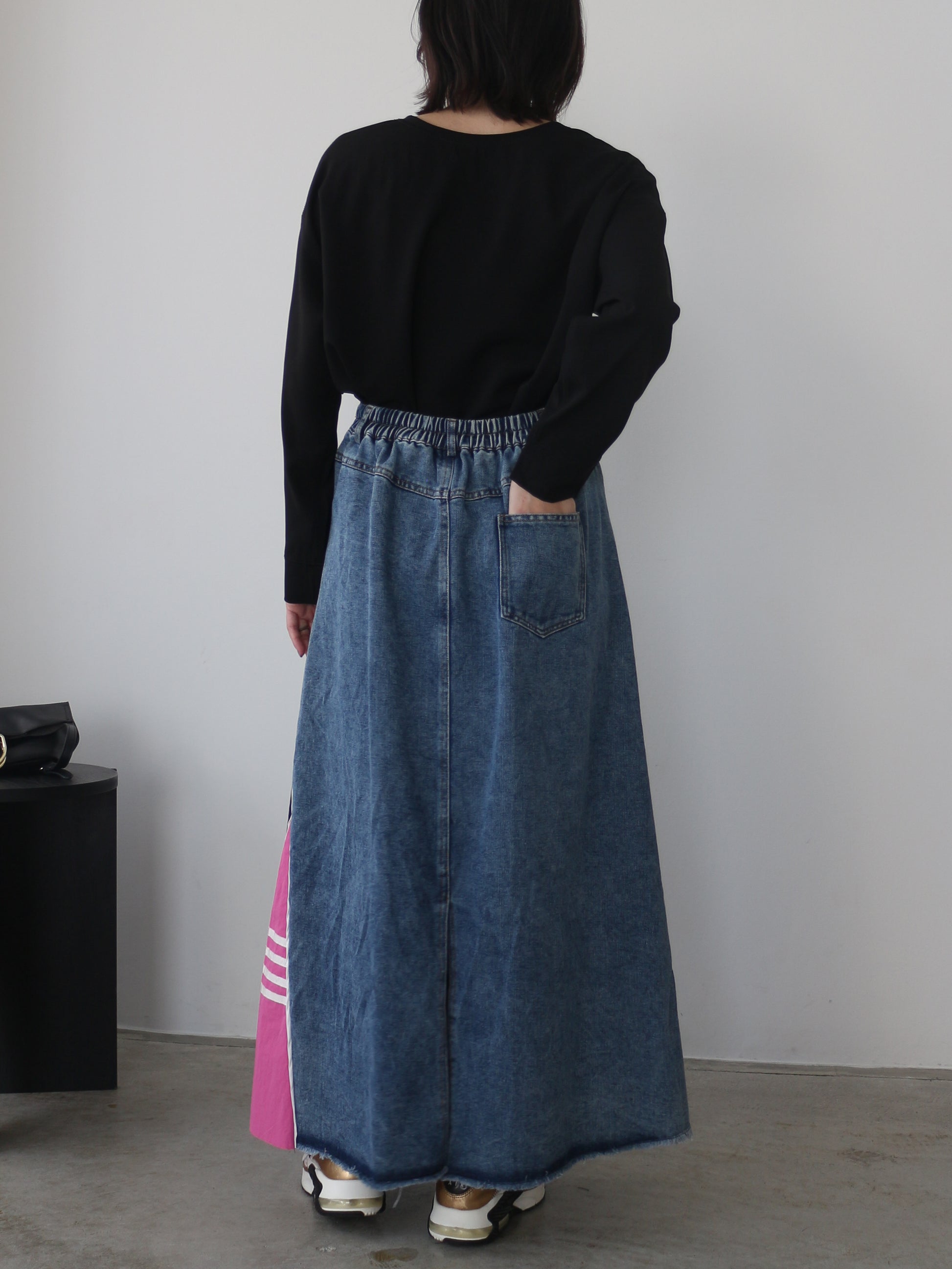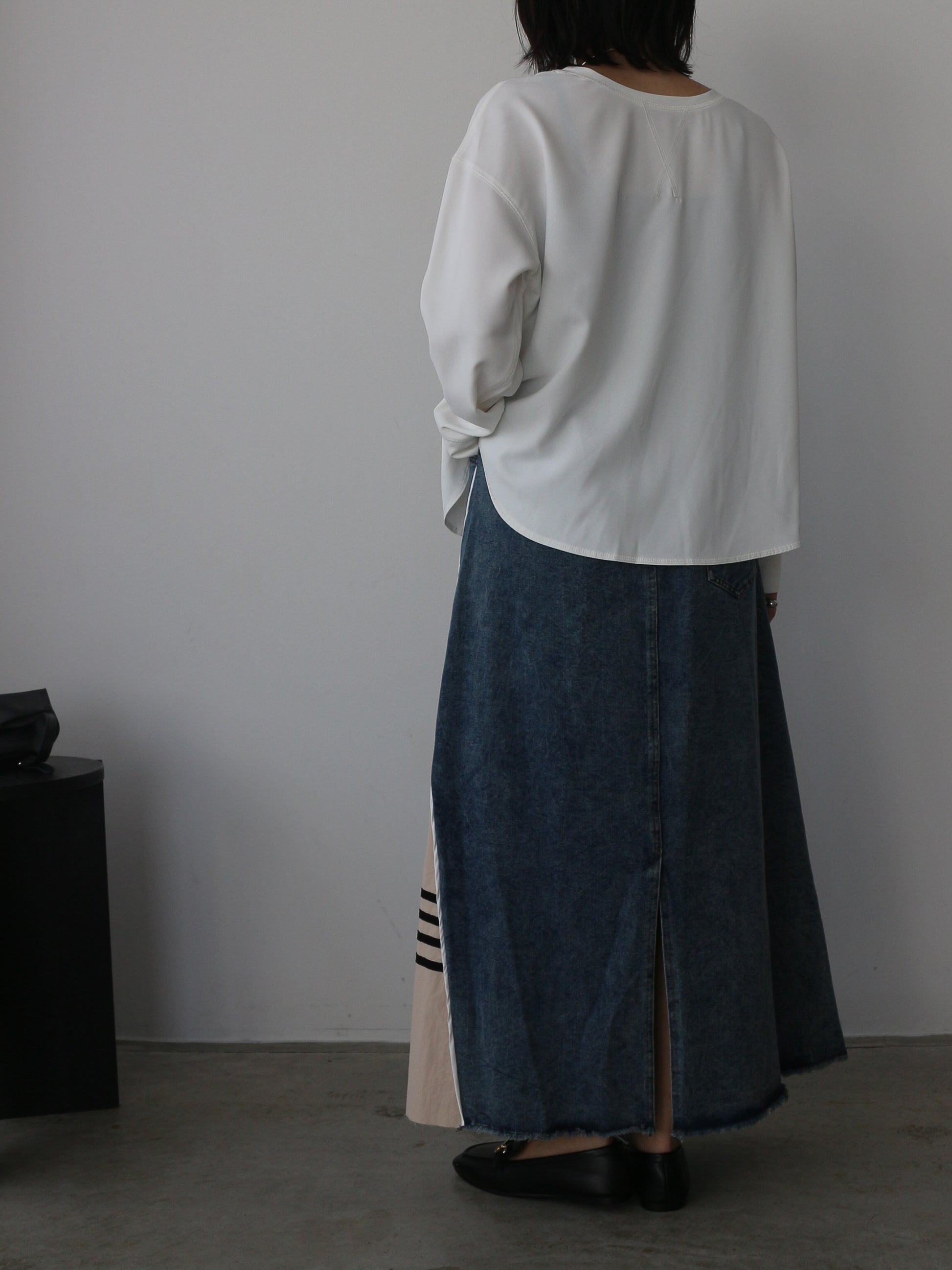 デニムと切り替える事での配色感かコーディネート幅を広げる1枚。