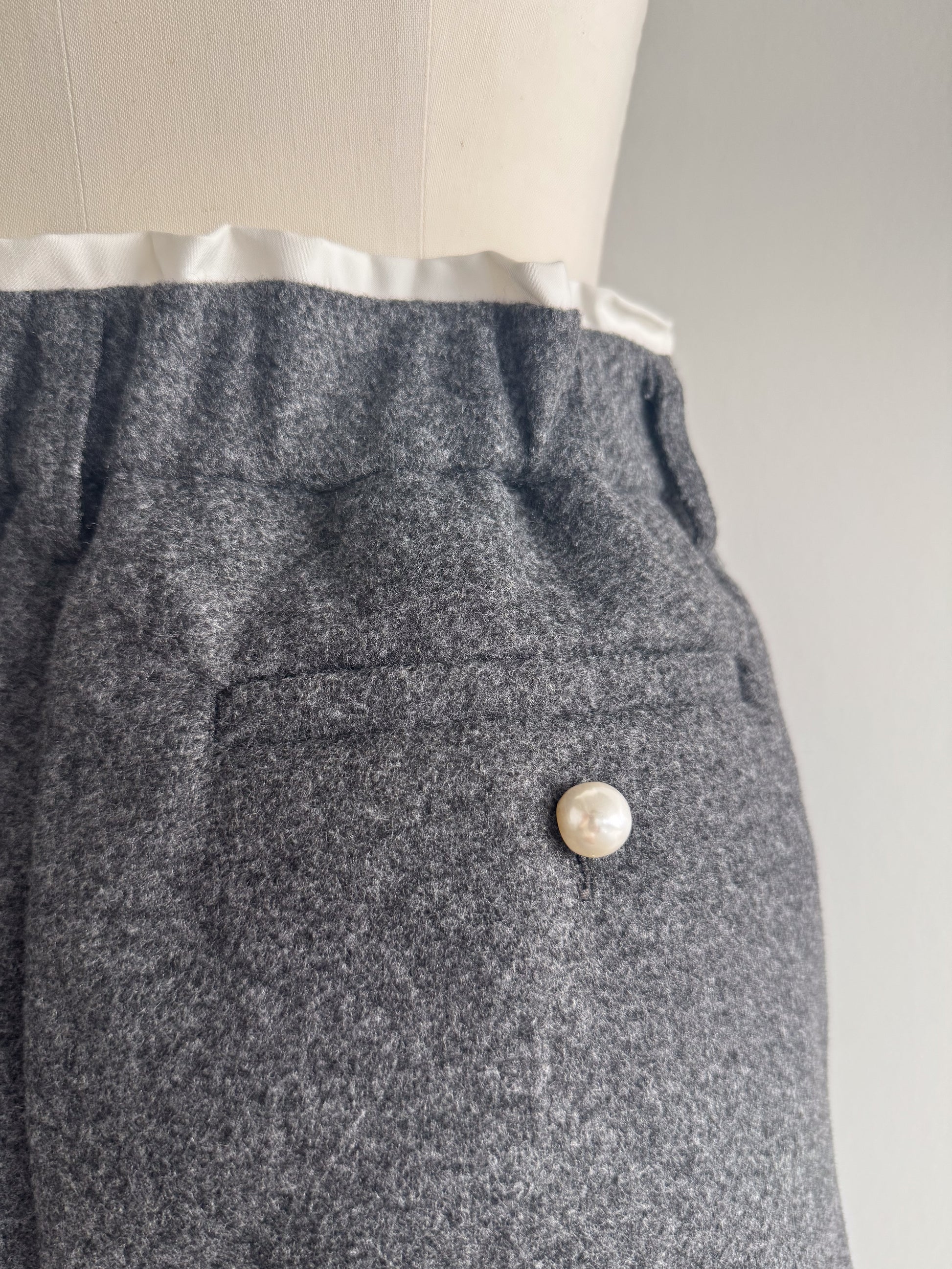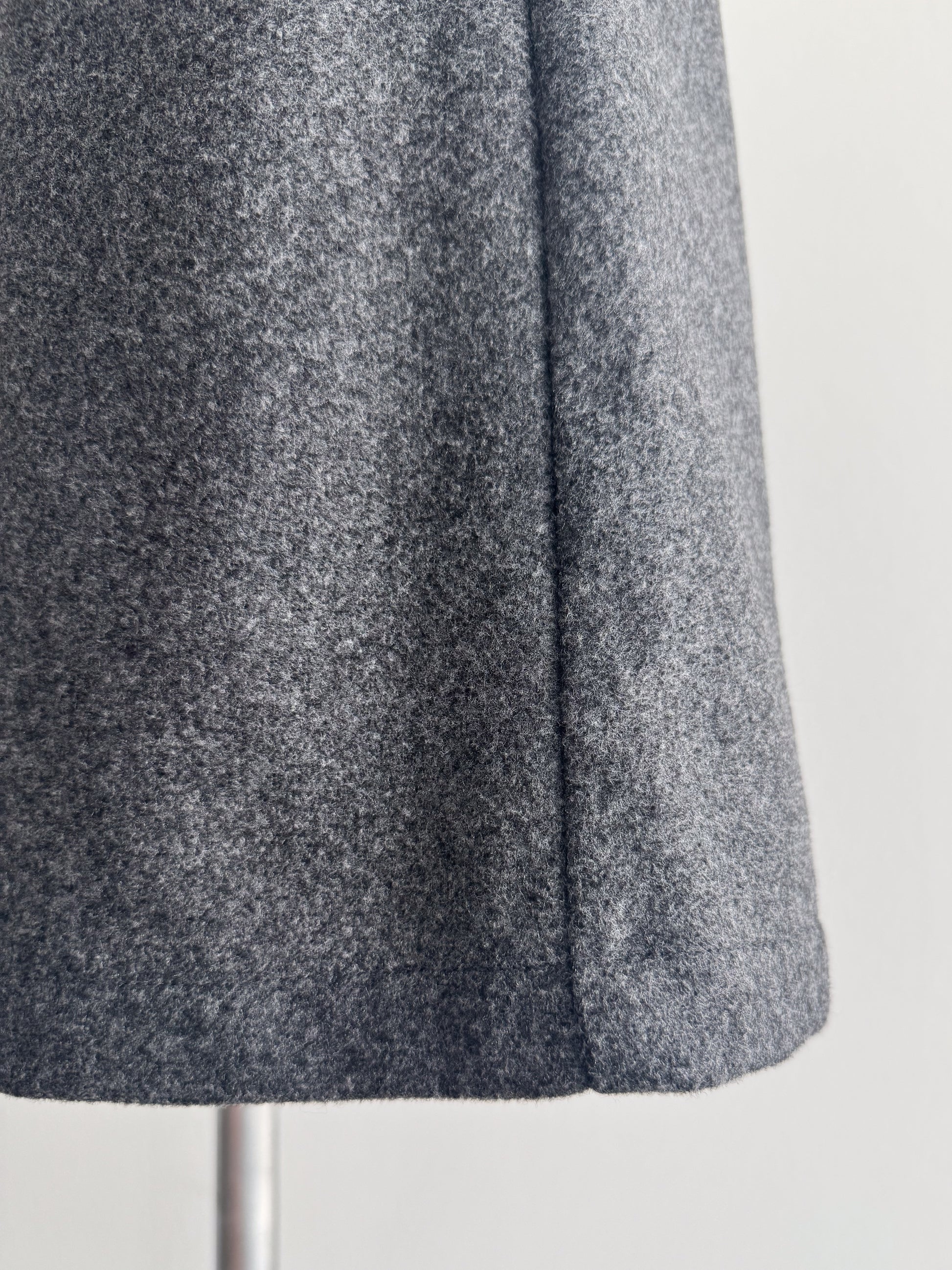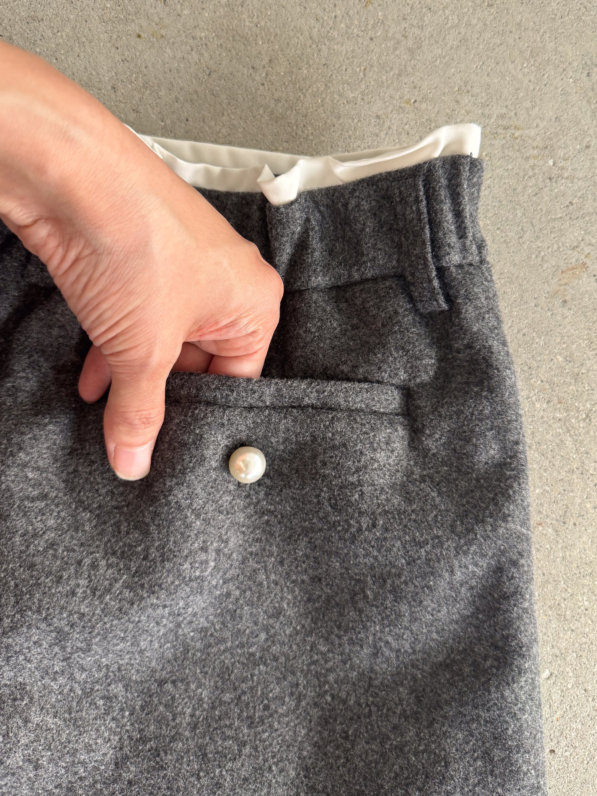 程よくゆとりを持たせたシルエットと絶妙な膝上丈で細見えを誘い、トレンドのロングブーツとの相性も抜群。後ポケットのパールボタンもアクセントに。