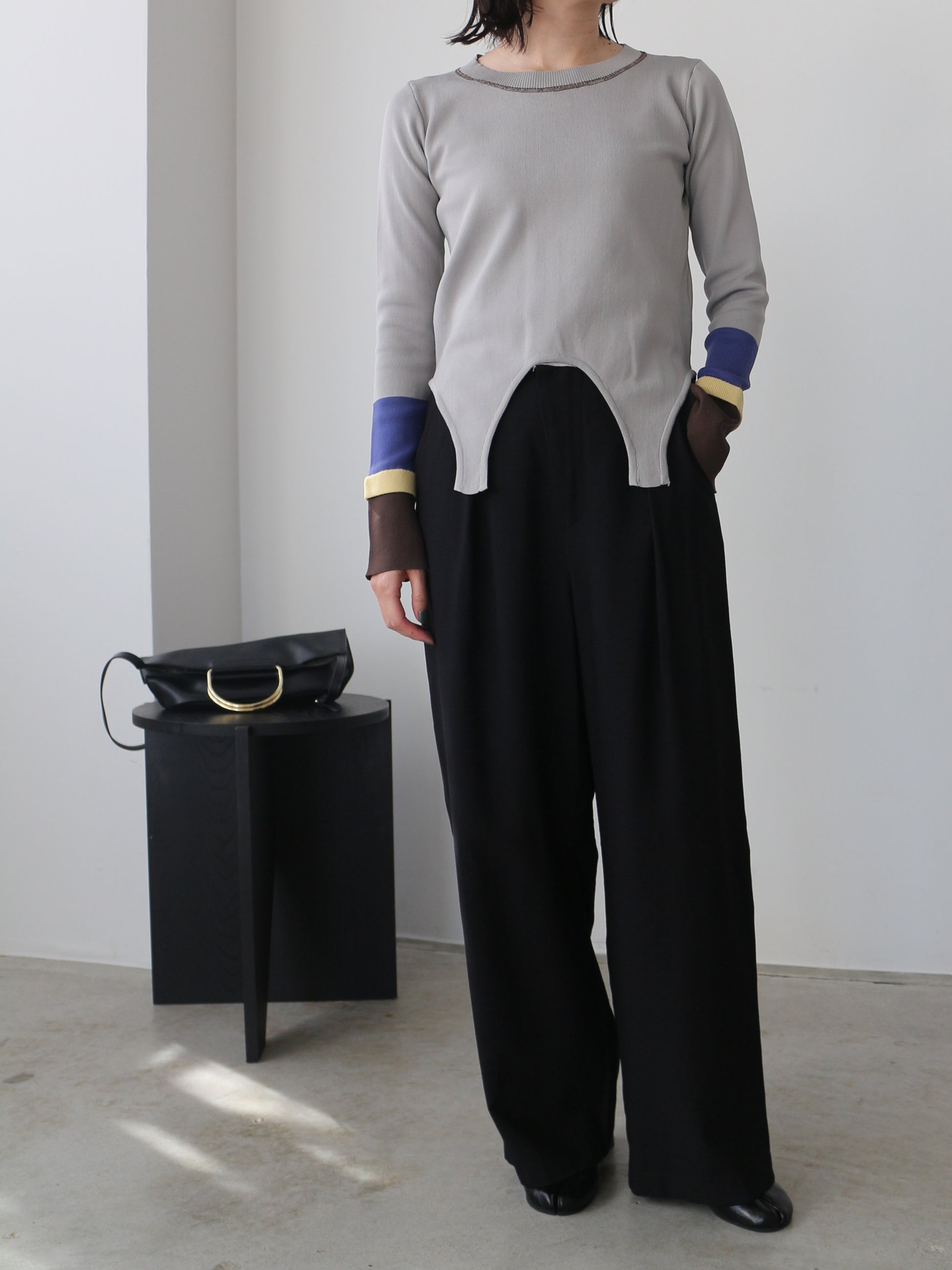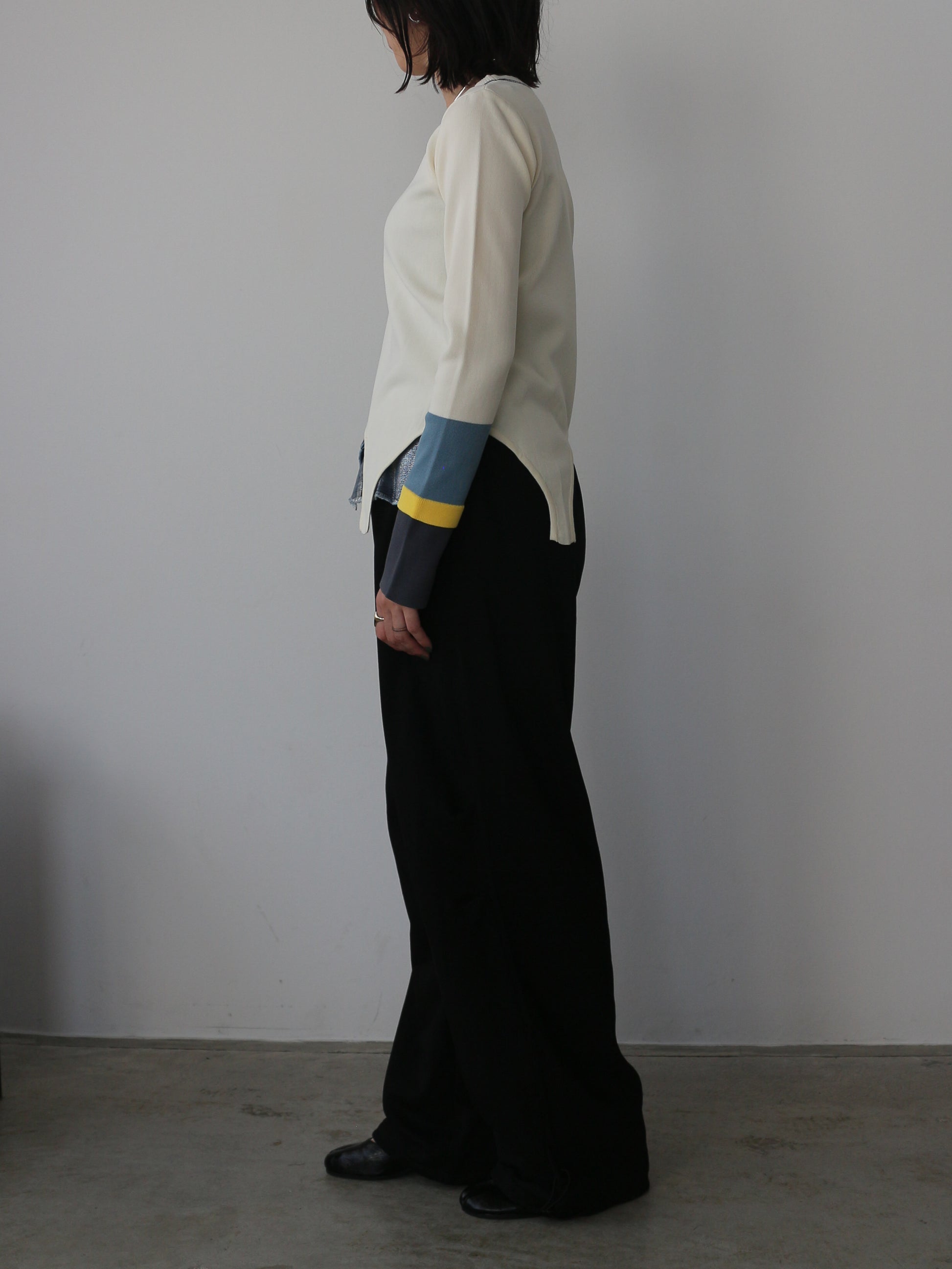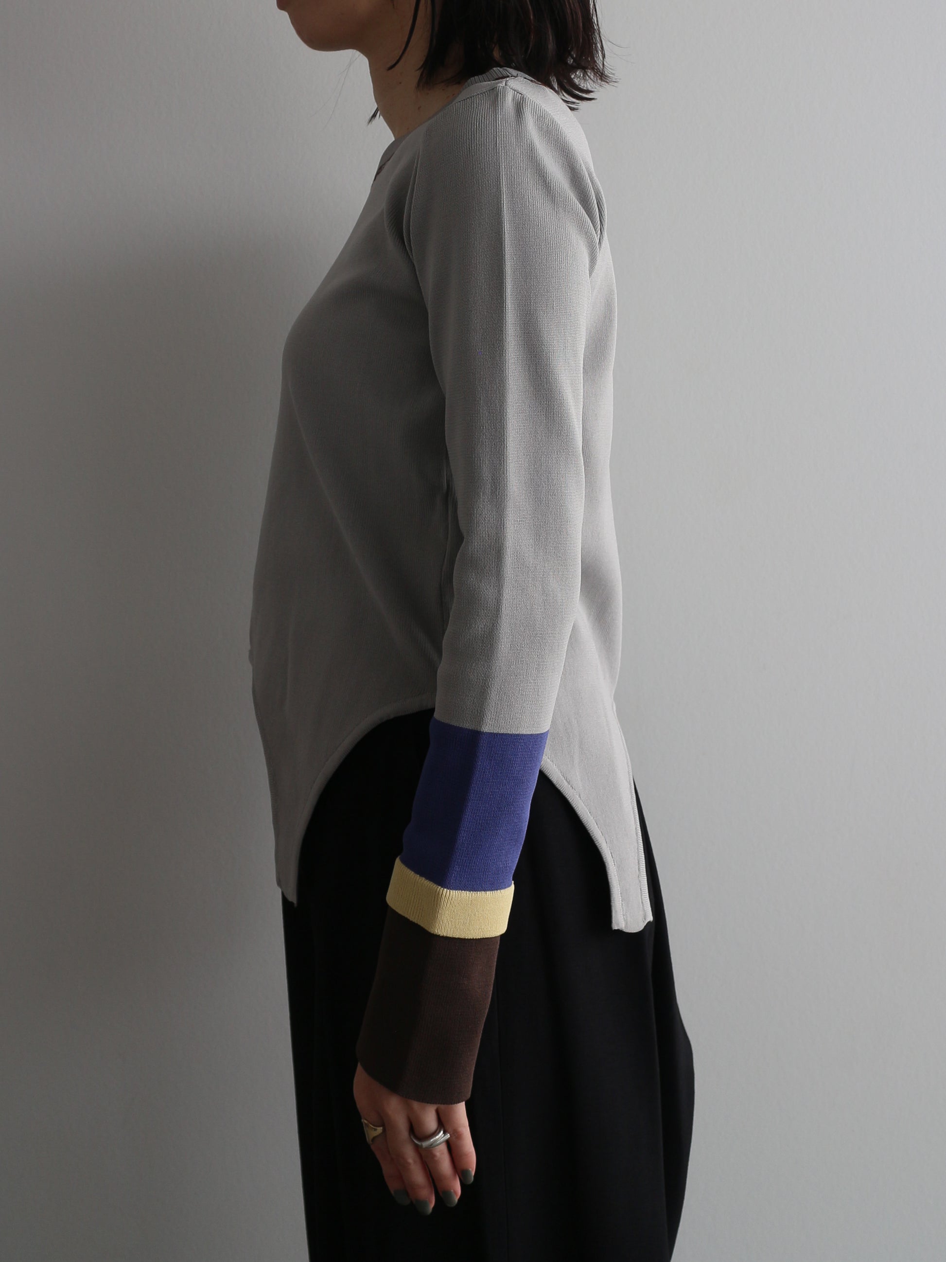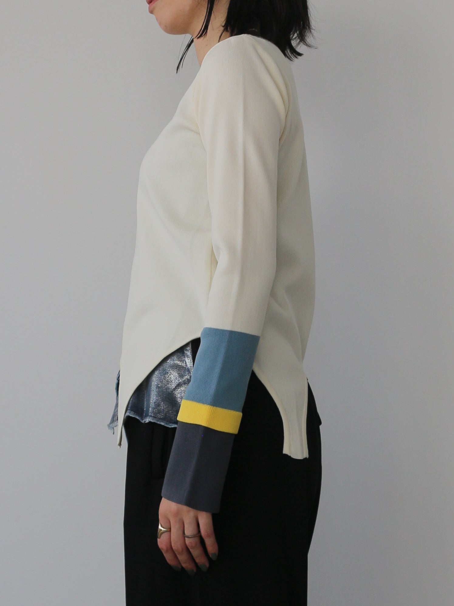 タイトながらも、伸縮性のある柔らかなリブニット素材で造り上げた着心地◎なトップス。程よくもちっとした手触りも魅力です。目を惹く配色スリーブとボディースーツを思わせるラウンドラインの裾で、今季らしいデザインに。カジュアルからキレイ目テイストまで相性抜群!インナーとしても、主役トップスとしてもコーディネートを華やかに彩るおすすめの1枚です。