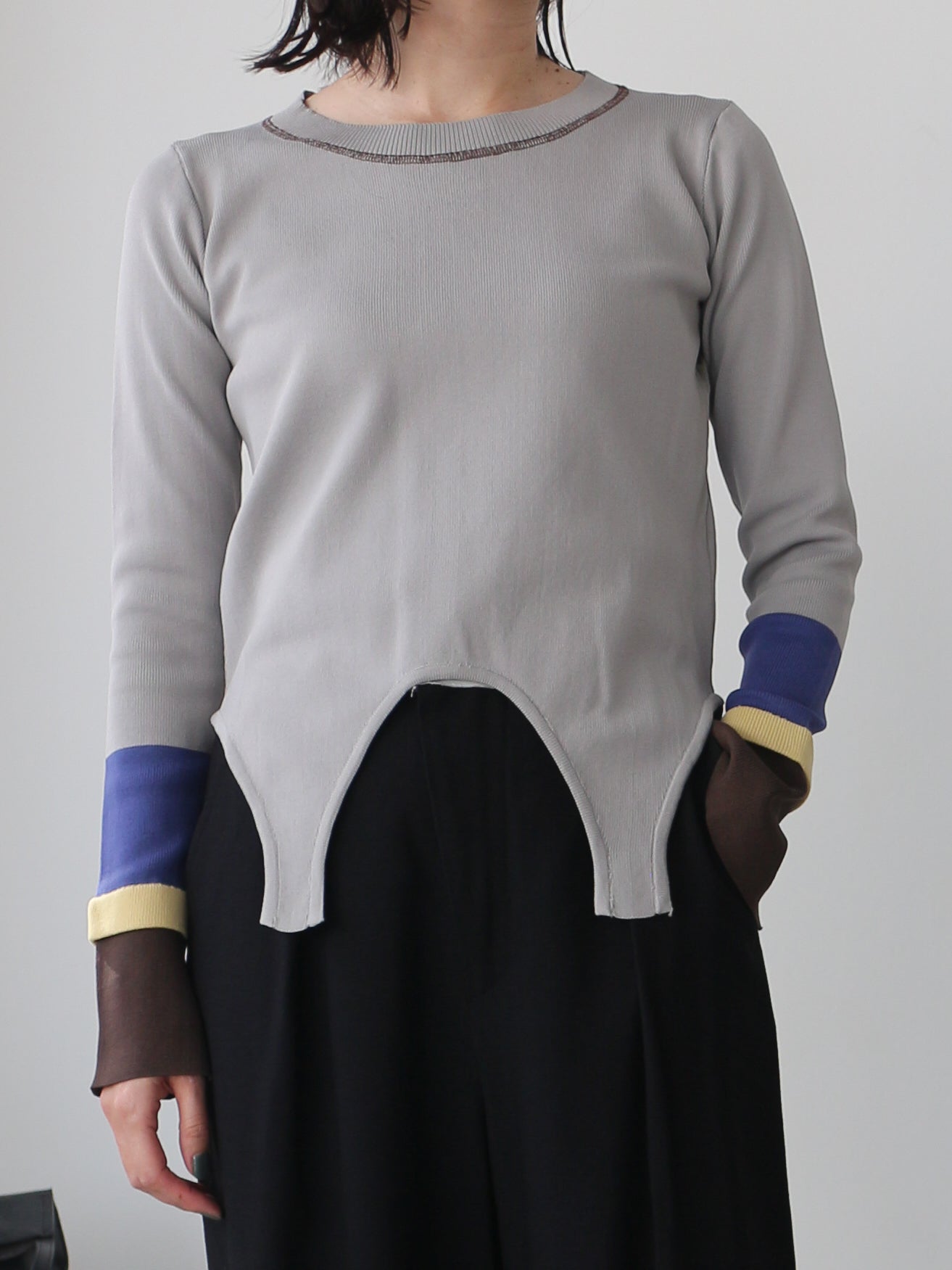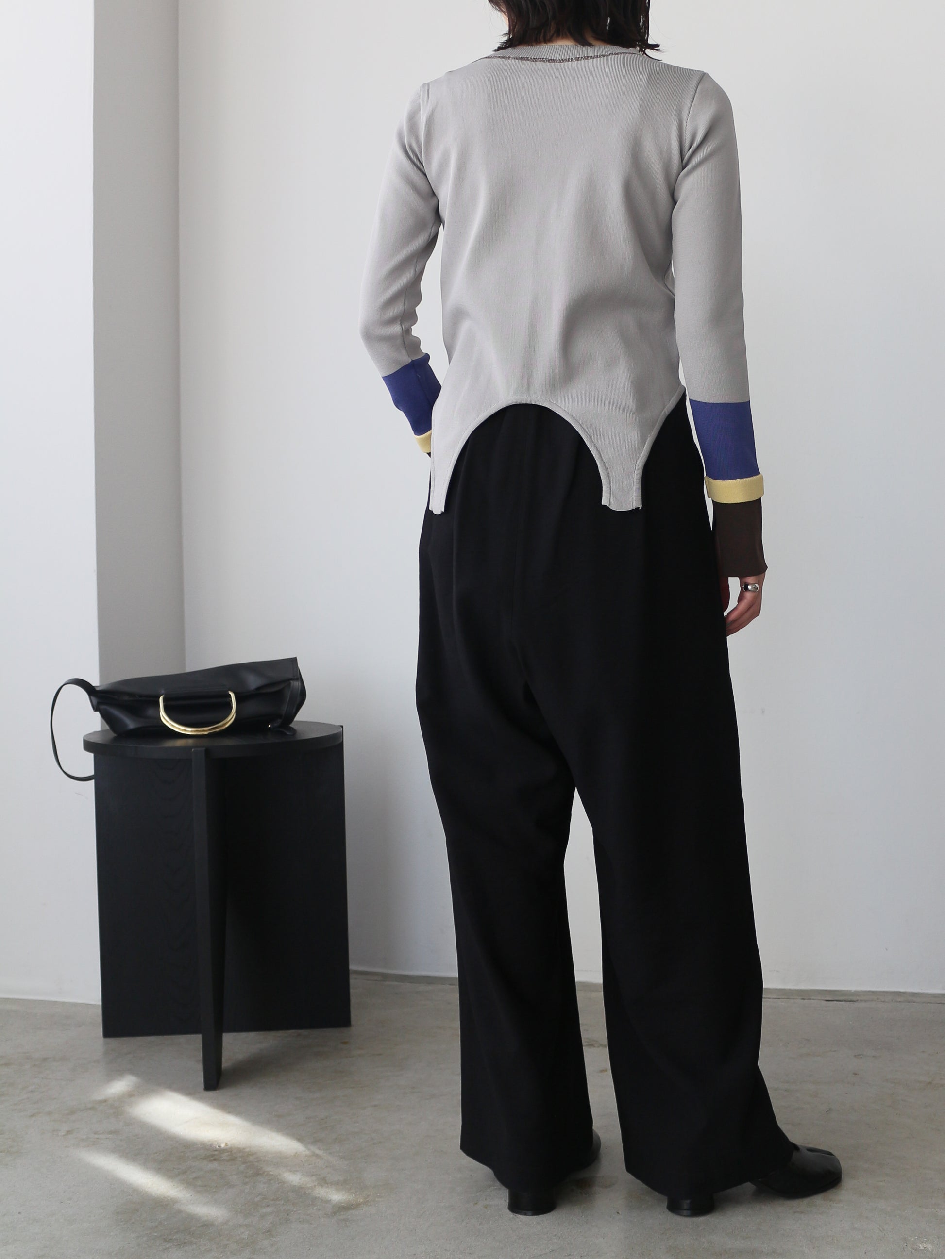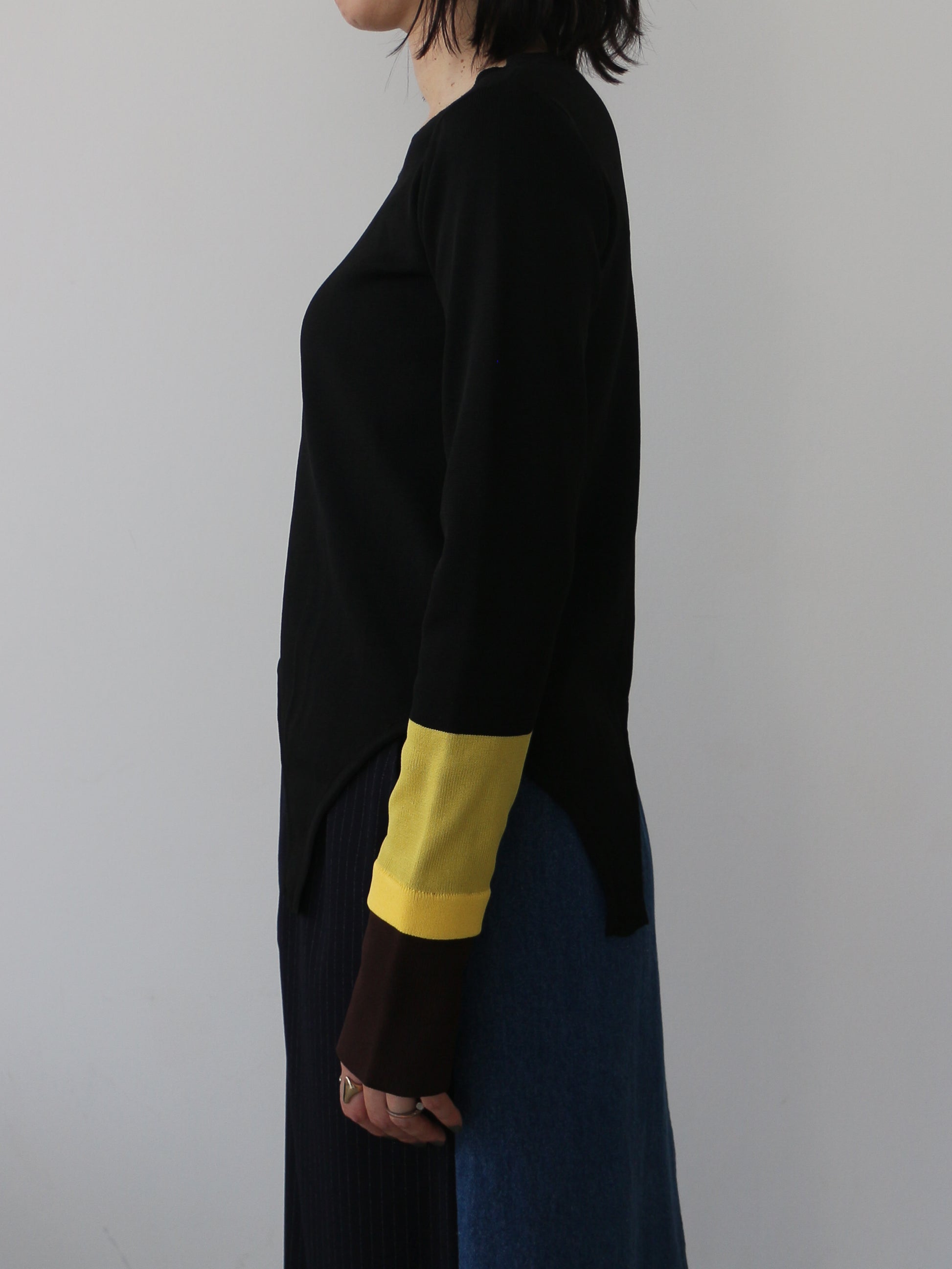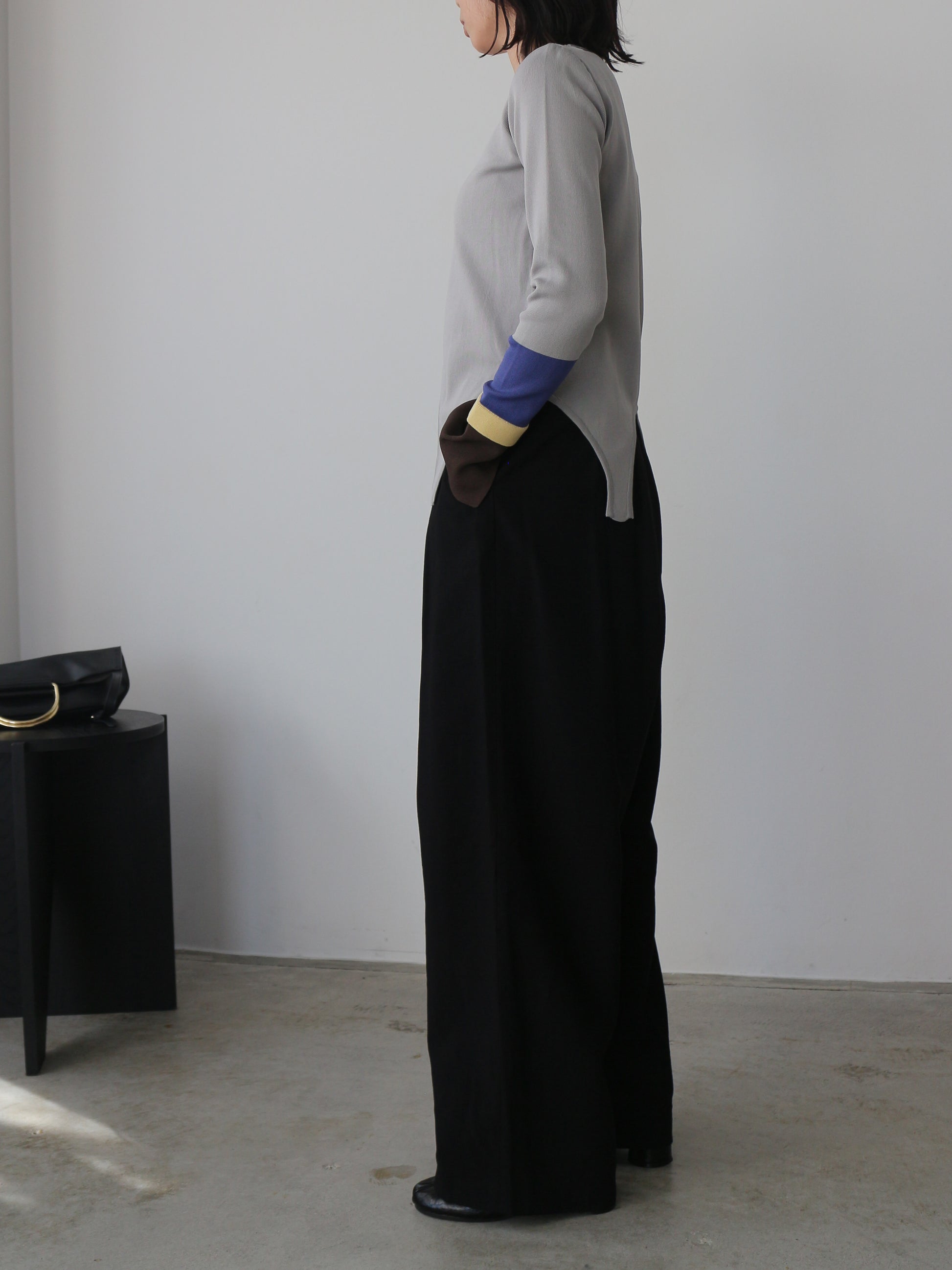 タイトながらも、伸縮性のある柔らかなリブニット素材で造り上げた着心地◎なトップス。程よくもちっとした手触りも魅力です。目を惹く配色スリーブとボディースーツを思わせるラウンドラインの裾で、今季らしいデザインに。カジュアルからキレイ目テイストまで相性抜群!インナーとしても、主役トップスとしてもコーディネートを華やかに彩るおすすめの1枚です。