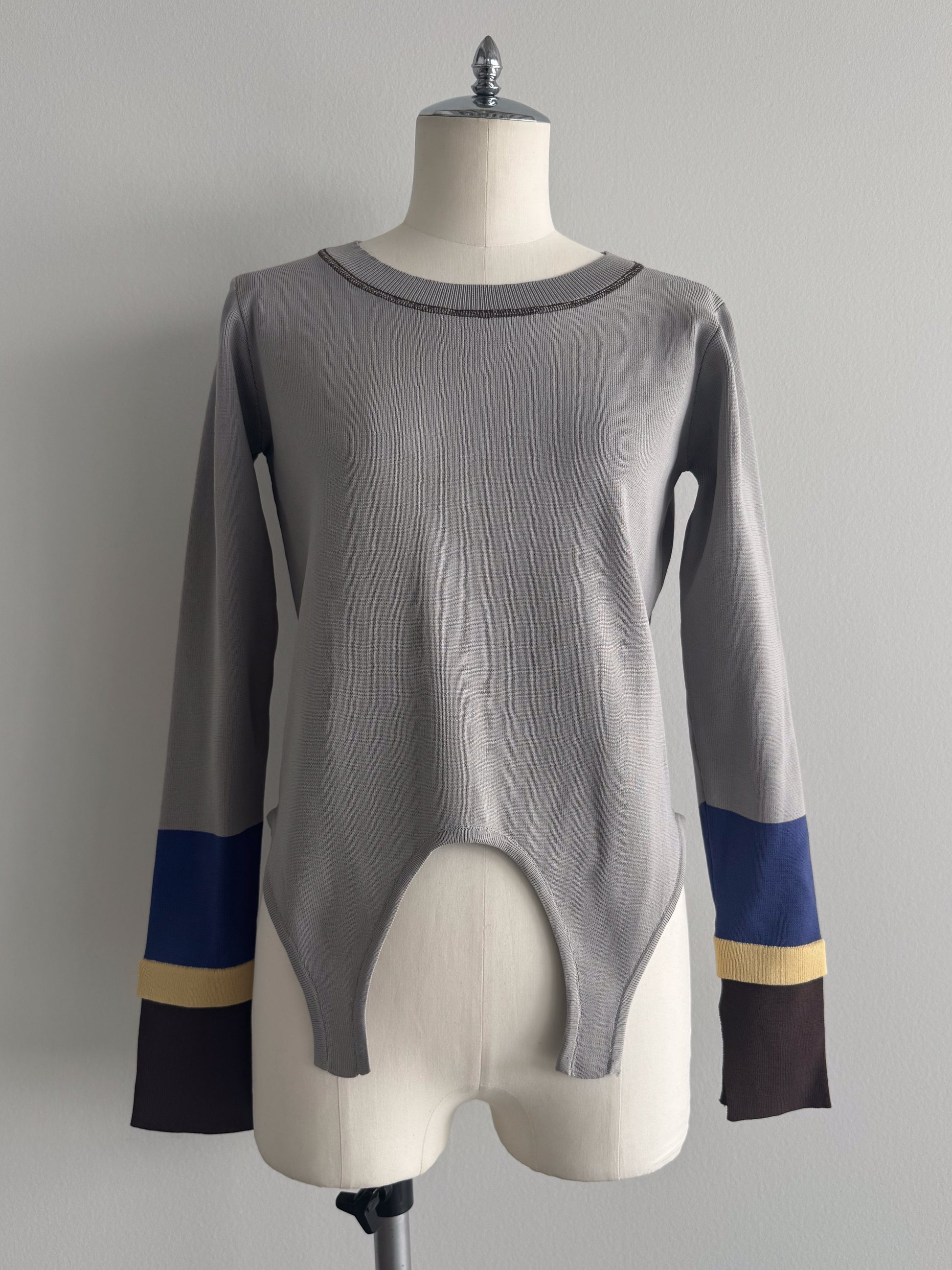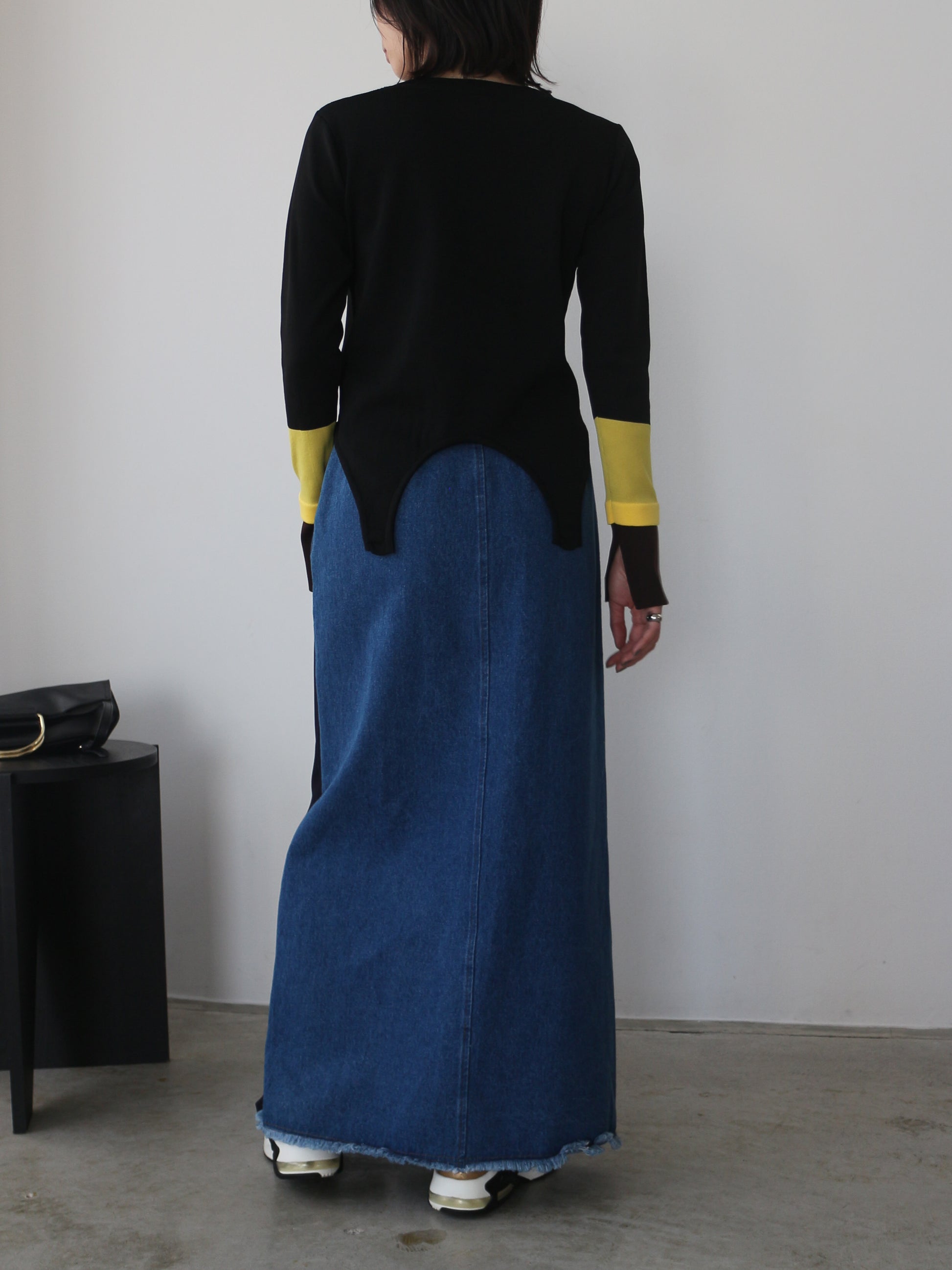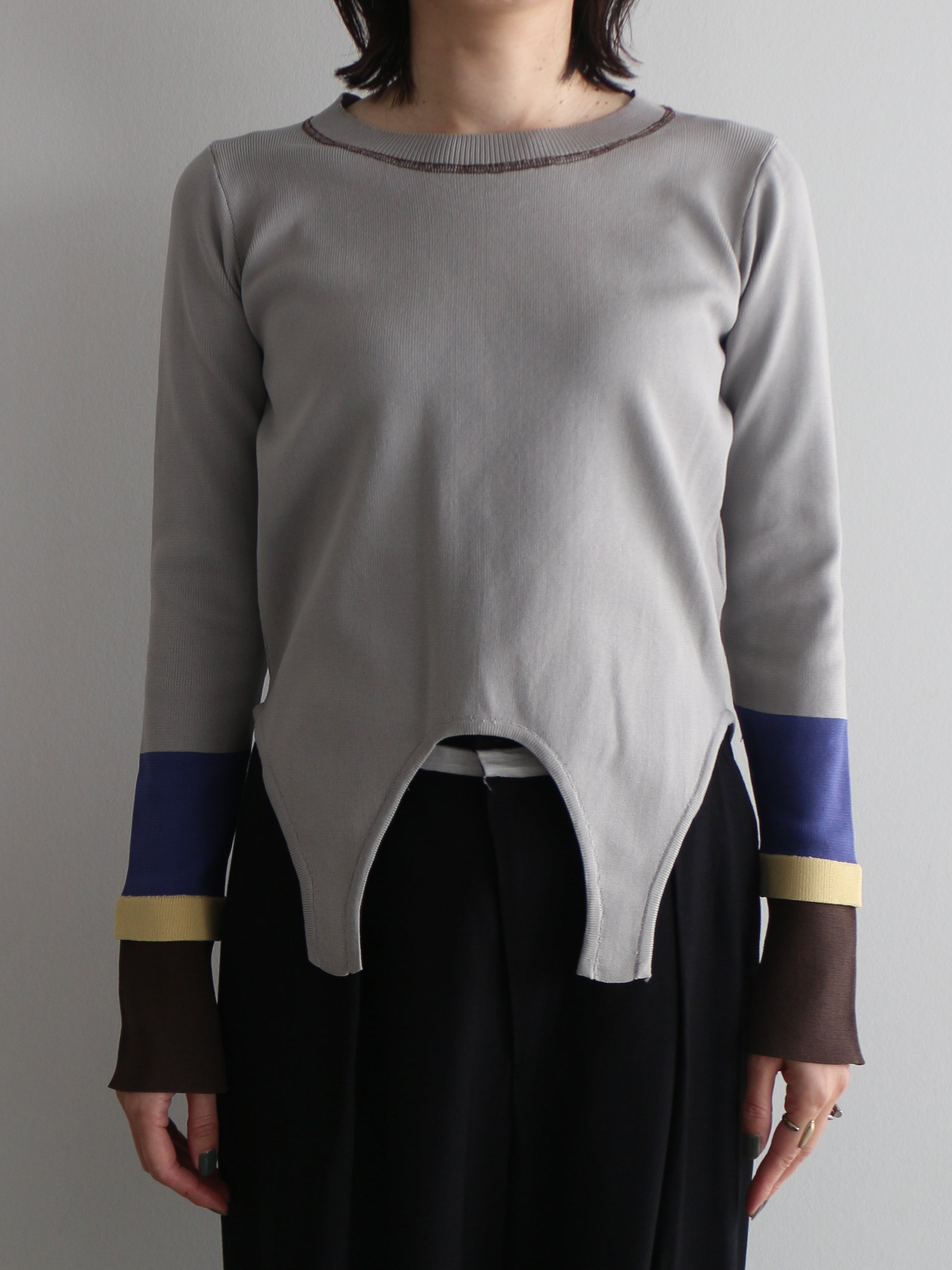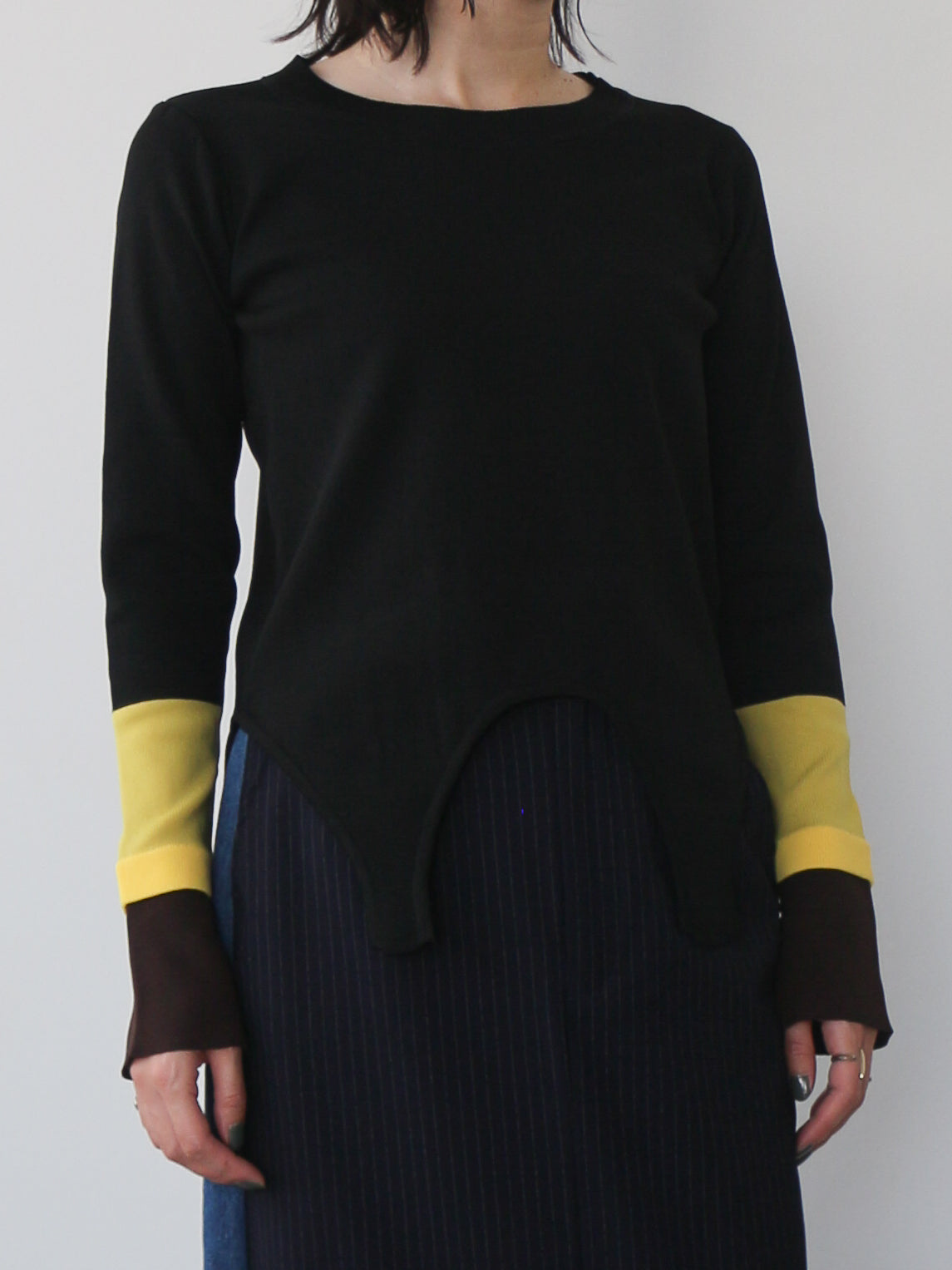 タイトながらも、伸縮性のある柔らかなリブニット素材で造り上げた着心地◎なトップス。程よくもちっとした手触りも魅力です。目を惹く配色スリーブとボディースーツを思わせるラウンドラインの裾で、今季らしいデザインに。カジュアルからキレイ目テイストまで相性抜群!インナーとしても、主役トップスとしてもコーディネートを華やかに彩るおすすめの1枚です。