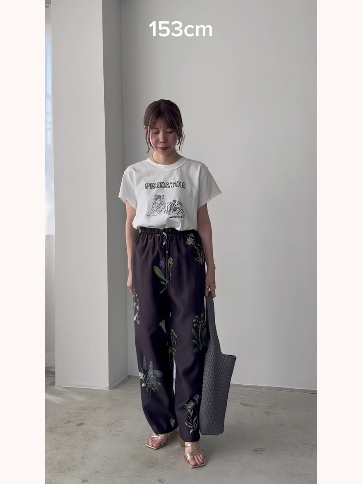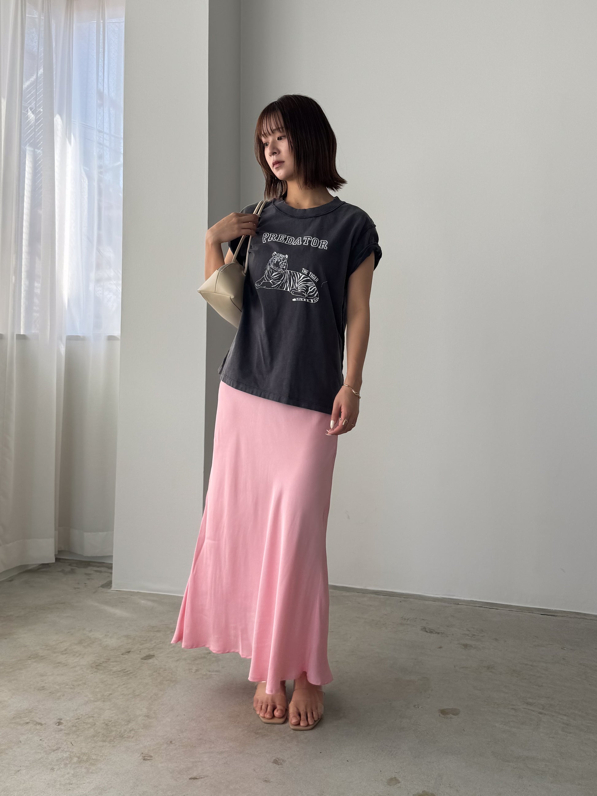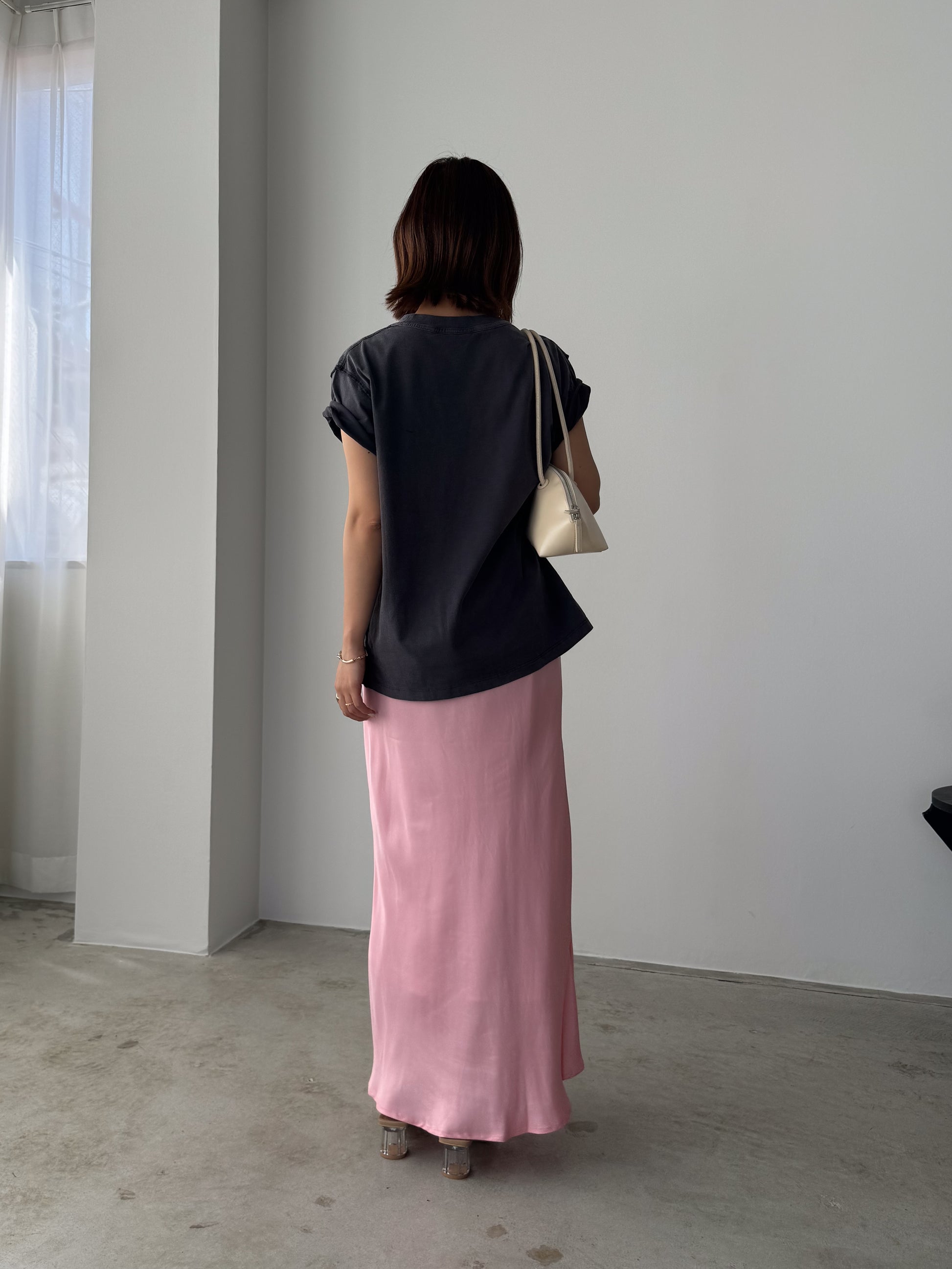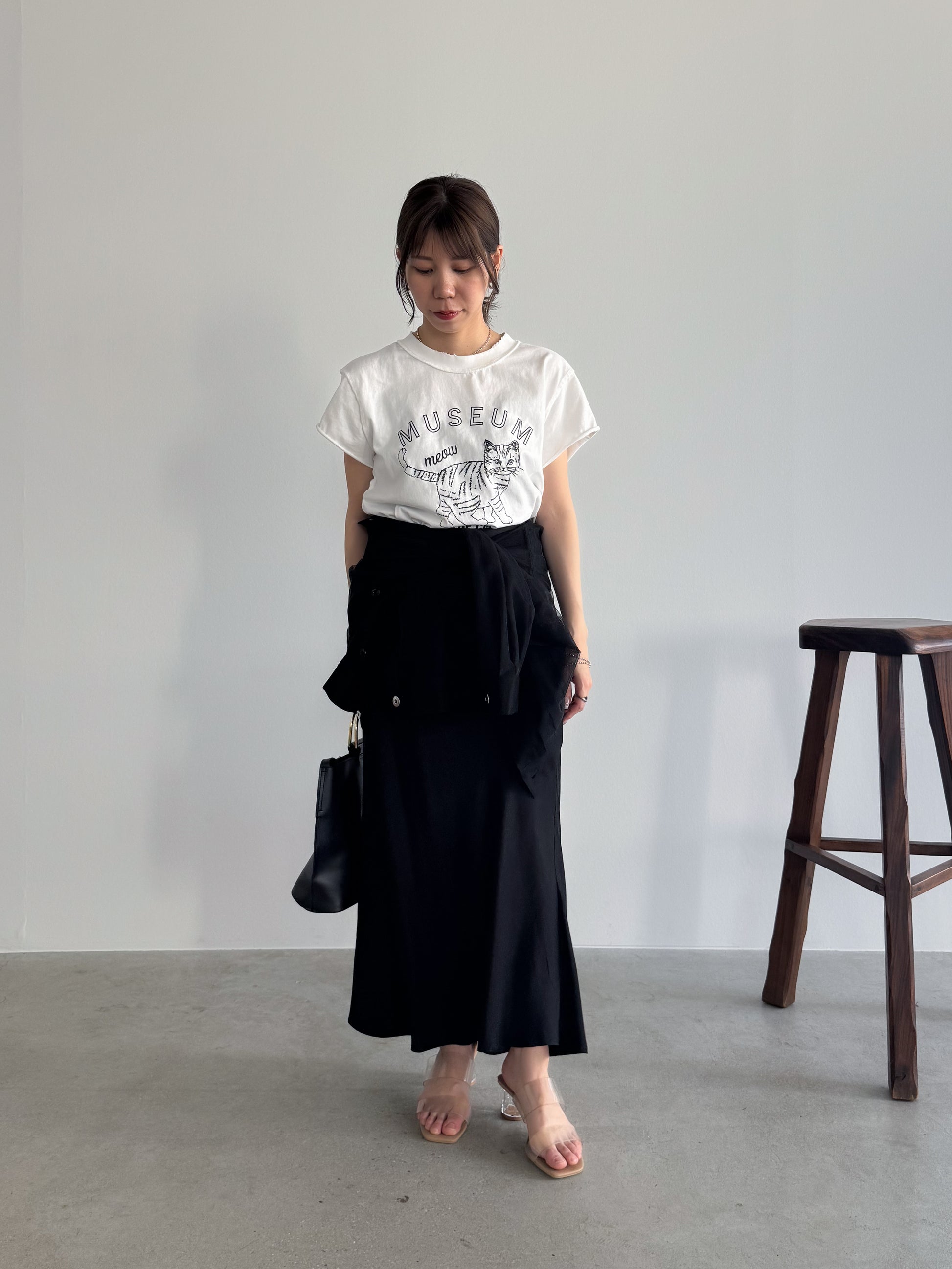 カジュアルな印象なので、ボトムは光沢感のある素材を持ってくると、女性らしく着こなせます◎