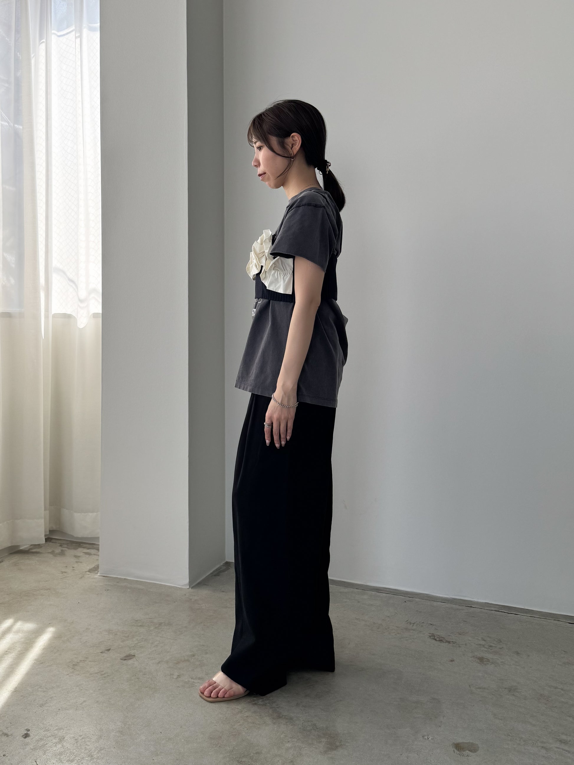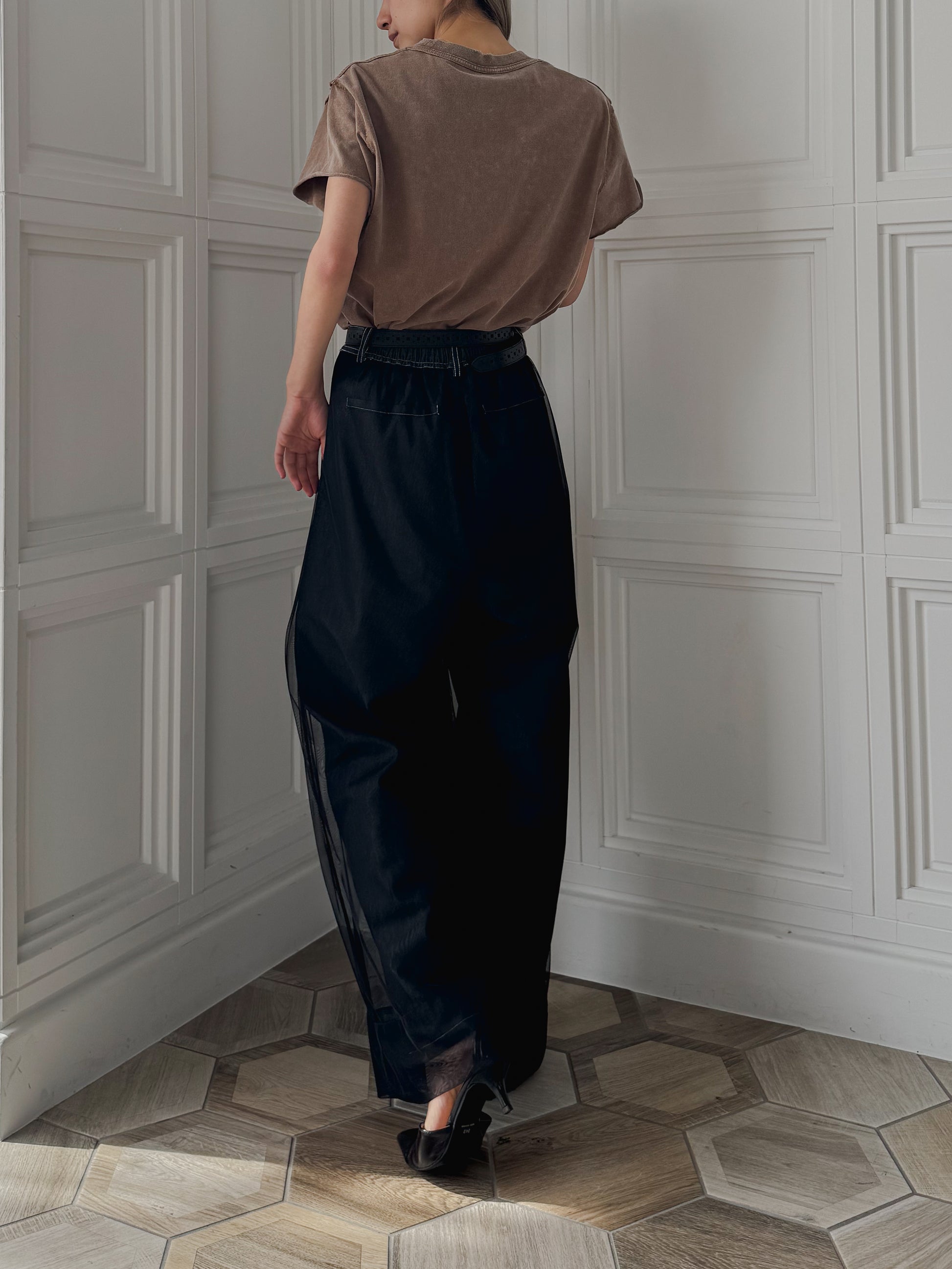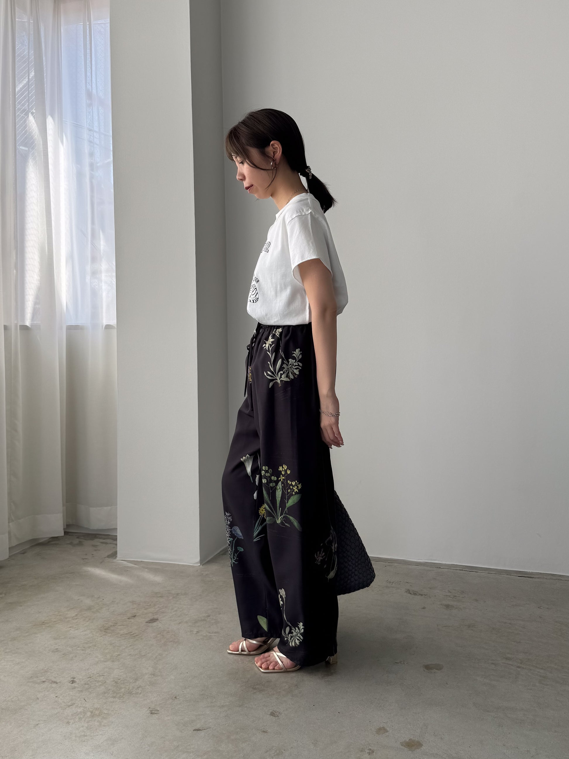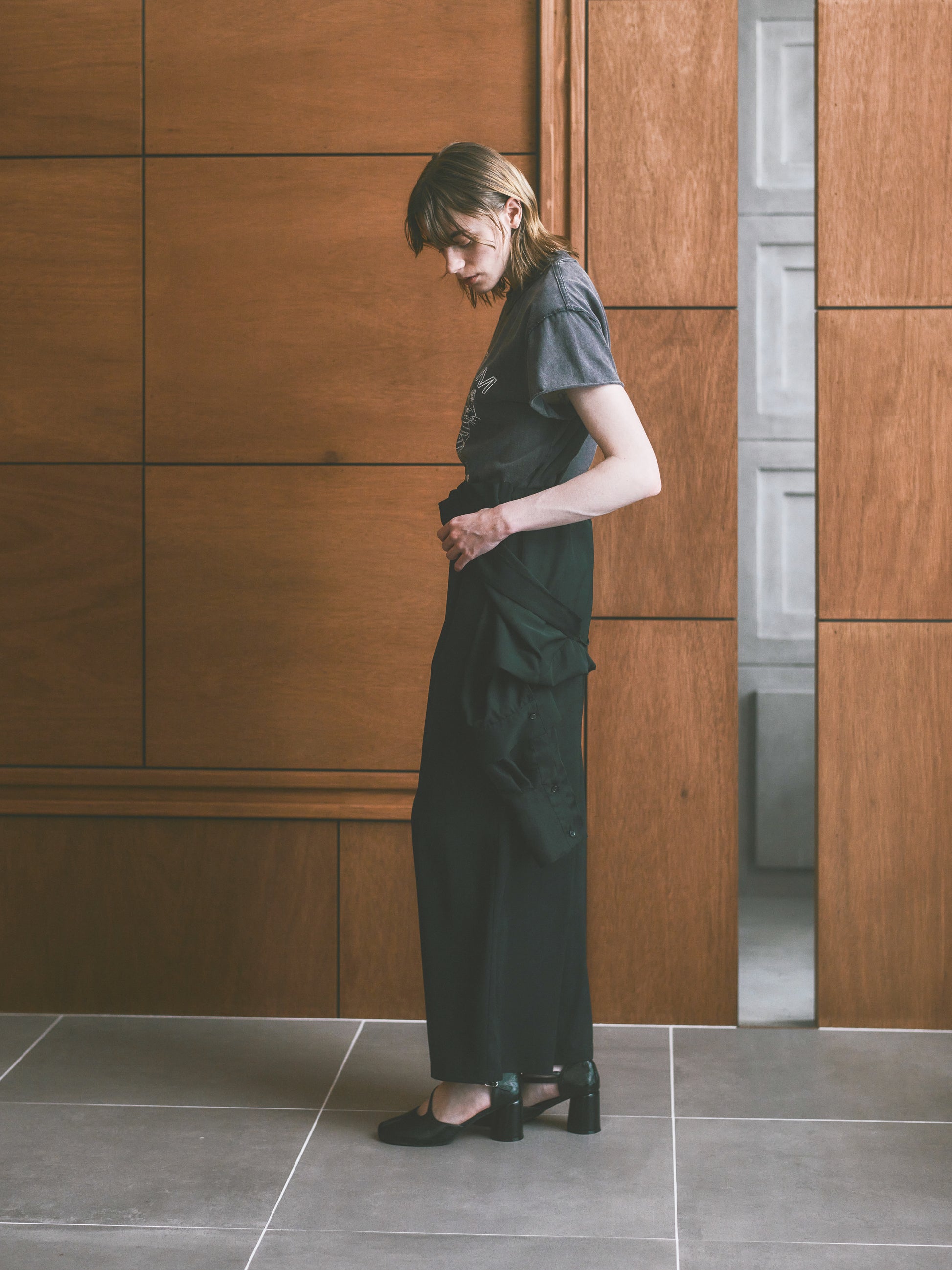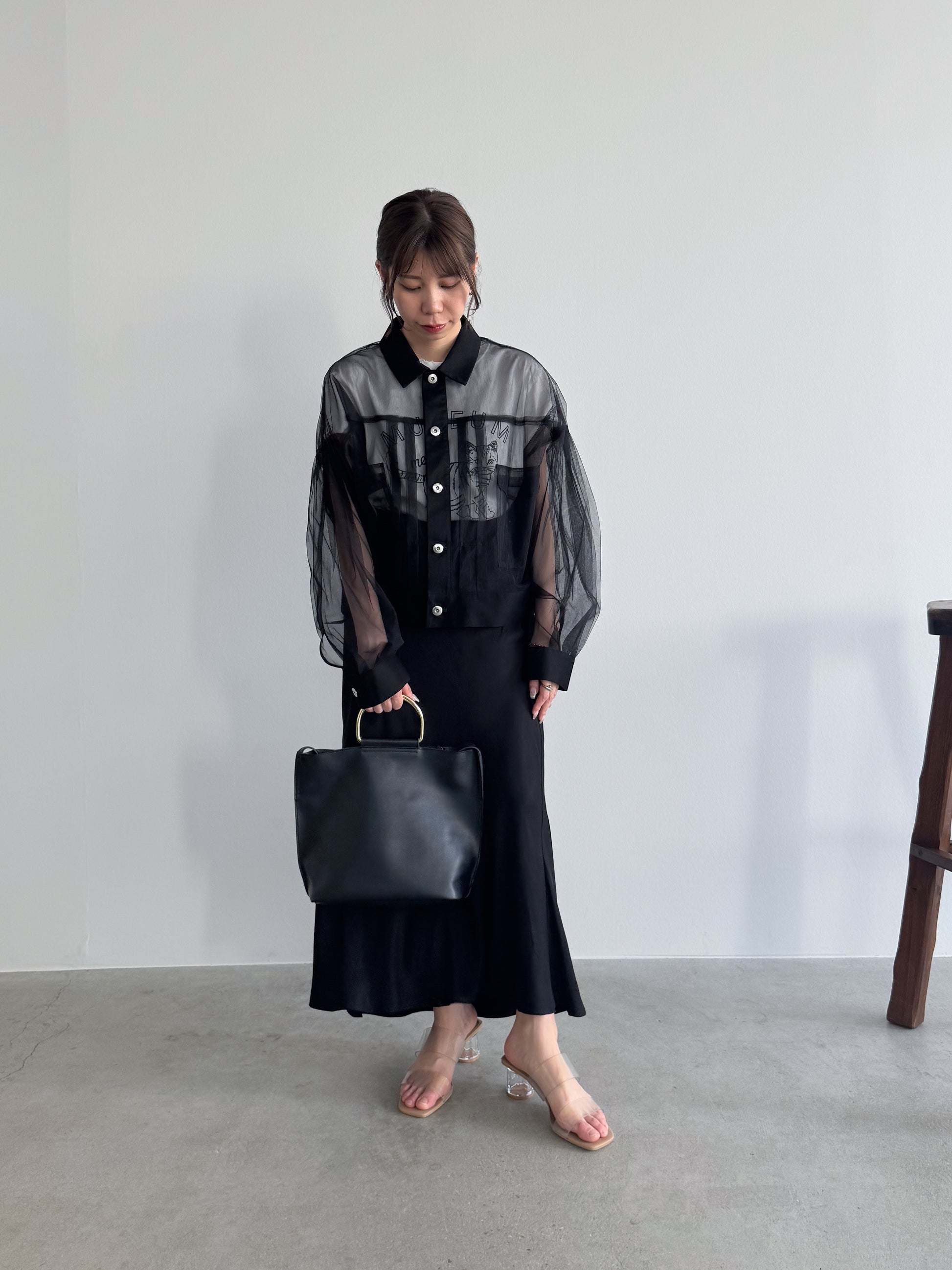 カジュアルな印象なので、ボトムは光沢感のある素材を持ってくると、女性らしく着こなせます◎