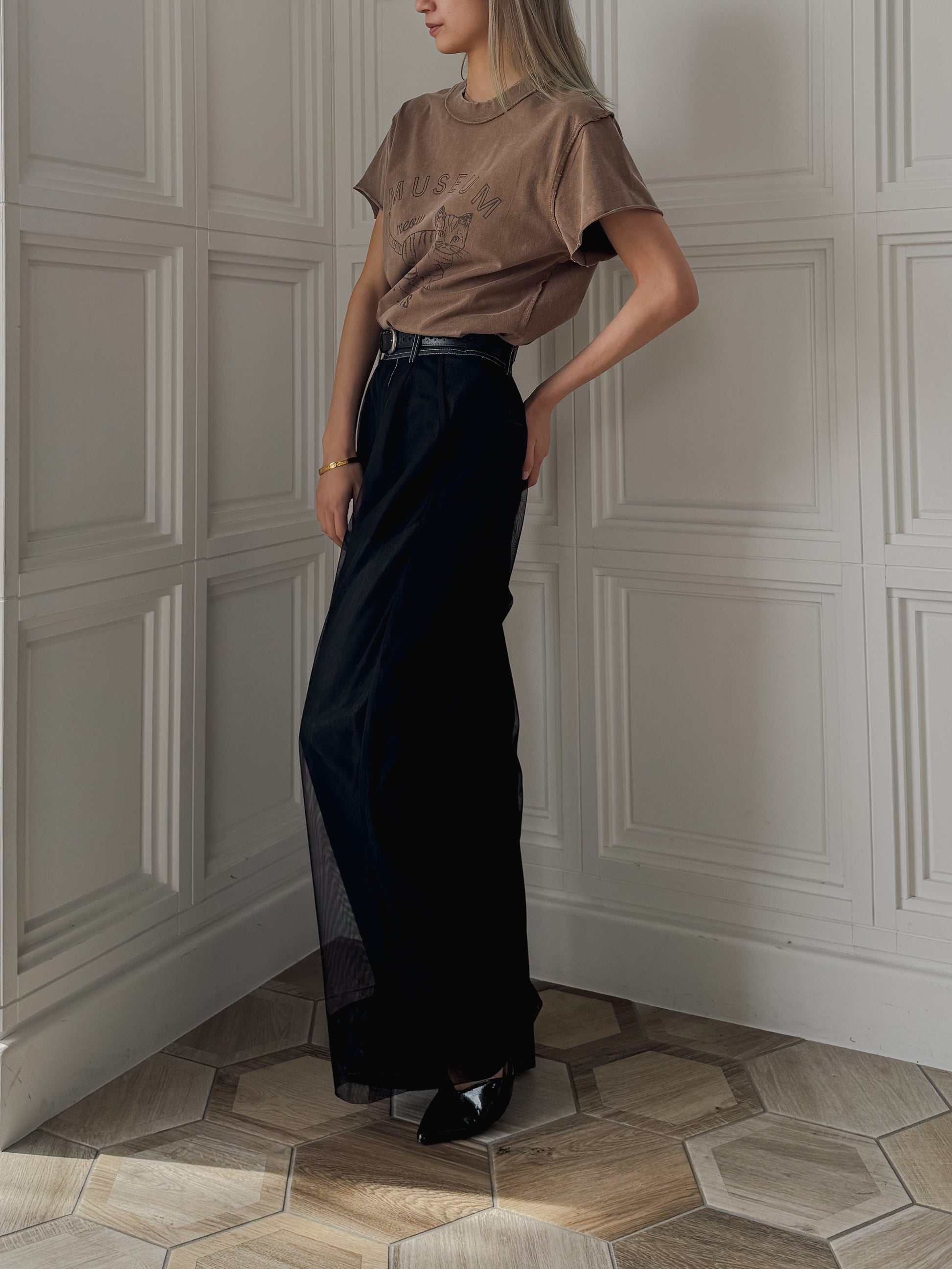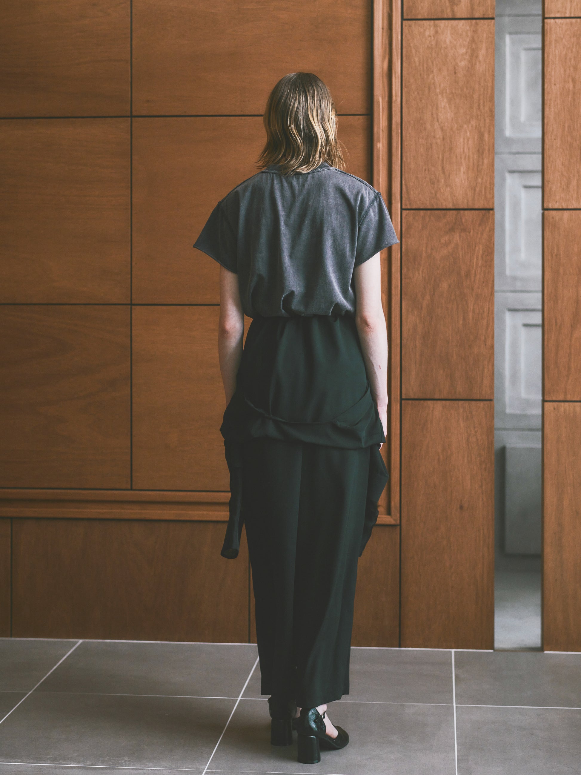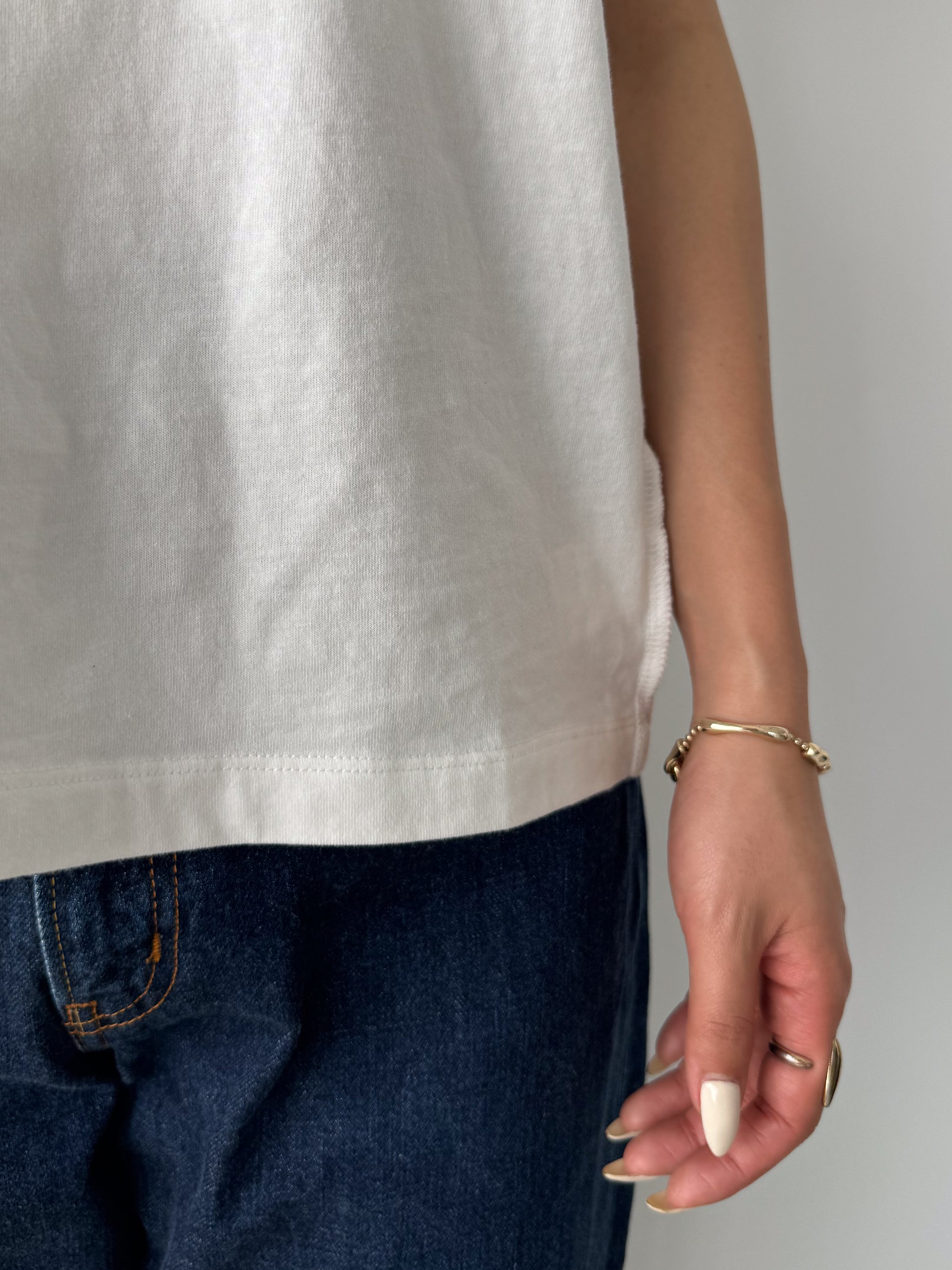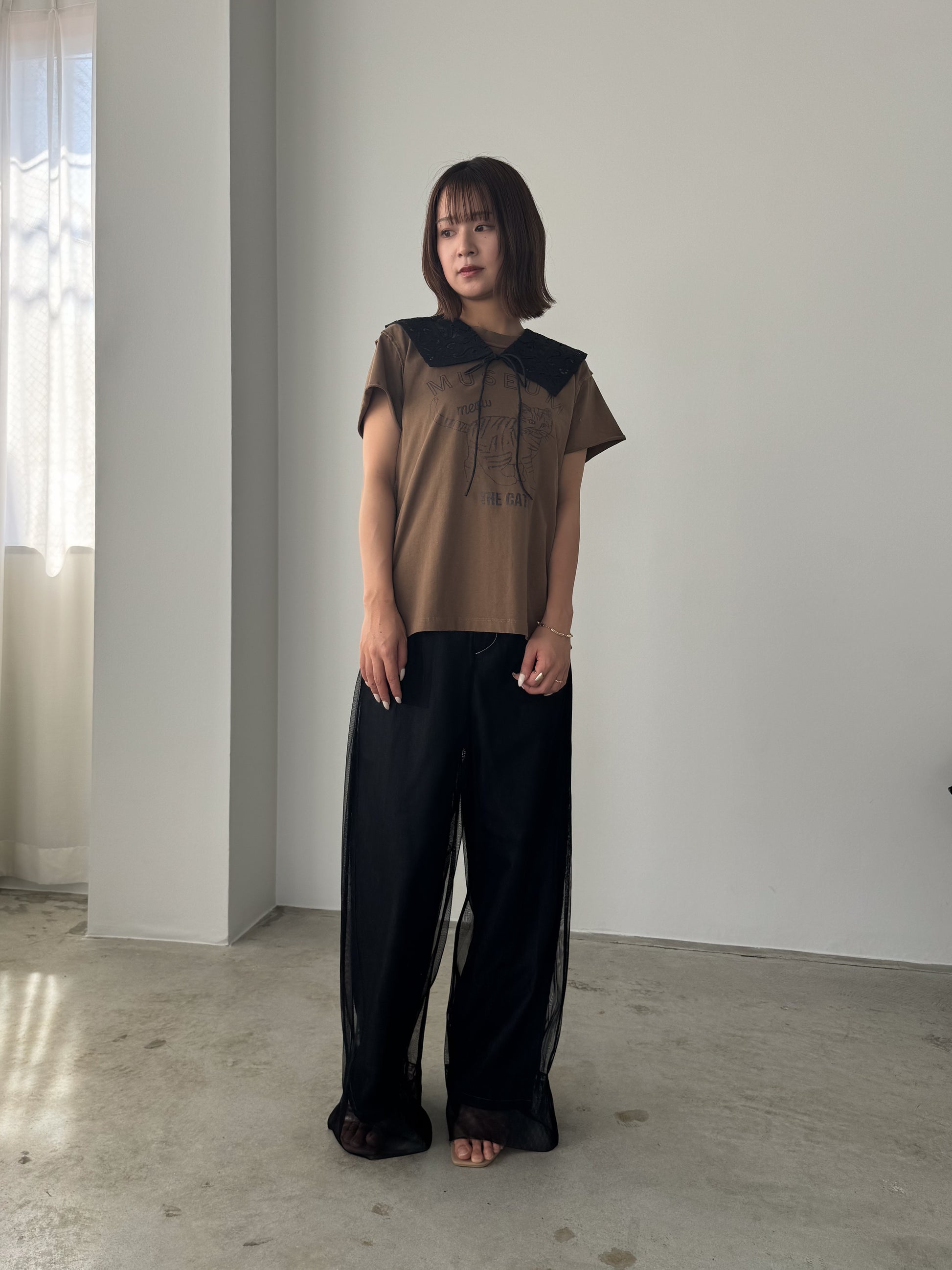 カジュアルな印象なので、ボトムは光沢感のある素材を持ってくると、女性らしく着こなせます◎
