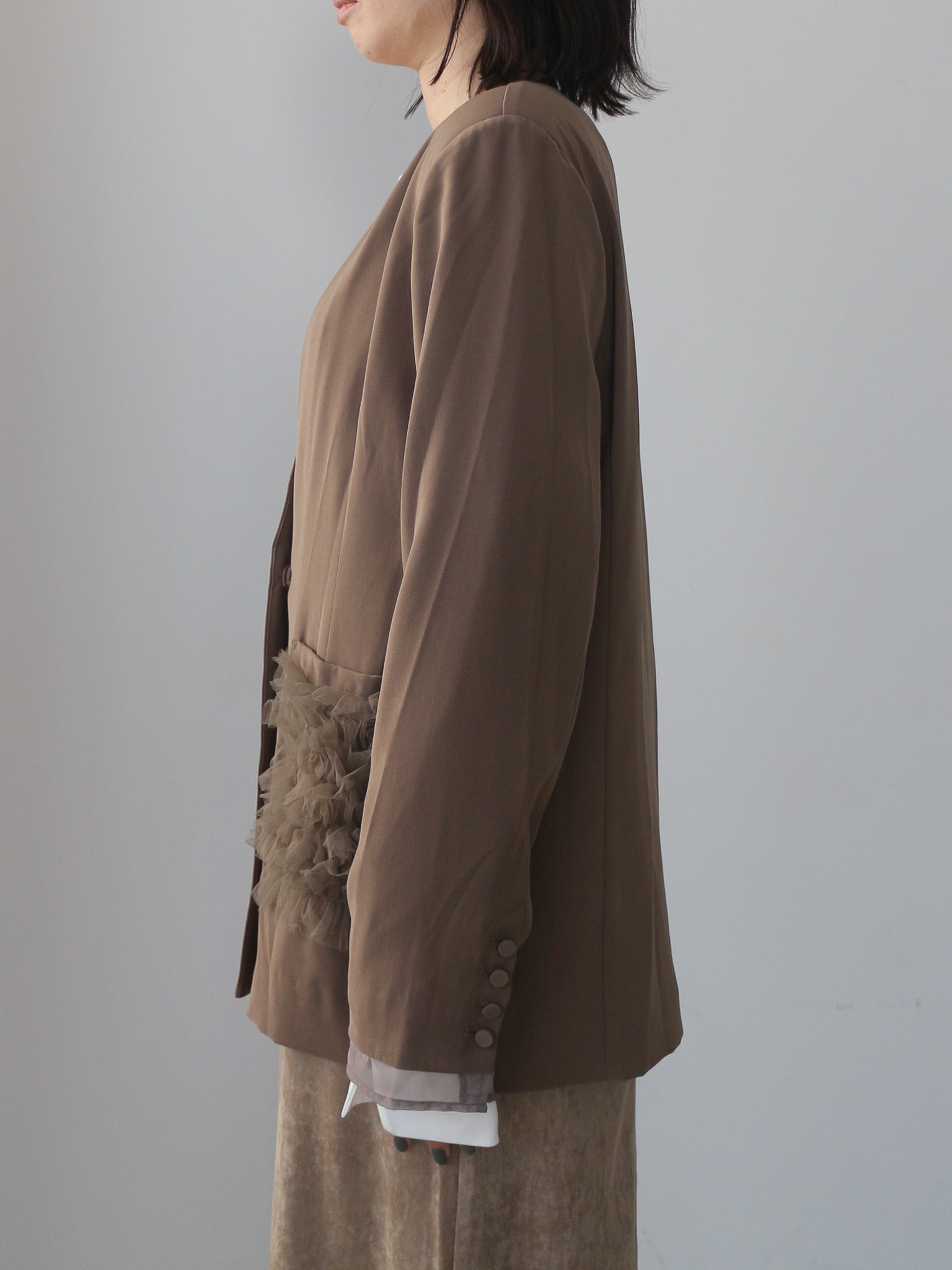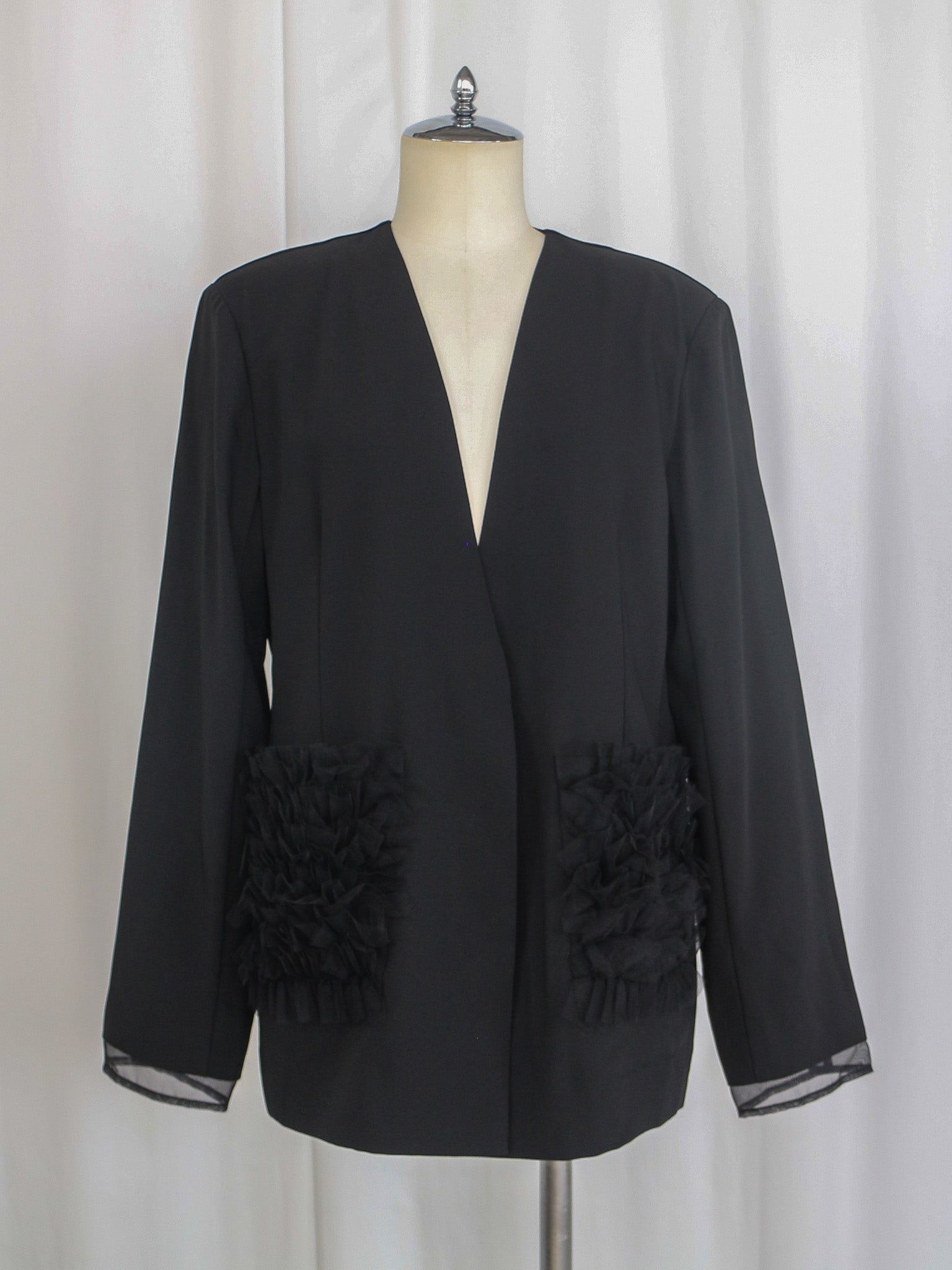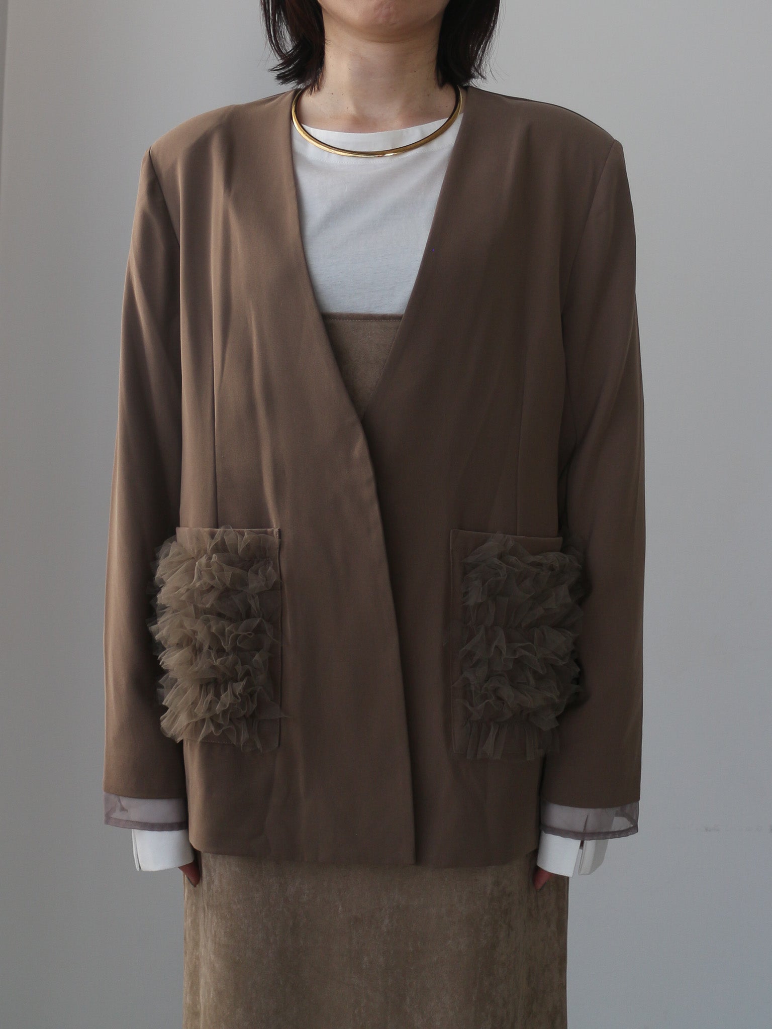 ポケットのラッフルフリルが華やかな印象を与え、袖口のシアー素材が抜け感をプラス。
