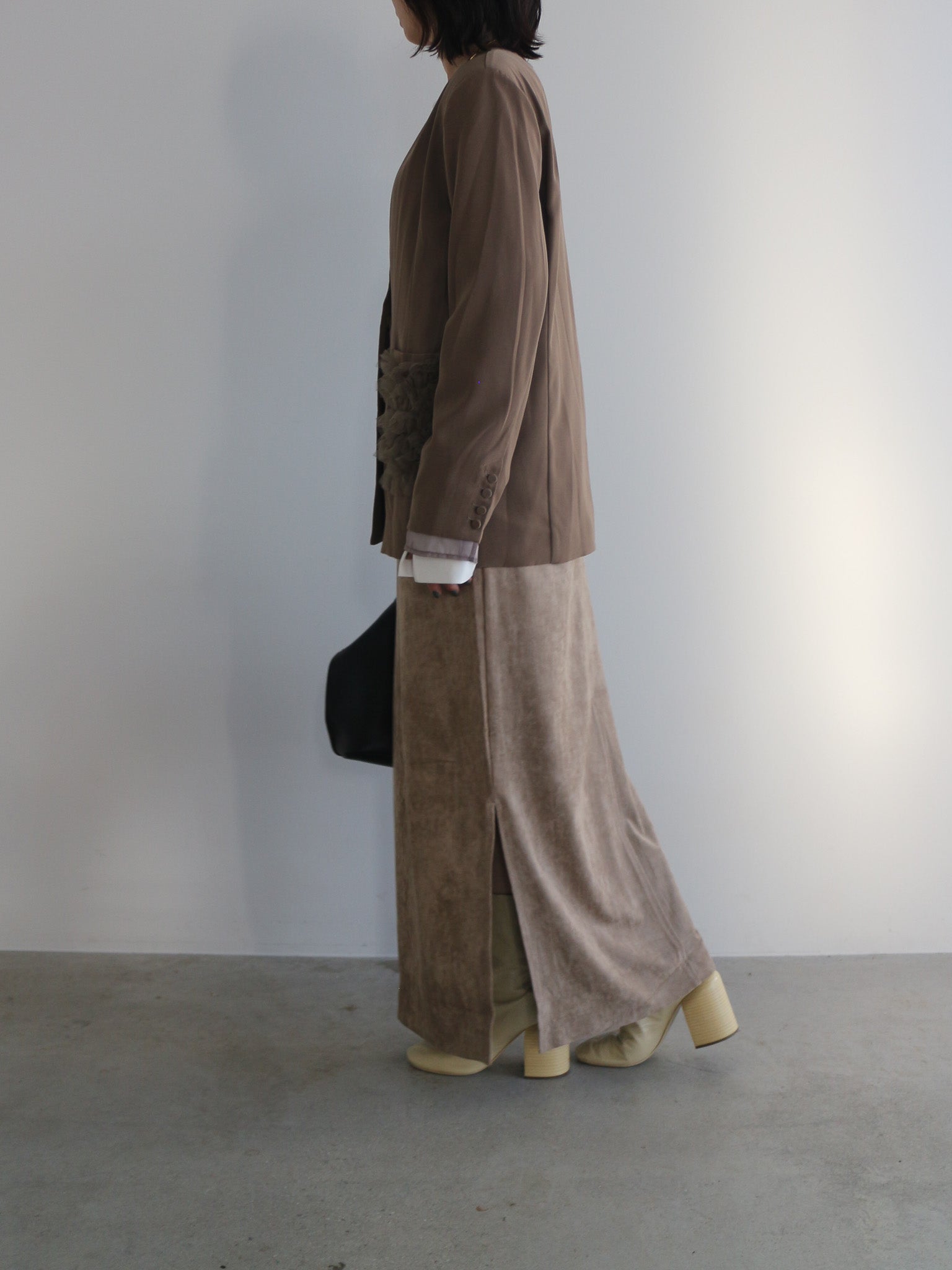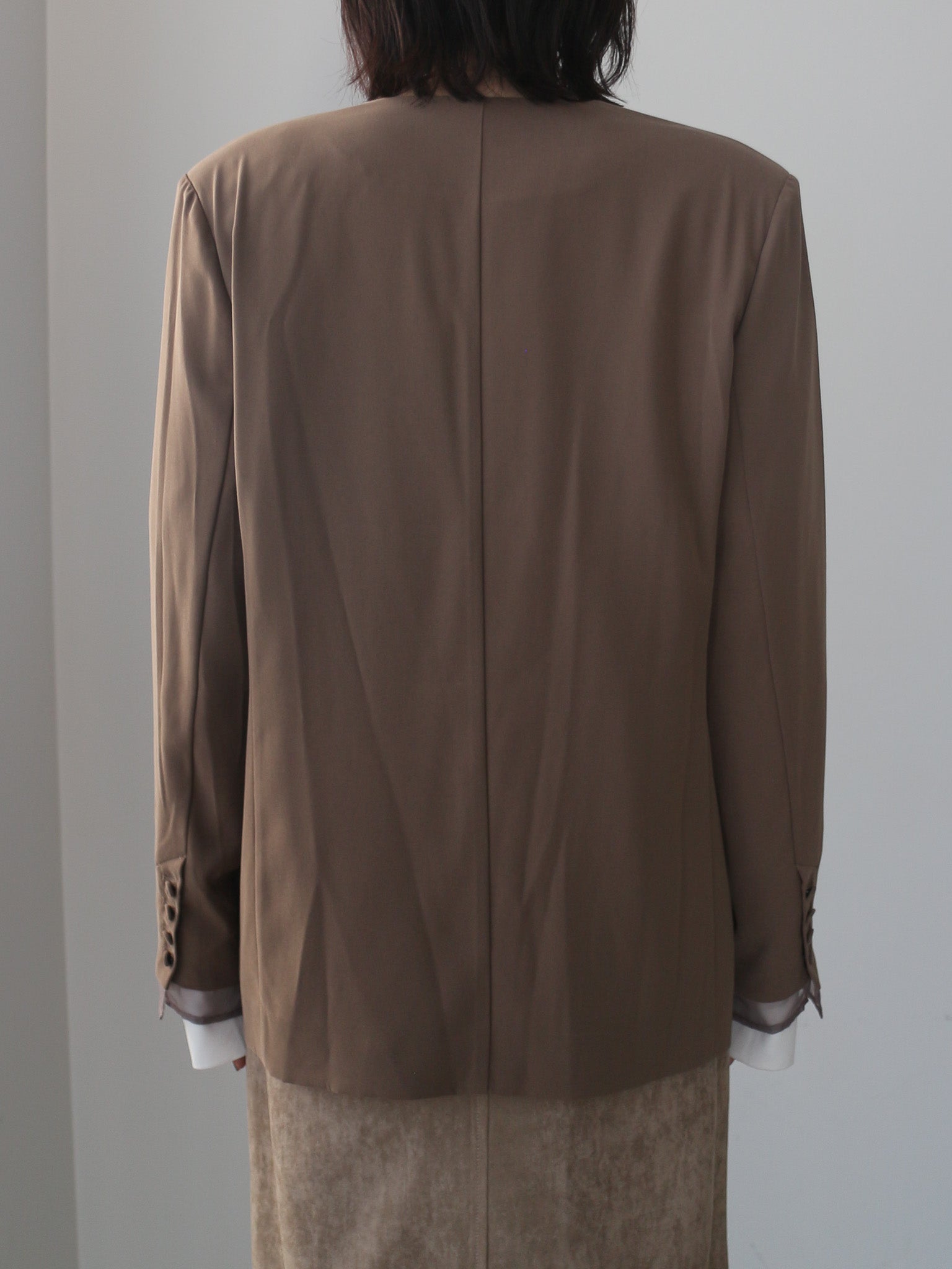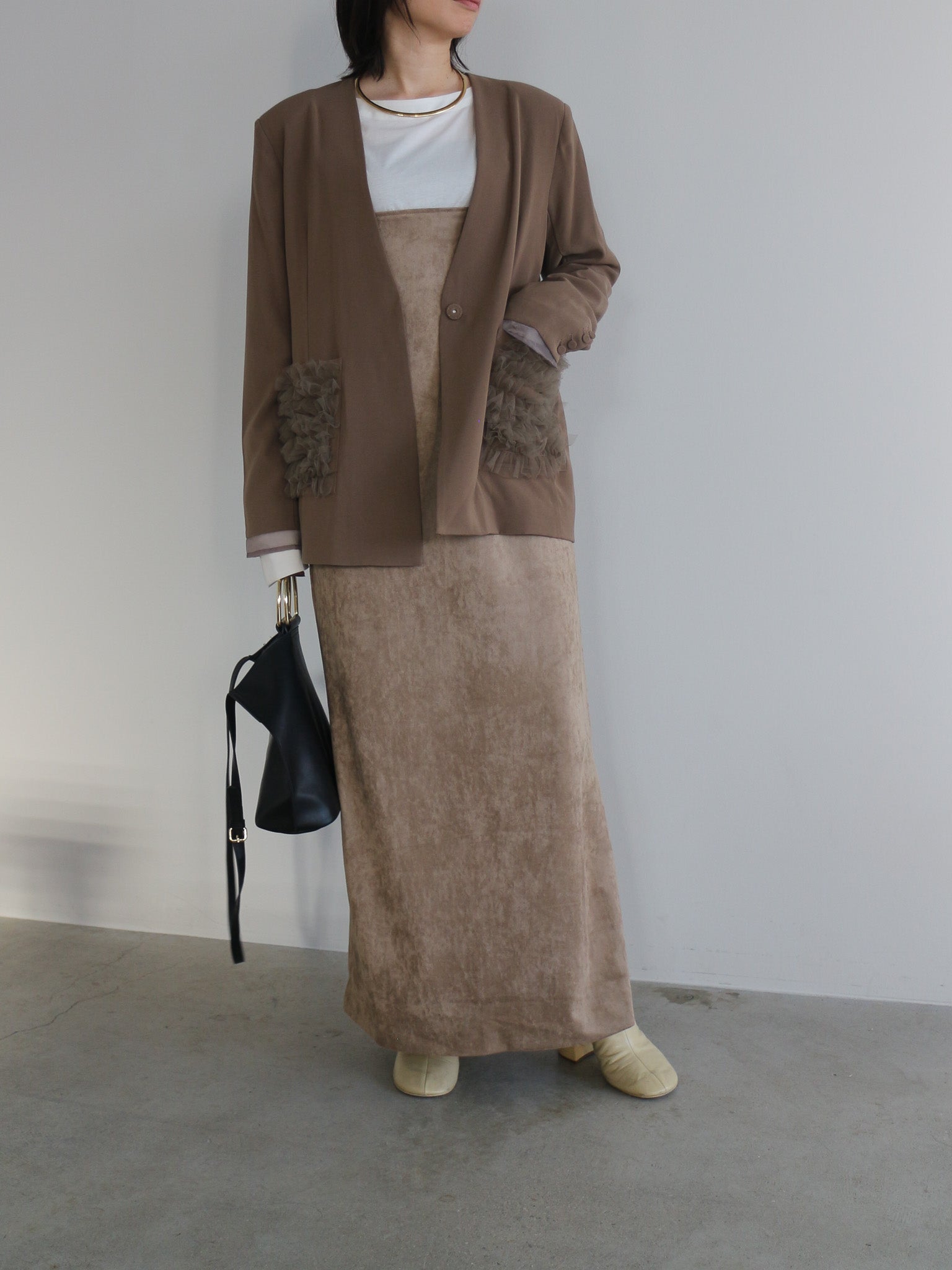 ポケットのラッフルフリルが華やかな印象を与え、袖口のシアー素材が抜け感をプラス。