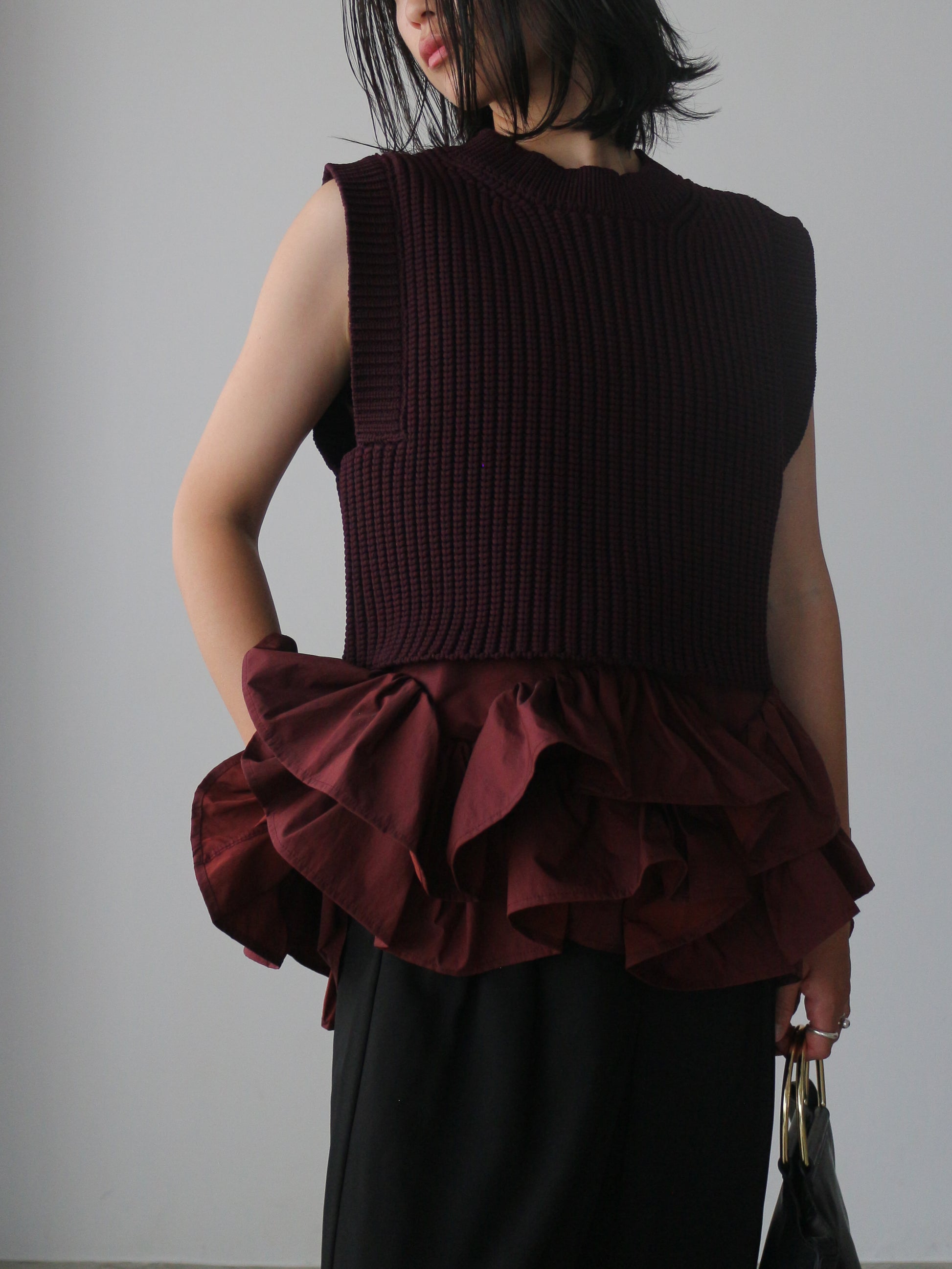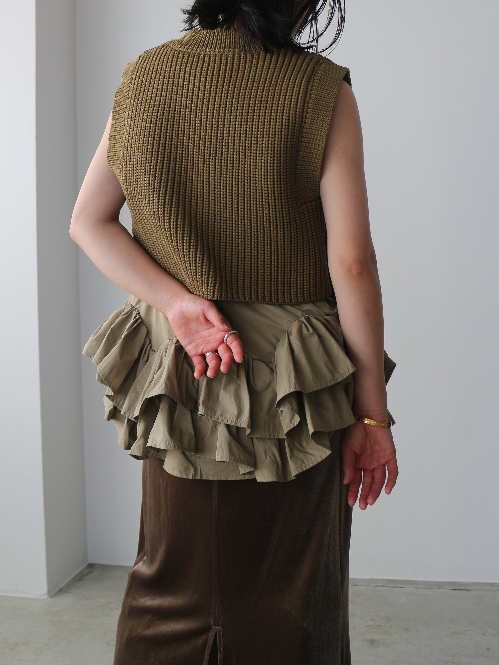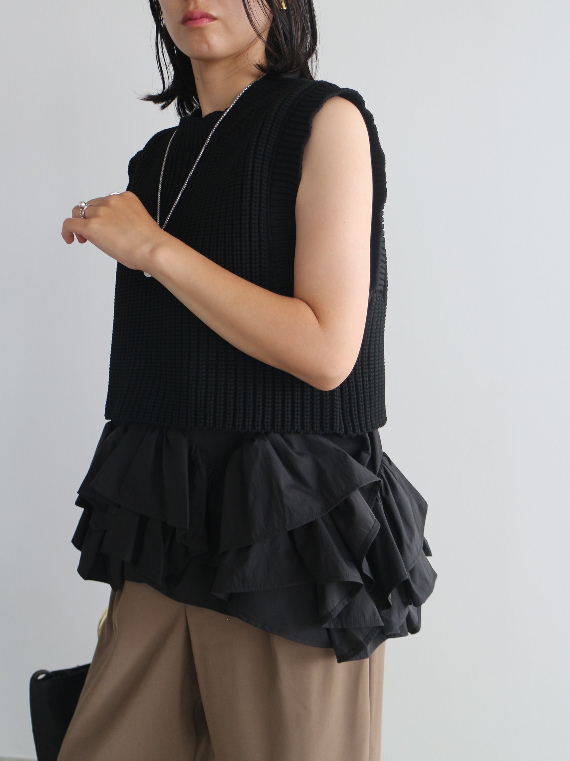 存在感のある畦編みのニットベストと、ラッフルフリルブラウスのセットアイテム。
