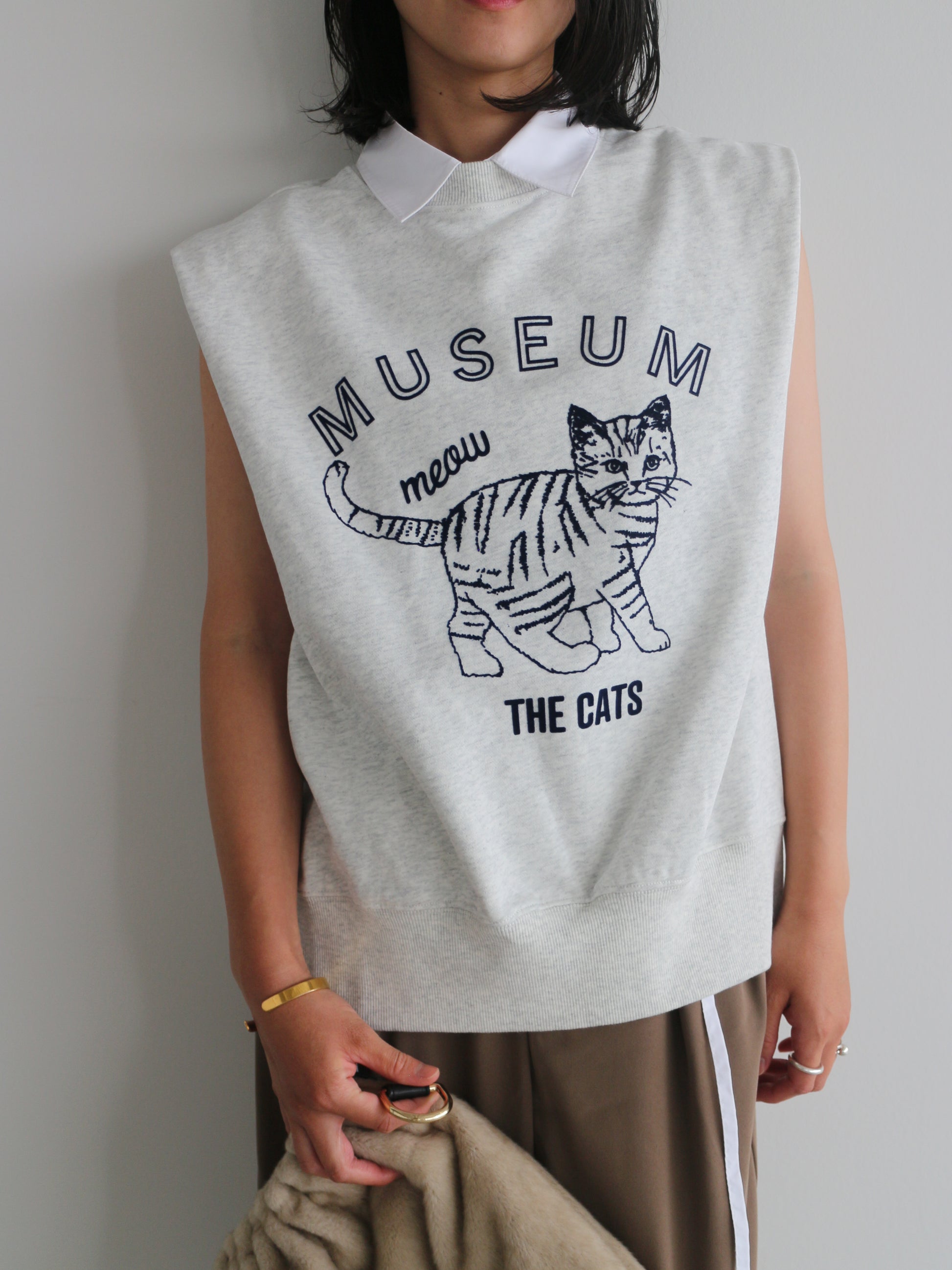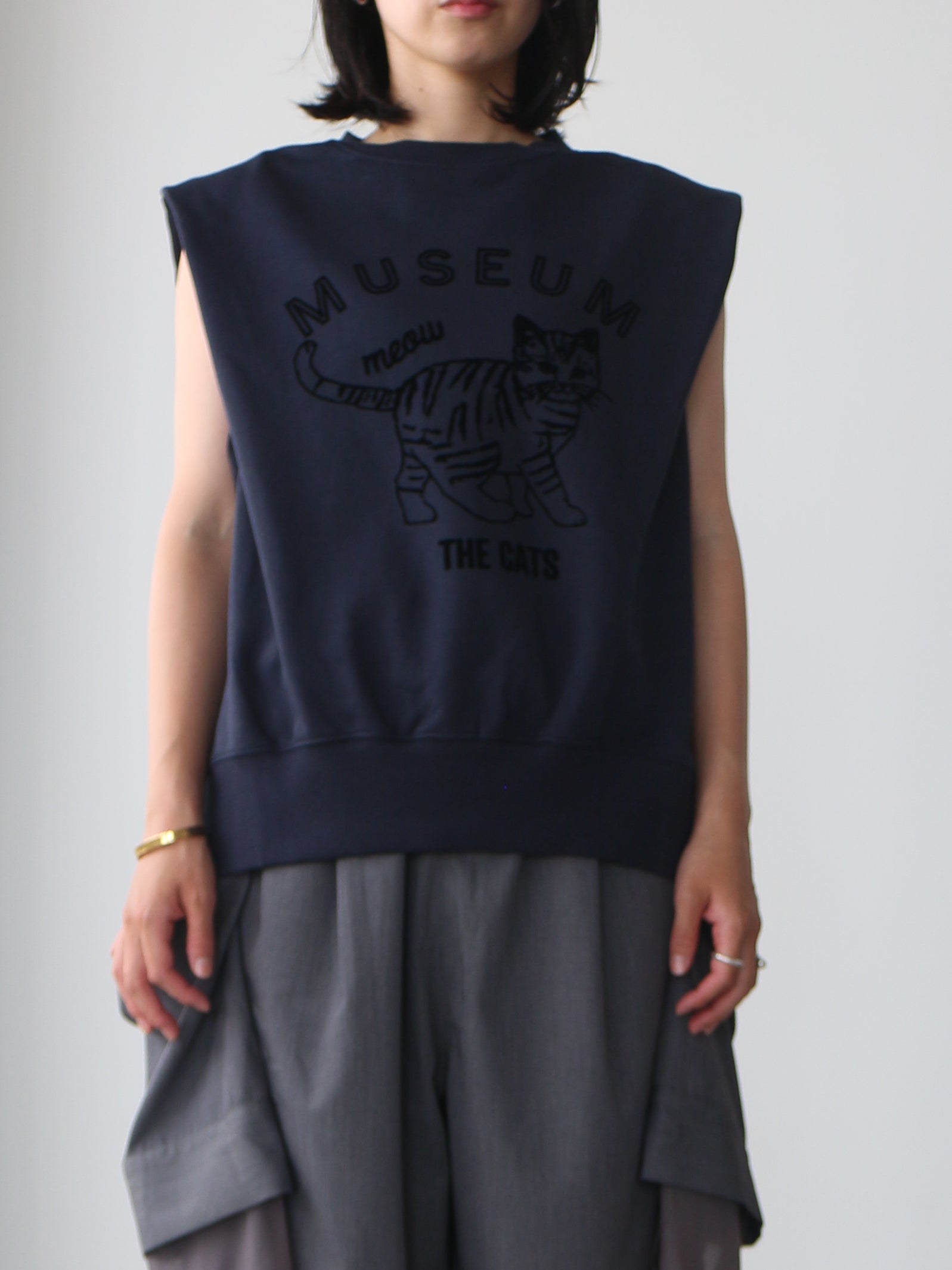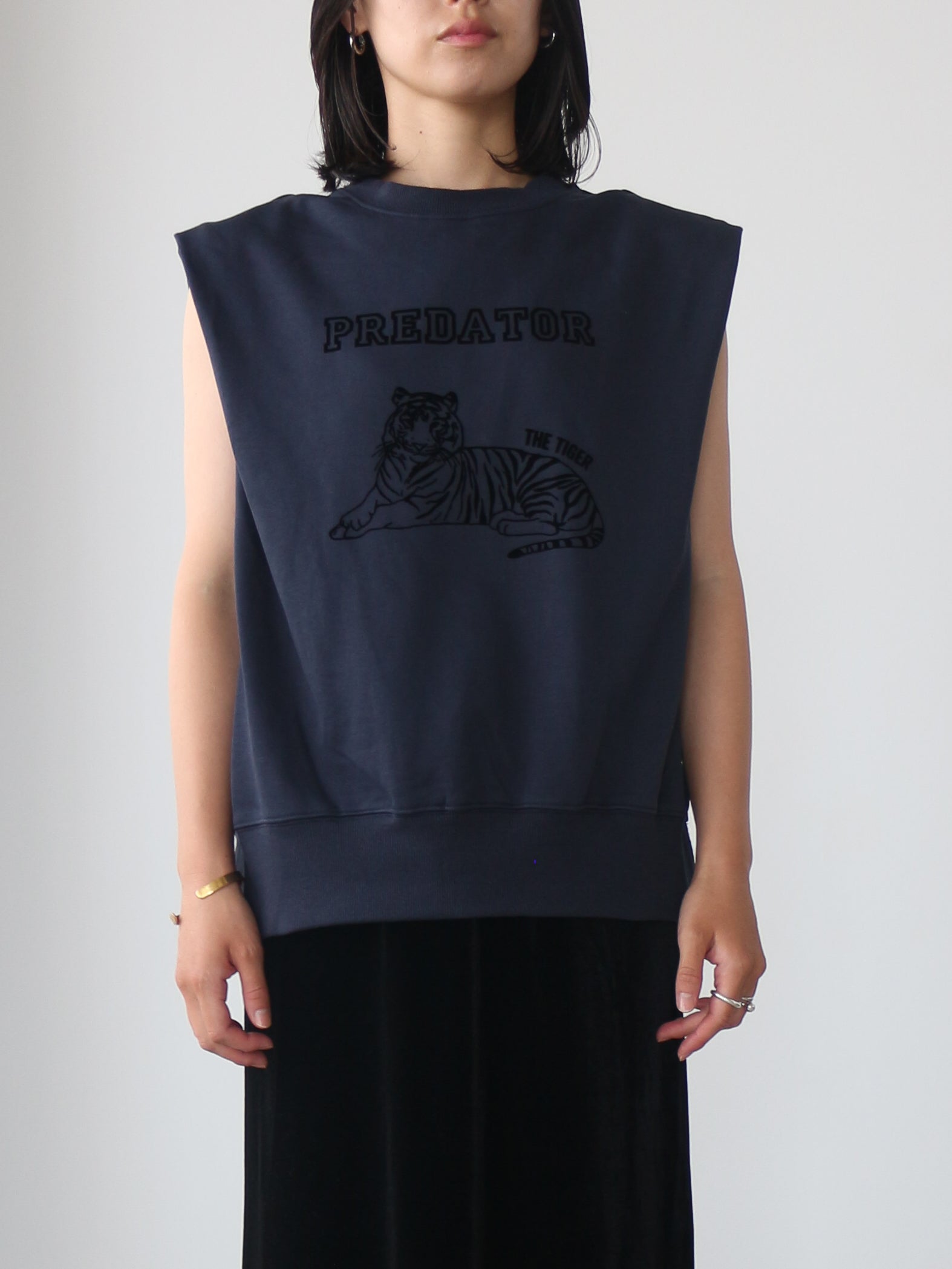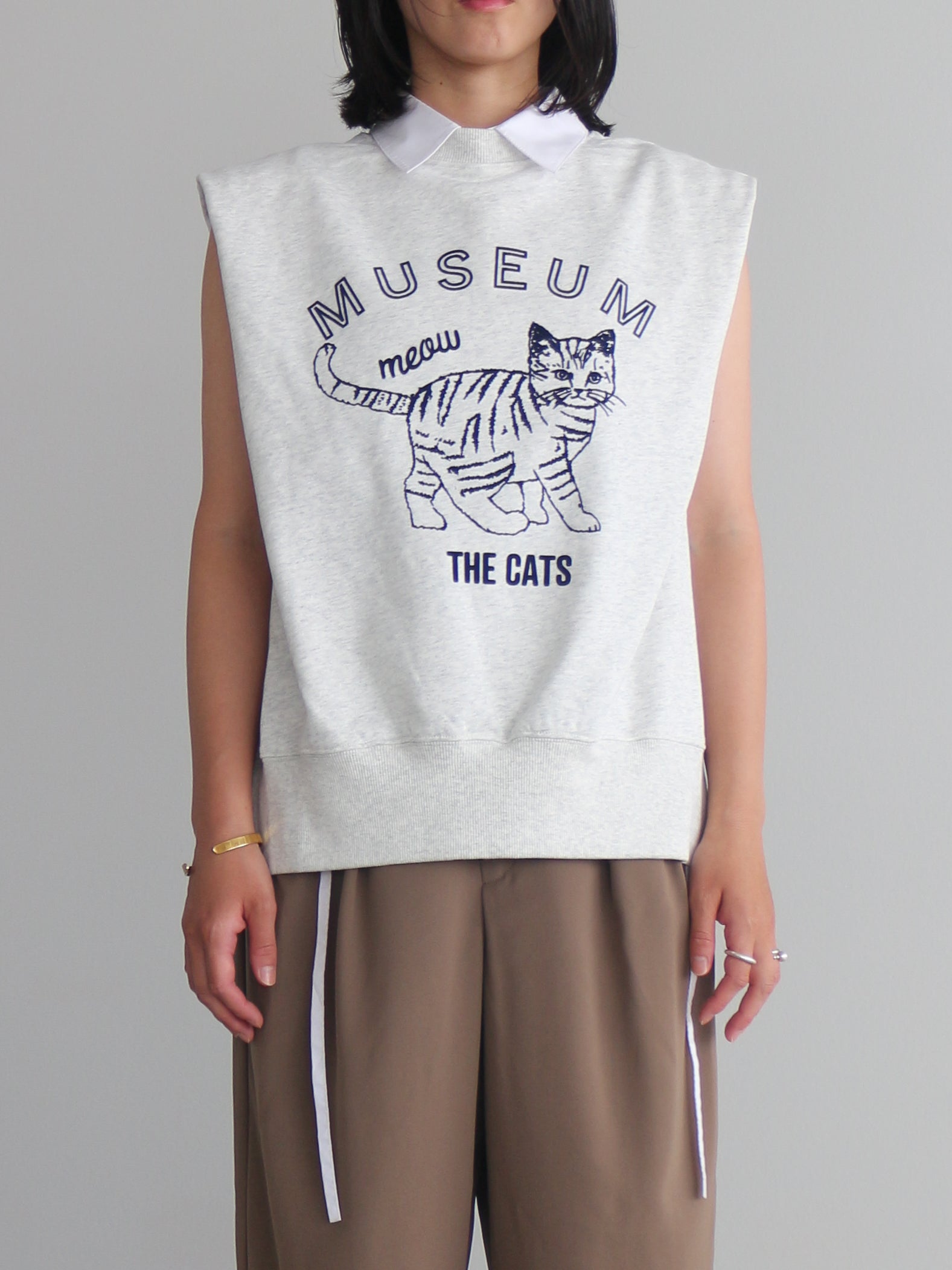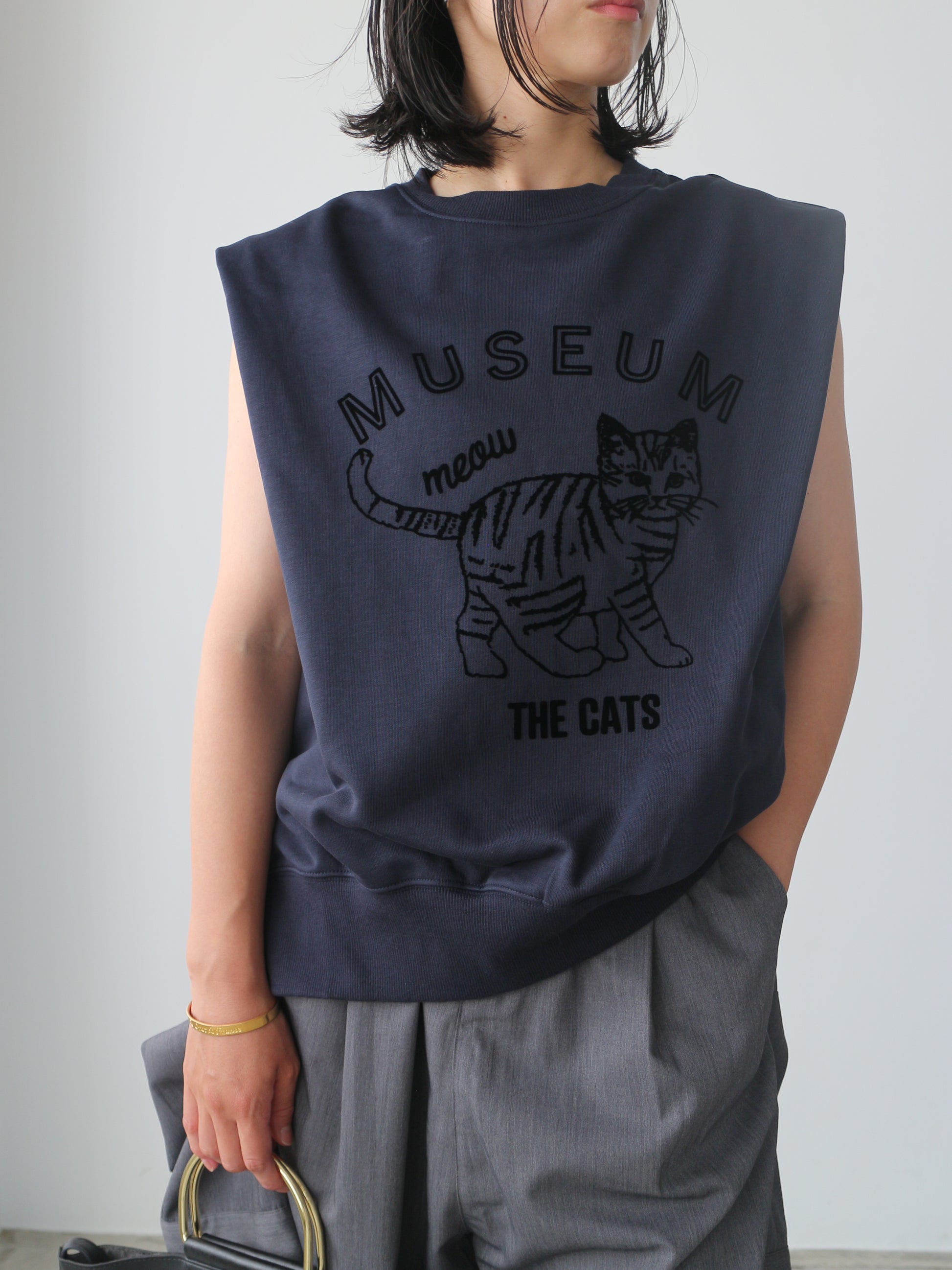 ハリのある裏毛にフロッキープリントのネコ&トラが映えるノースリーブプルオーバー。