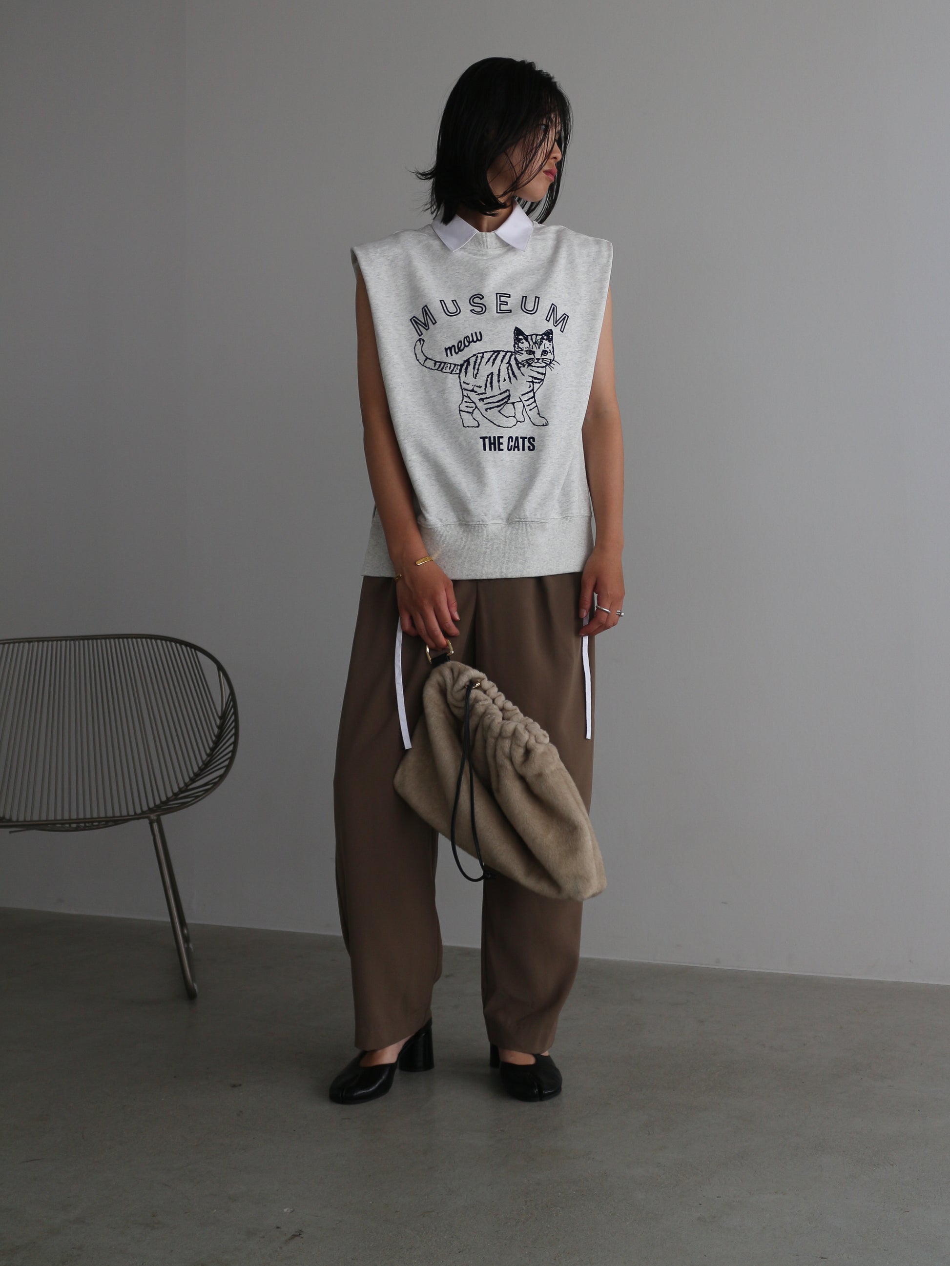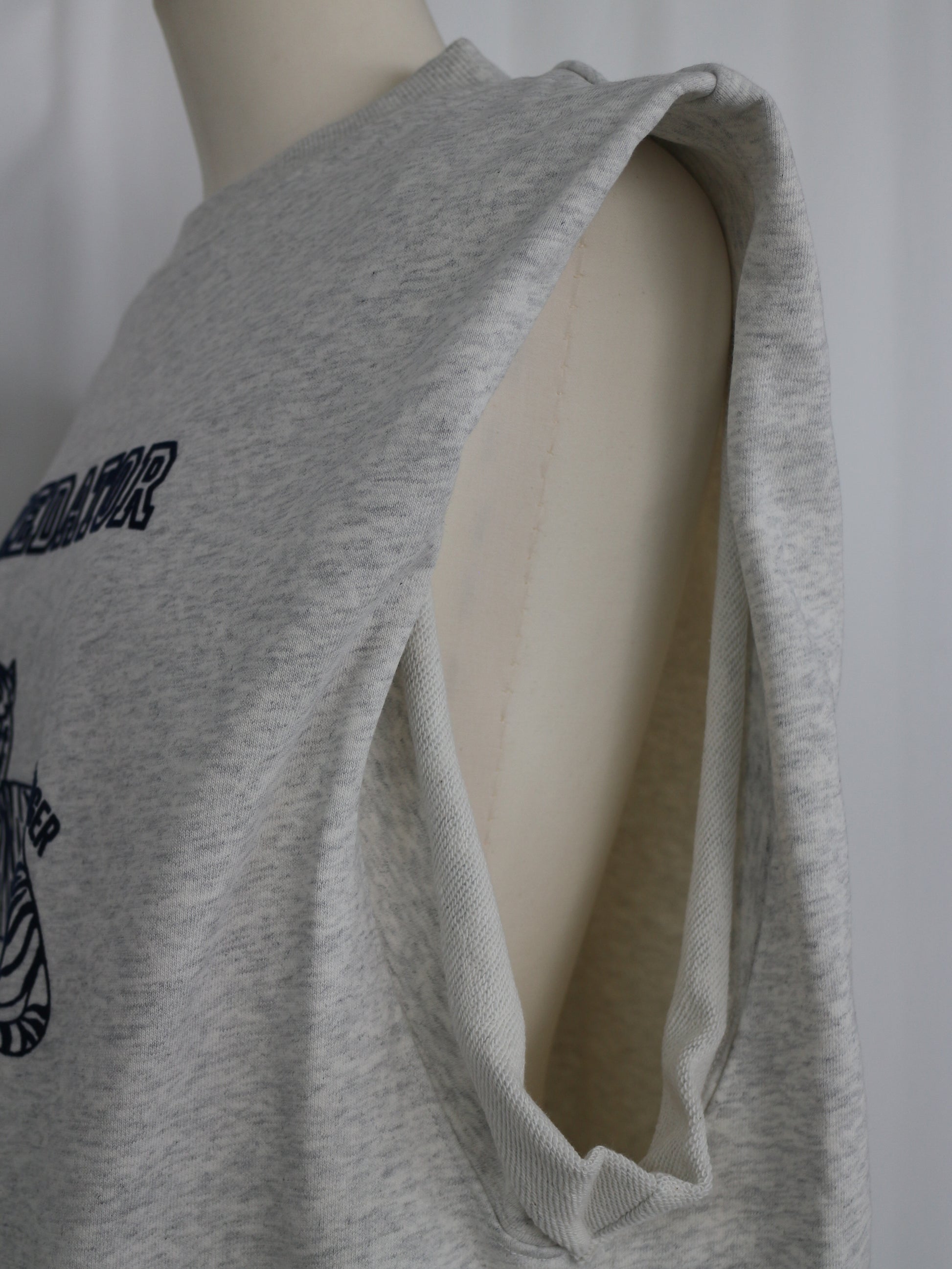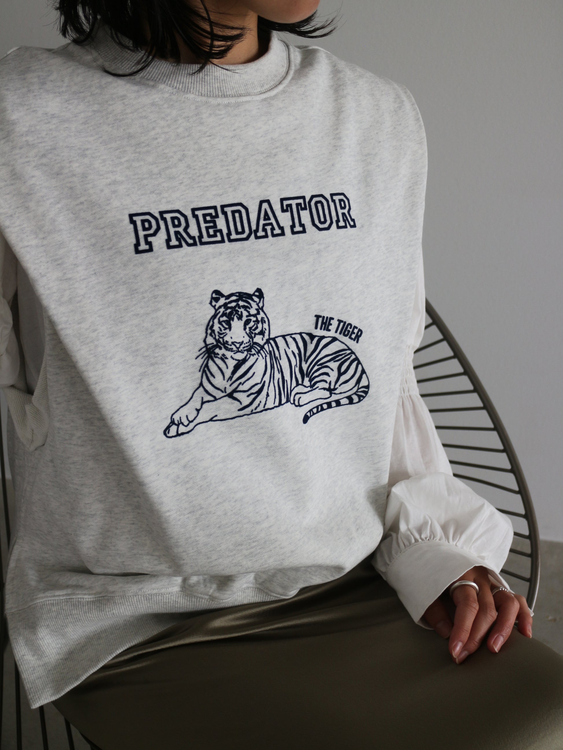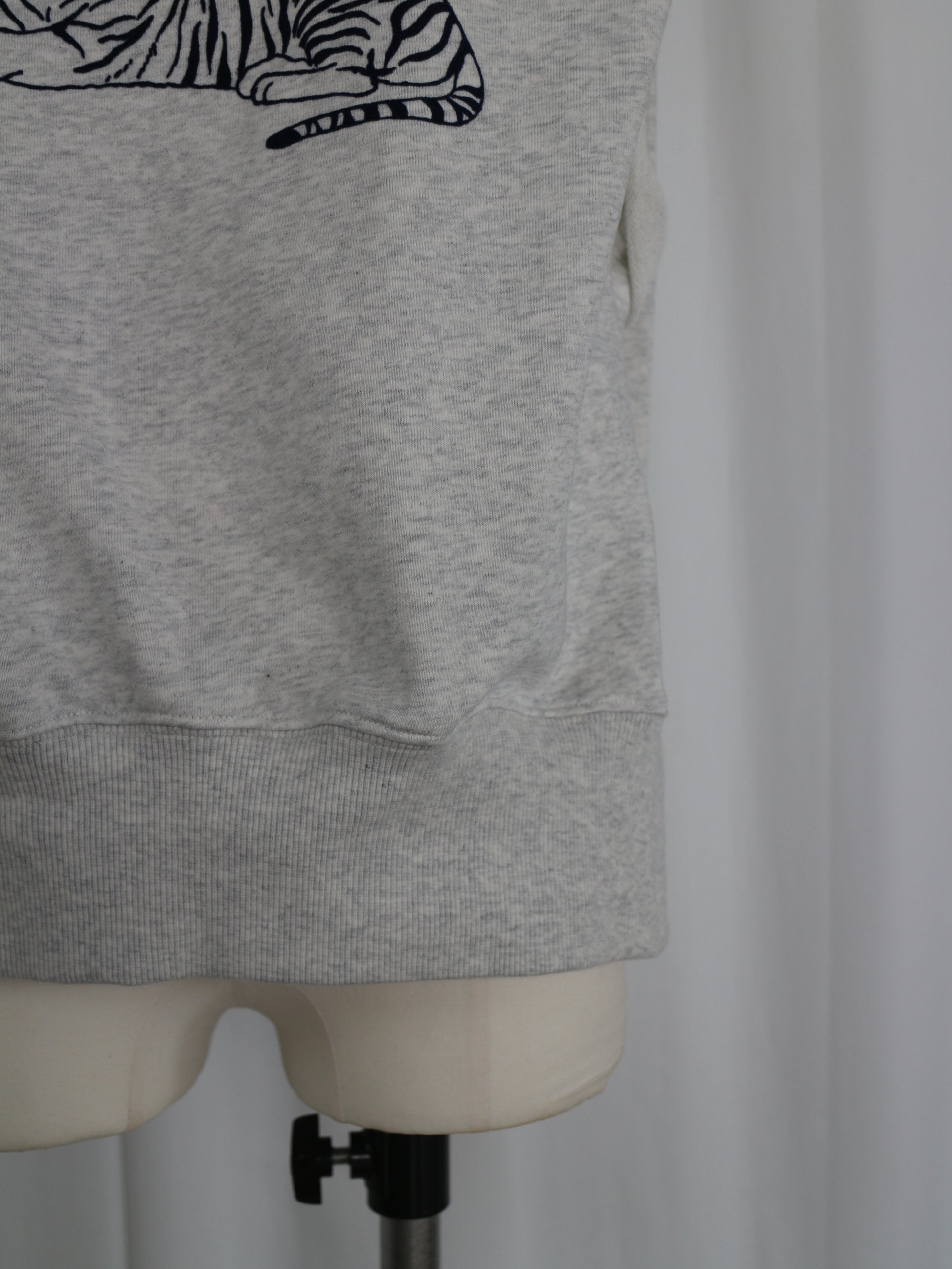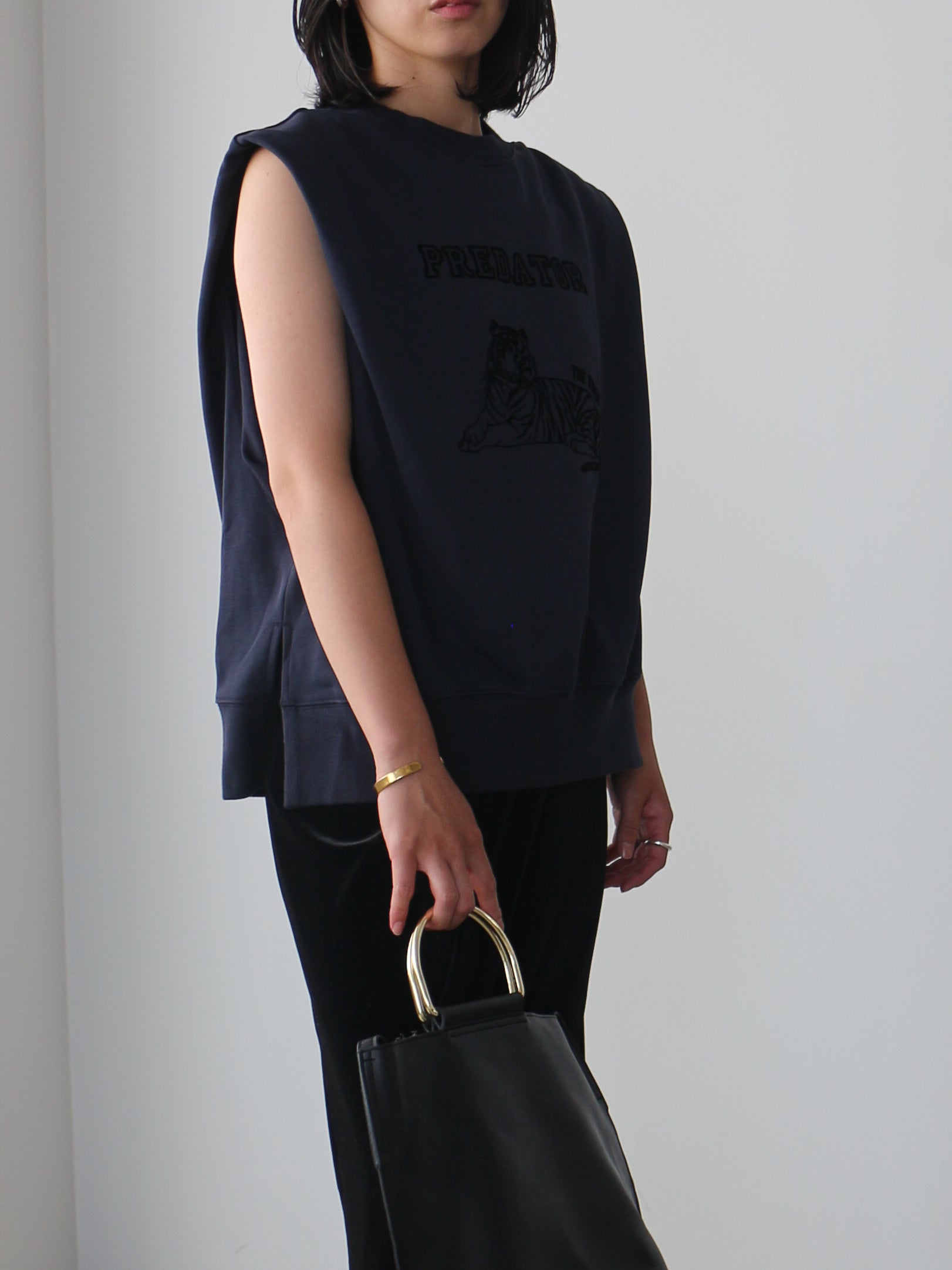 ハリのある裏毛にフロッキープリントのネコ&トラが映えるノースリーブプルオーバー。