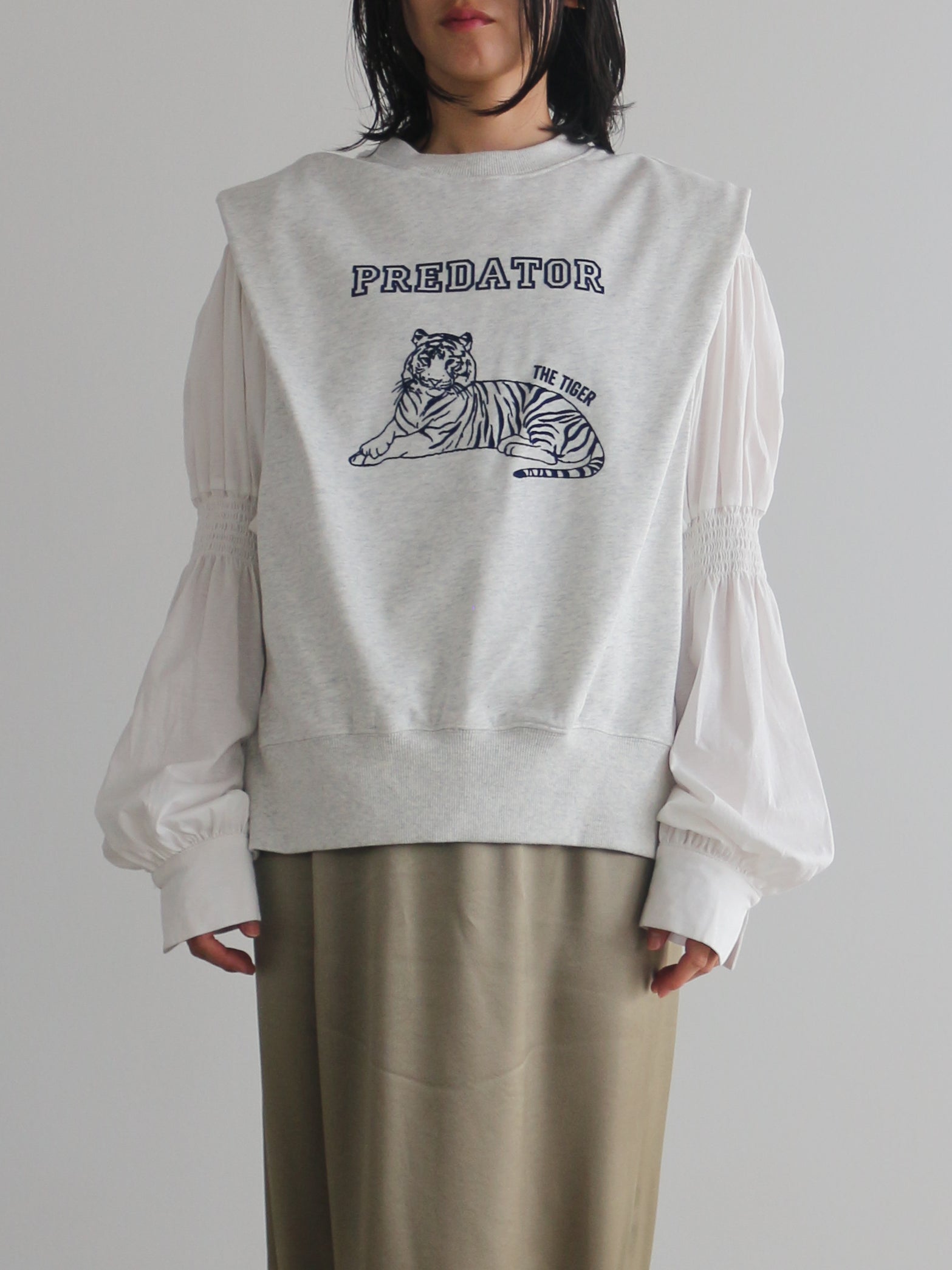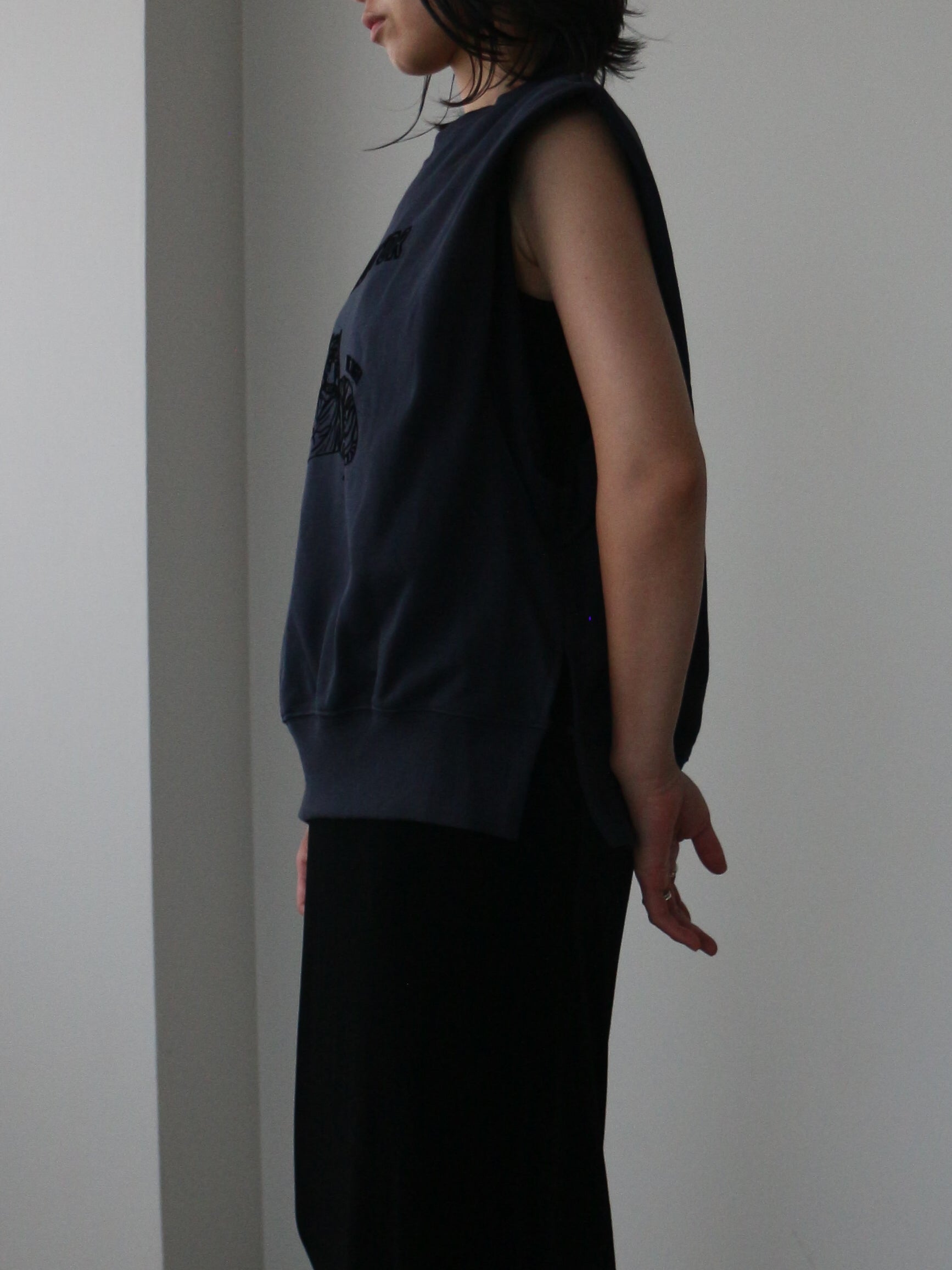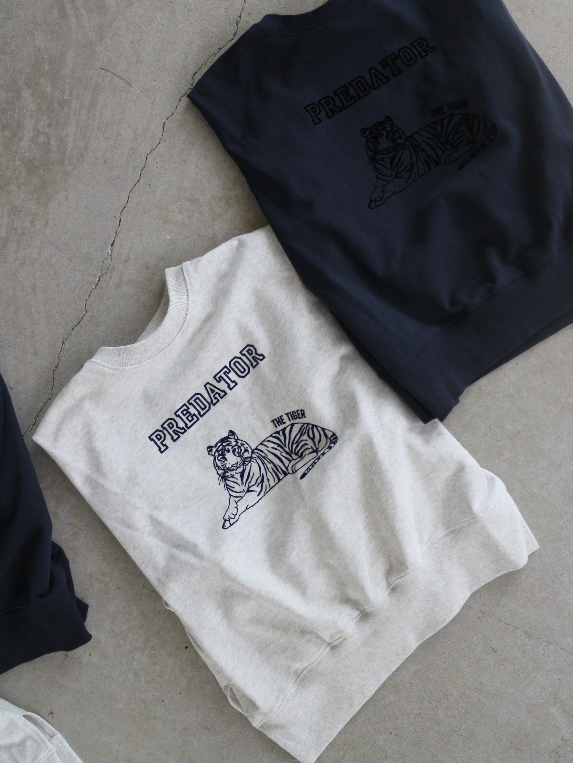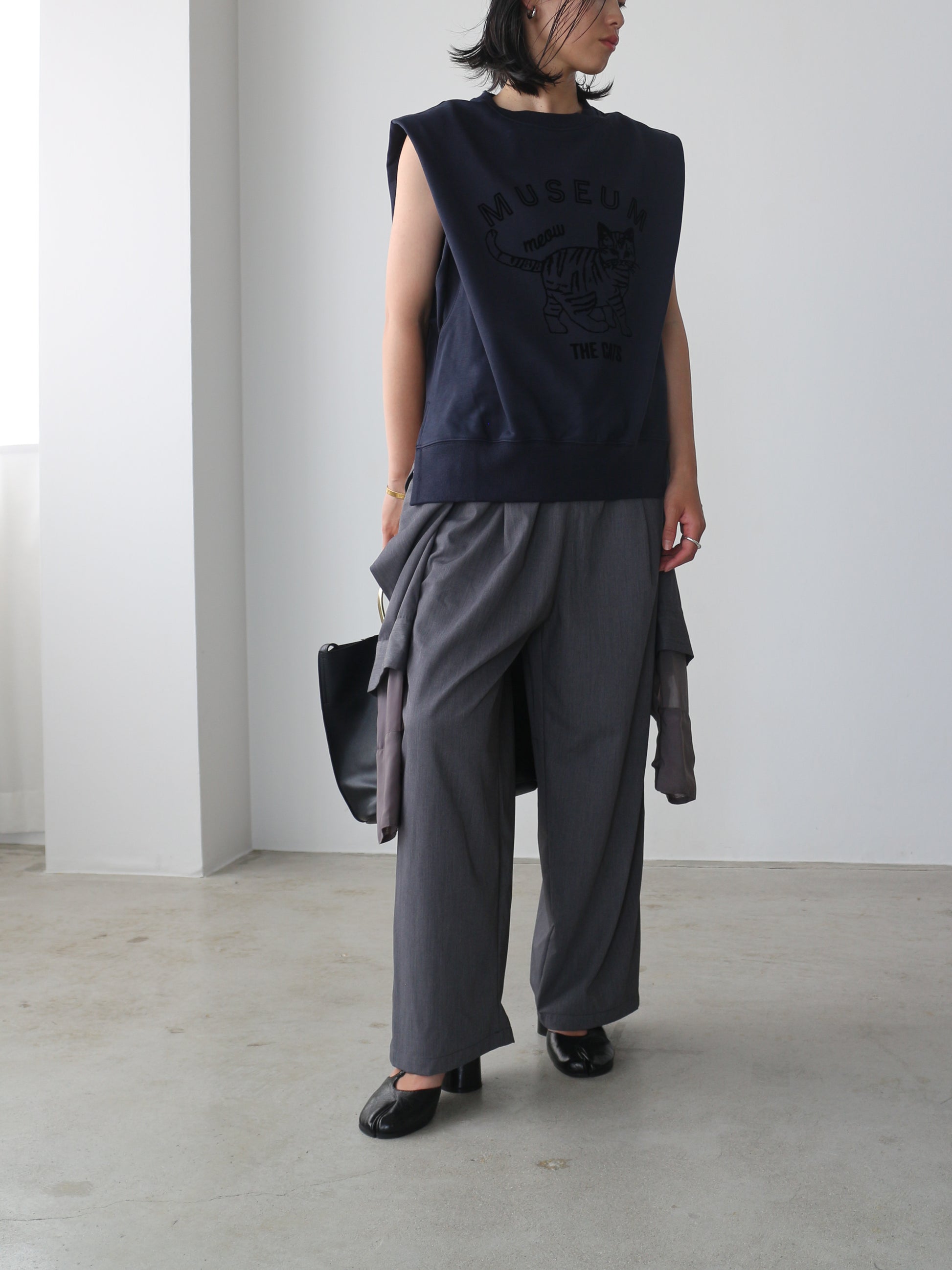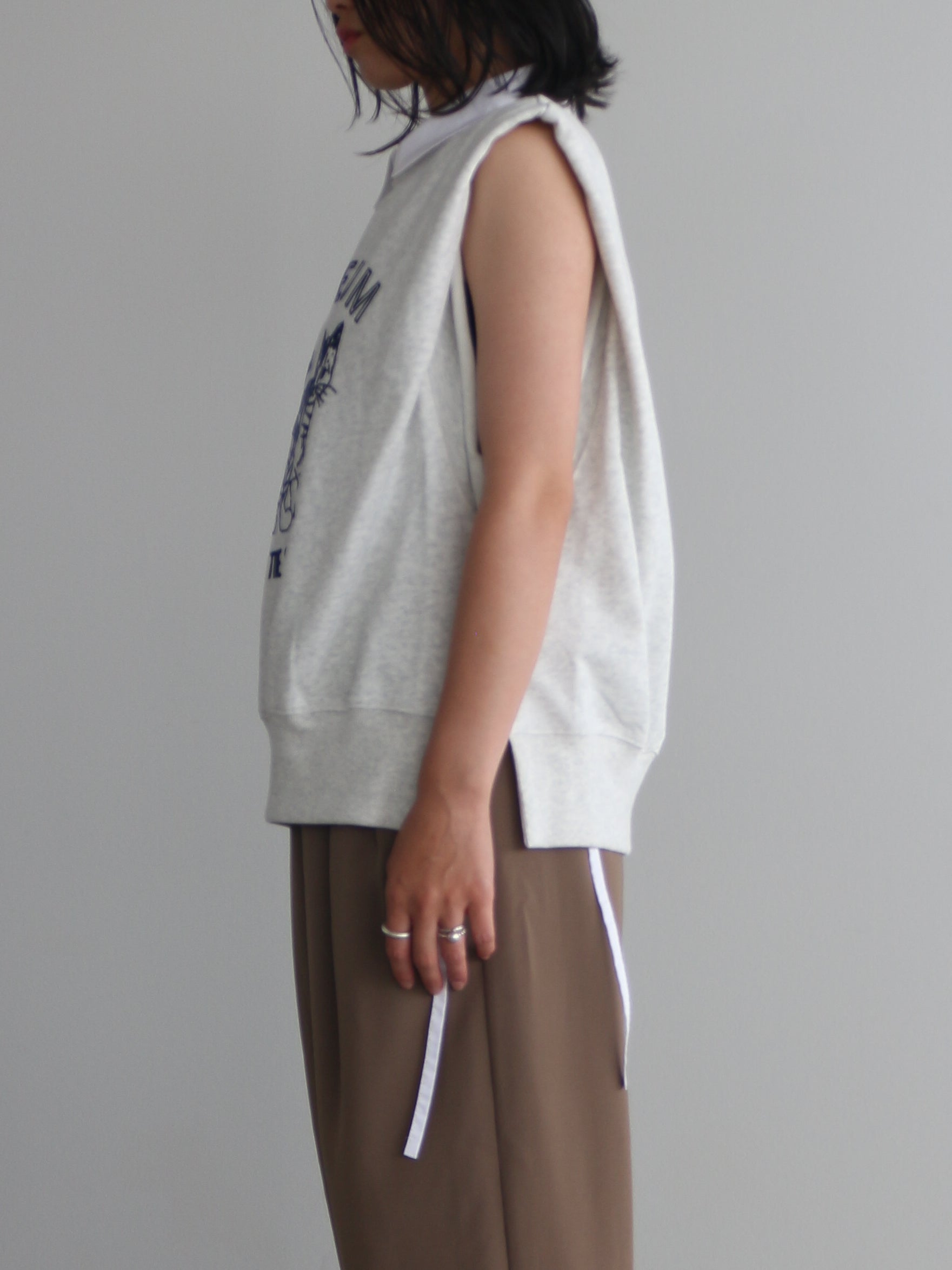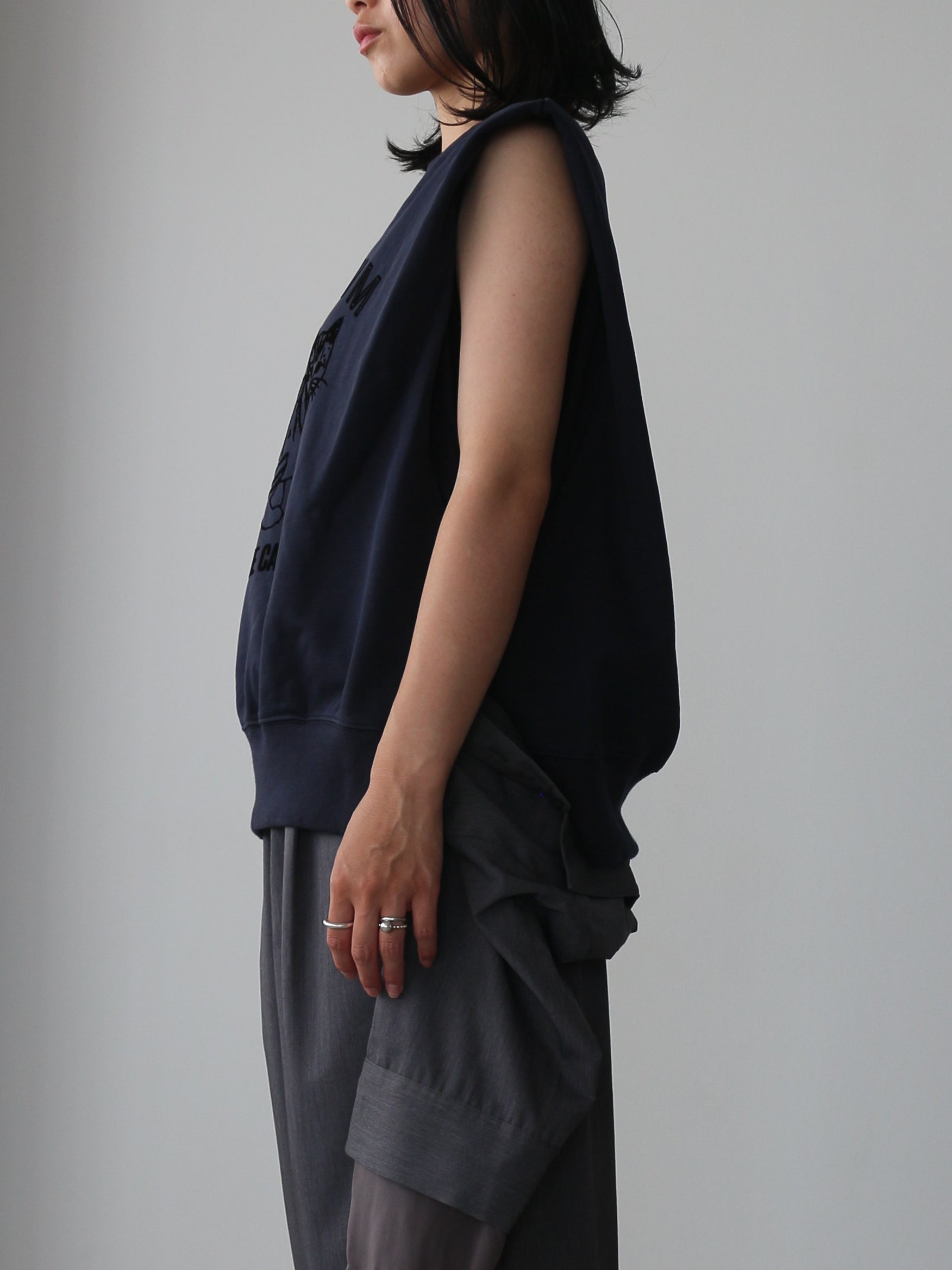 ハリのある裏毛にフロッキープリントのネコ&トラが映えるノースリーブプルオーバー。