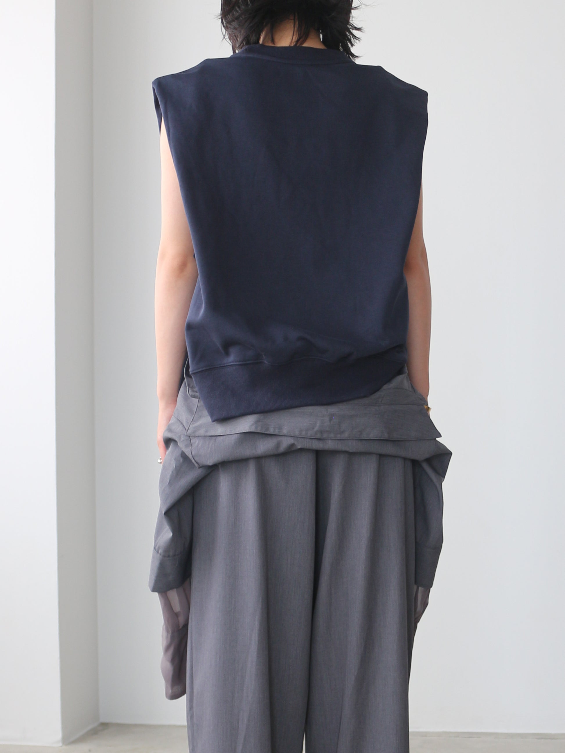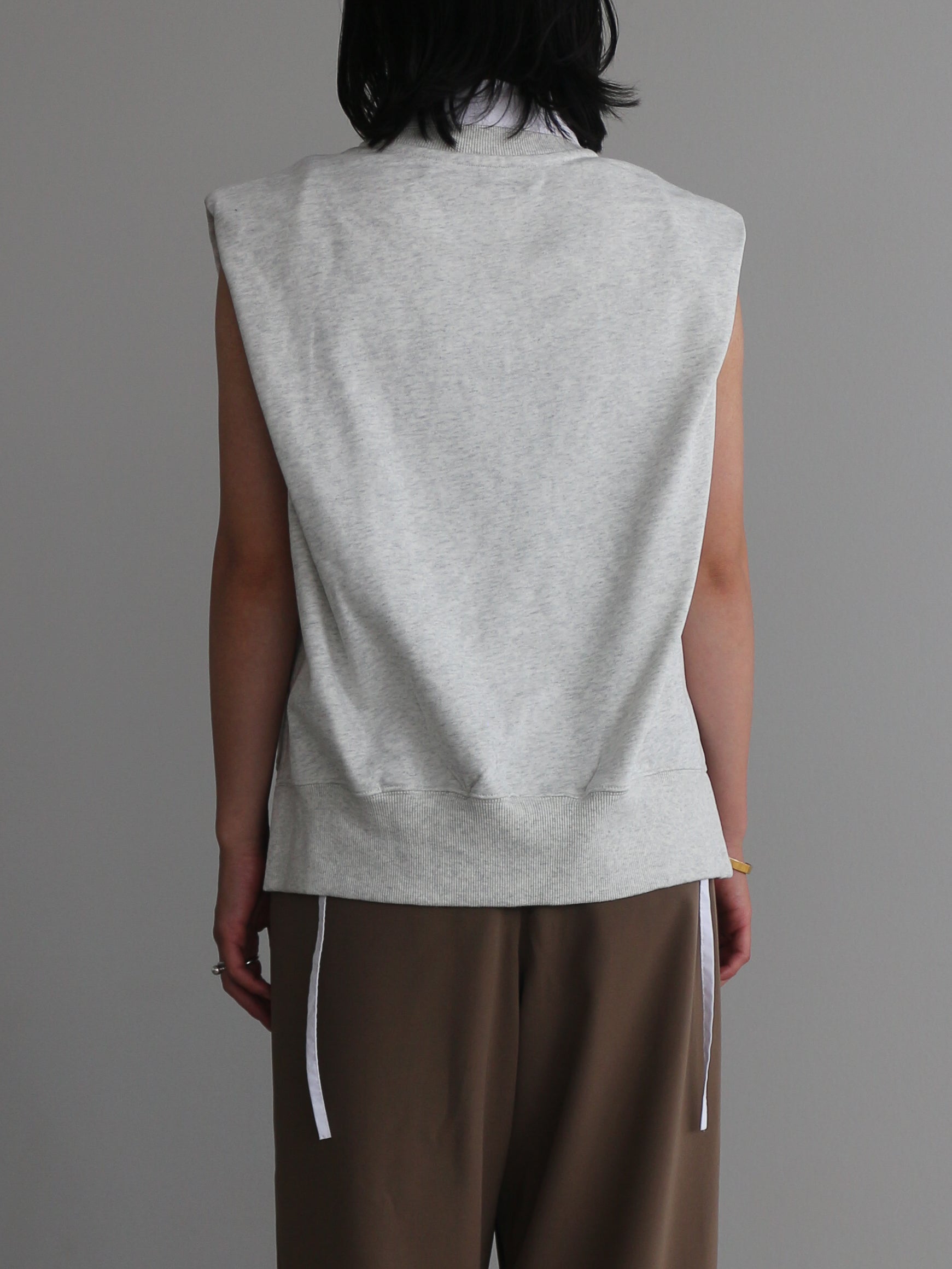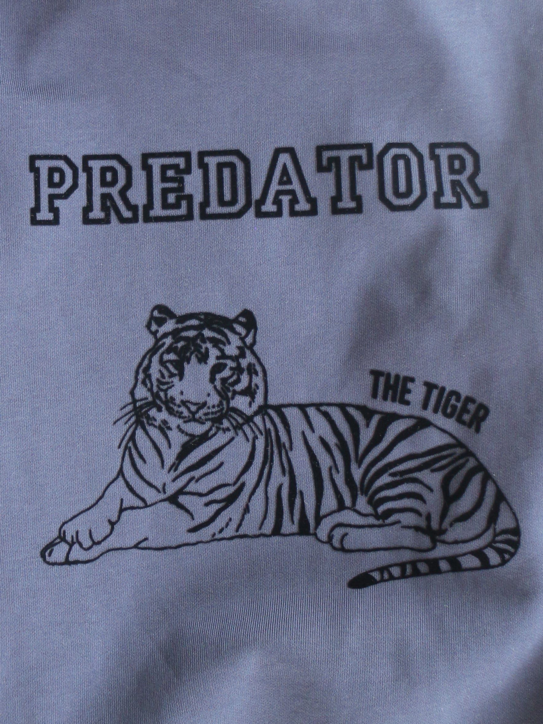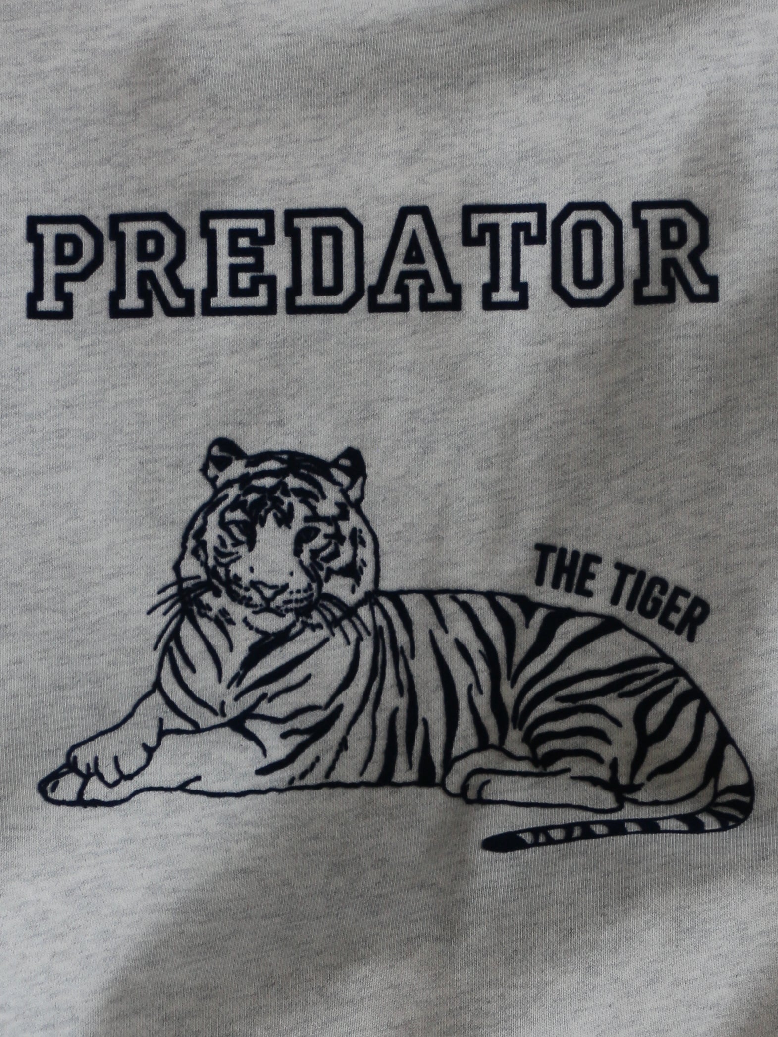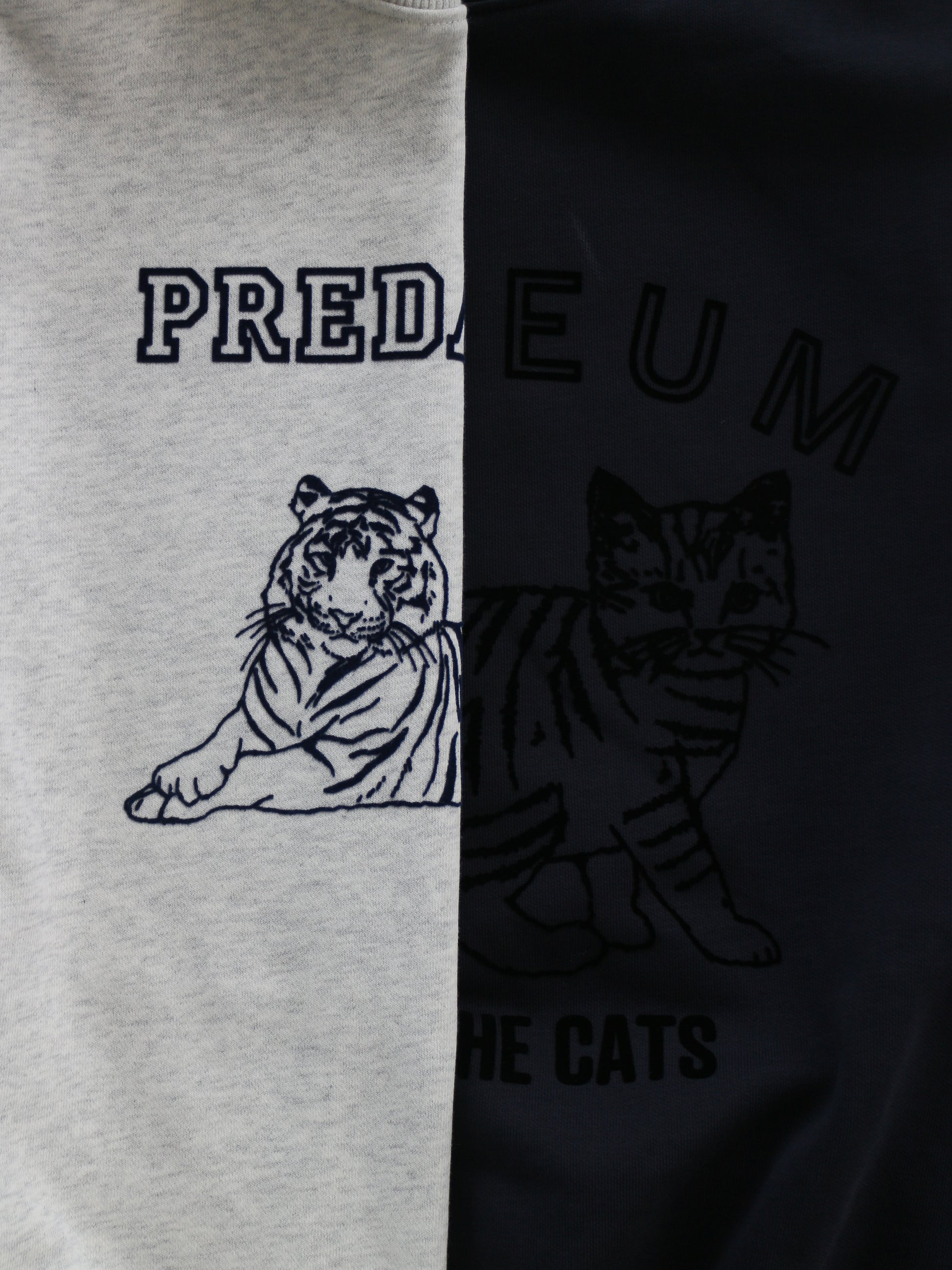 ハリのある裏毛にフロッキープリントのネコ&トラが映えるノースリーブプルオーバー。