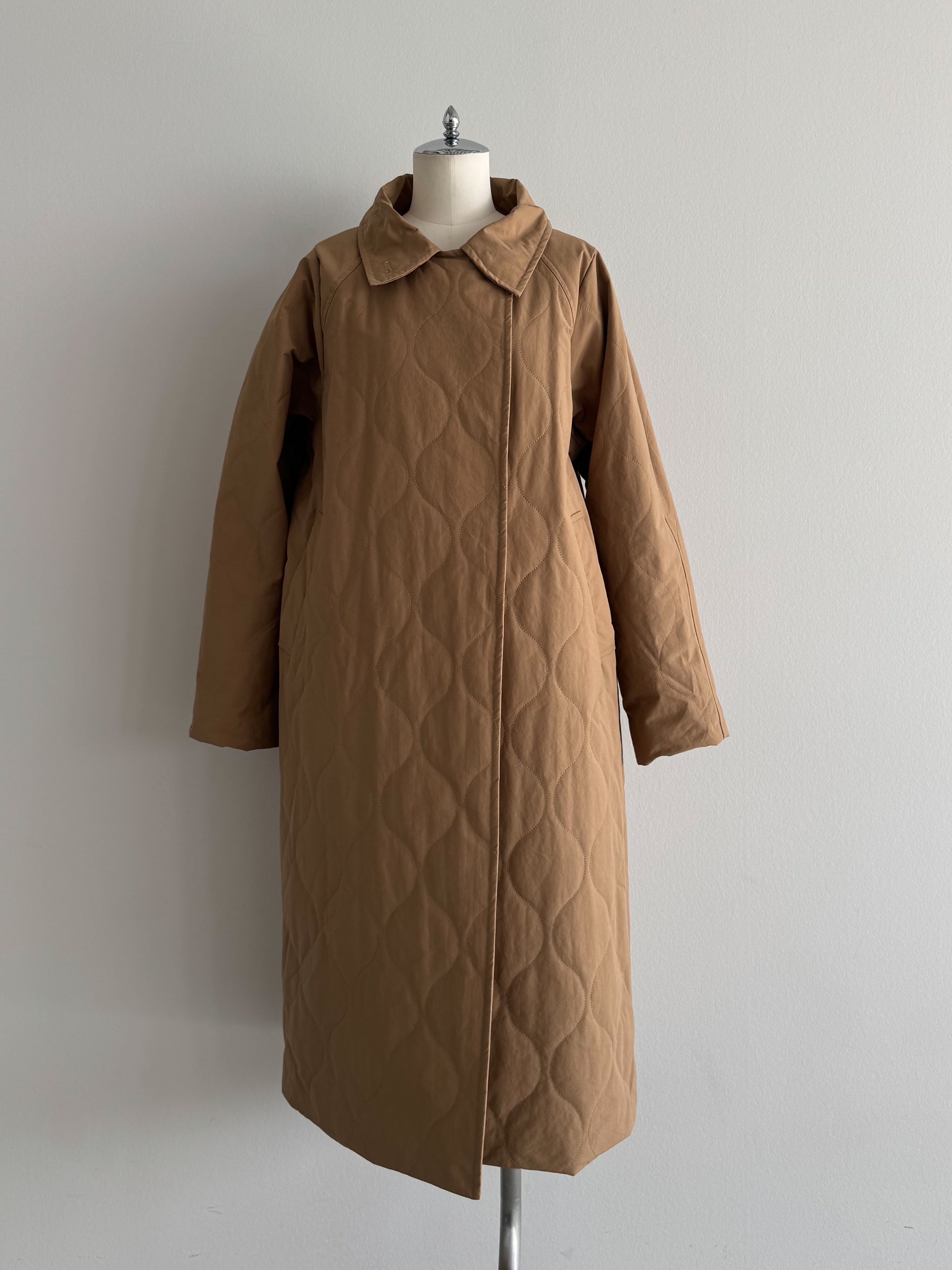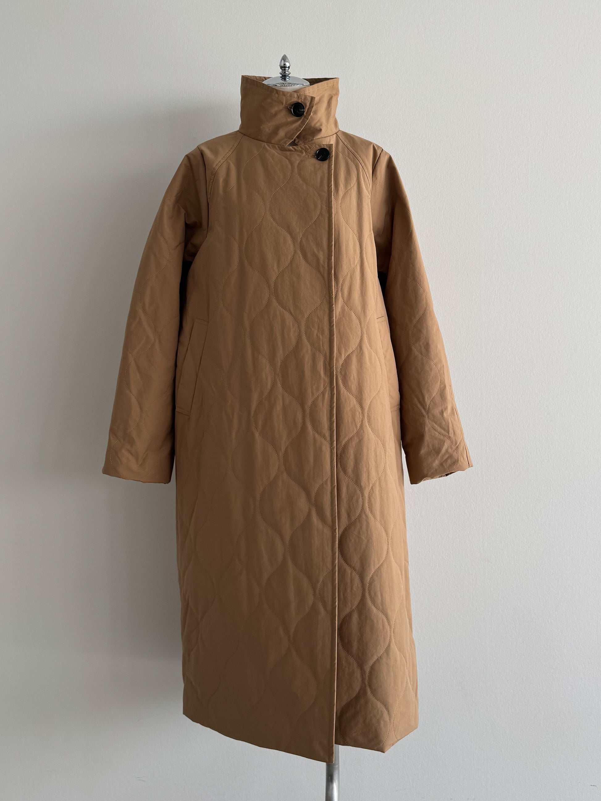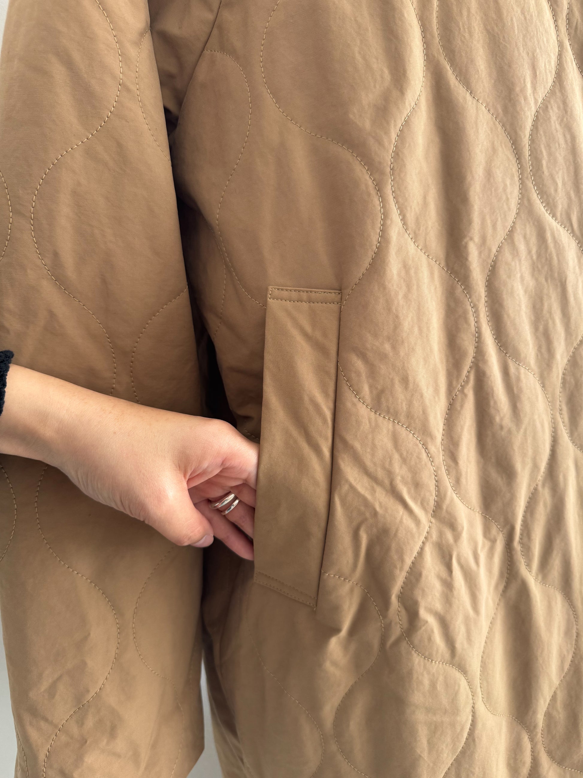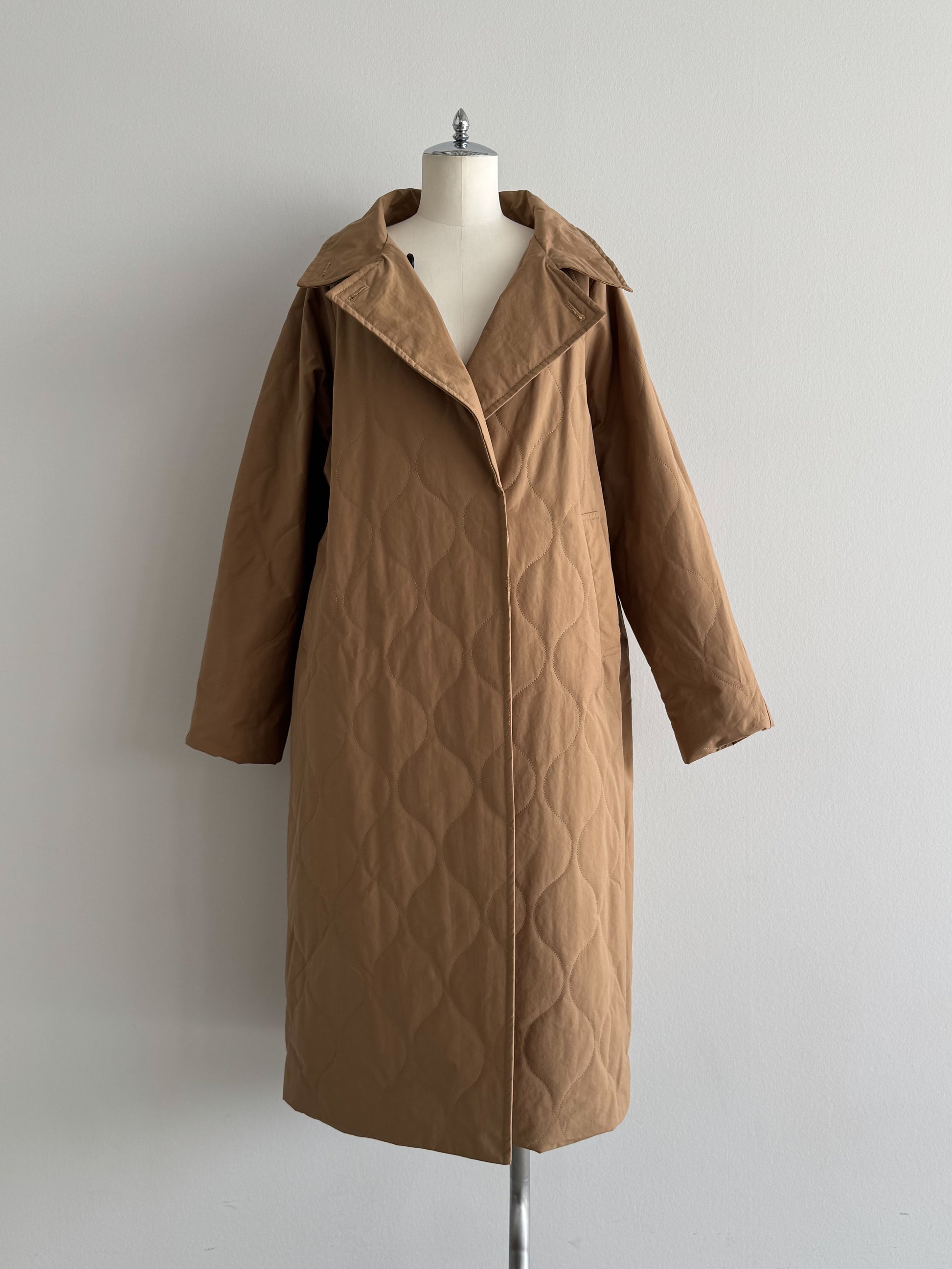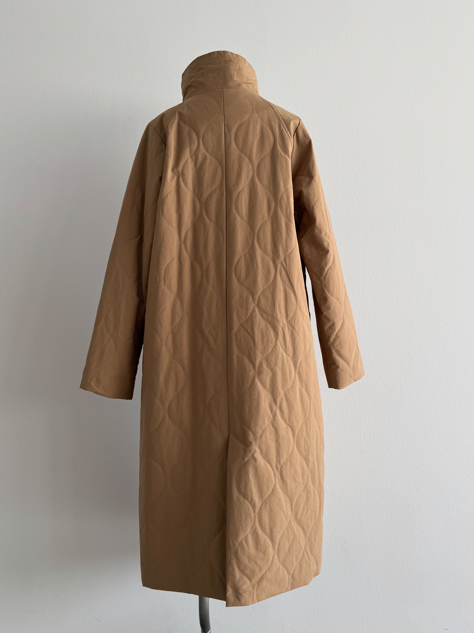 ウインターシーズンに欠かせないキルティングコートに、同素材の大判ストールをセットした今年らしいデザイン。