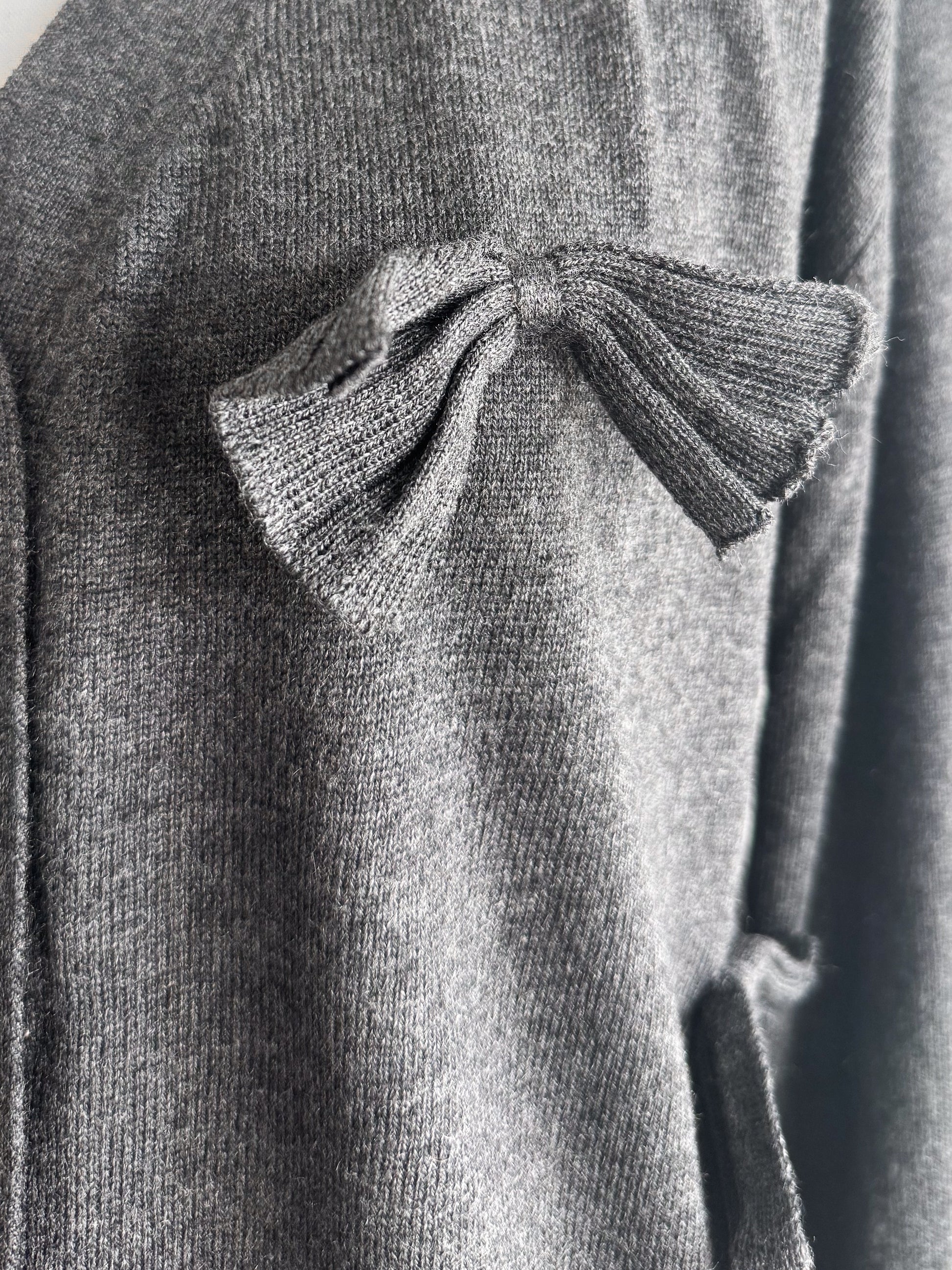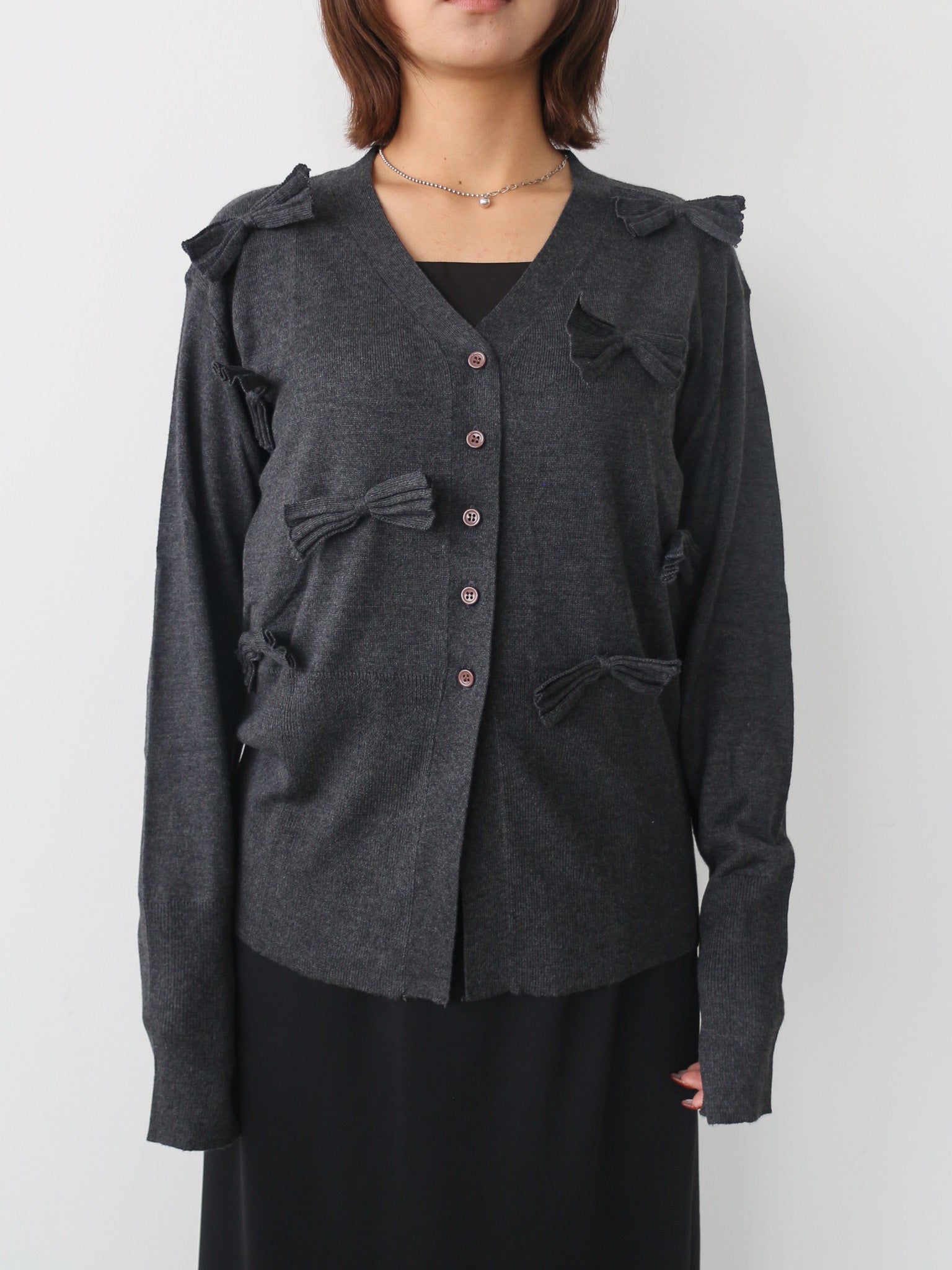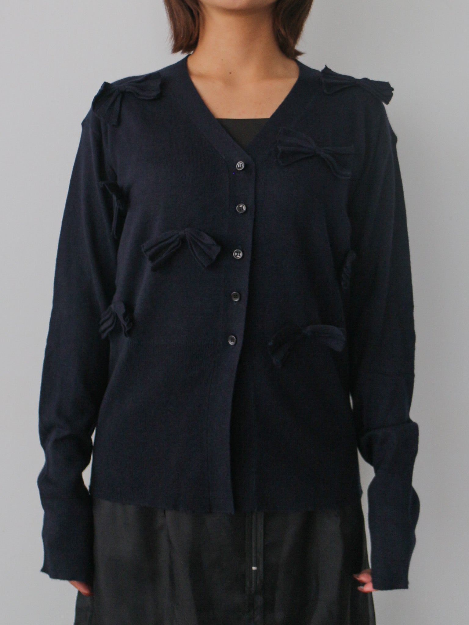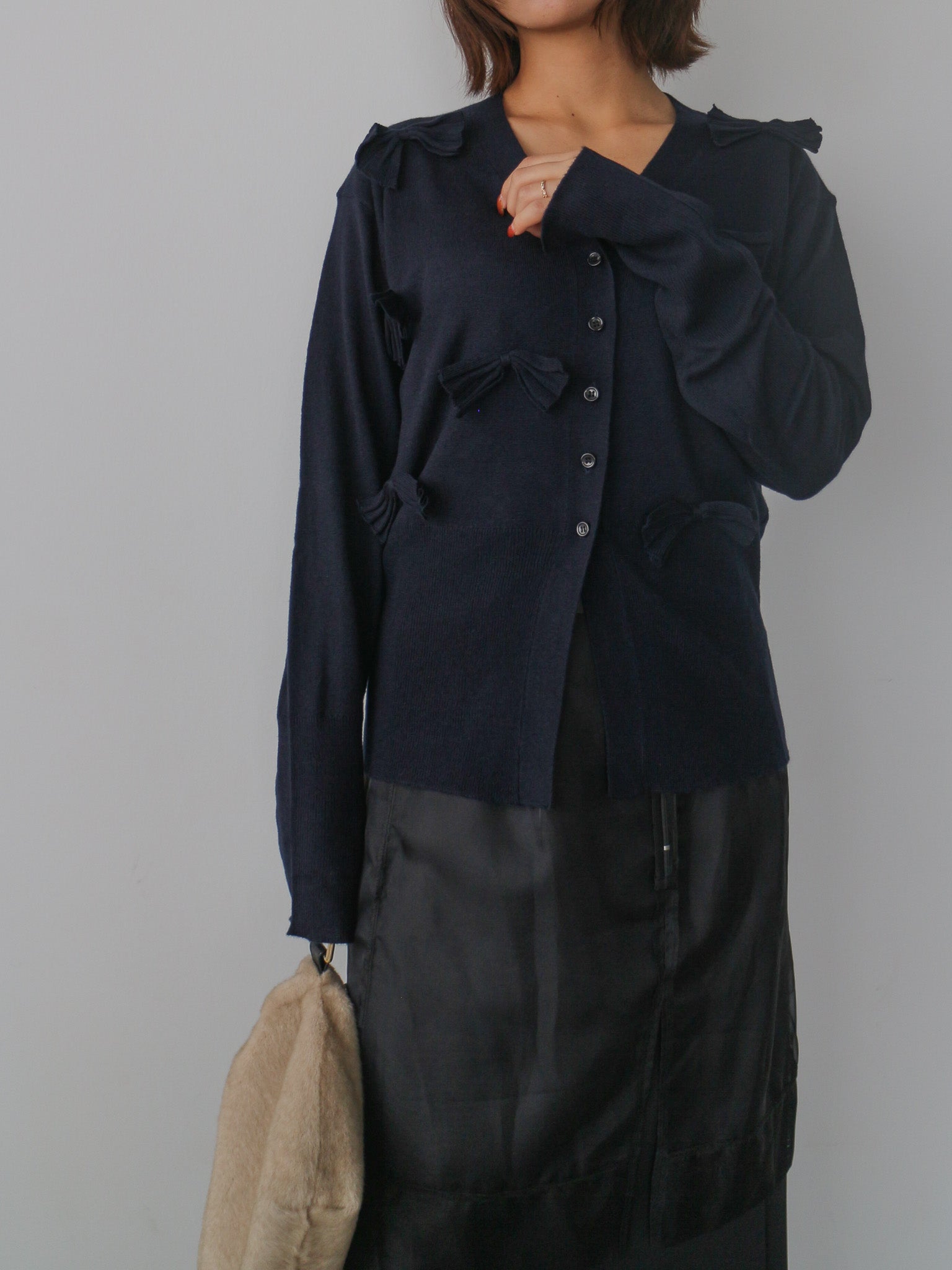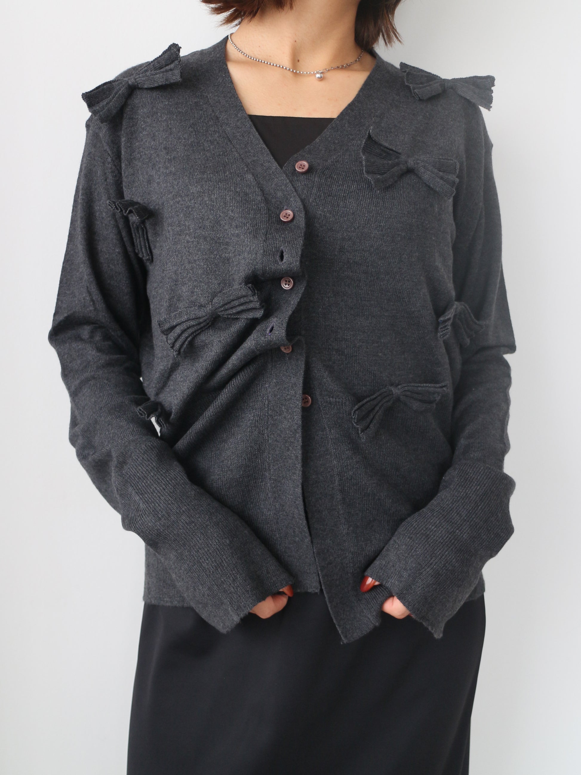 シンプルなVネックカーディガンに甘さを抑えたシックなリボンがアクセント。