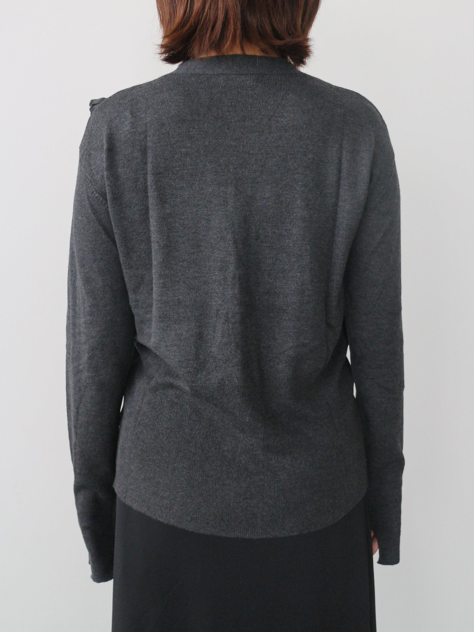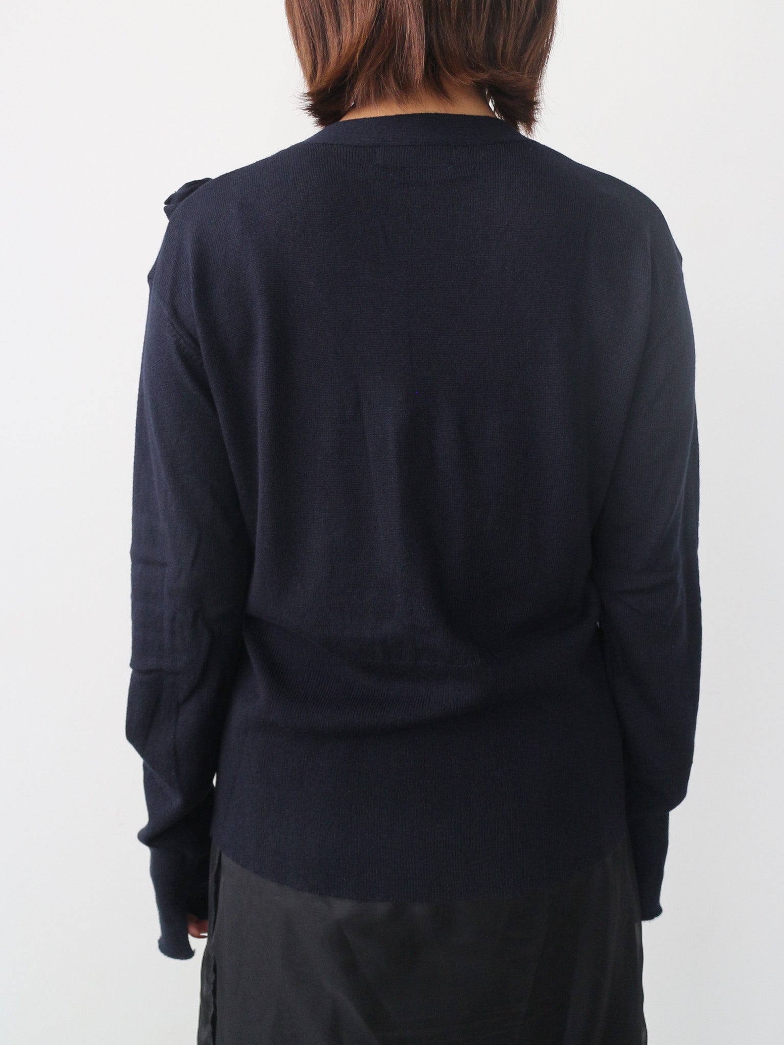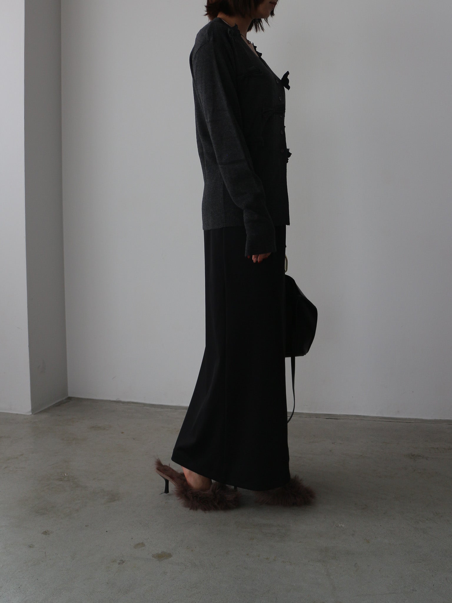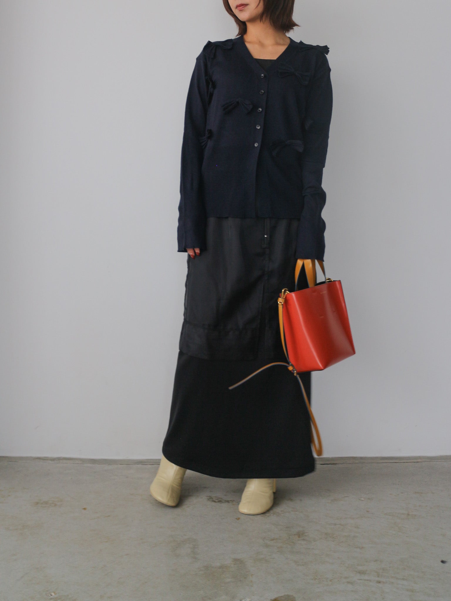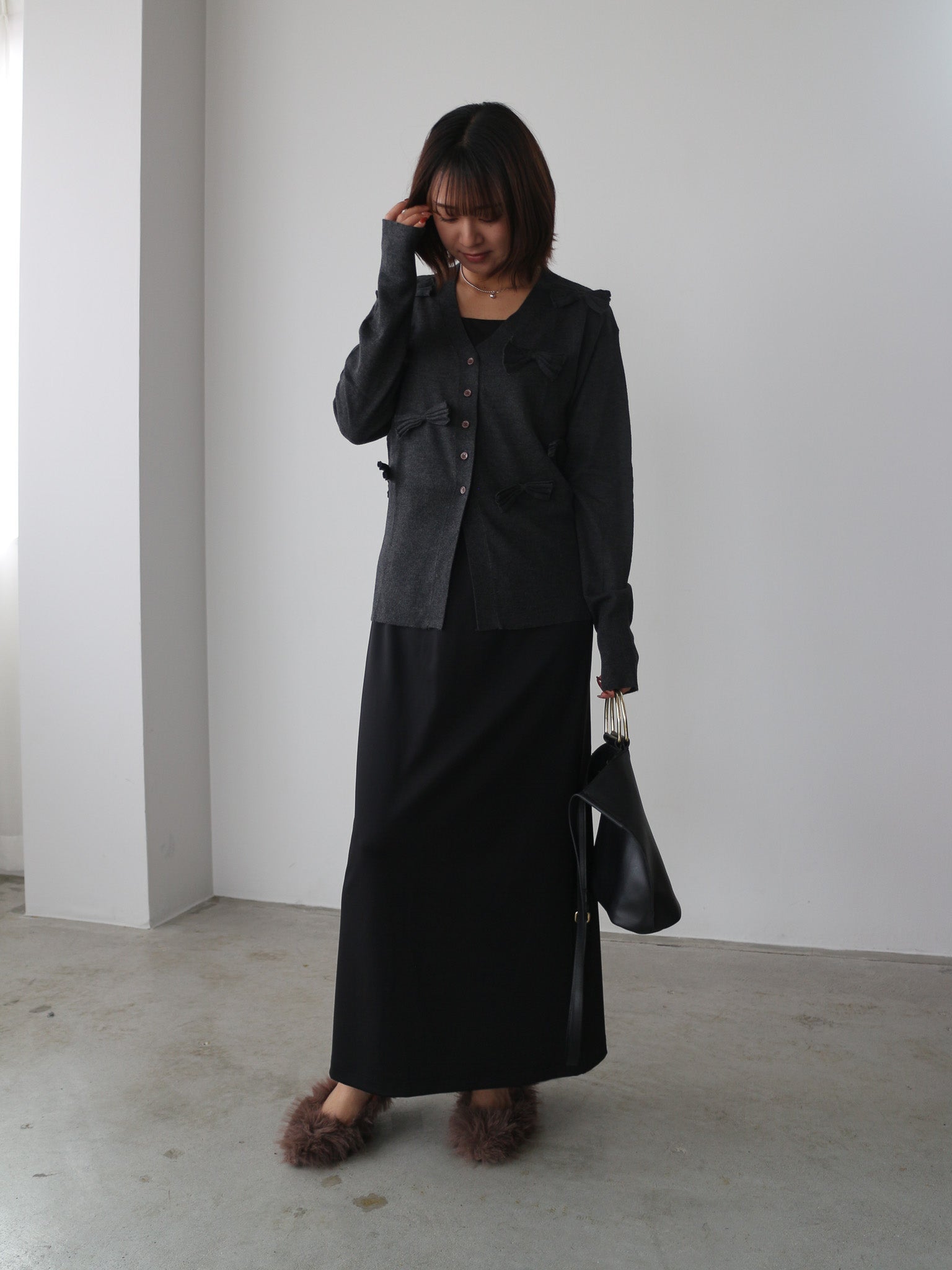 シンプルなVネックカーディガンに甘さを抑えたシックなリボンがアクセント。