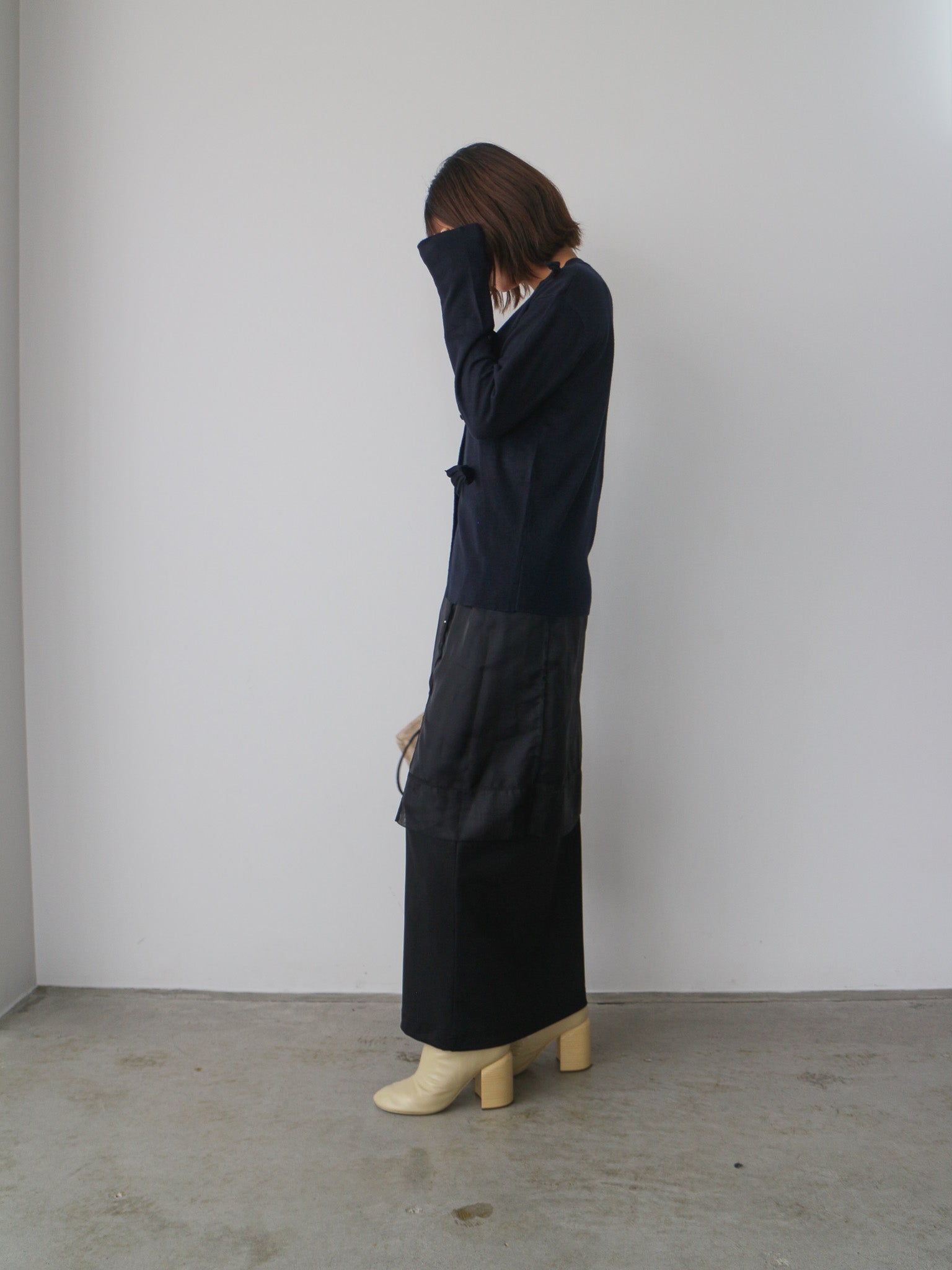 同素材のタックリボンは甘くなりすぎず、モードな雰囲気に。