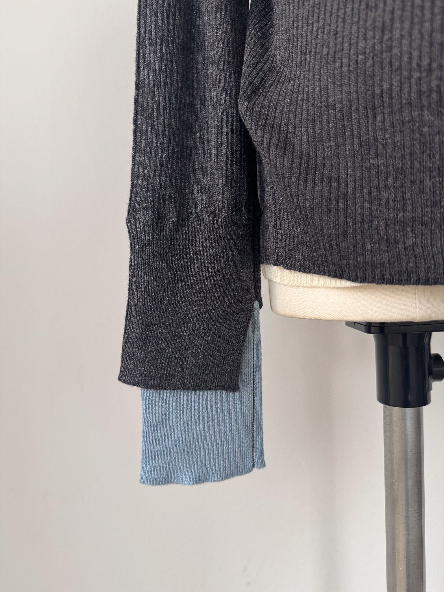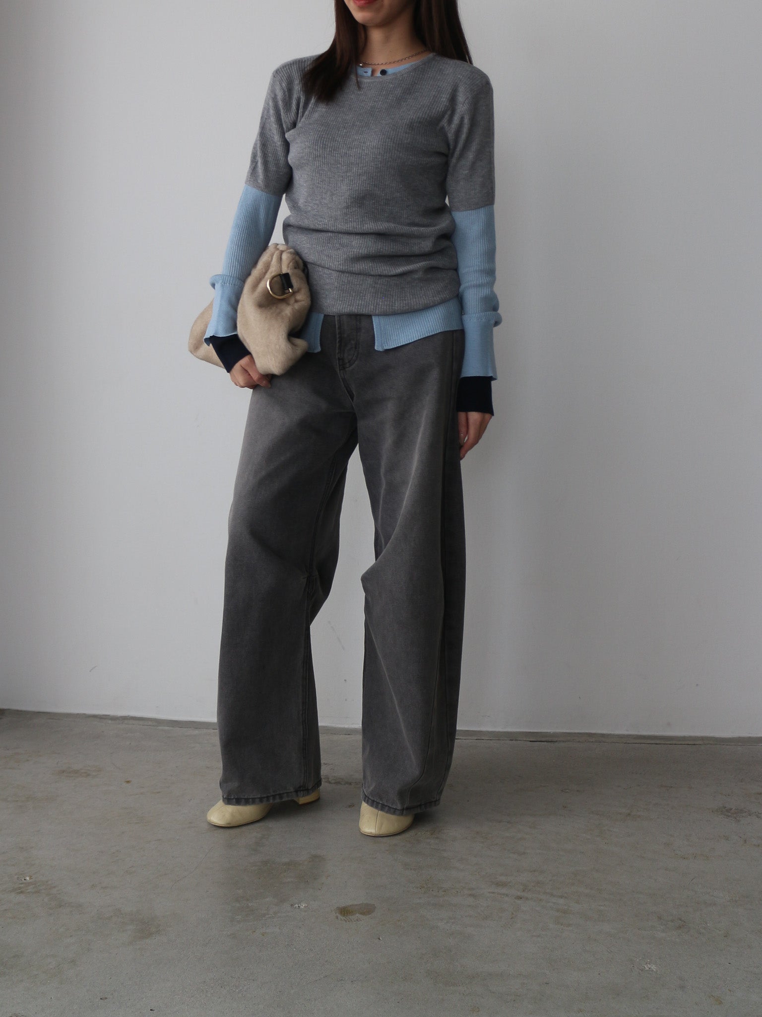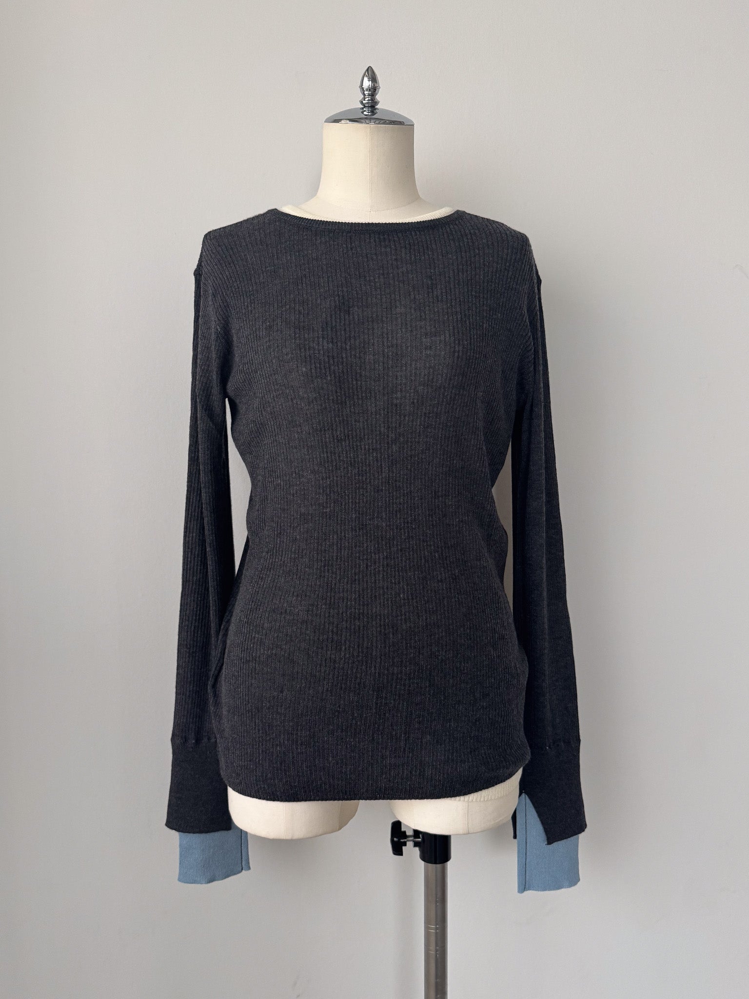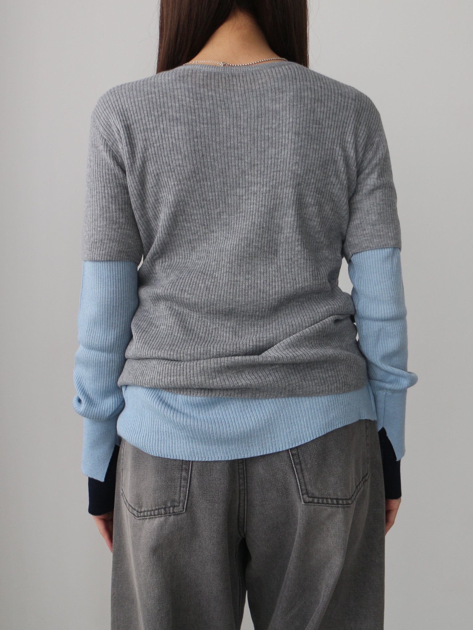 袖口にはスリットと配色仕様を入れる事でさりげない抜け感をプラス。