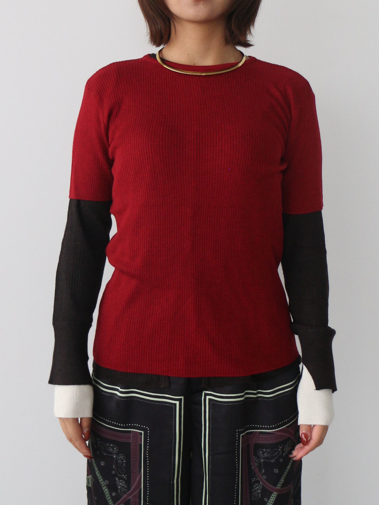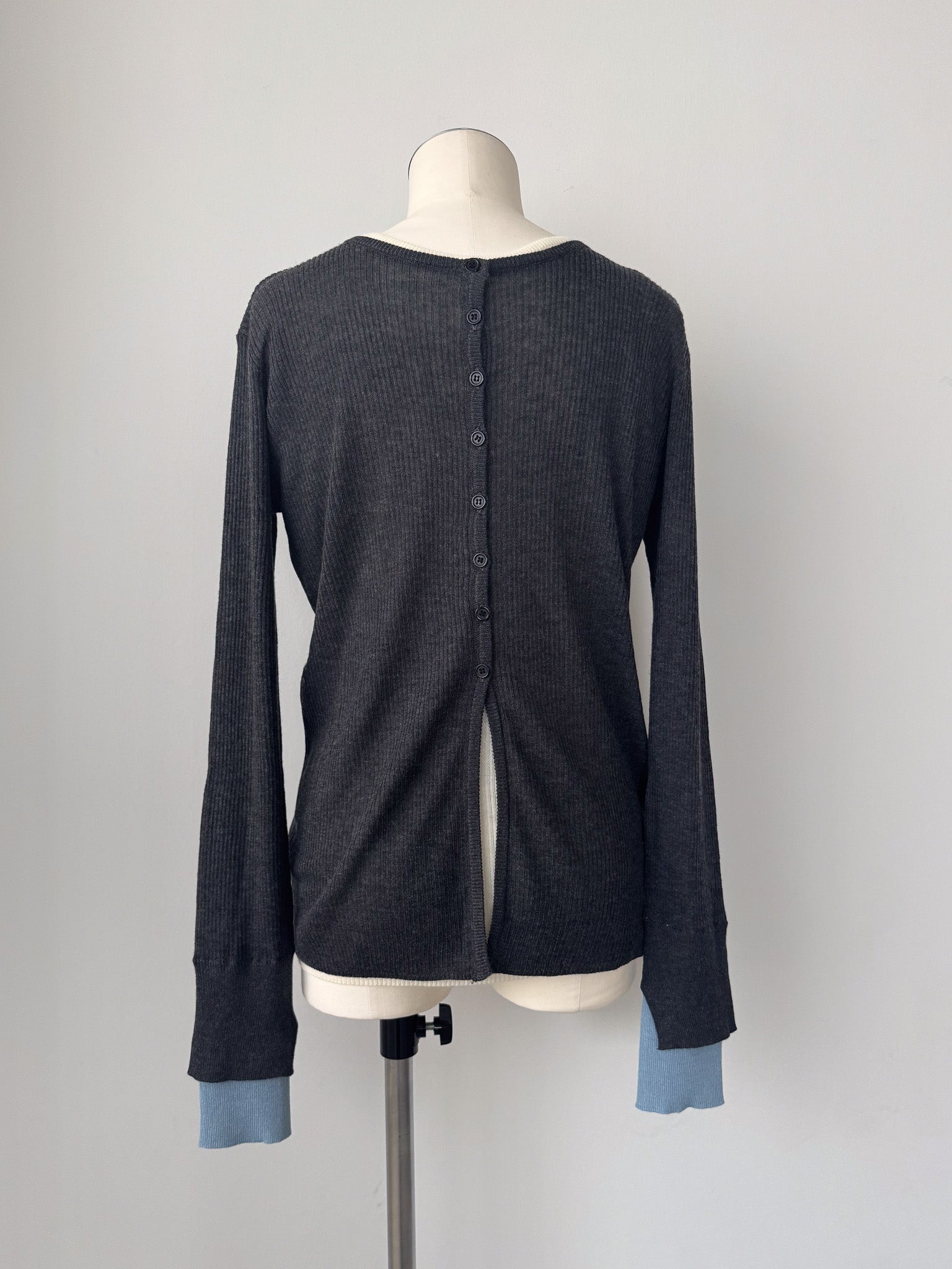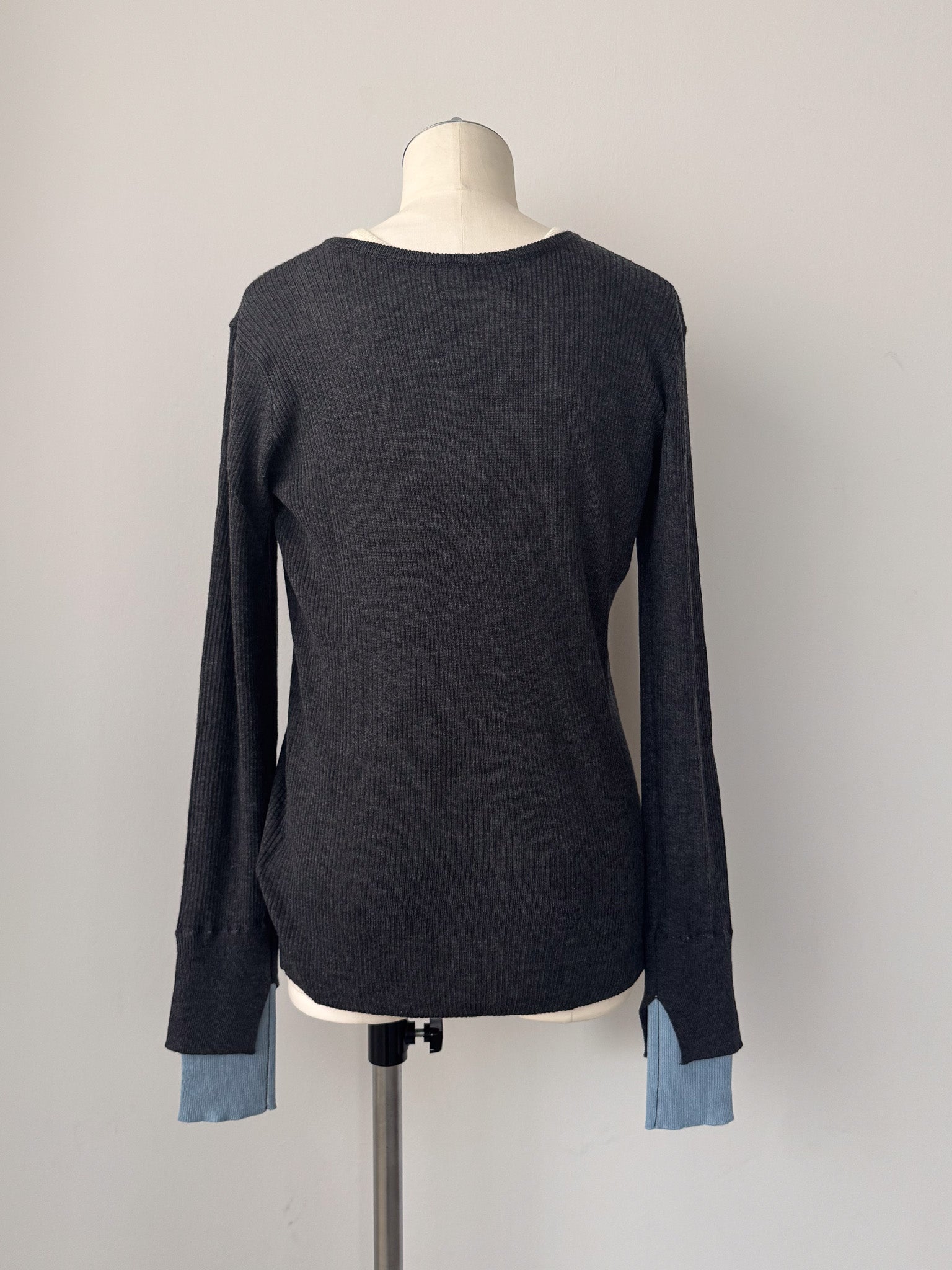 袖口にはスリットと配色仕様を入れる事でさりげない抜け感をプラス。