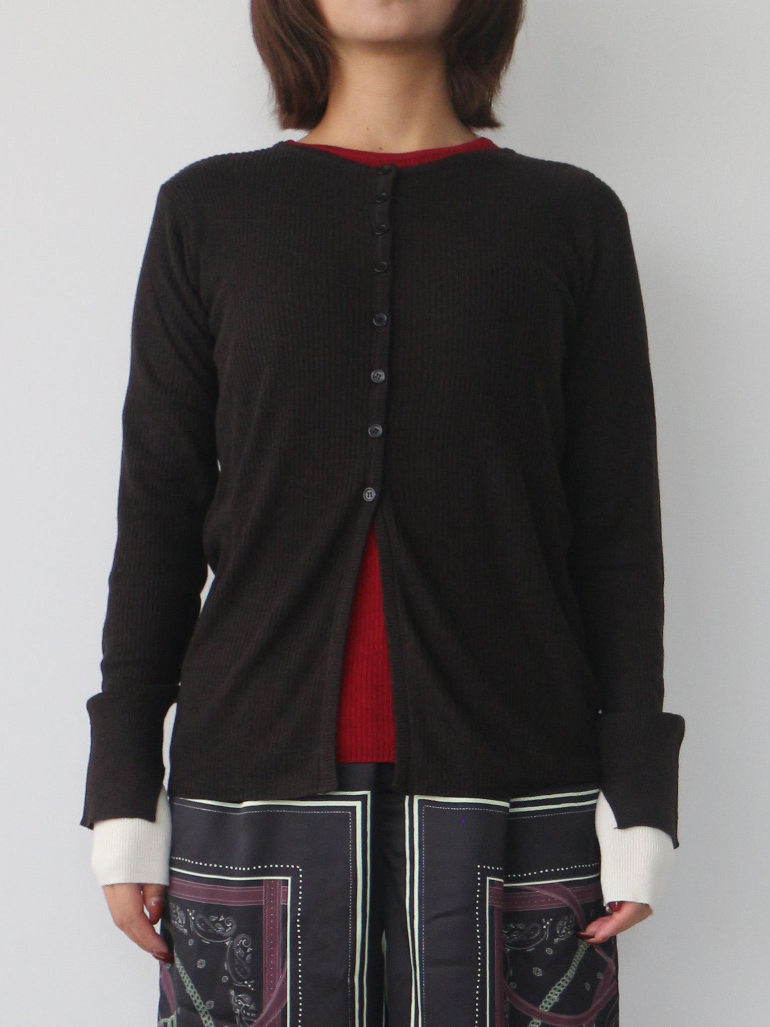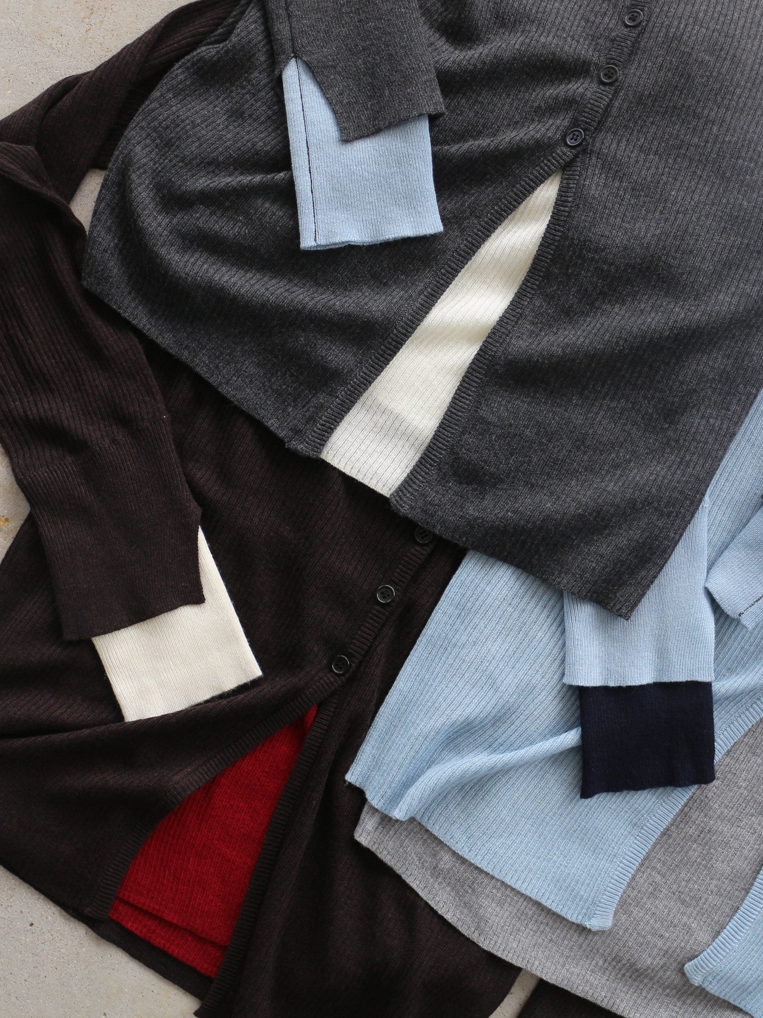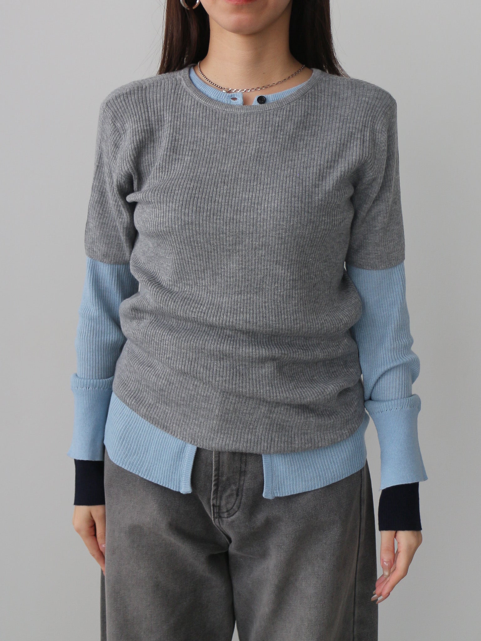 カーディガンとプルオーバーのレイヤードセットのニットトップス。