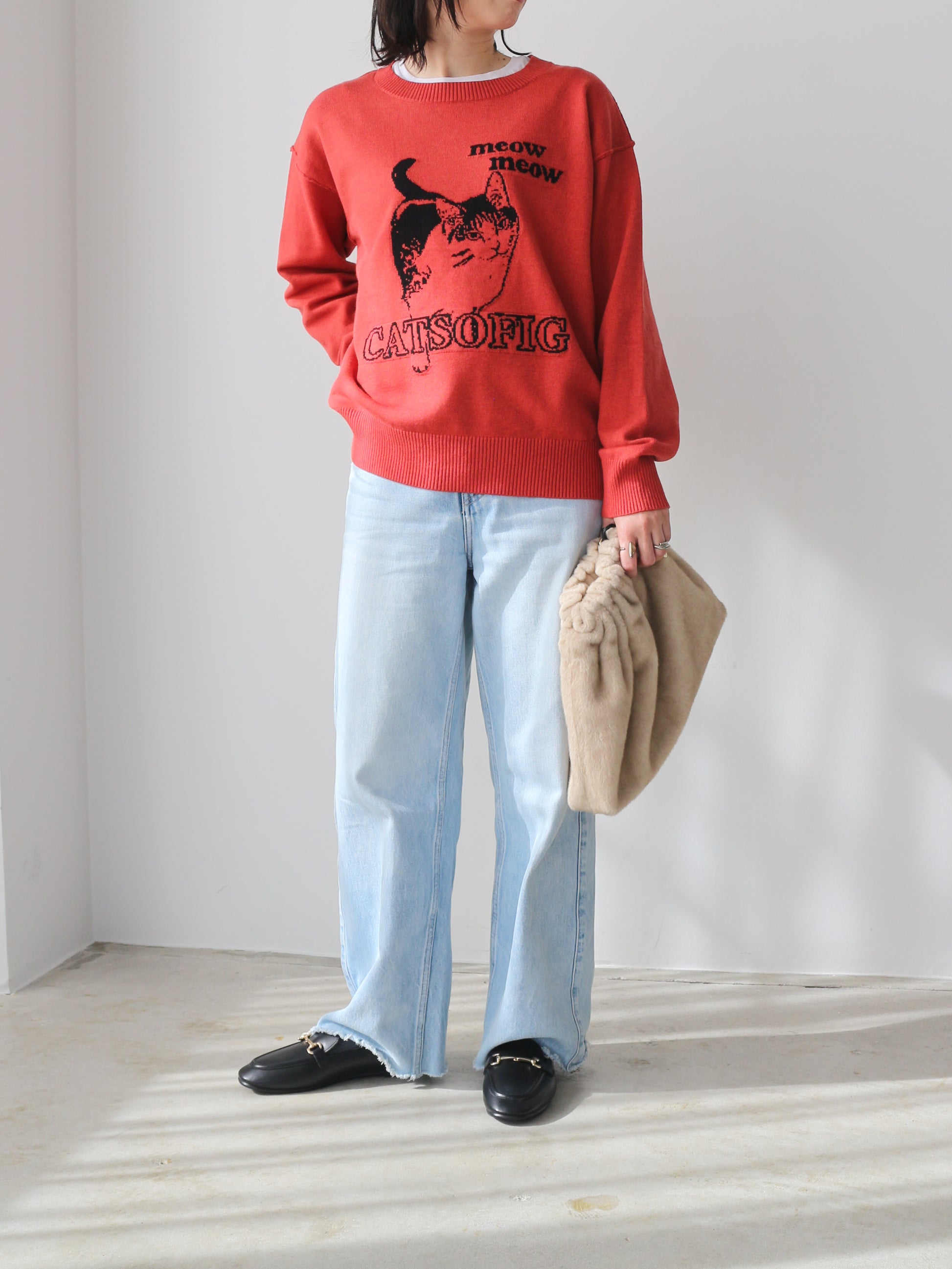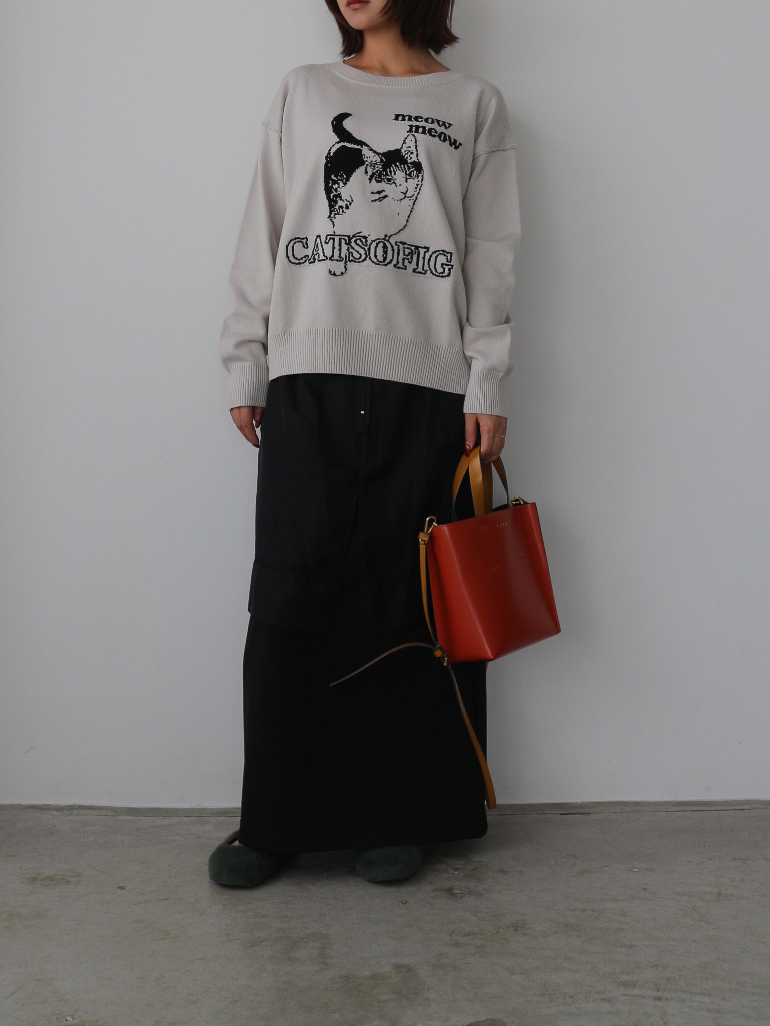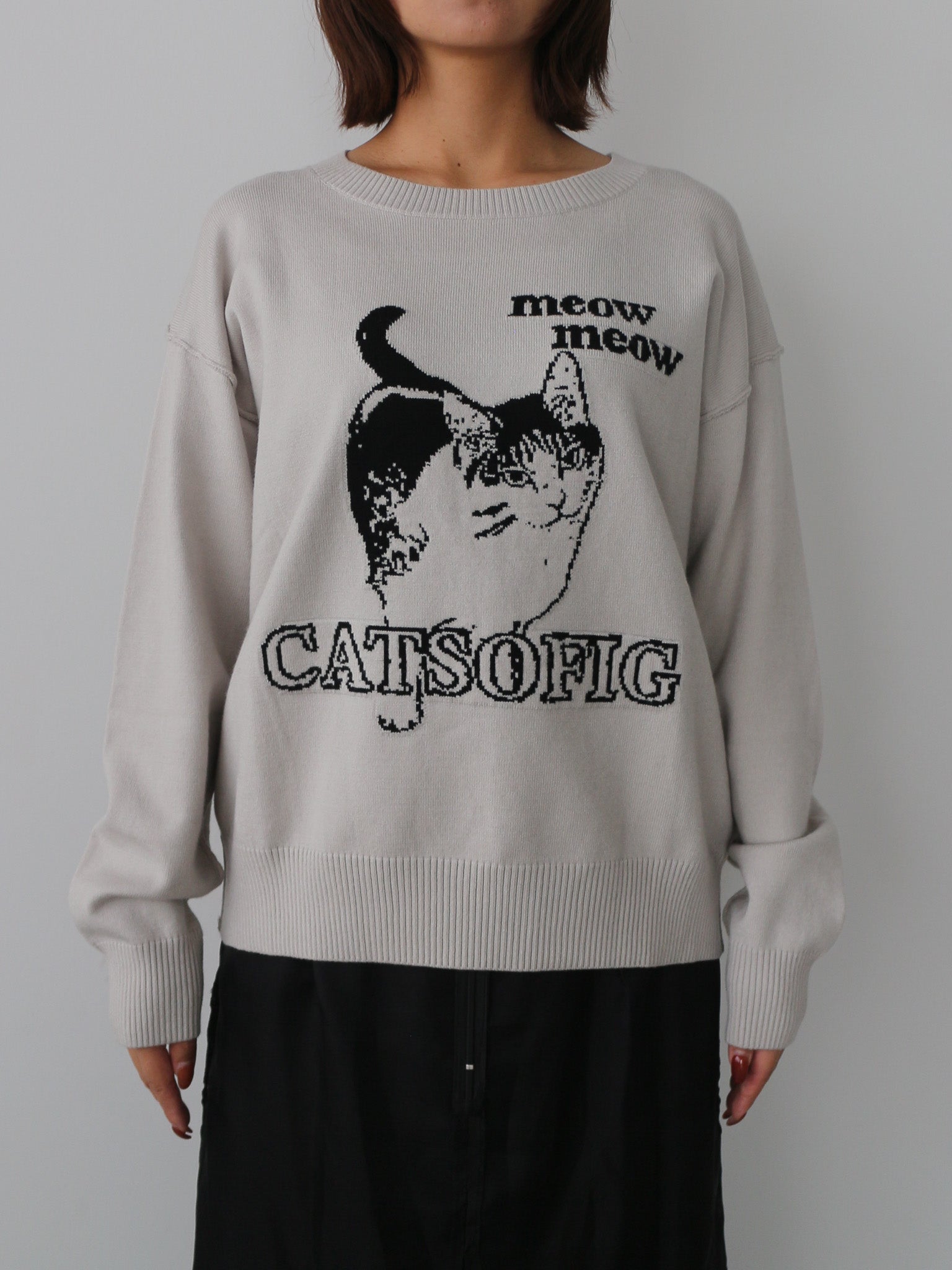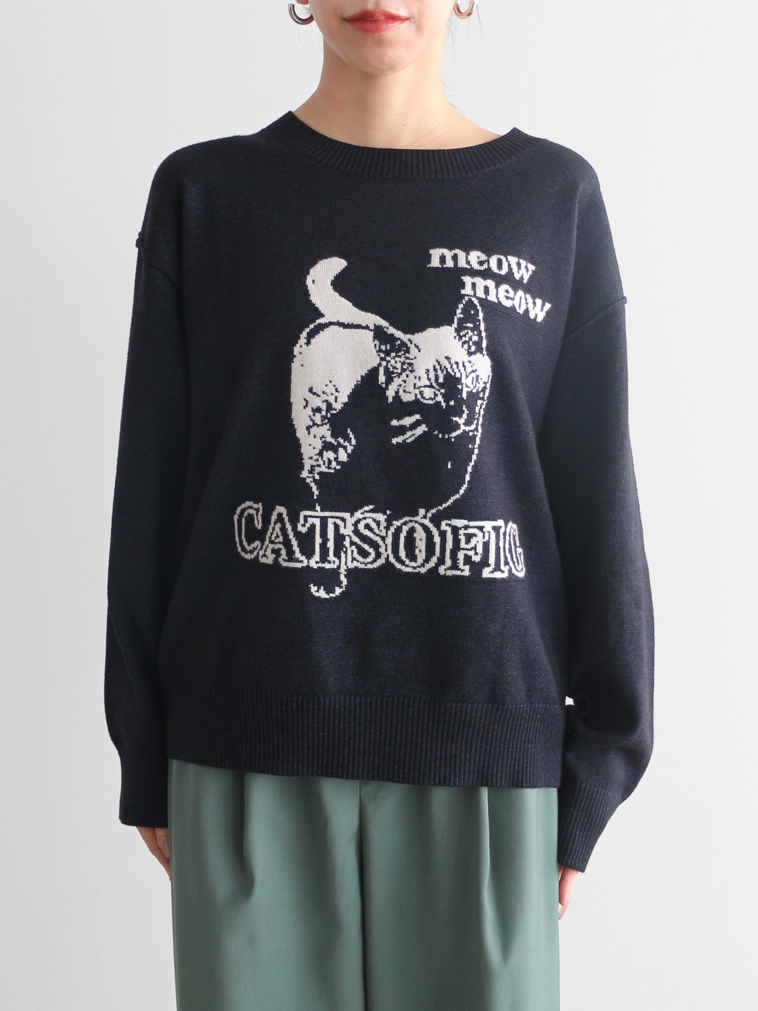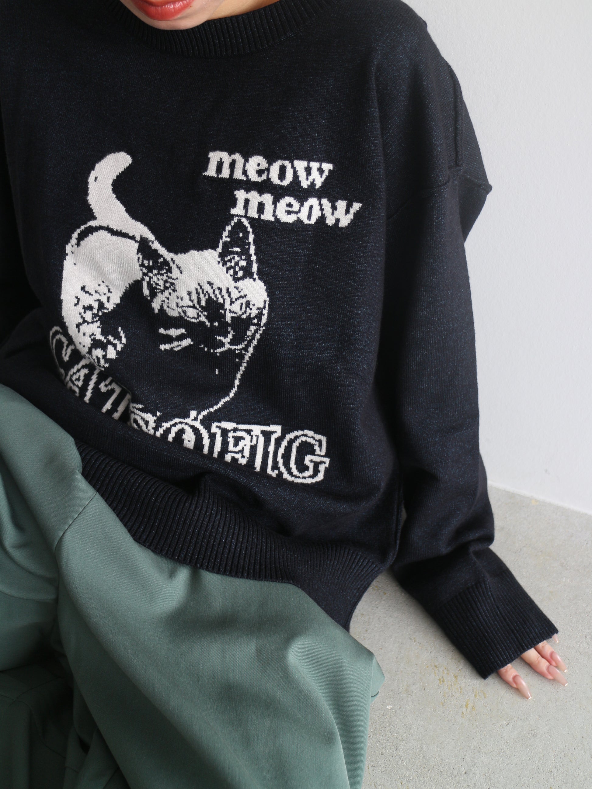 Pqranオリジナルのネコ柄を施した、1枚でスタイリングが決まる大人のデザインニット。