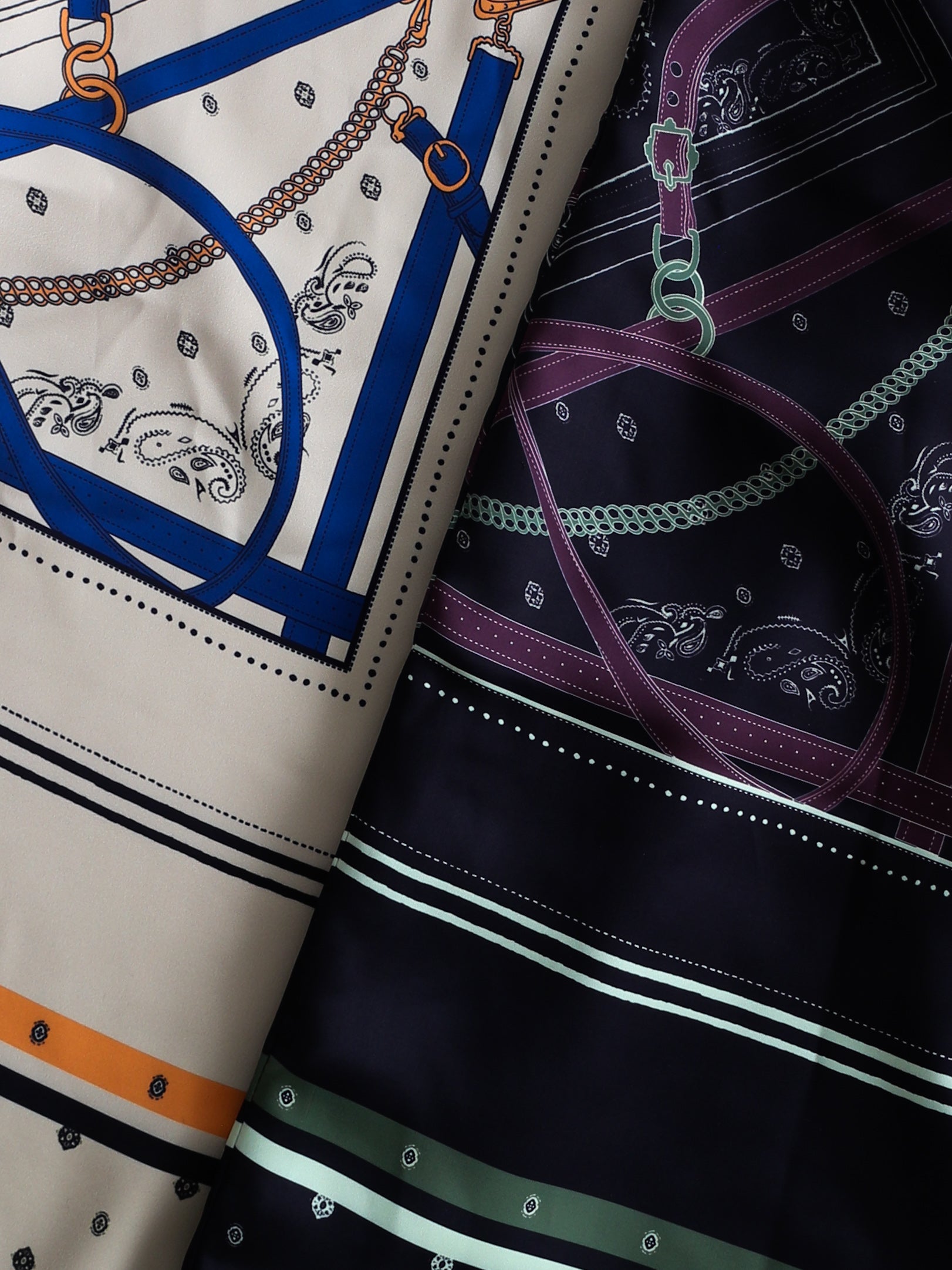シックな色使いスカーフ柄を艶のある中肉サテンに施したオリジナリティのあるシリーズです。
