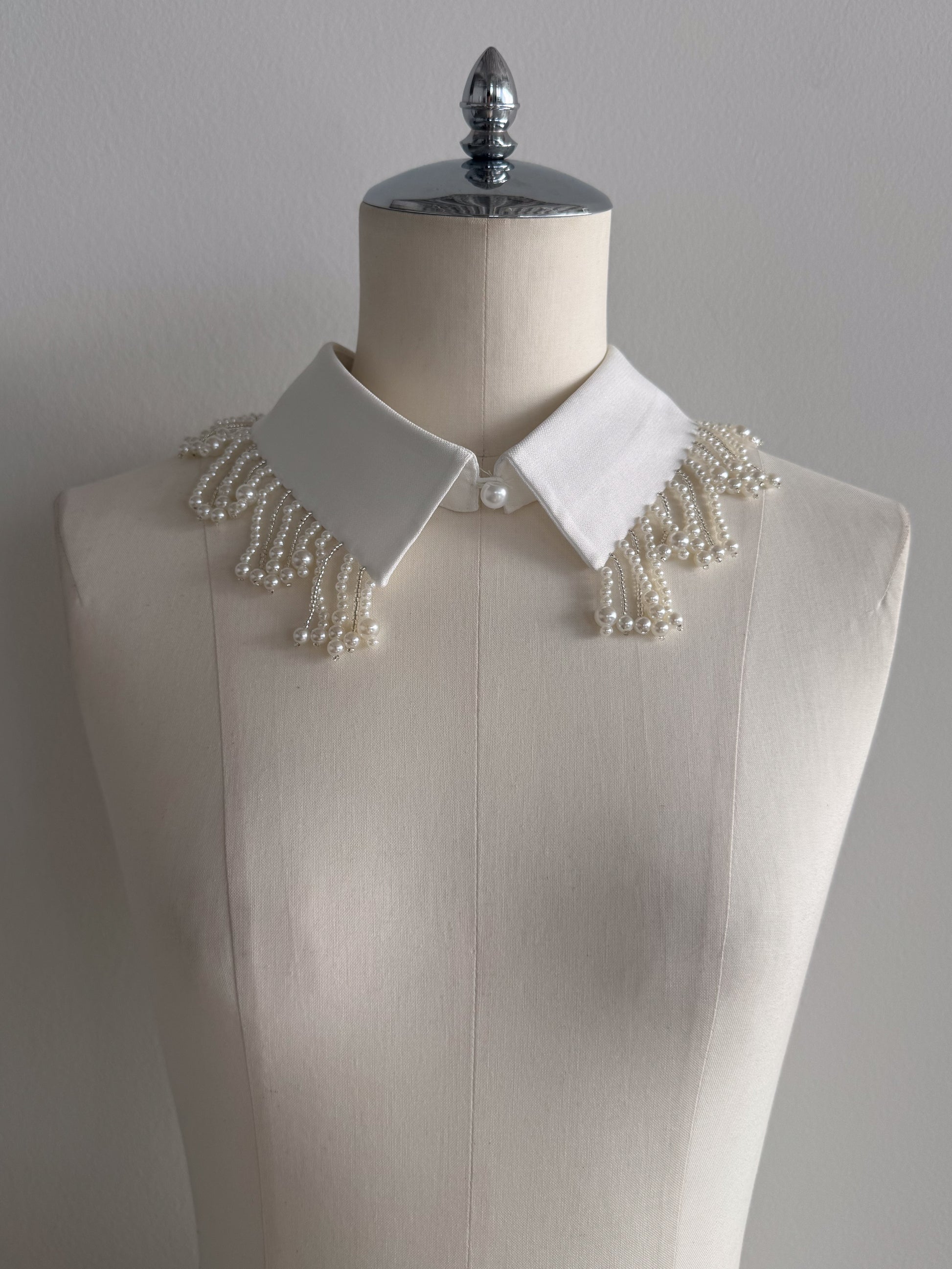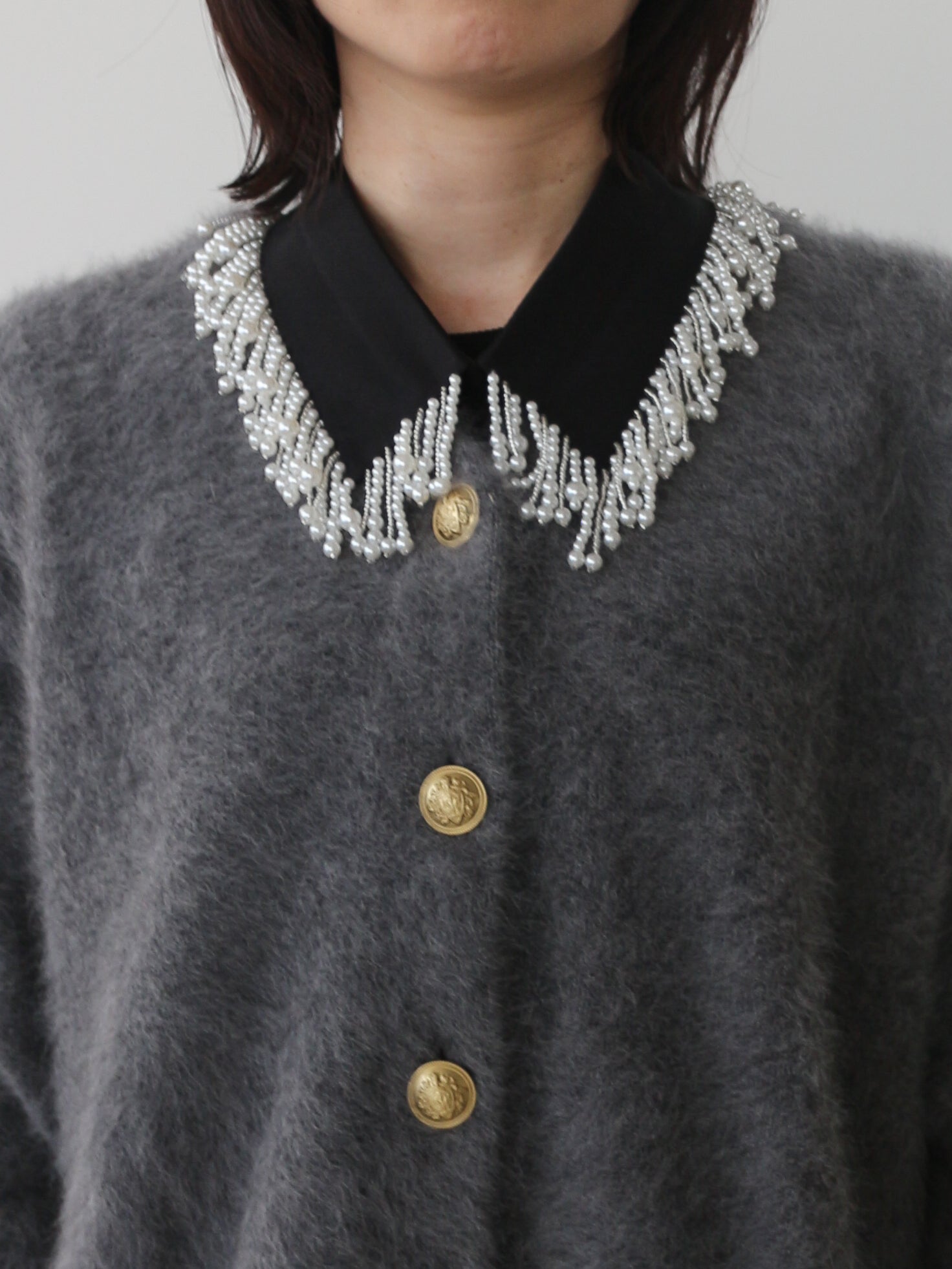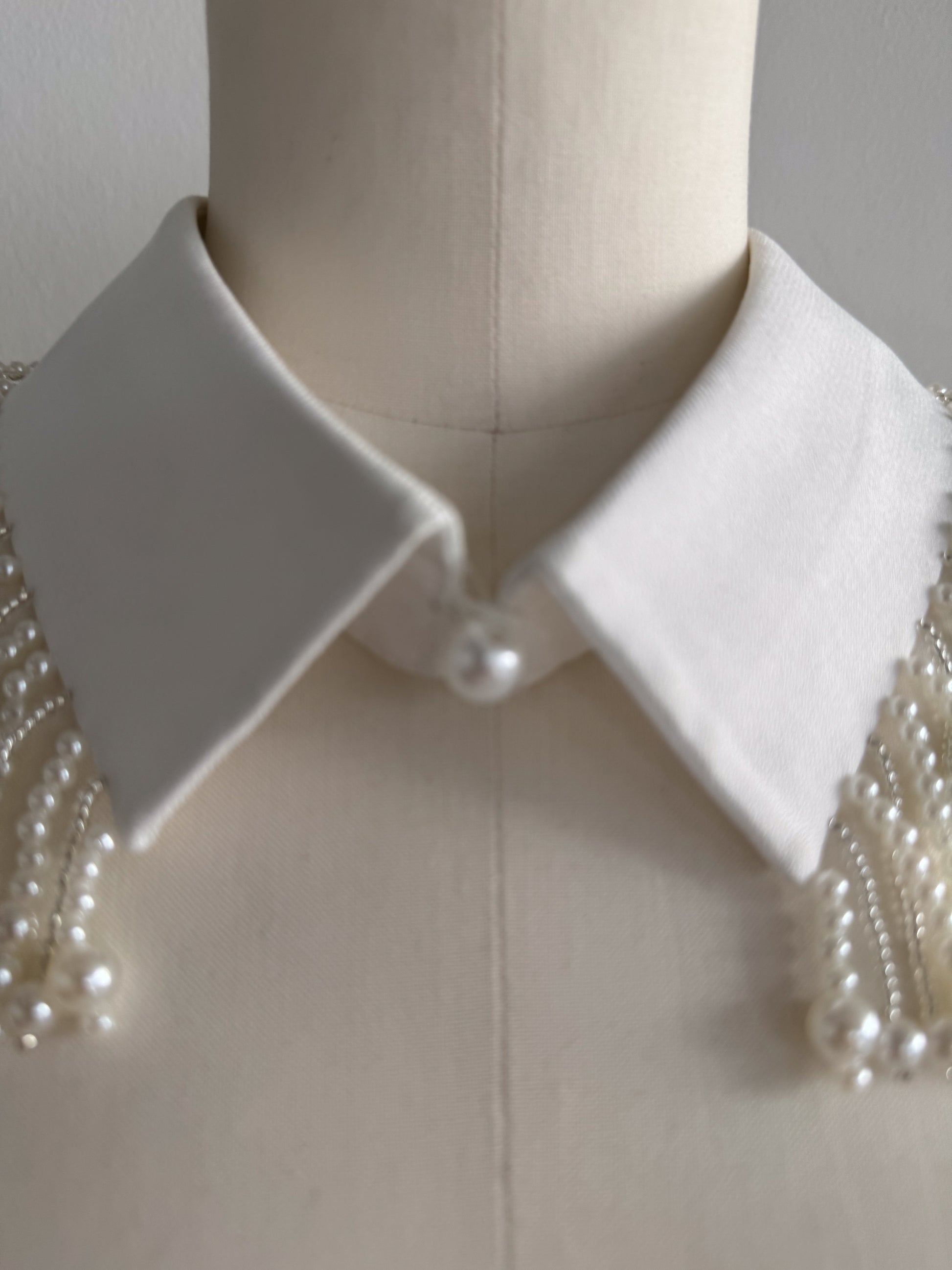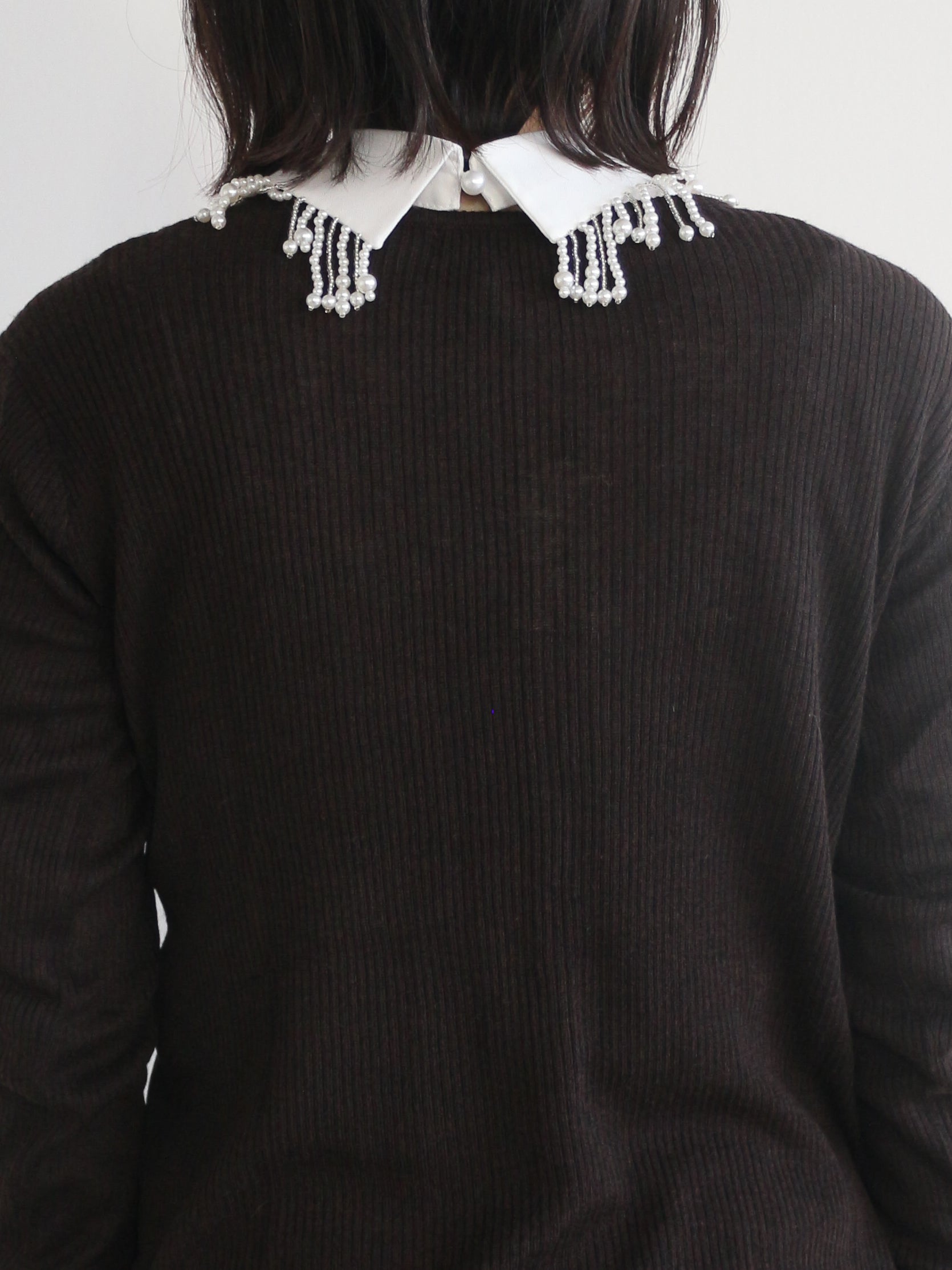 首元にあしらわれたパールが、顔周りを明るく見せるデザイン。