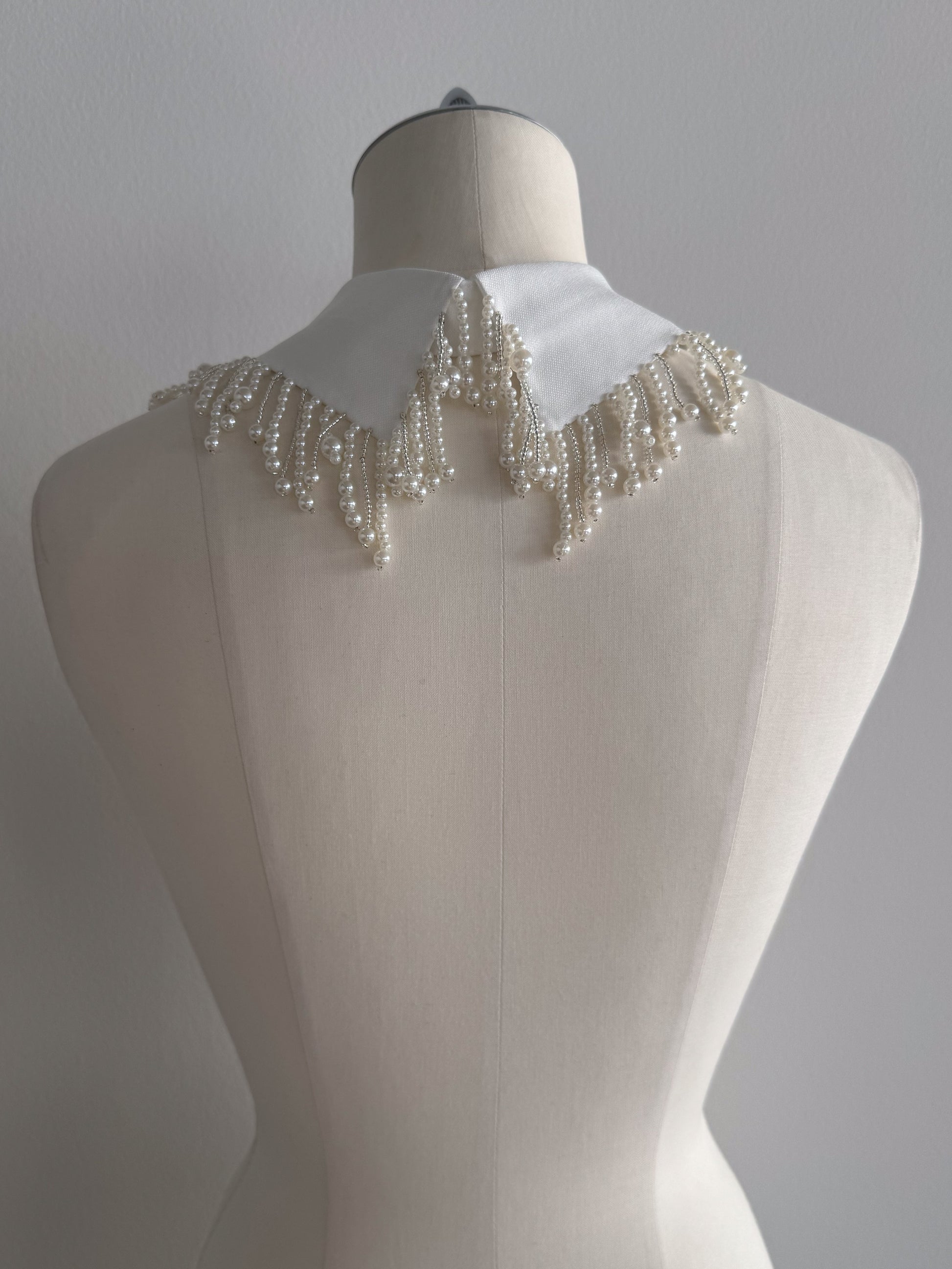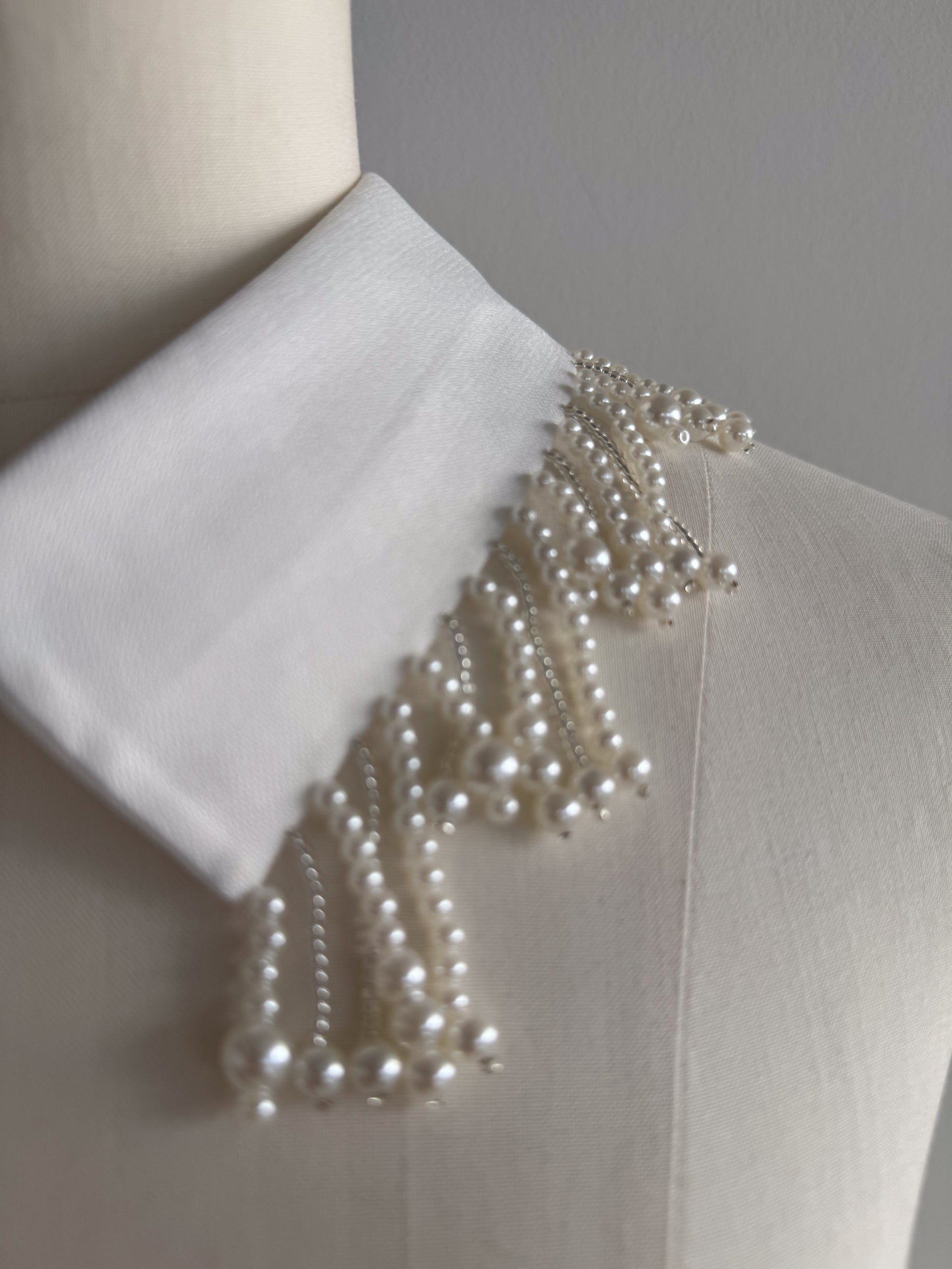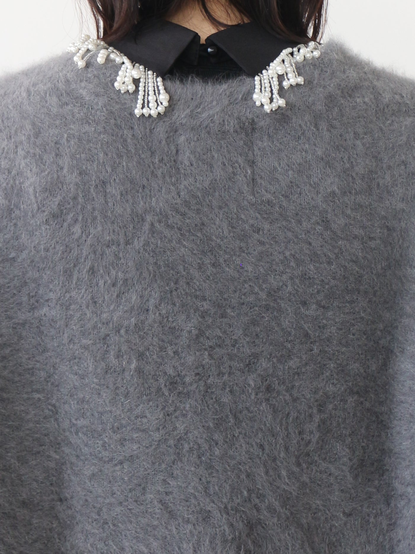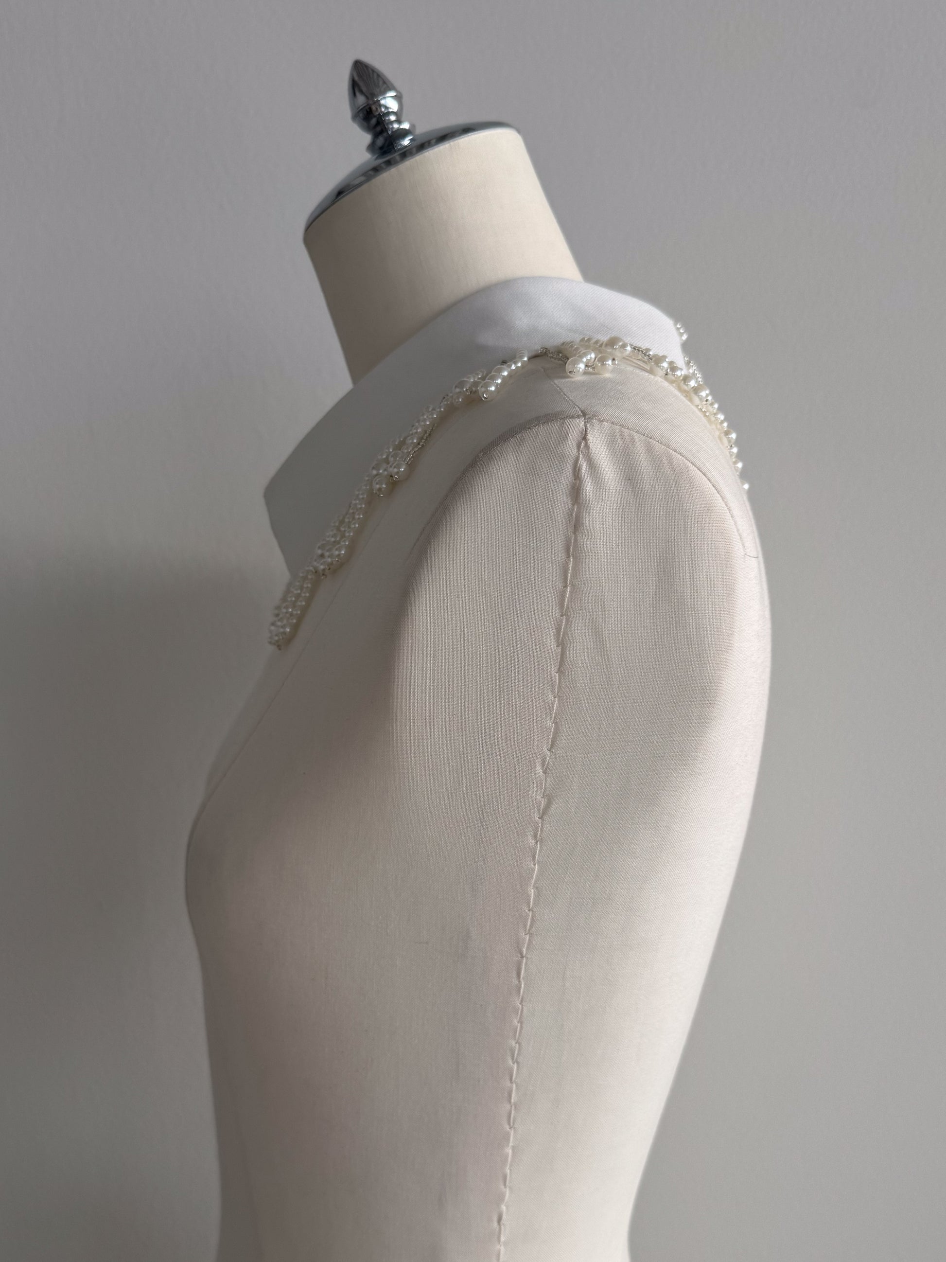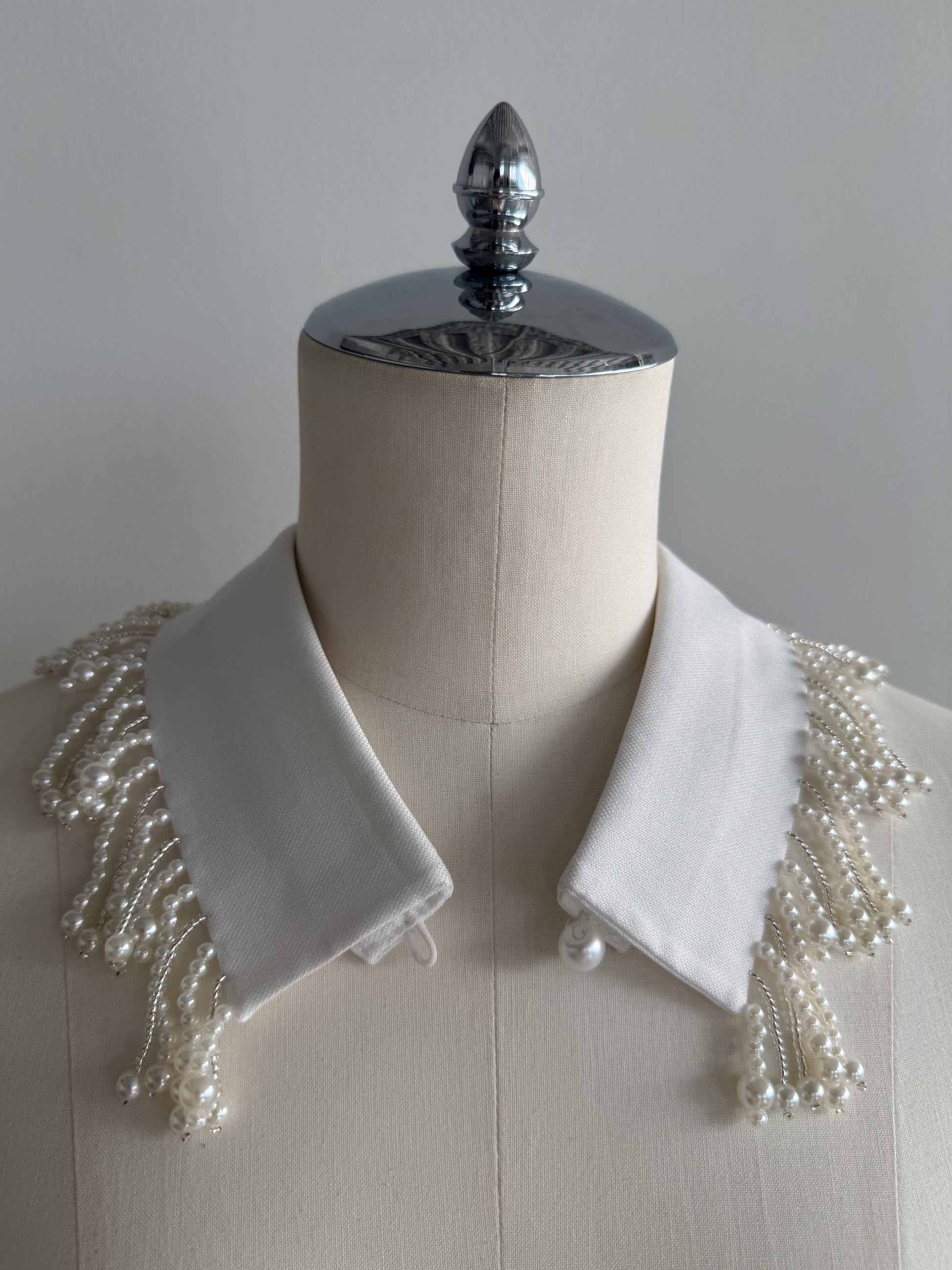 首元にあしらわれたパールが、顔周りを明るく見せるデザイン。