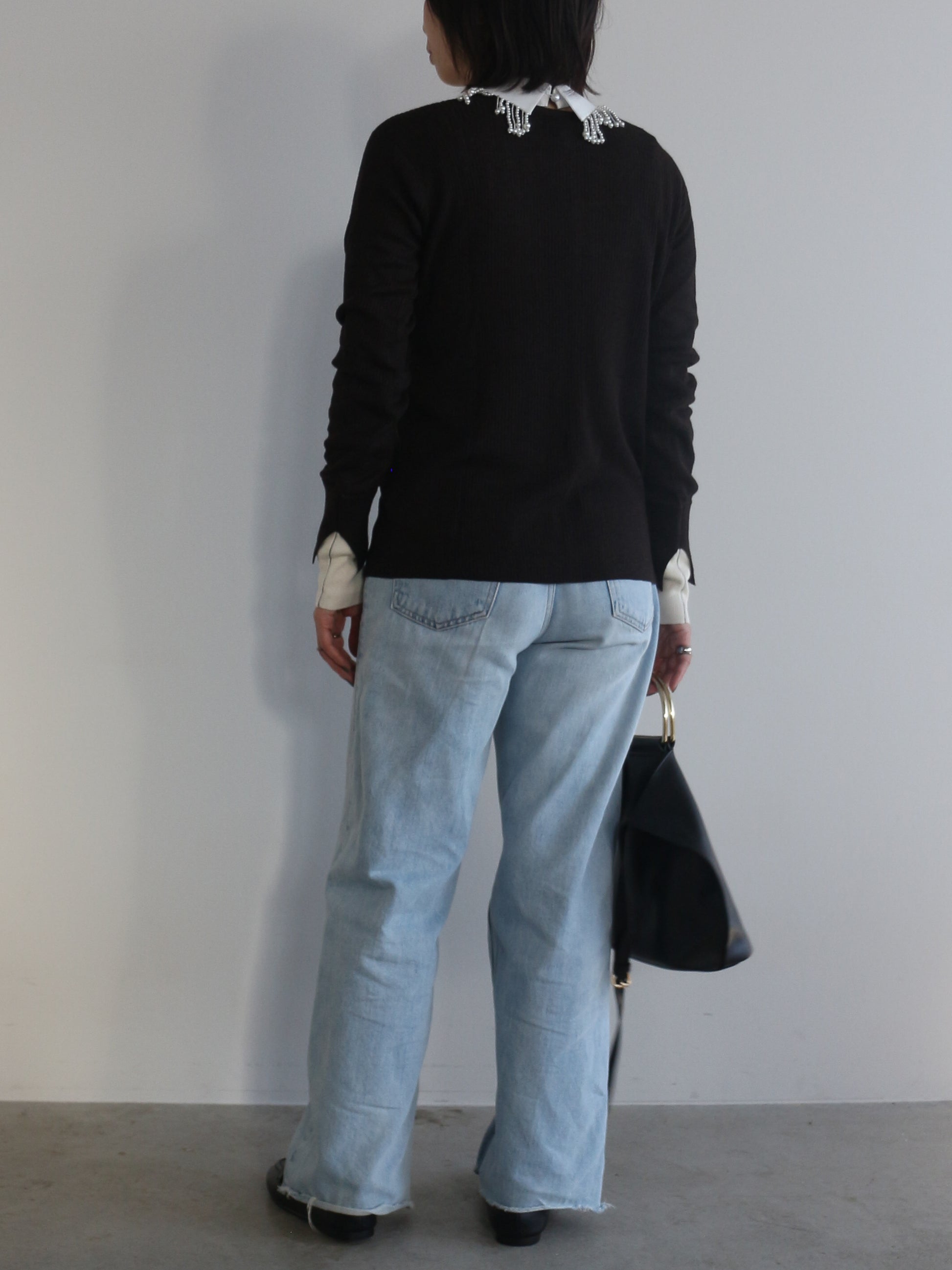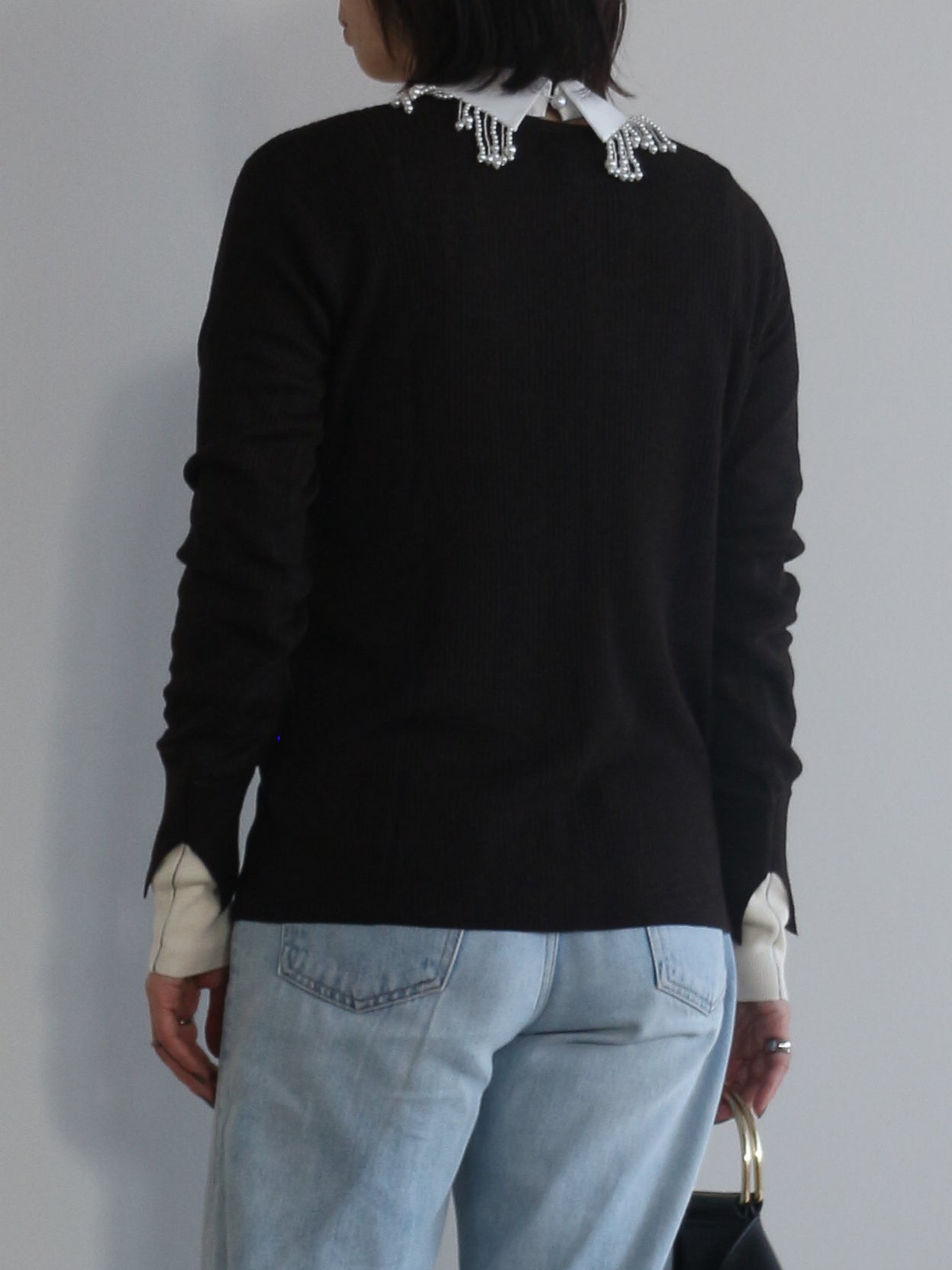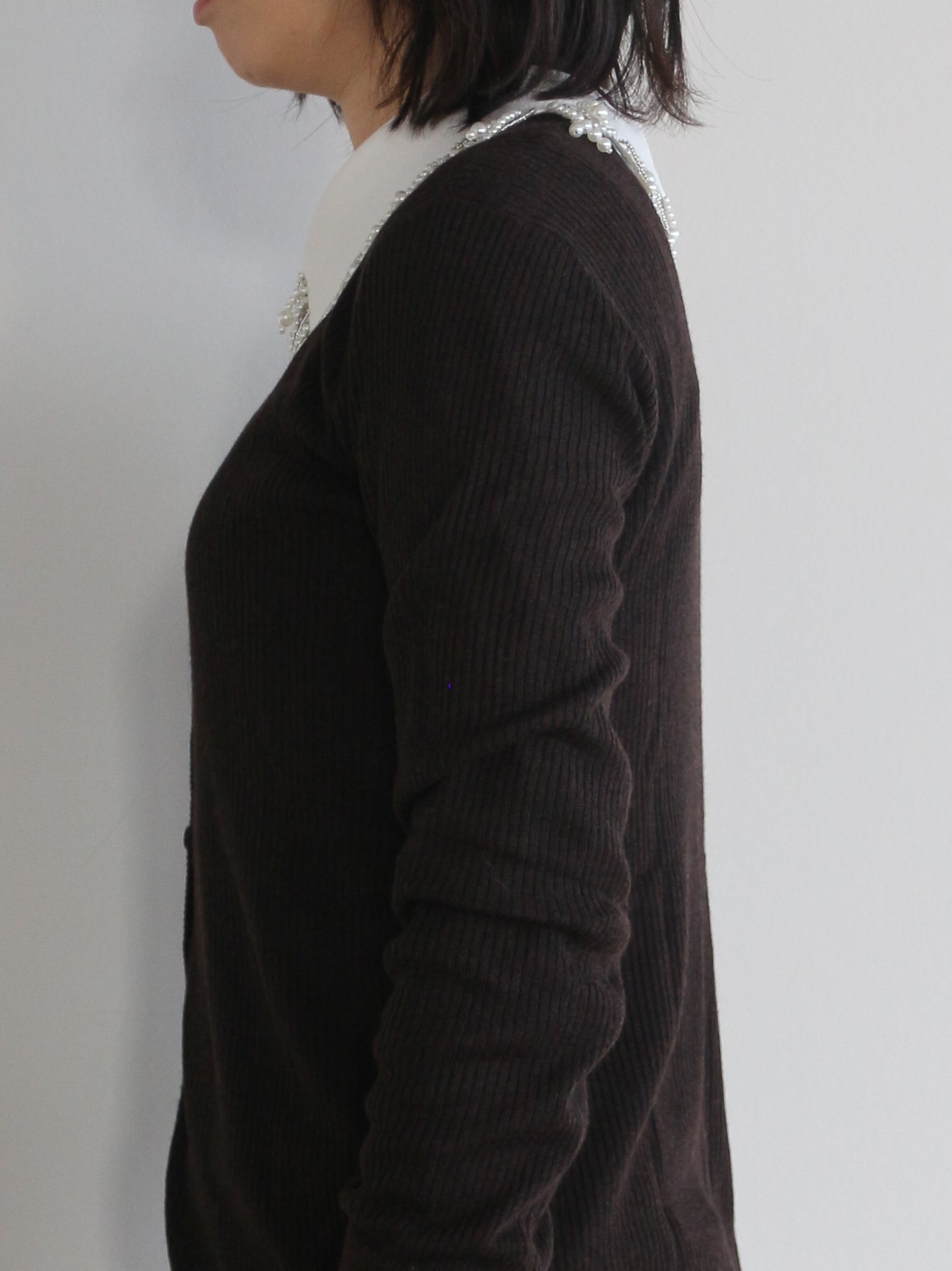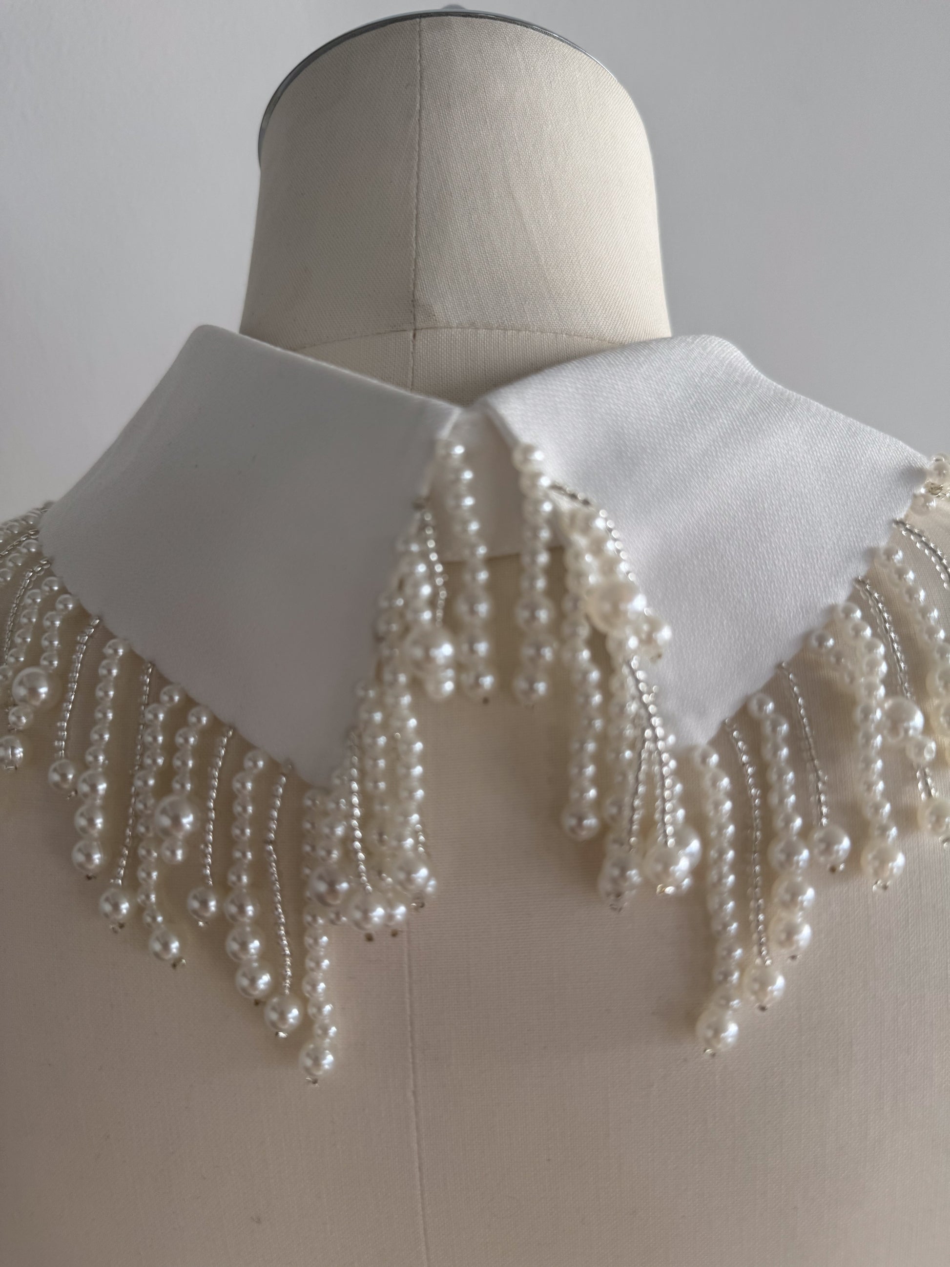 首元にあしらわれたパールが、顔周りを明るく見せるデザイン。