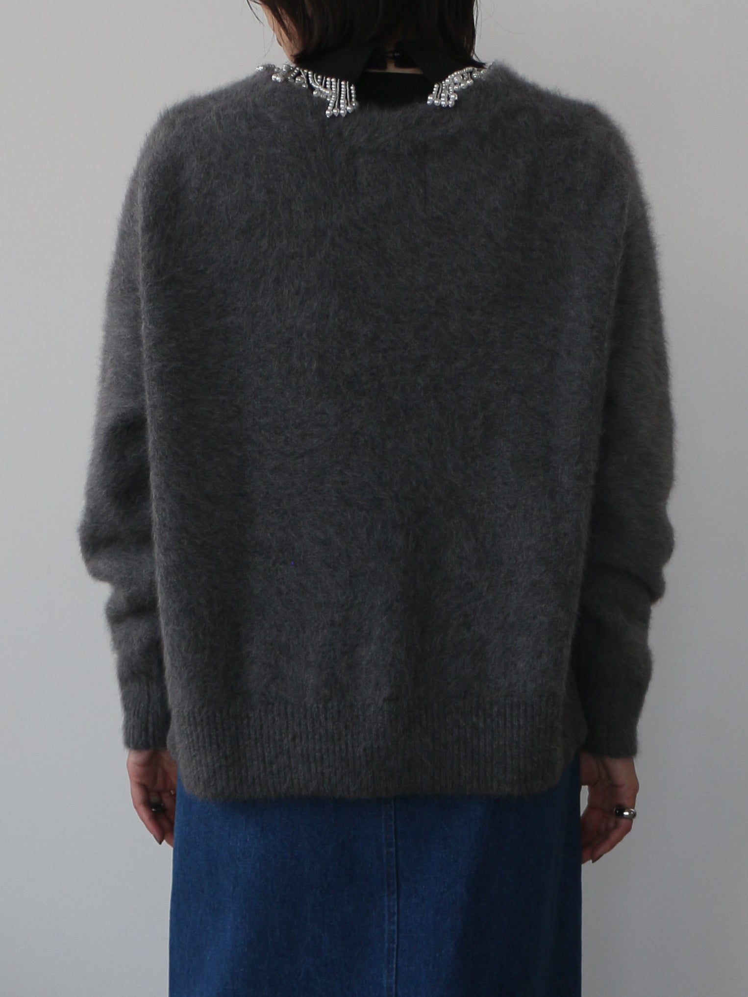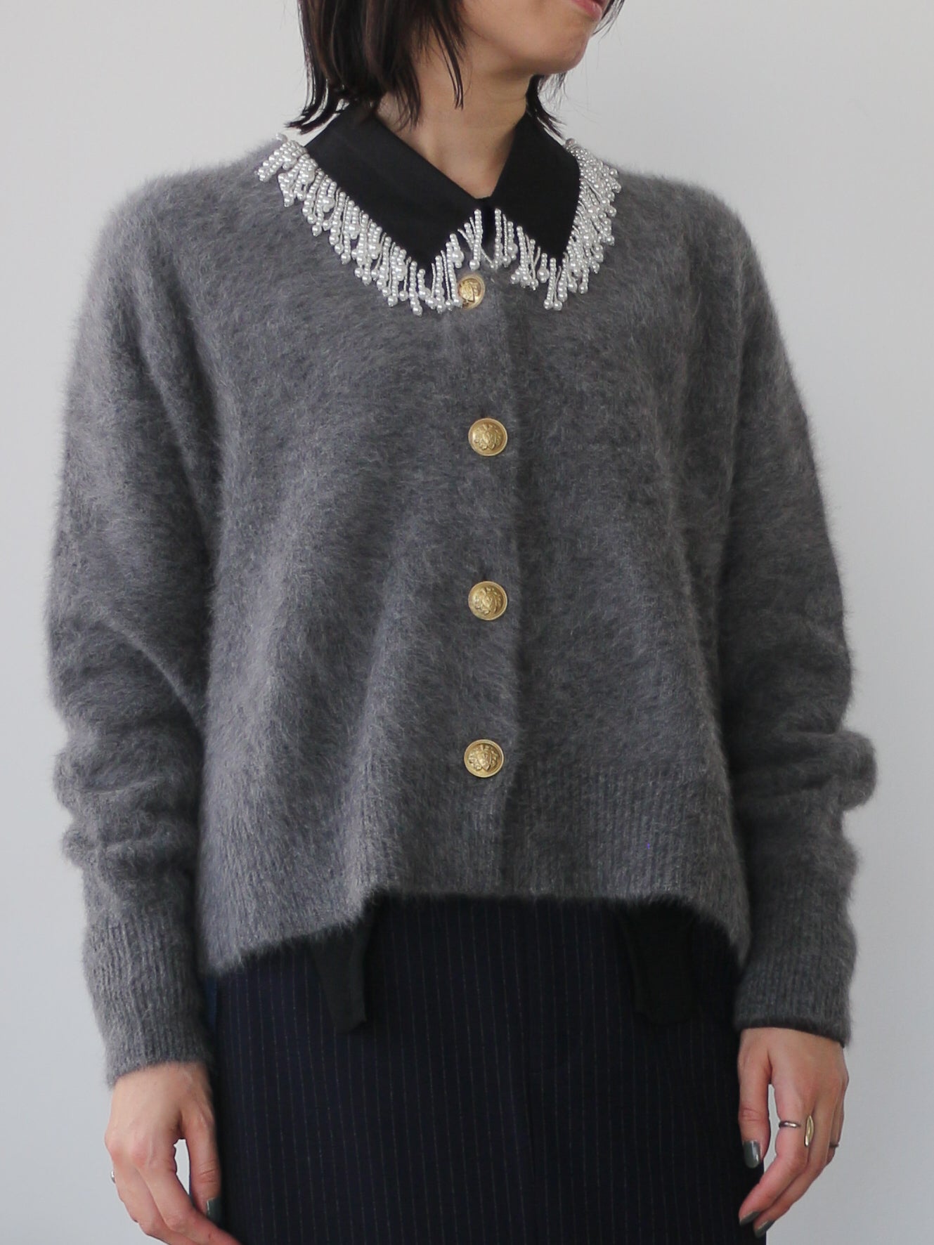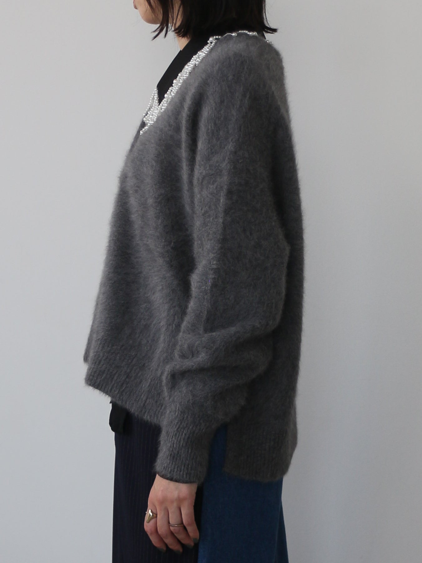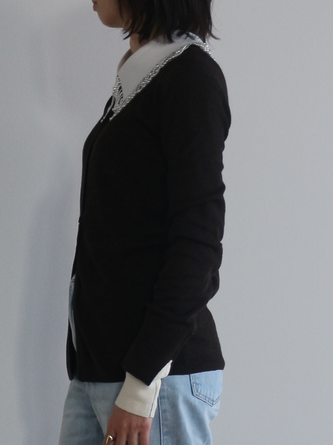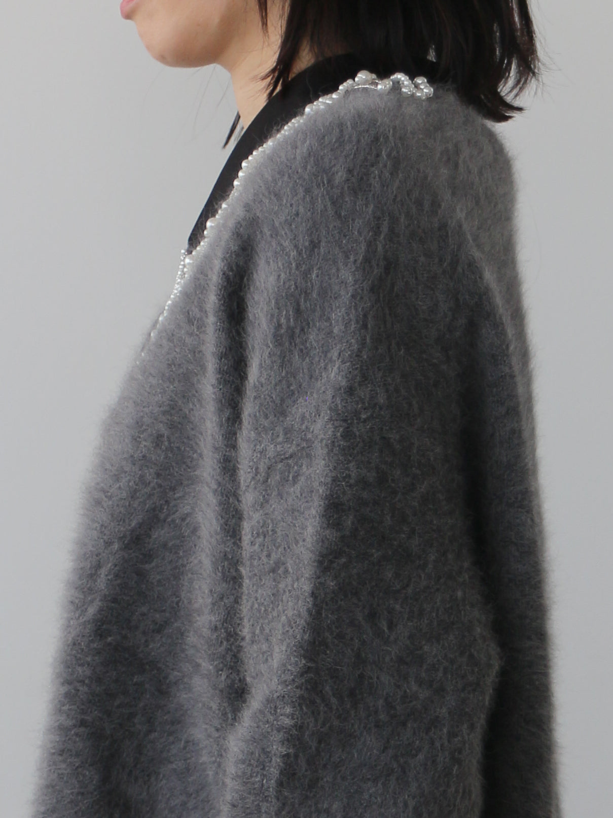 首元にあしらわれたパールが、顔周りを明るく見せるデザイン。