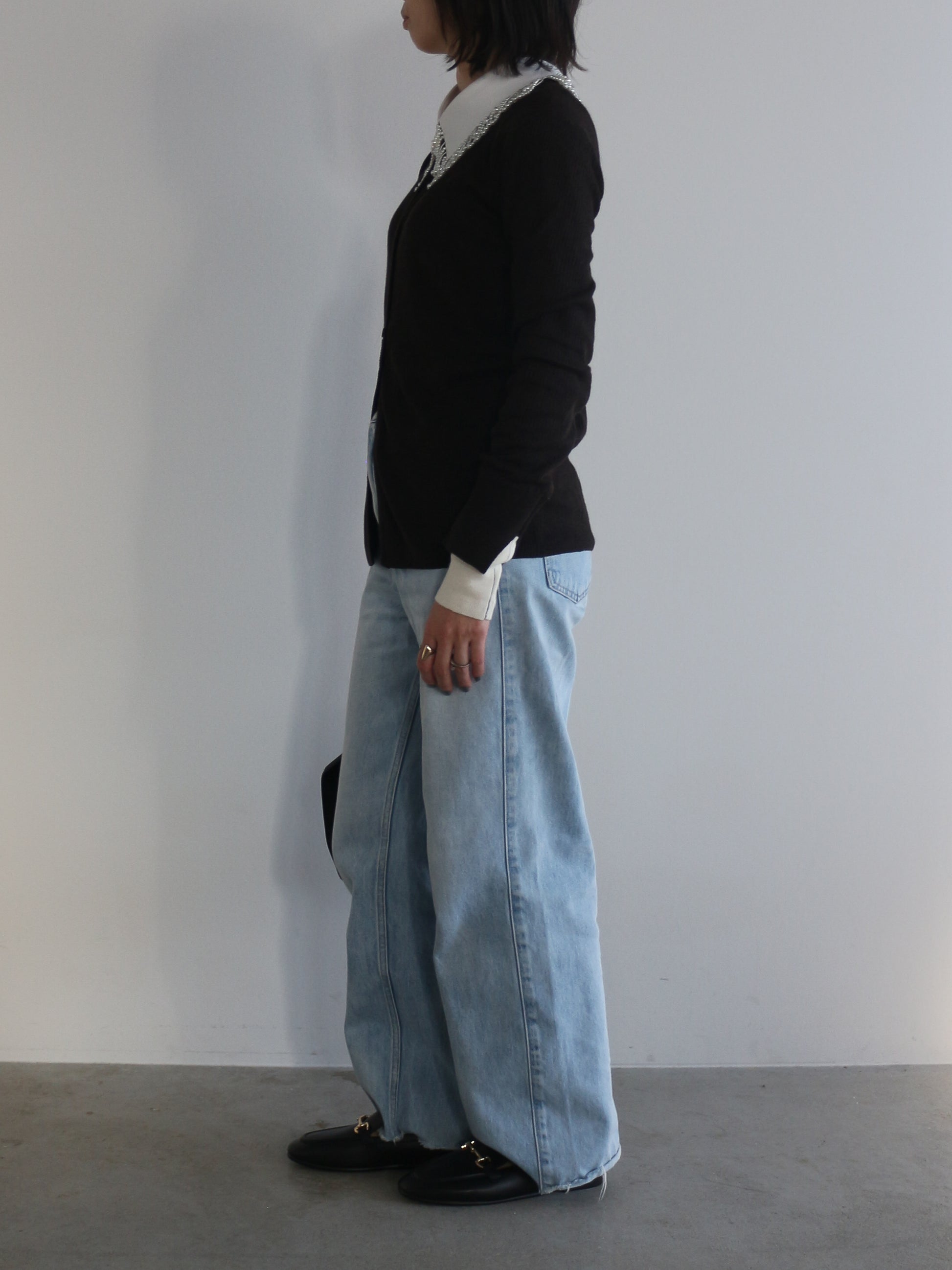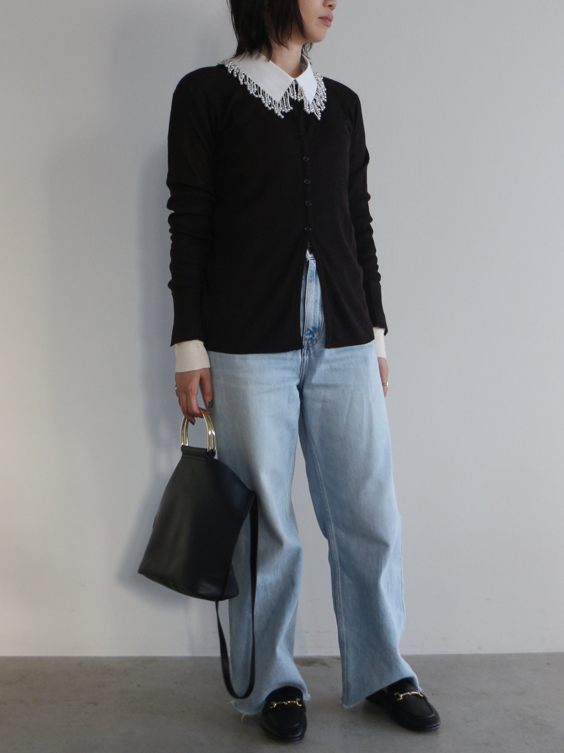 シンプルなTシャツやスウェットにプラスするだけで、ほどよく上品で大人かわいい雰囲気に。