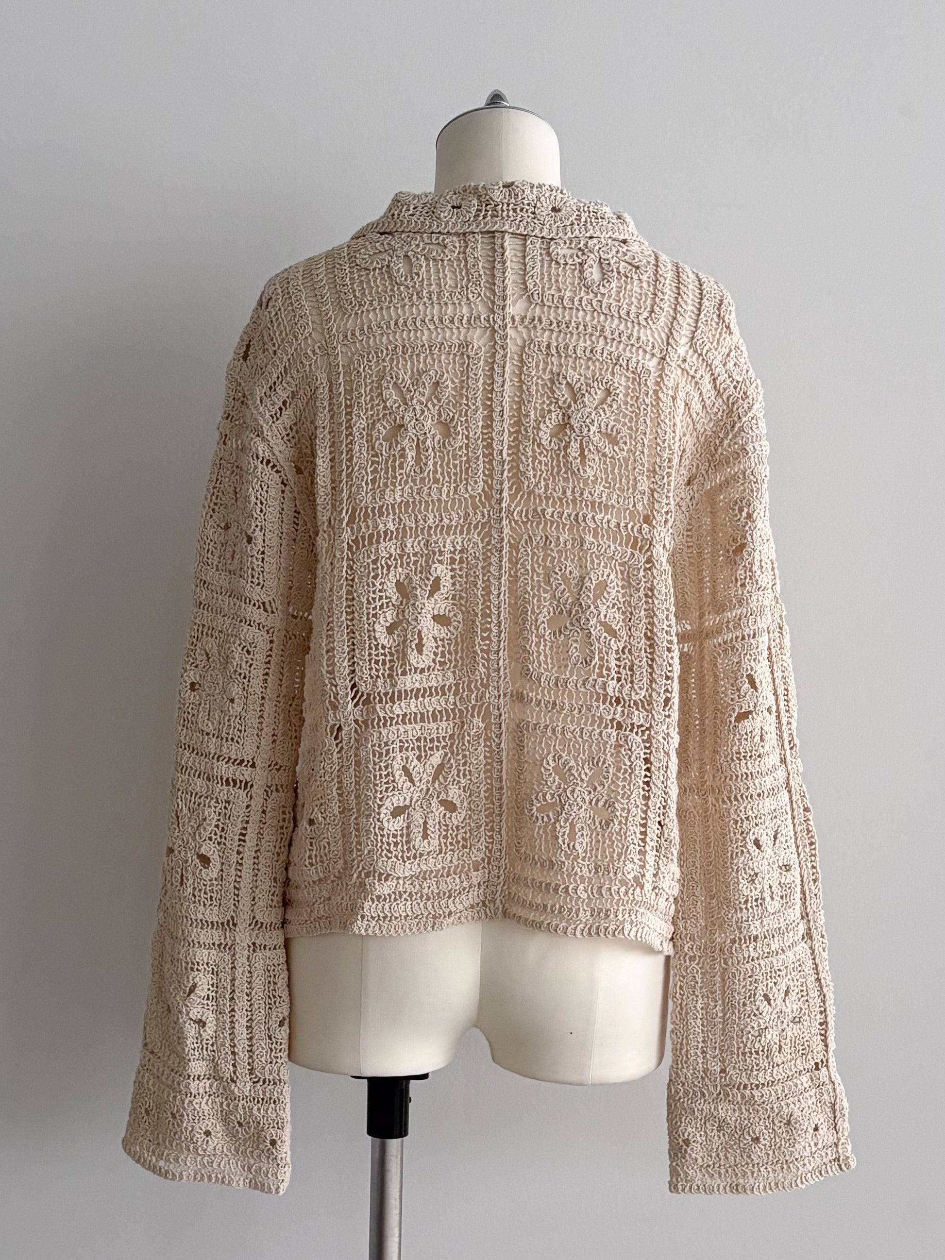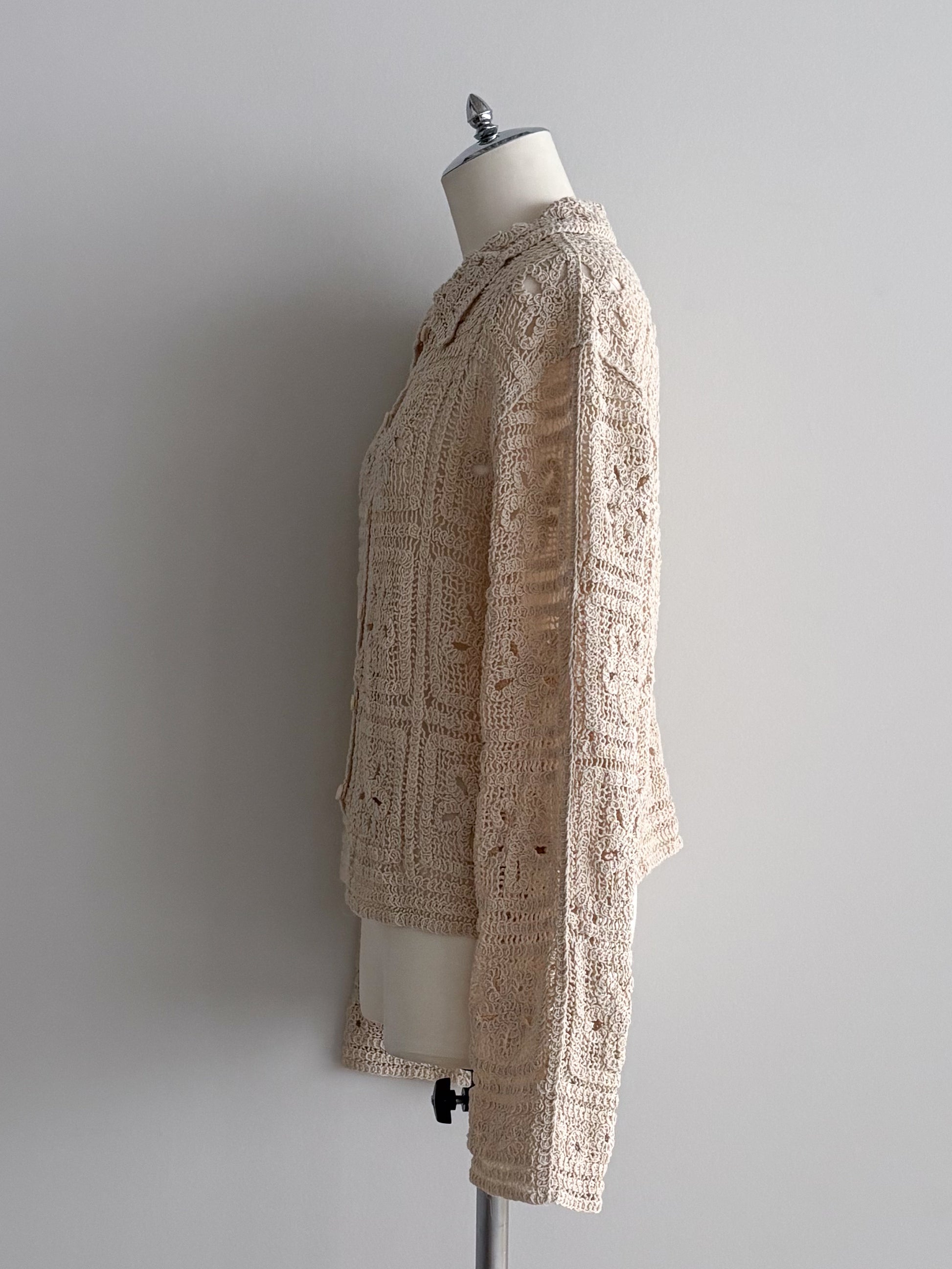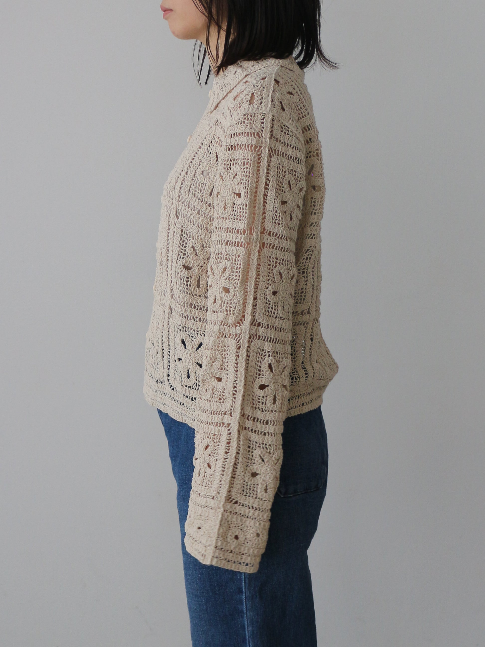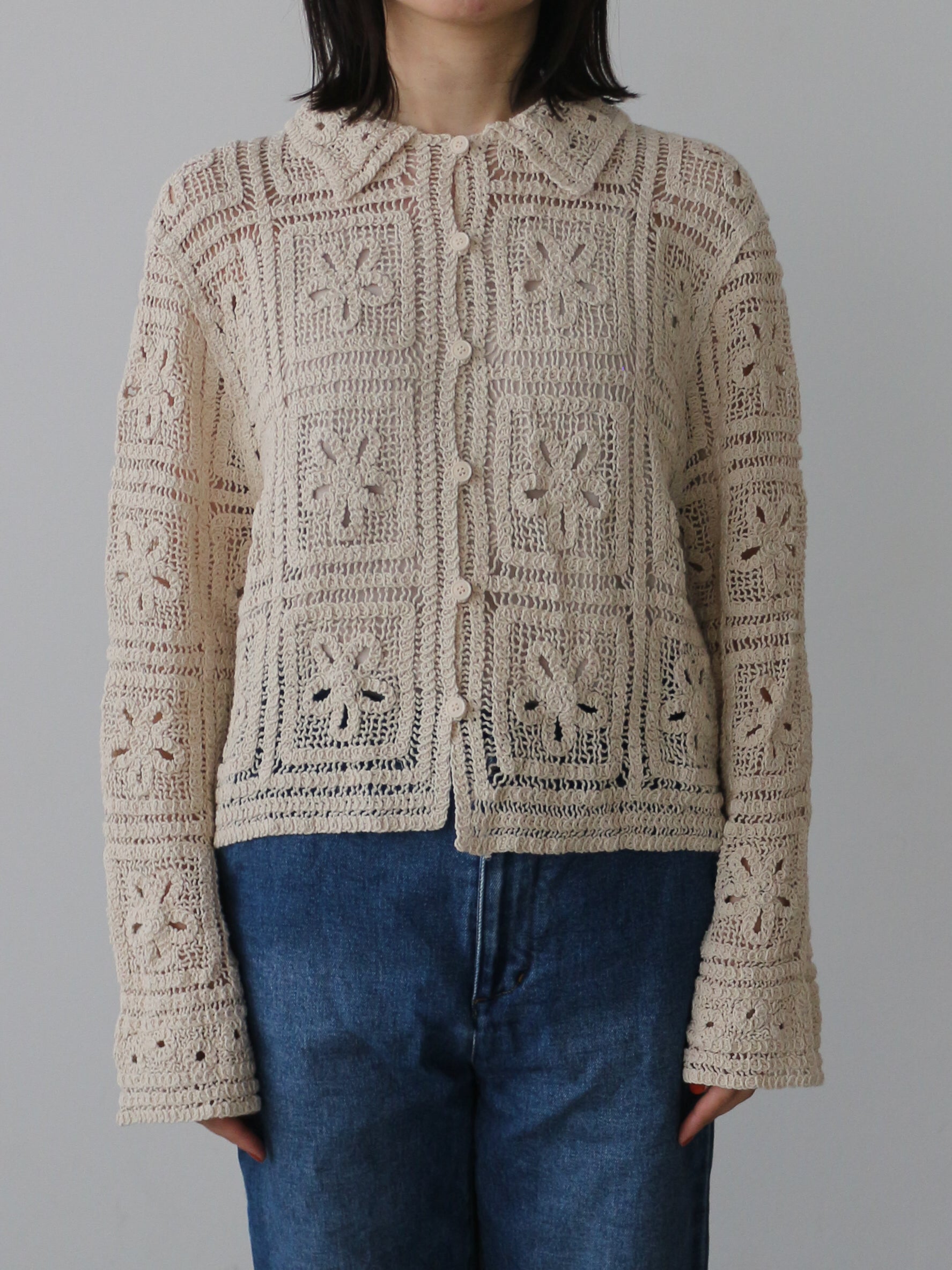 立体感のあるコードレースを用いた、カギ編み仕様の衿付きカーディガン。