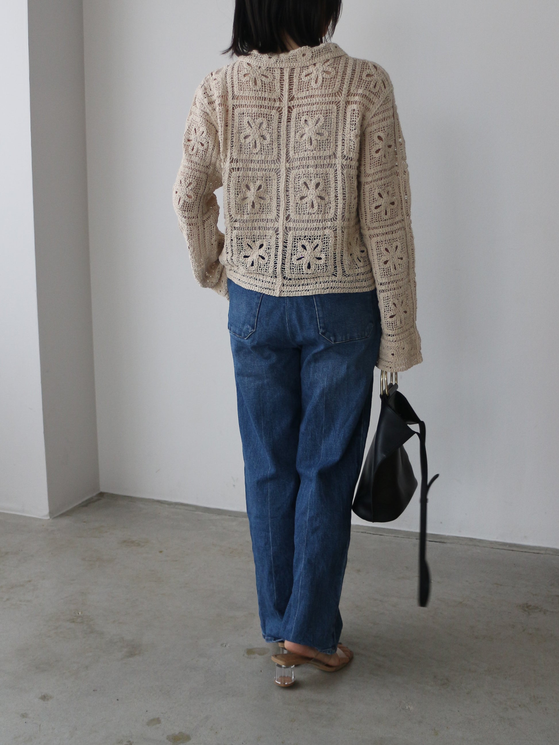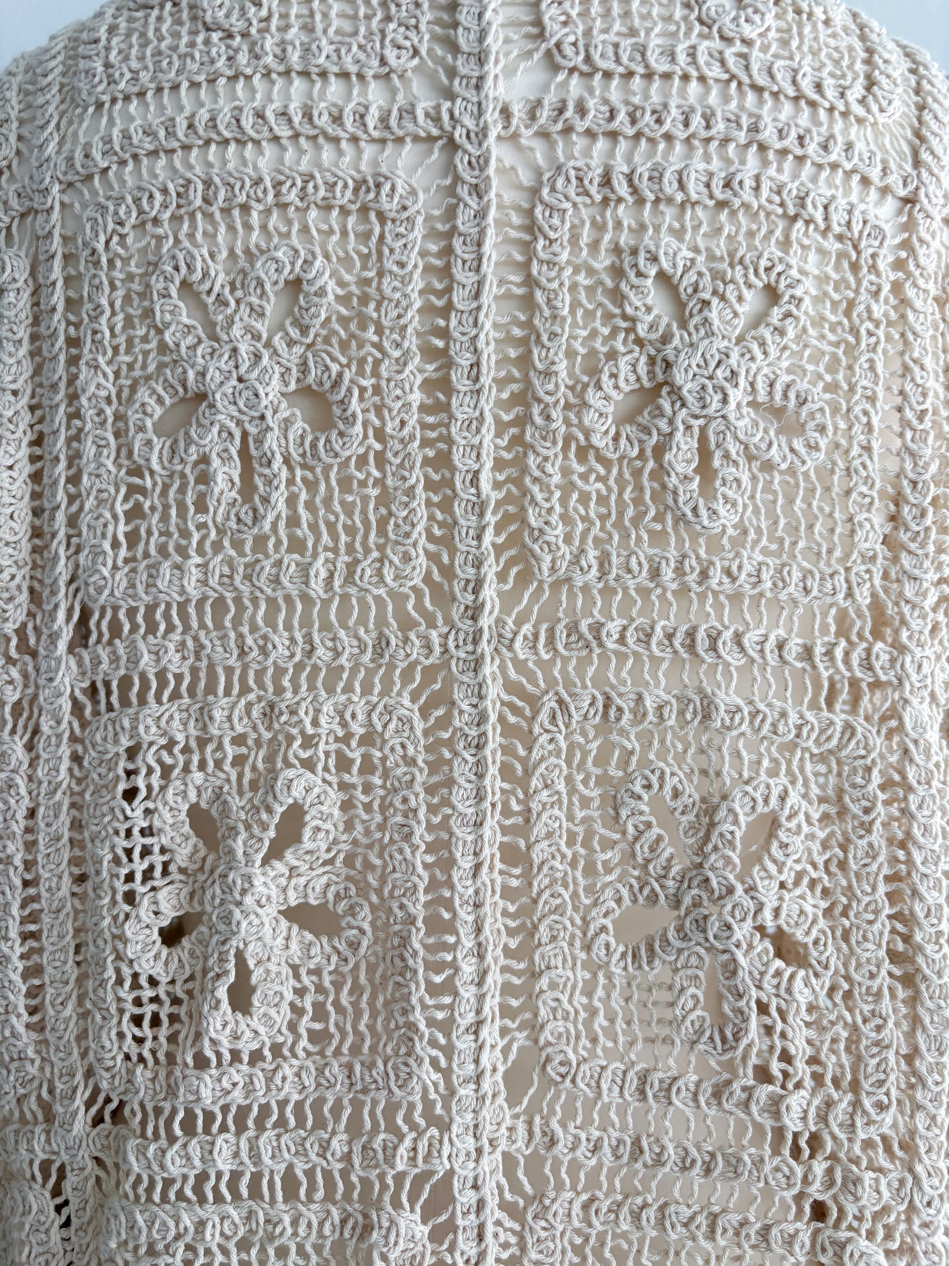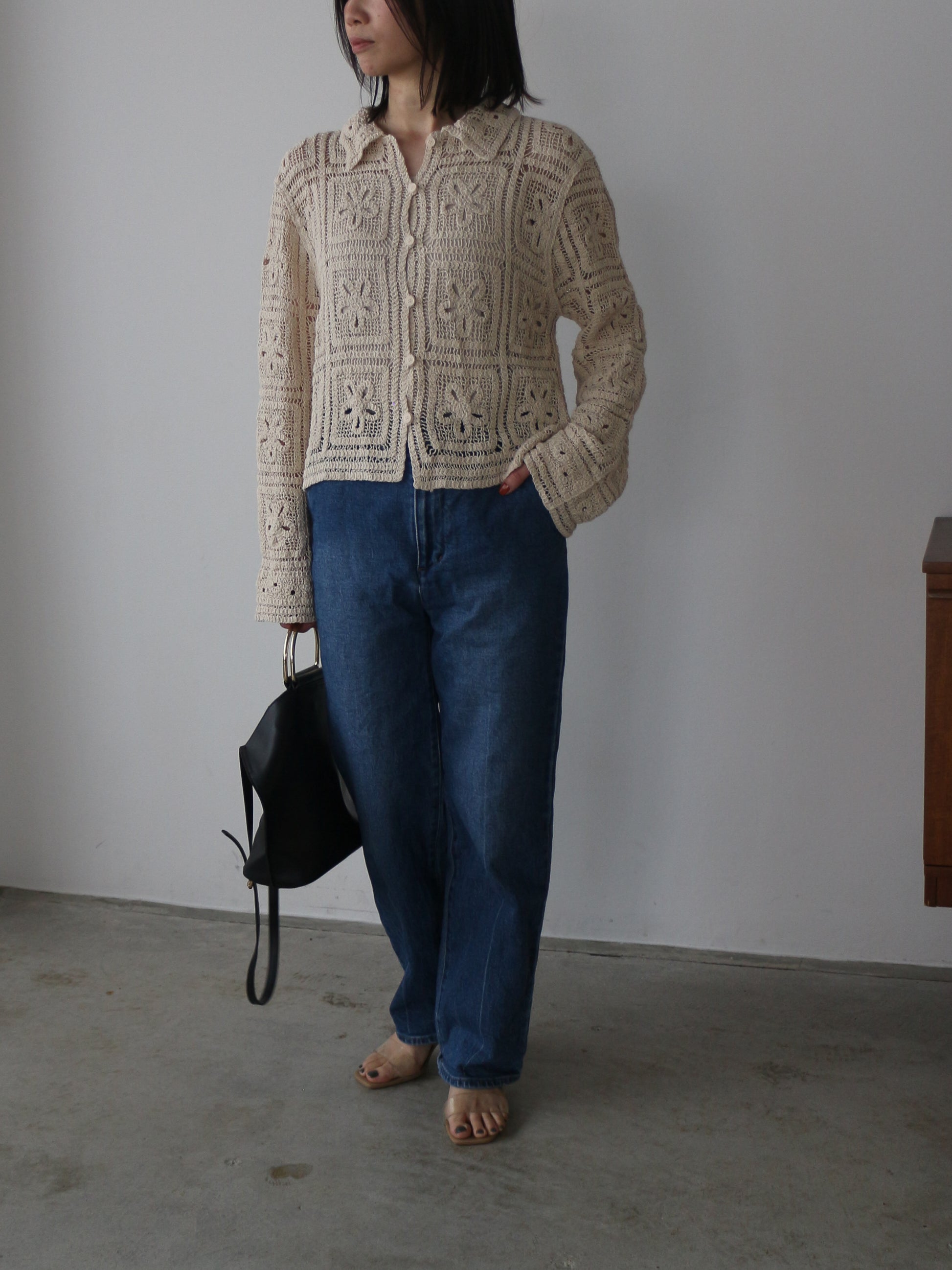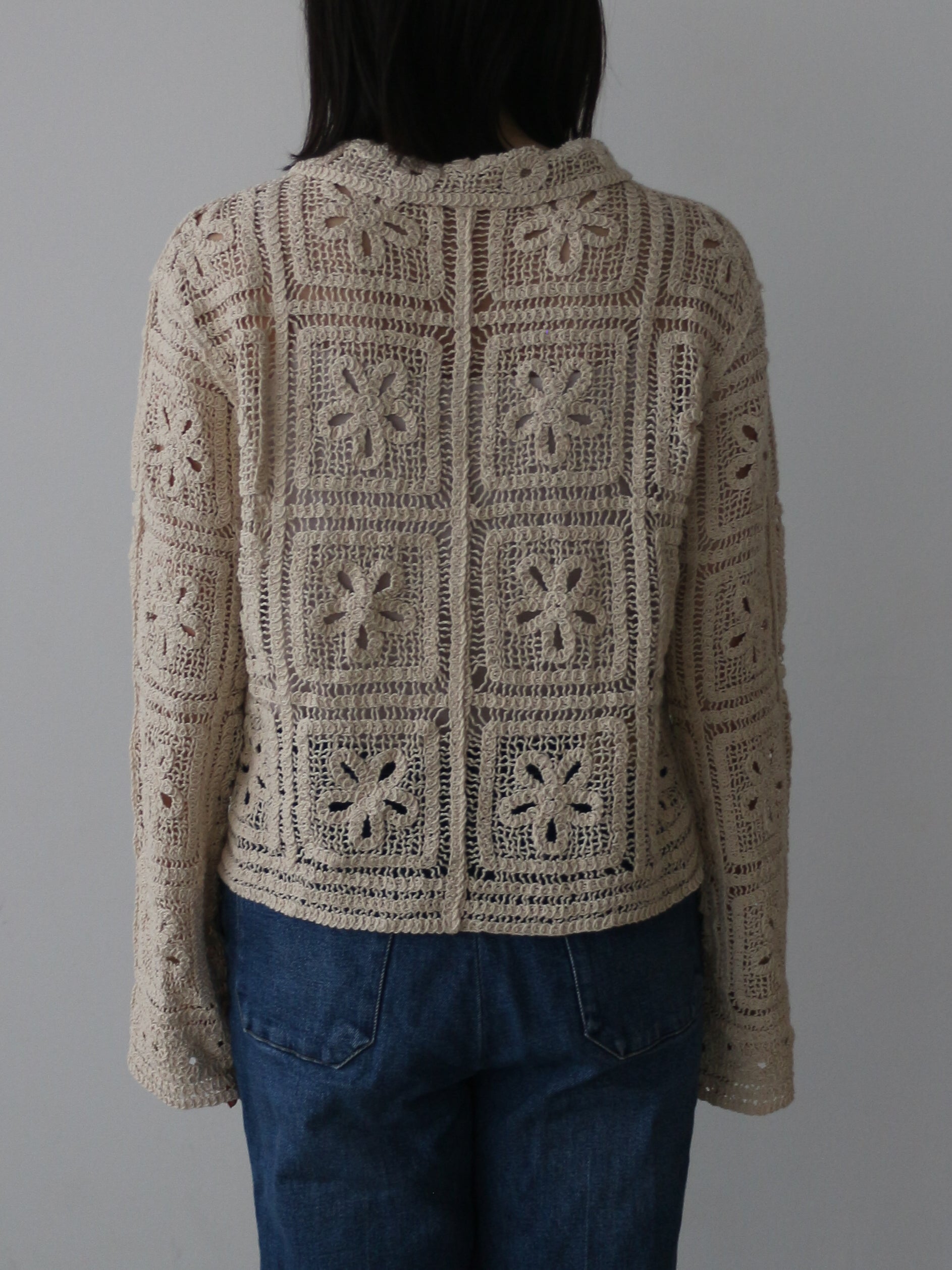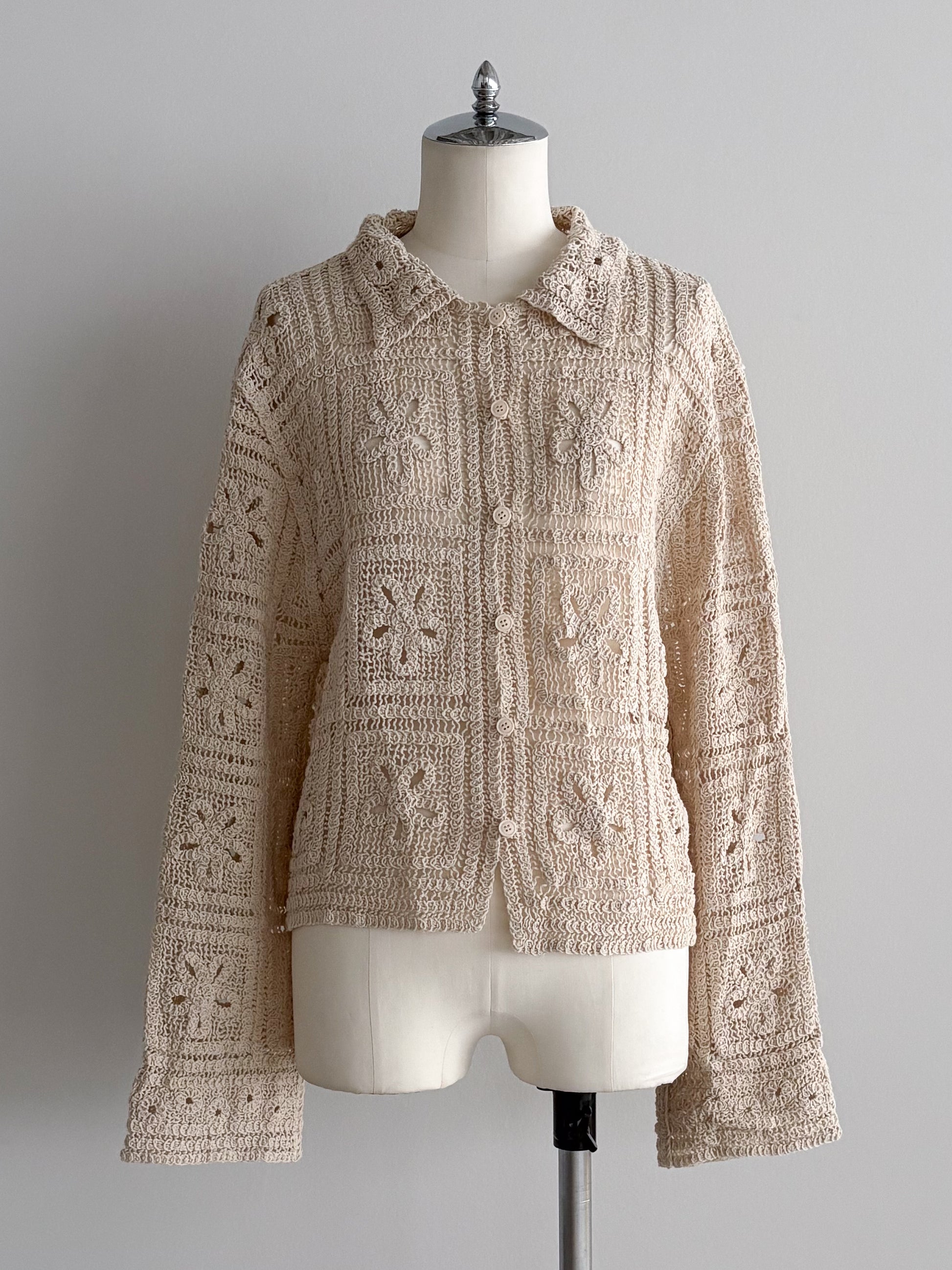 立体感のあるコードレースを用いた、カギ編み仕様の衿付きカーディガン。