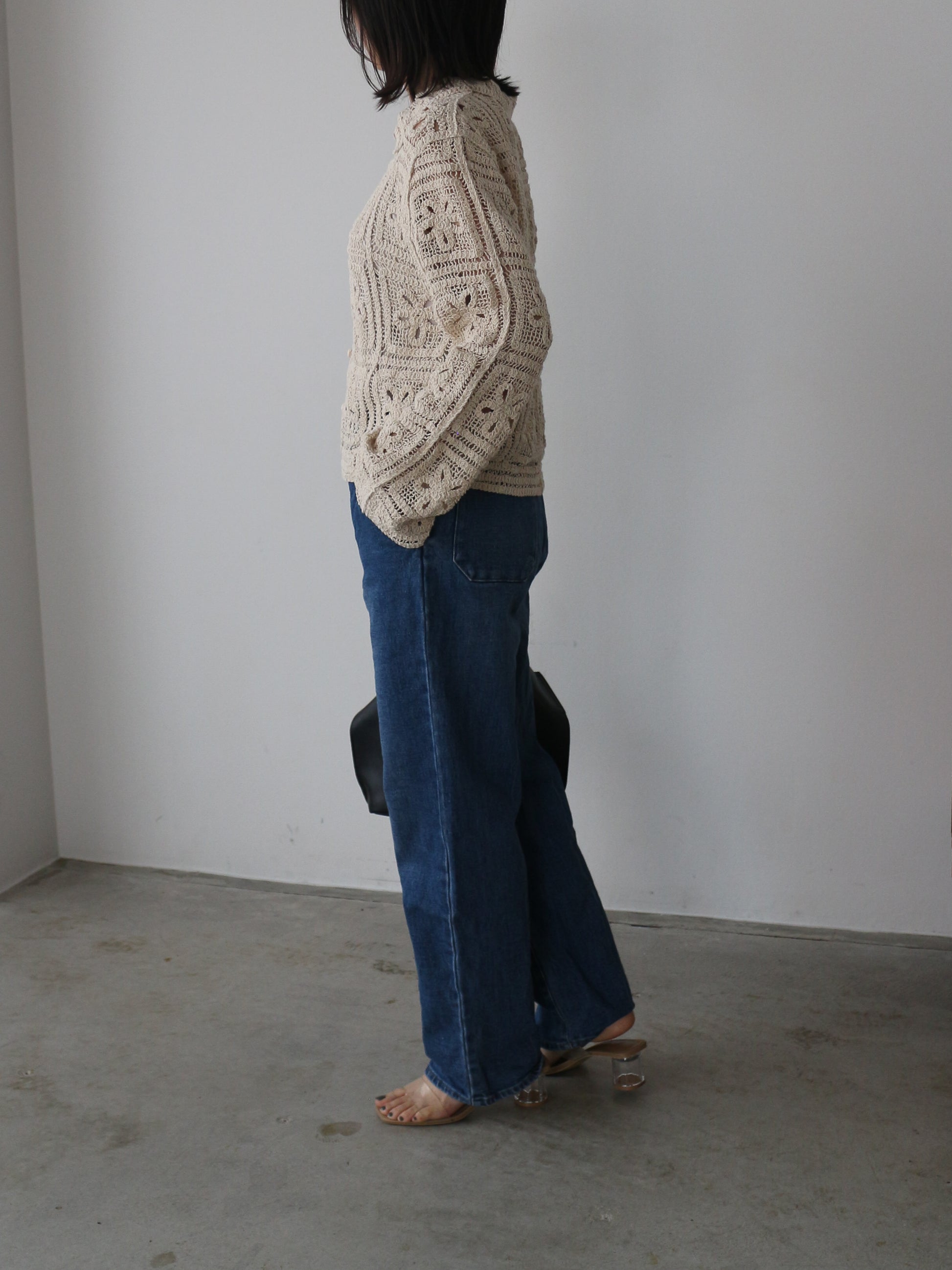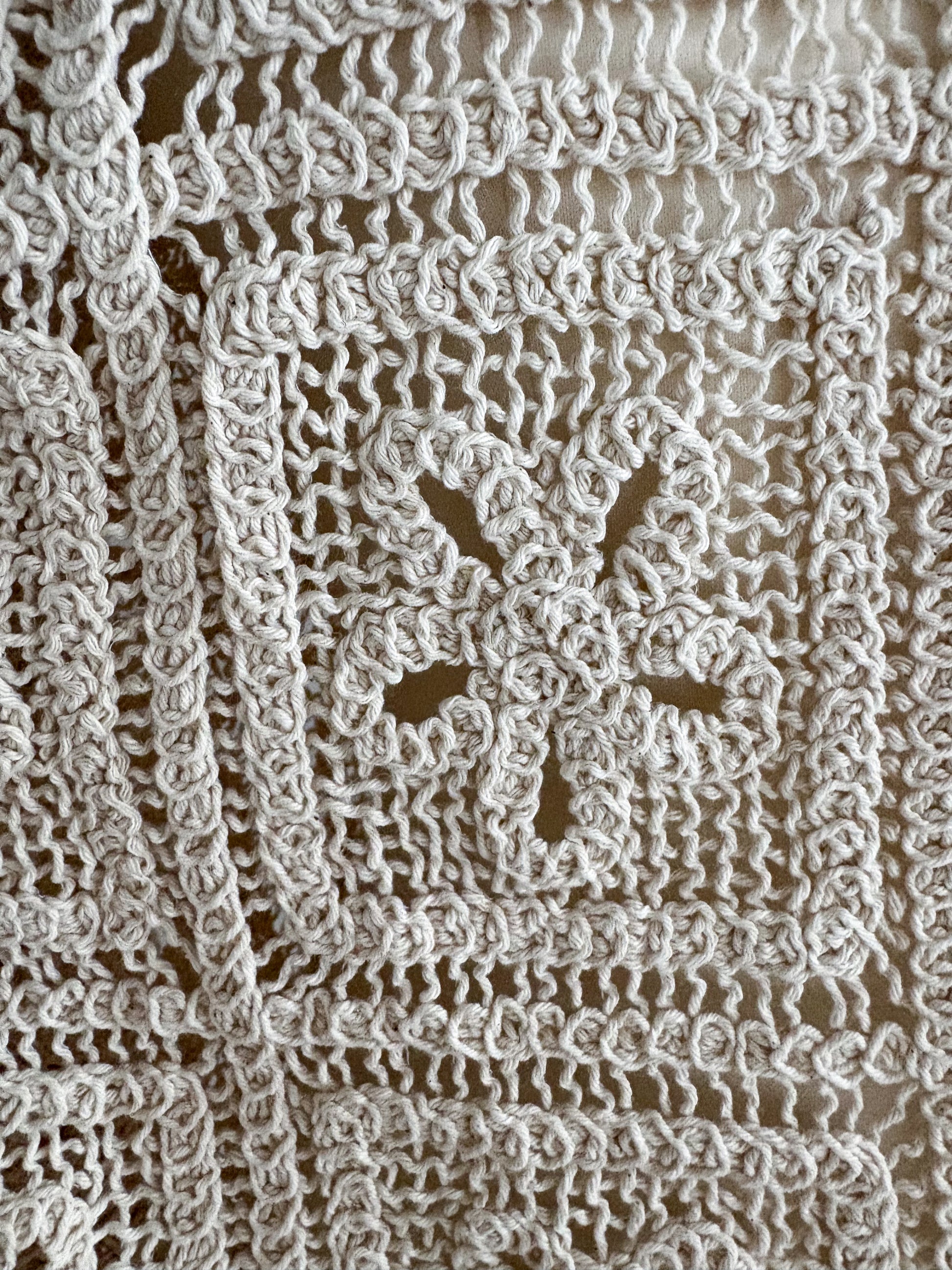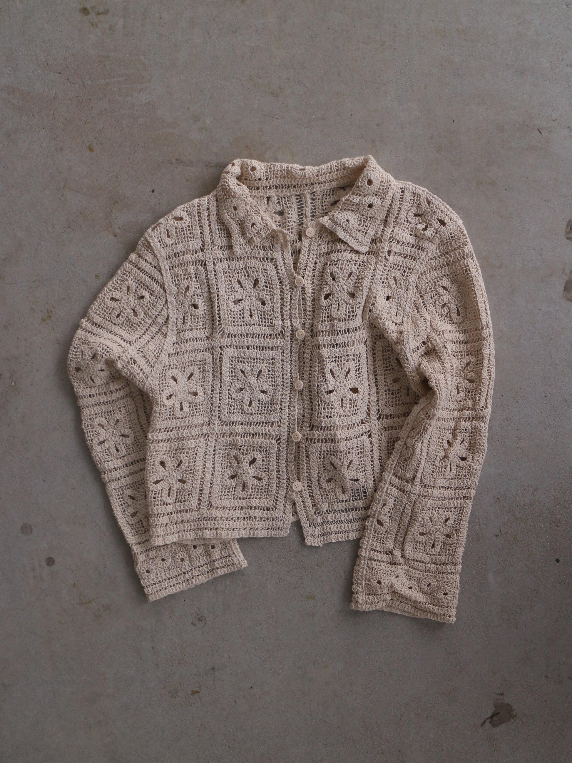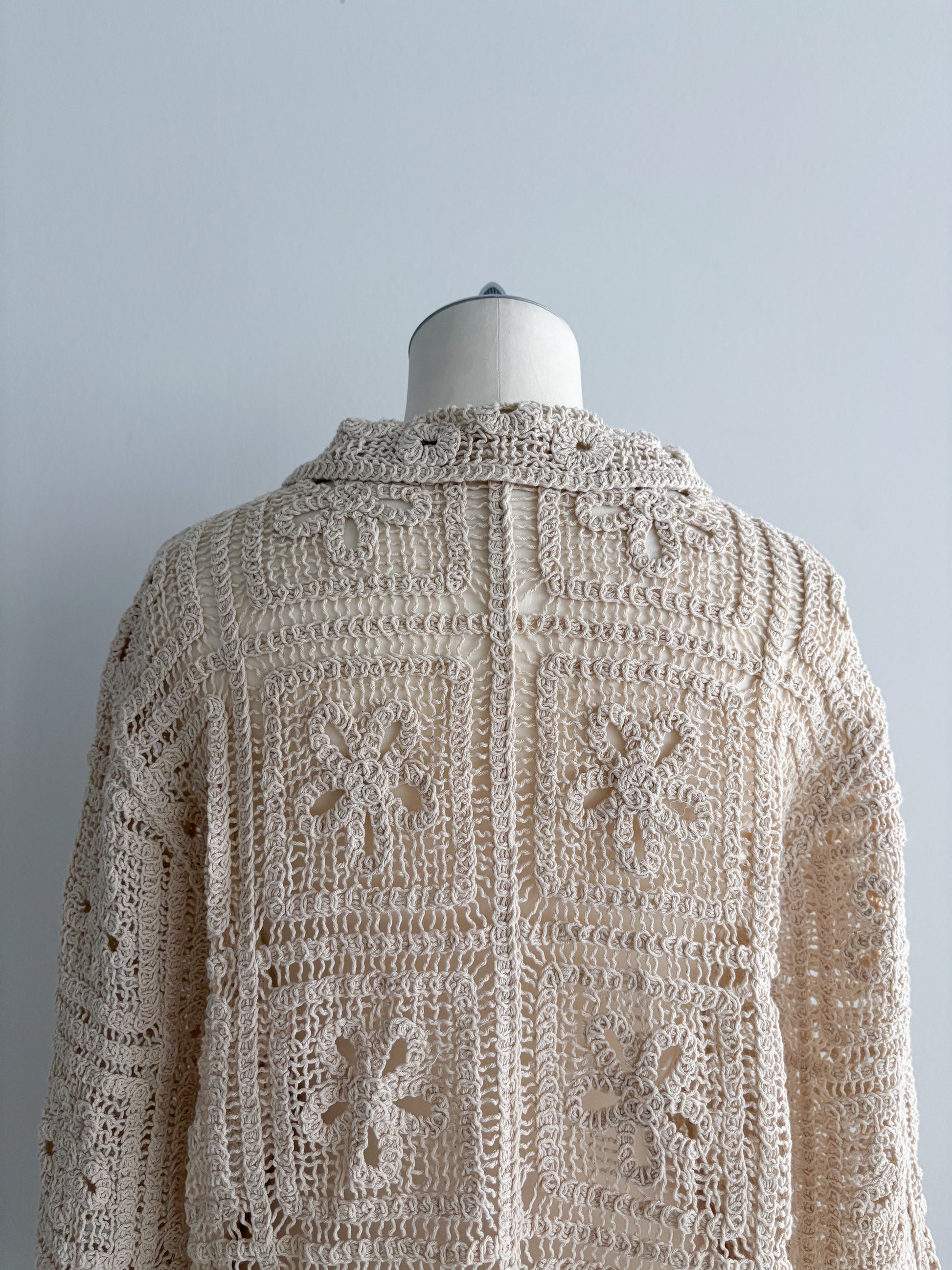 立体感のあるコードレースを用いた、カギ編み仕様の衿付きカーディガン。